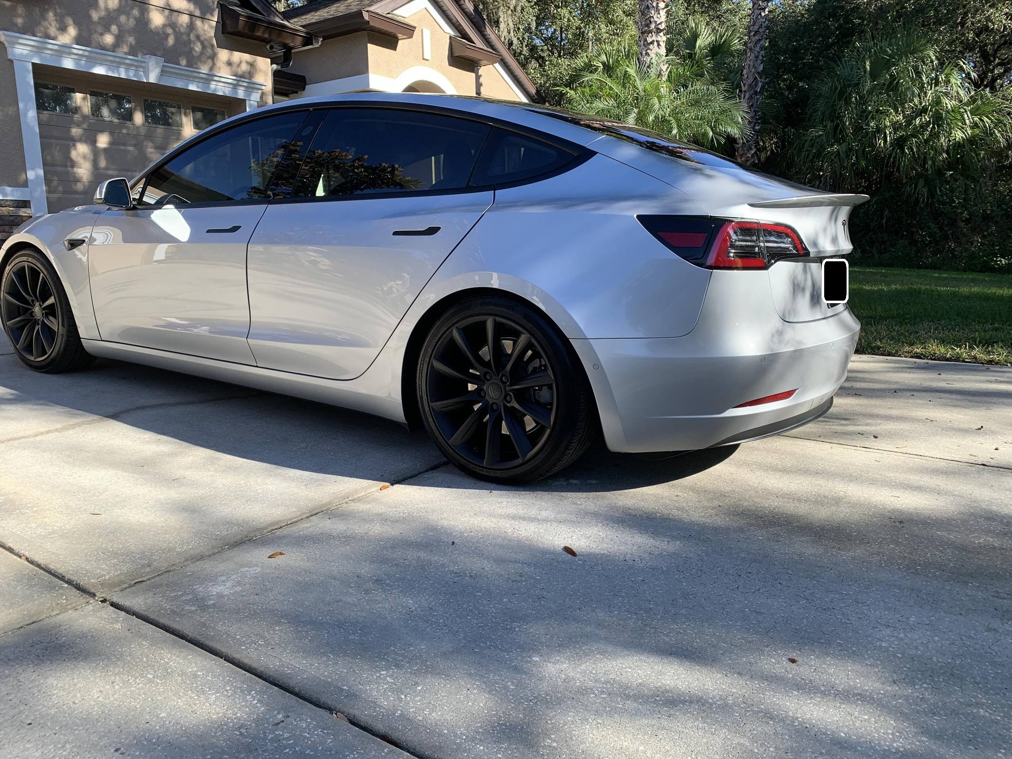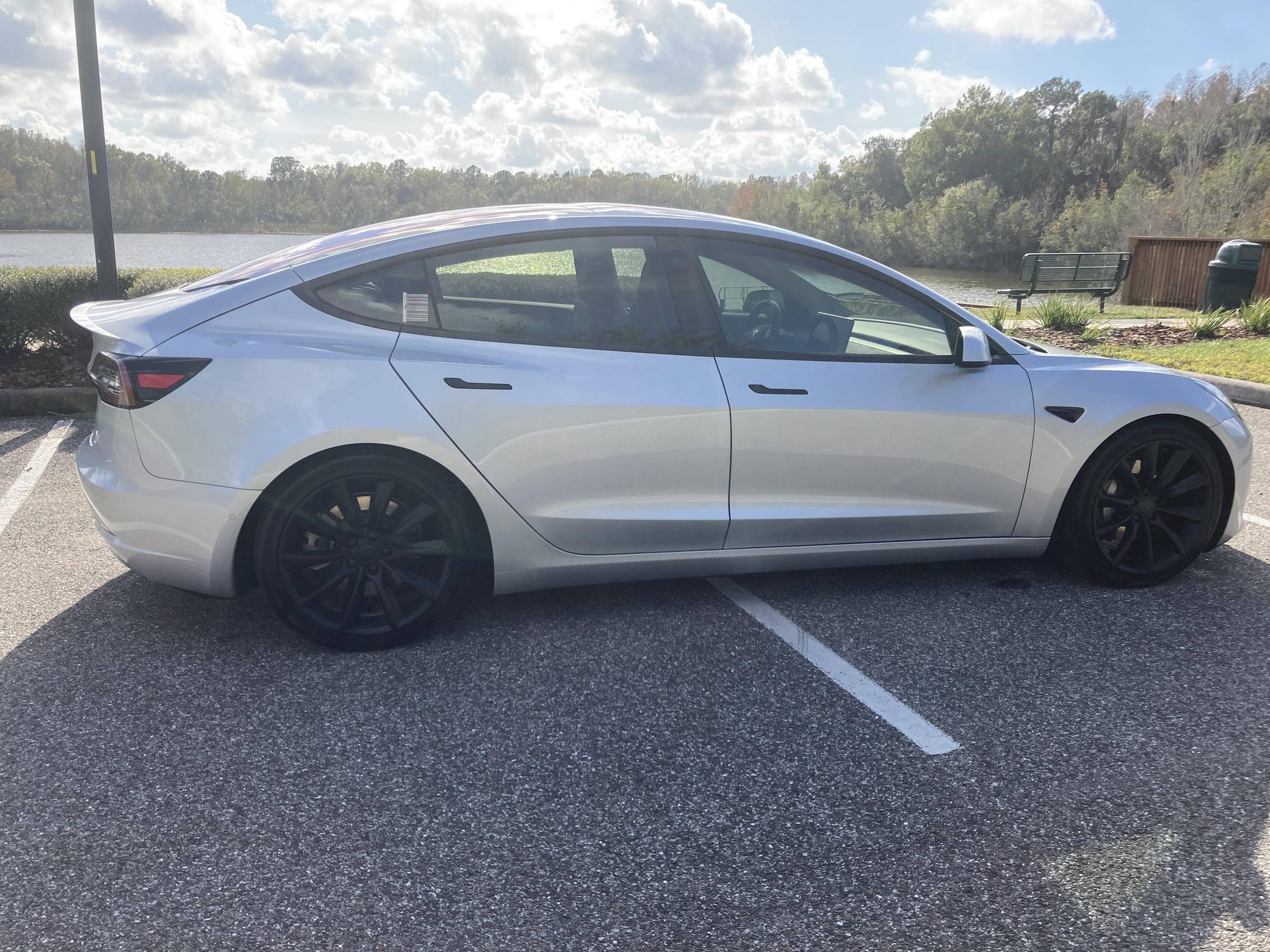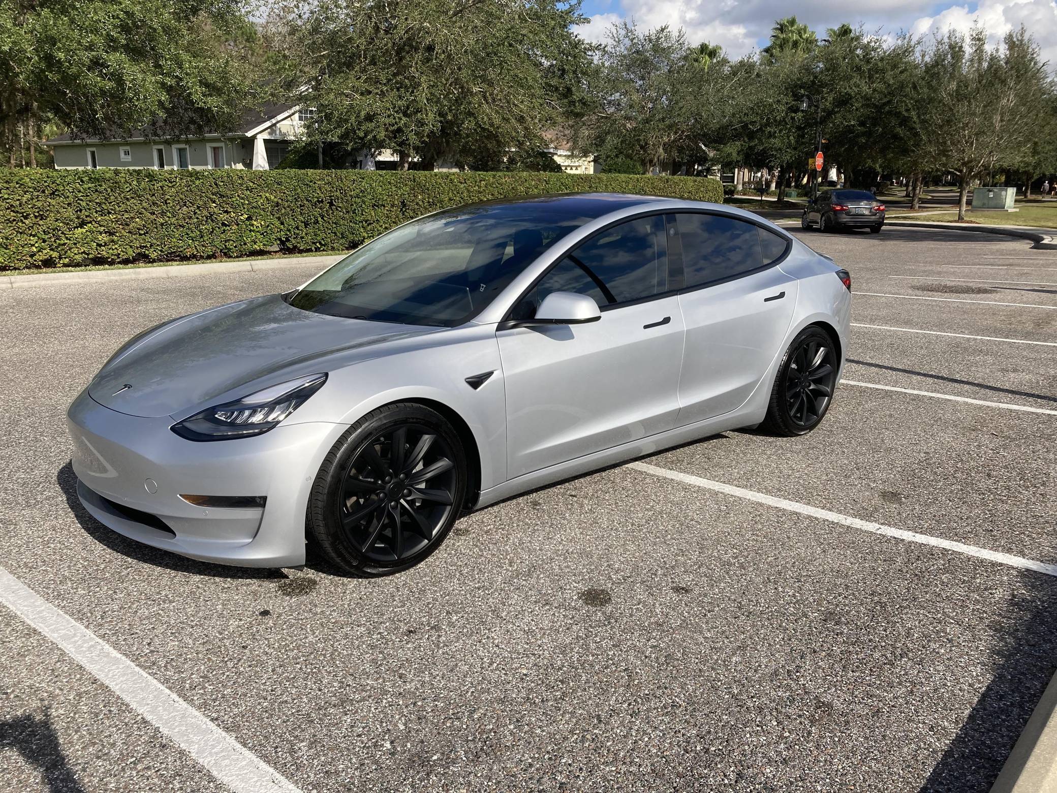 2017 Tesla Model 3 Long Range RWD, finished in Silver Metallic with a black interior. Equipped with a drive inverter with regenerative braking system, LED exterior lighting, heated and power-adjustable front seats, dual-zone automatic climate control, a 15-inch touchscreen, Bluetooth connectivity, and more as detailed below. Modifications reported by the seller include a set of 19-inch Tsportline wheels, Unplugged Performance mild lowering springs, a rear lip spoiler, black-wrapped exterior trim, Alcantara interior trim, an upgraded rear seat bottom cushion, and a window tint. This Tesla carried an EPA-estimated electric driving range of 310 miles when new. It's a rear-wheel drive Long Range model, a variant that the company no longer sells. At launch, the Model 3 was presented as a premium EV with a usable driving range and respectable performance, all at a reasonably attainable price. It was Tesla's entry-level car. It's still available today, and it has gone through several evolutions (including many software updates) since its introduction. Power comes from a single, three-phase electric motor, rated at 271 horsepower and 307 lb-ft of torque. Connected to a 75-kWh lithium-ion battery pack, it powers the rear wheels through an automatic transmission.