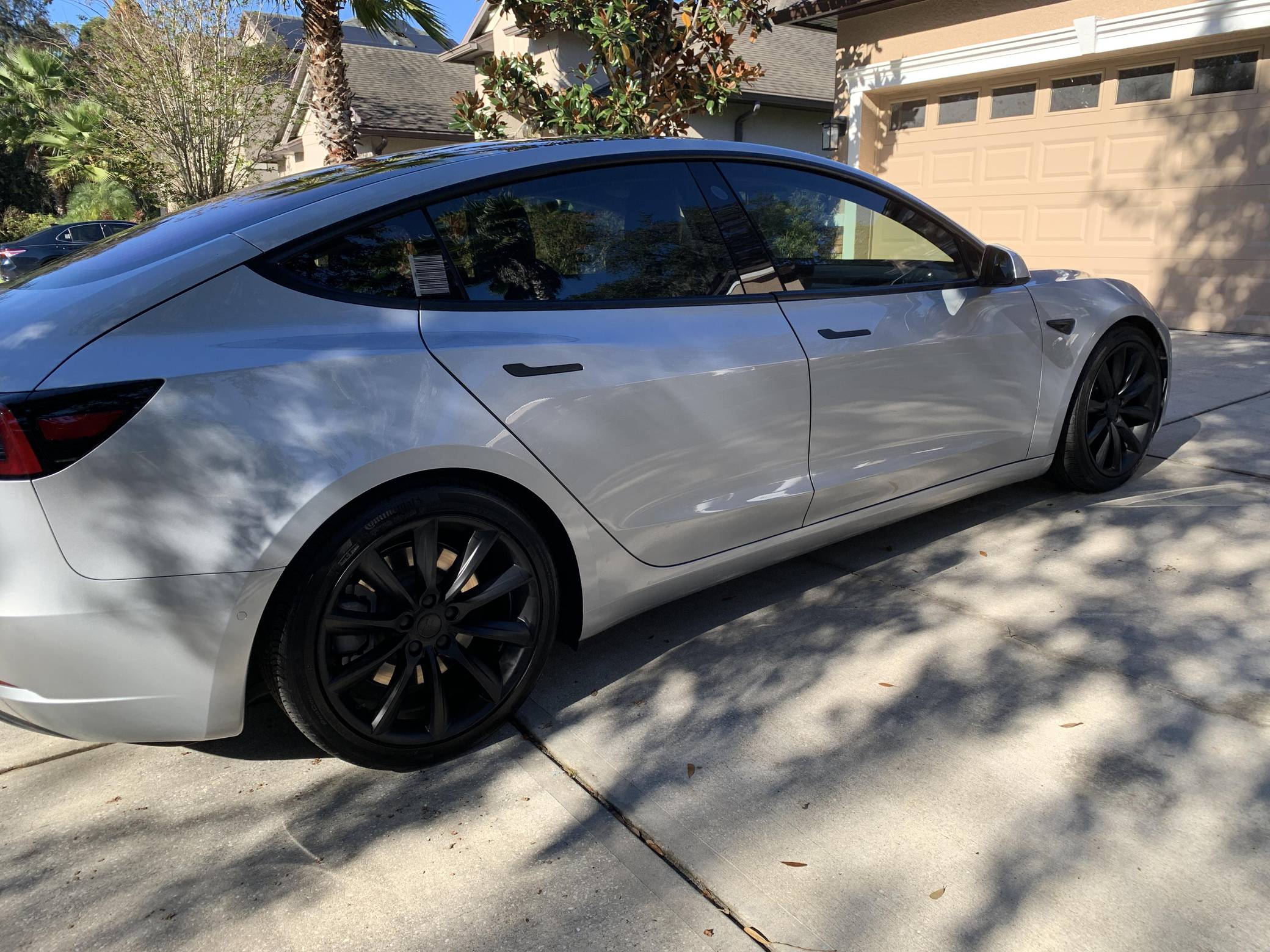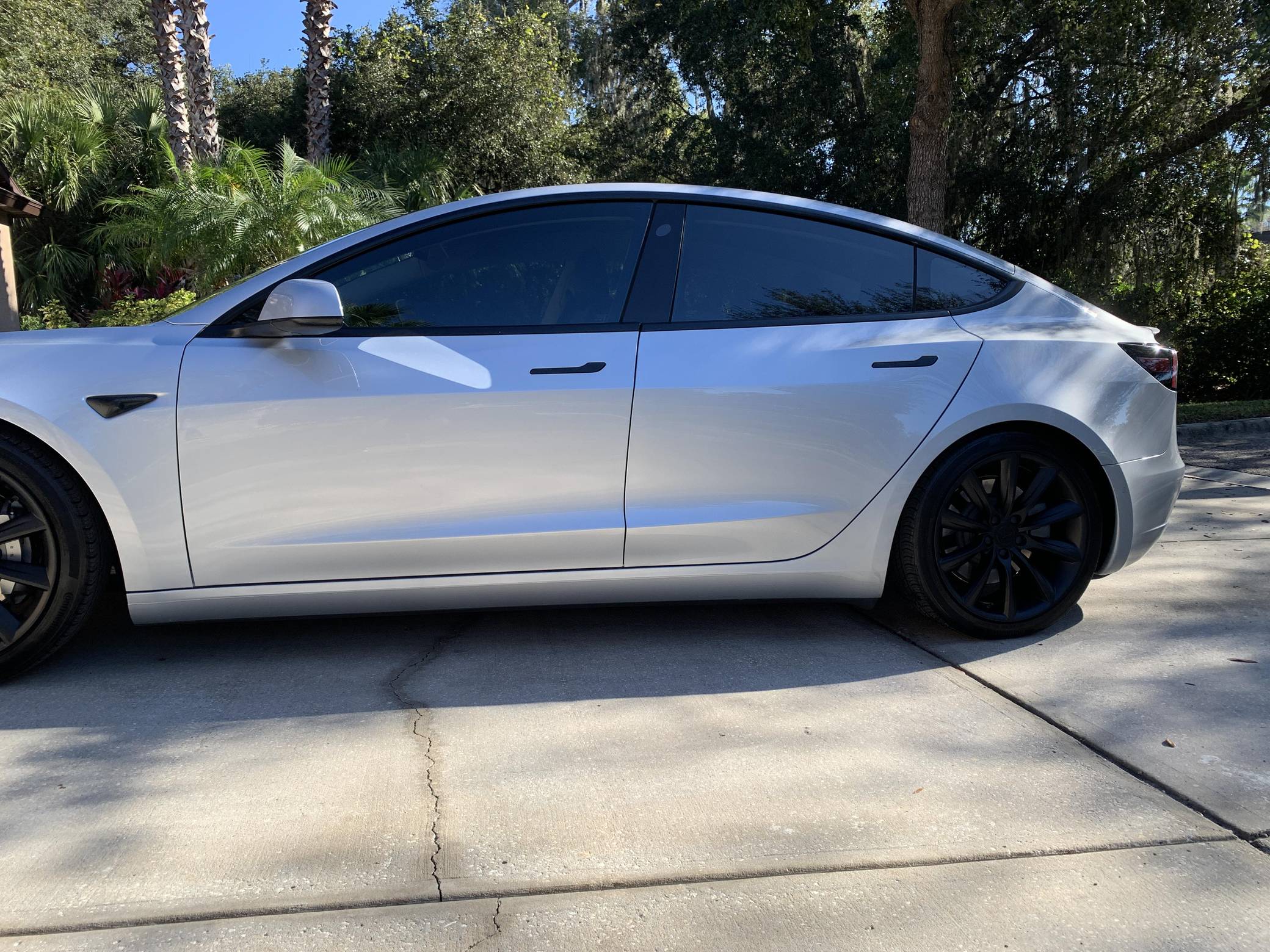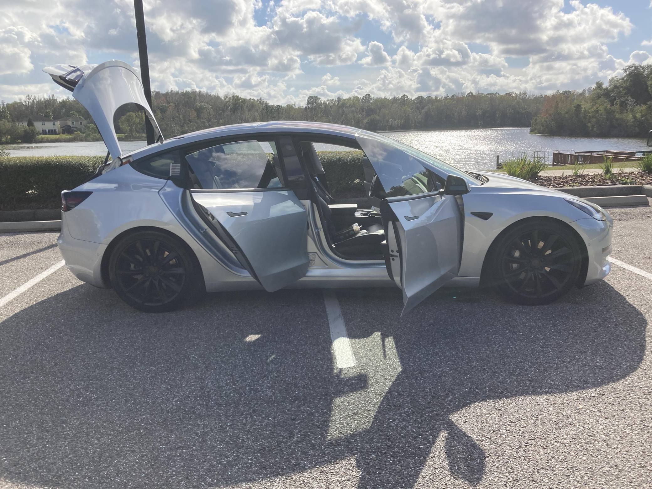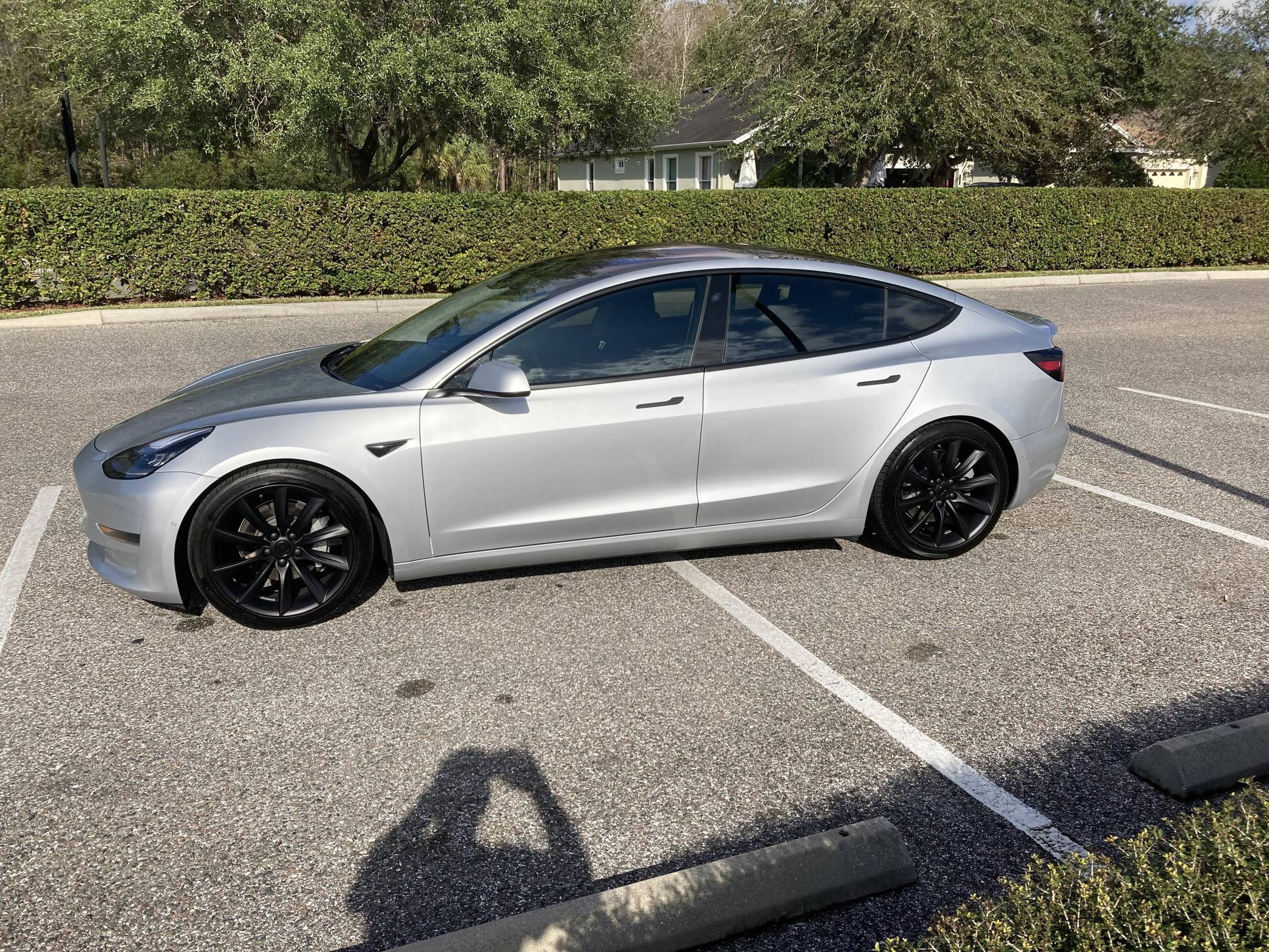 2017 Tesla Model 3 Long Range RWD, finished in Silver Metallic with a black interior. Equipped with a drive inverter with regenerative braking system, LED exterior lighting, heated and power-adjustable front seats, dual-zone automatic climate control, a 15-inch touchscreen, Bluetooth connectivity, and more as detailed below. Modifications reported by the seller include a set of 19-inch Tsportline wheels, Unplugged Performance mild lowering springs, a rear lip spoiler, black-wrapped exterior trim, Alcantara interior trim, an upgraded rear seat bottom cushion, and a window tint. This Tesla carried an EPA-estimated electric driving range of 310 miles when new. It's a rear-wheel drive Long Range model, a variant that the company no longer sells. At launch, the Model 3 was presented as a premium EV with a usable driving range and respectable performance, all at a reasonably attainable price. It was Tesla's entry-level car. It's still available today, and it has gone through several evolutions (including many software updates) since its introduction. Power comes from a single, three-phase electric motor, rated at 271 horsepower and 307 lb-ft of torque. Connected to a 75-kWh lithium-ion battery pack, it powers the rear wheels through an automatic transmission.