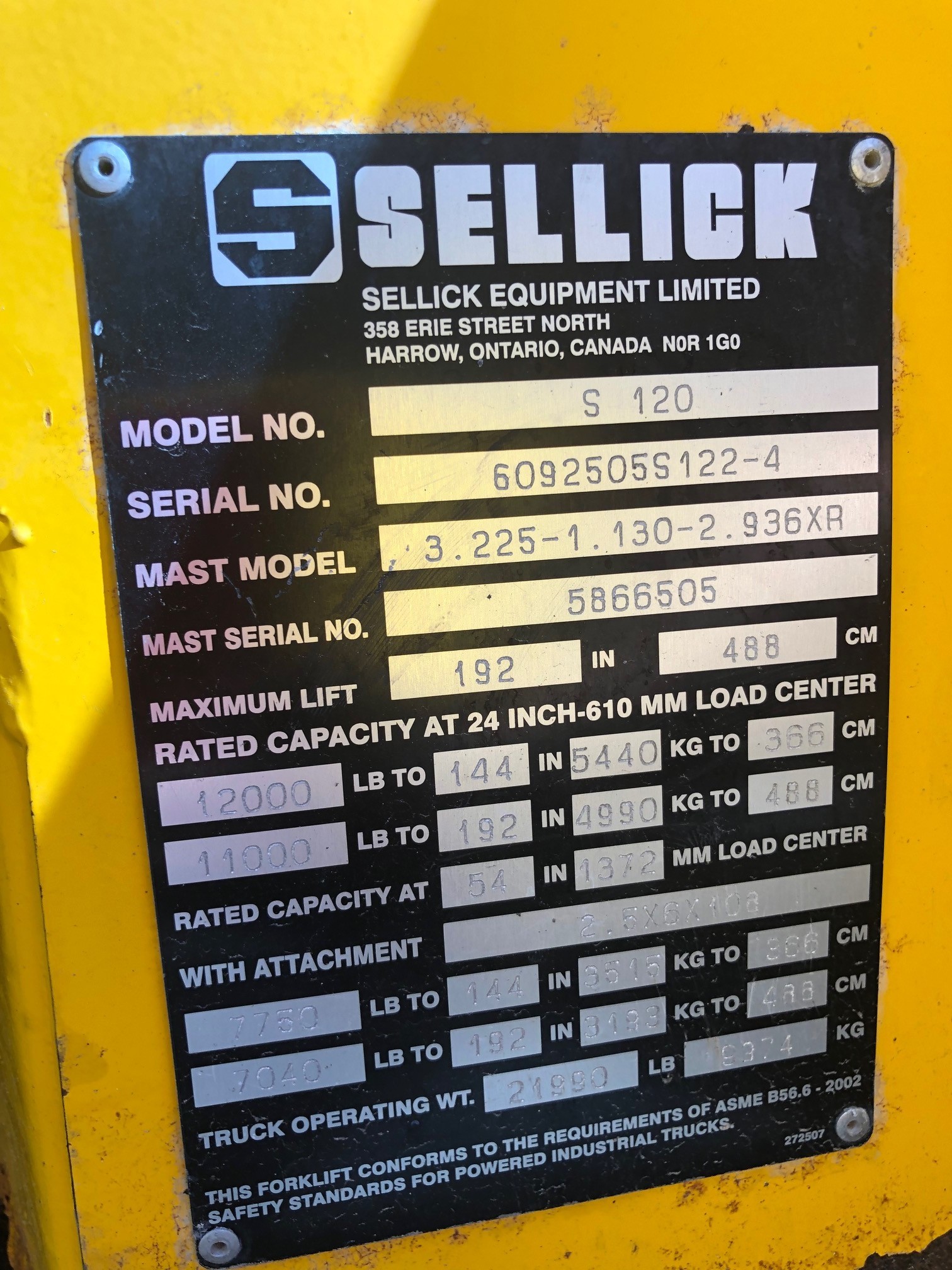 2005 Sellick S120, Mast: Two Stage Wide ViewMast Dimensions: 192" Max Fork HeightSide Shifting MastDRIVE: 4x4 Fuel: Perkins Diesel Tires: Rough Terrain Forks: 5 FT Sellick 12,000lbs Capacity. This is a very clean nice running and working Rough Terrain Forklift. The Mast lays over even with the overhead guard so it could be hauled on a flatbed. Full Cab with Full Tinted Glass! This machine does come with heat and an air conditioner. New Drive Tires, and 80% Steer Tires. 4 Speed Shuttle Transmission, Perkins Diesel Engine. Side Shifting Mast.