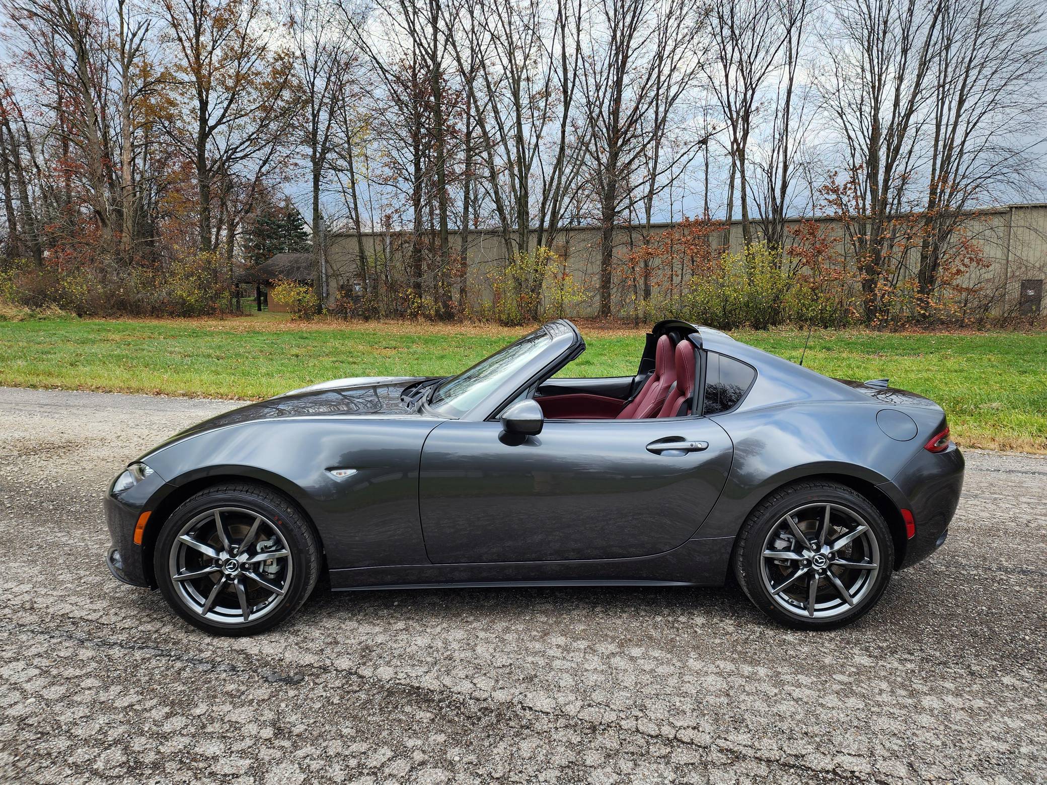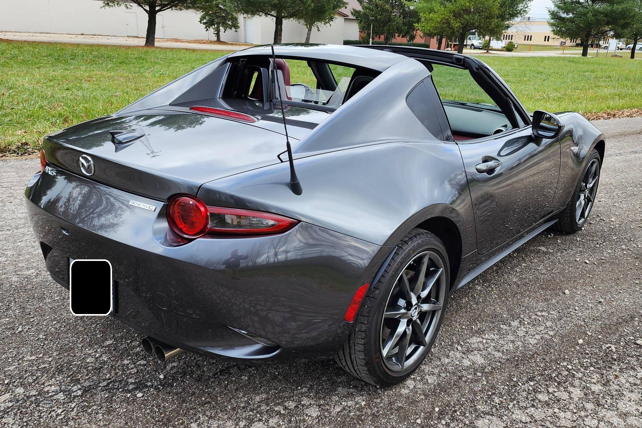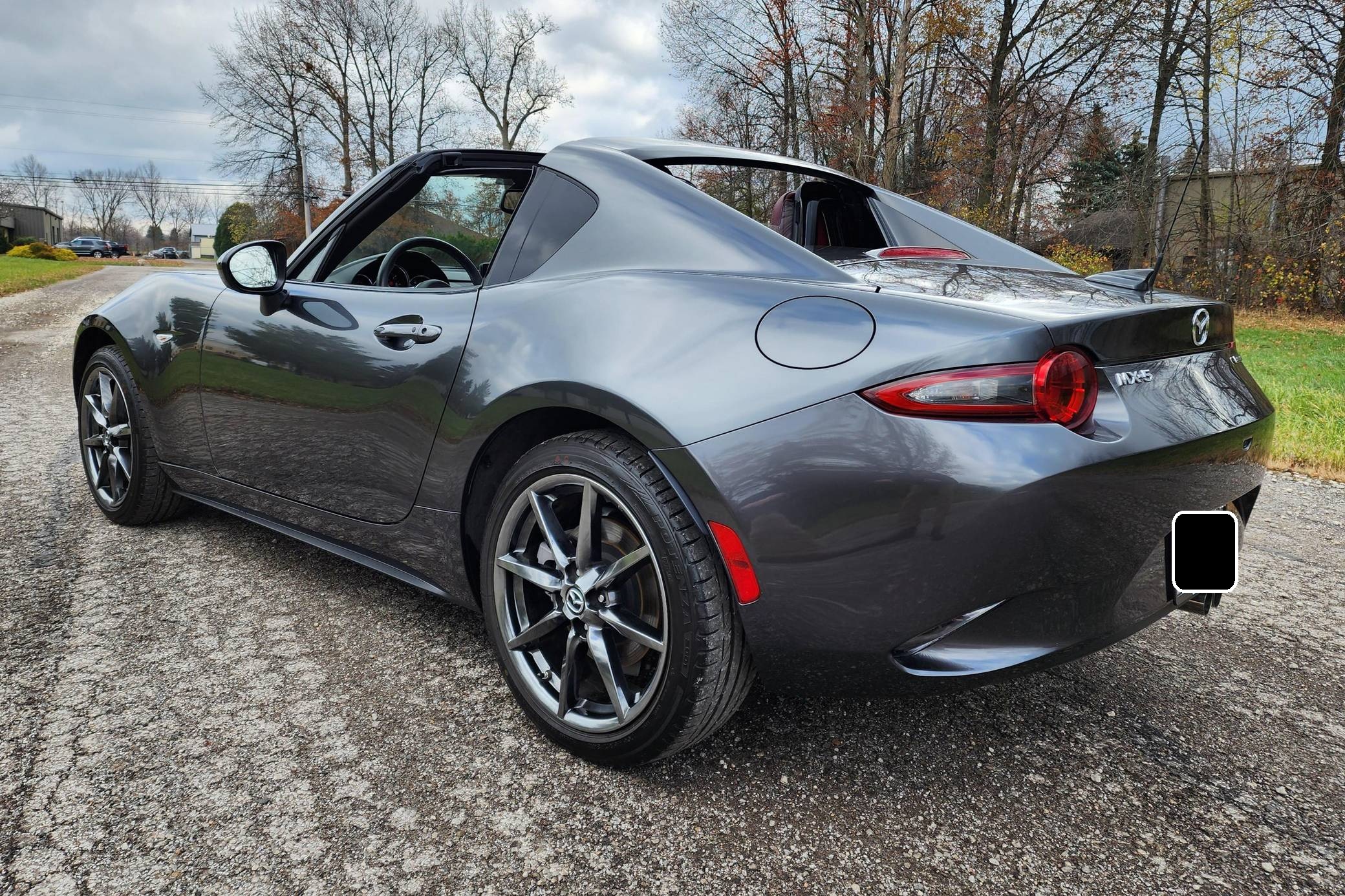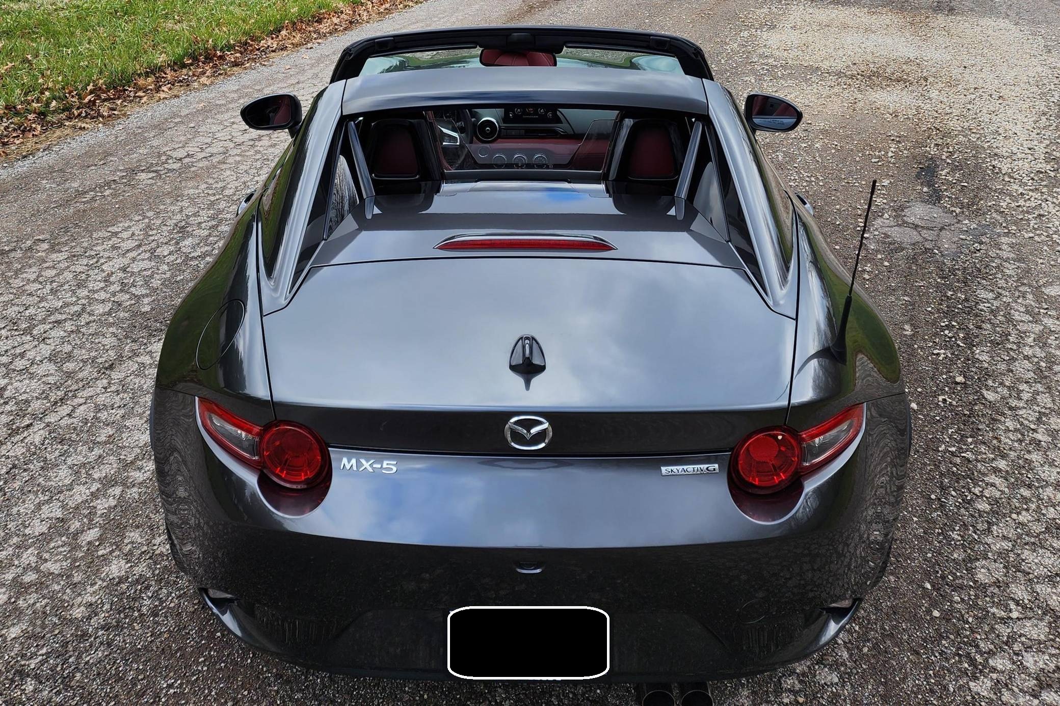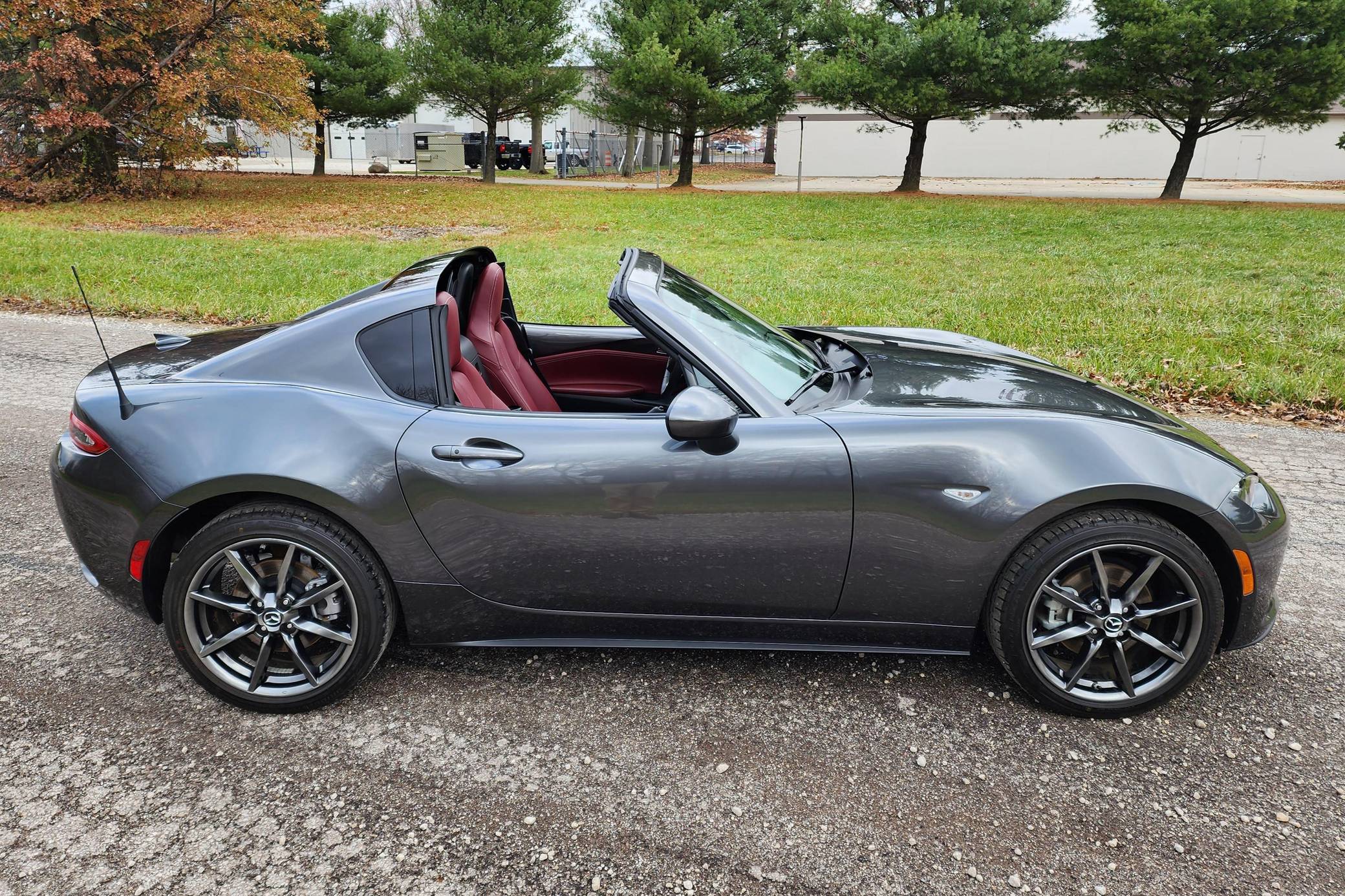 THIS… is a 2020 Mazda MX-5 Miata RF Grand Touring, finished in Machine Gray Metallic with a red interior. This Miata features the desirable 6-speed manual transmission. The odometer on this Miata currently displays about 2,100 miles. The seller reports no modifications. The ND generation of the Mazda MX-5 Miata debuted for the 2016 model year, and it strikes a balance as a modern, nicely-appointed roadster that still maintains the intended nature of a Miata as a fun, uncomplicated, lightweight sports car at an accessible price. The "ND2" model debuted for the 2019 model year and included revisions to the engine with more power and a higher redline, a telescoping steering column, revised seat controls, a new cupholder, a reverse camera, and a redesigned door handle mechanism. Power comes from a 2. 0-liter inline-4 engine, rated at 181 horsepower and 151 lb-ft of torque. Output is sent to the rear wheels via a 6-speed manual transmission.