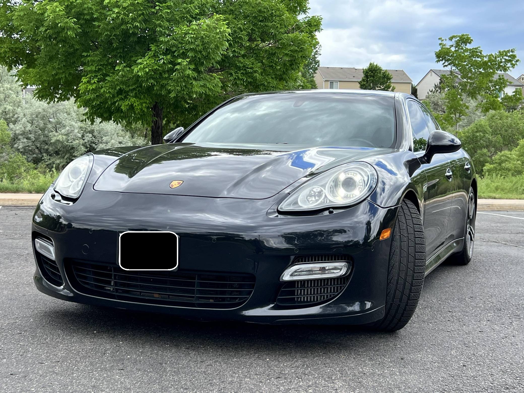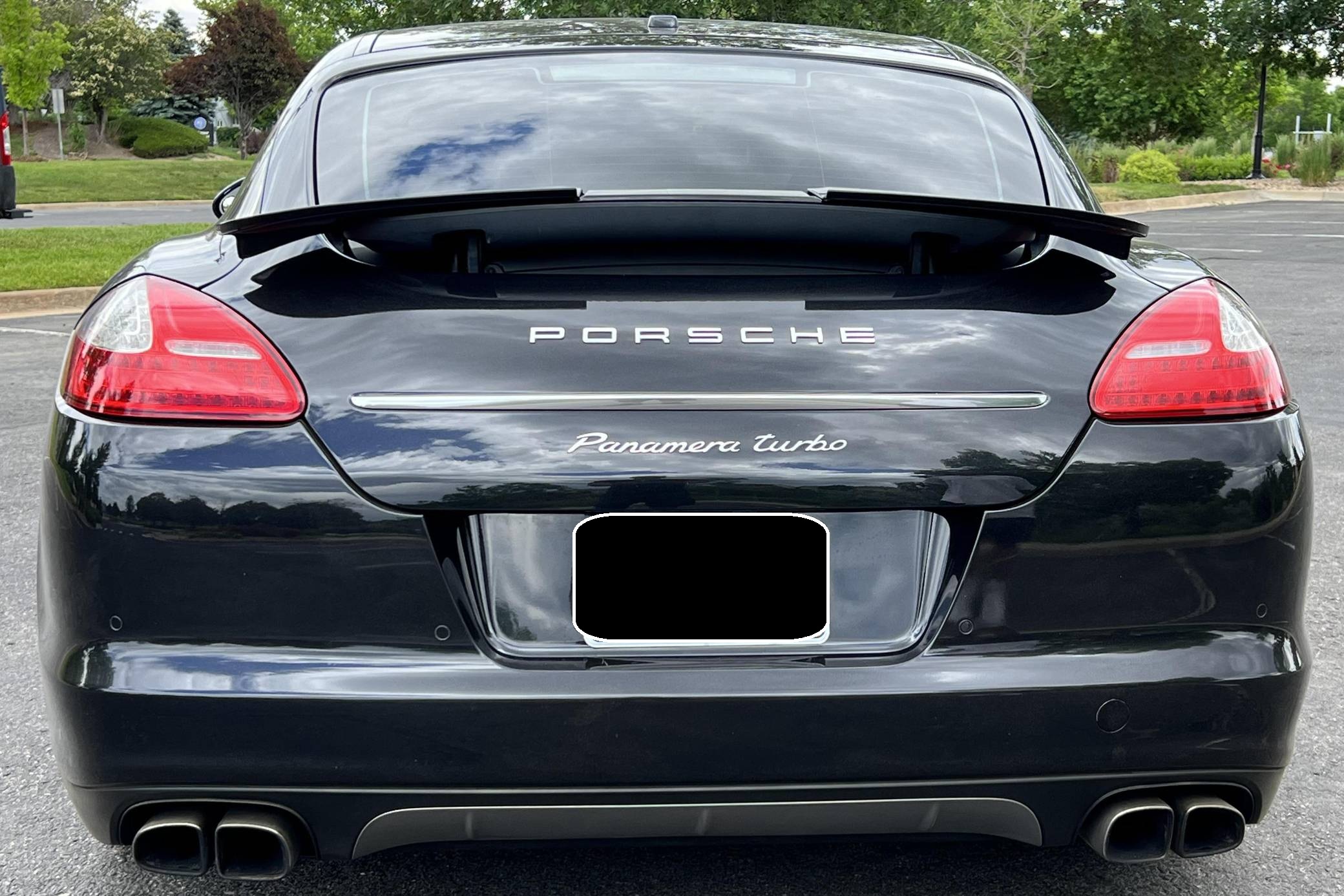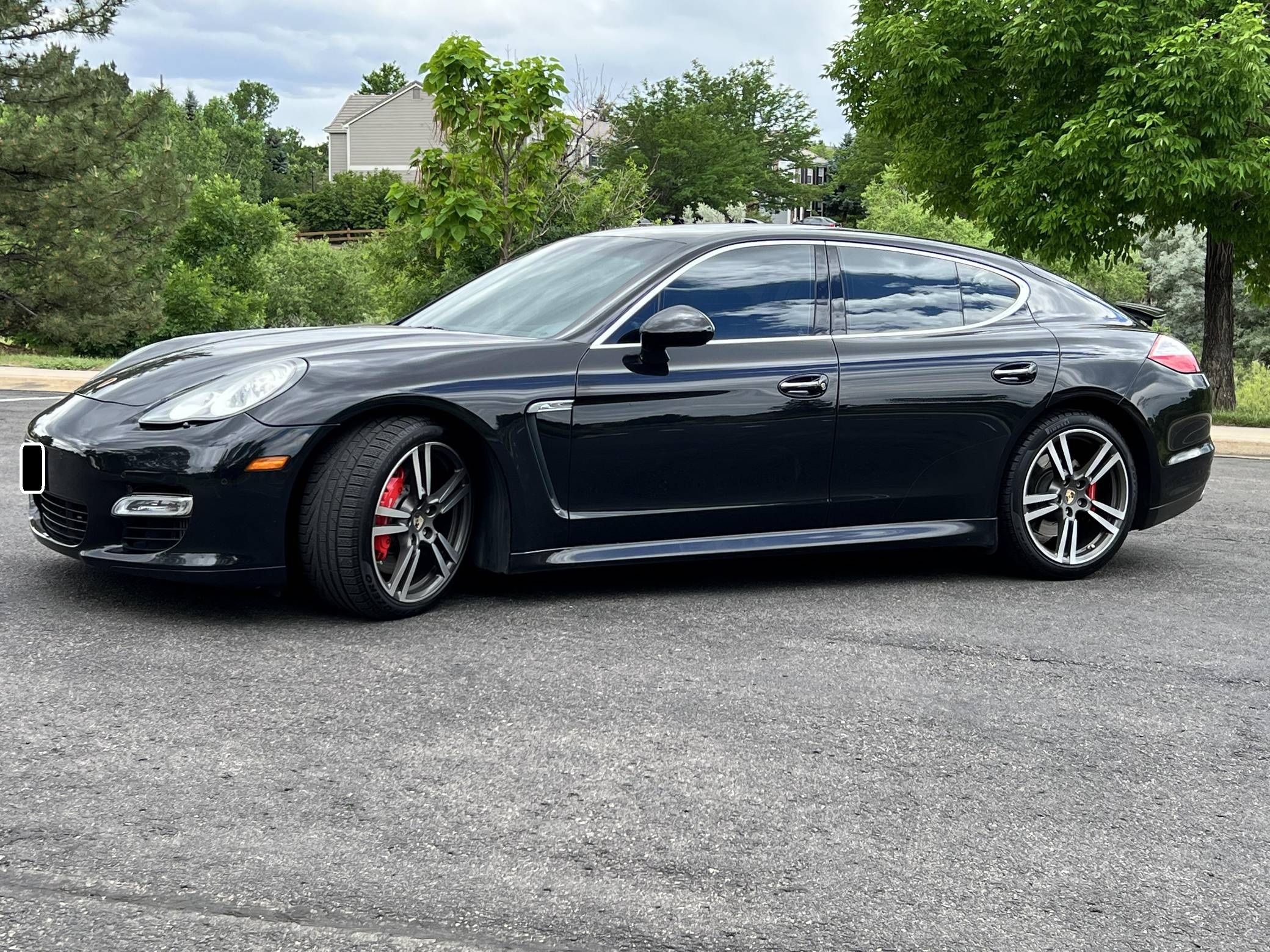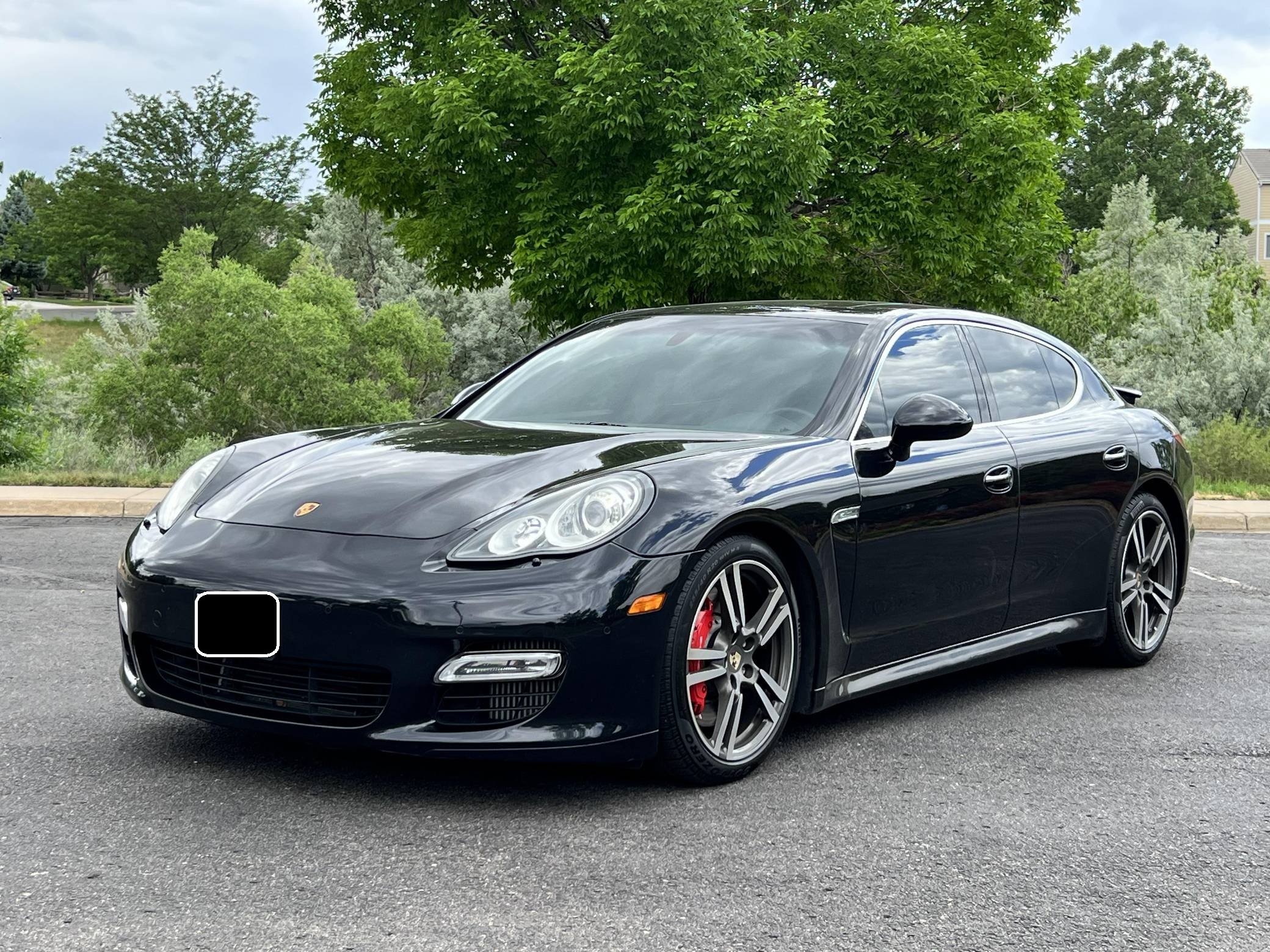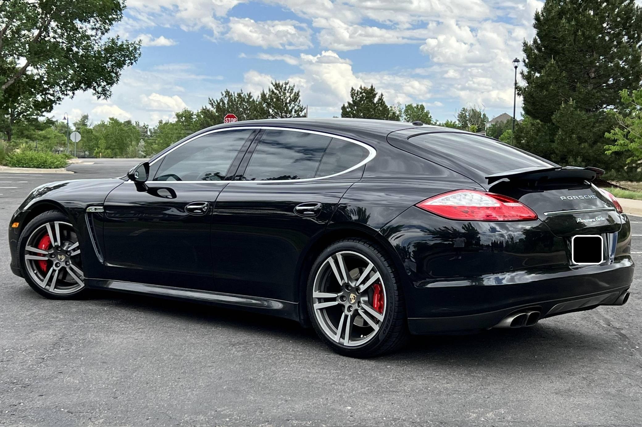 2010 Porsche Panamera Turbo, finished in Basalt Black Metallic with a black interior. The odometer indicates approximately 53,800 miles. Factory equipment includes 20-inch 911 Turbo II wheels, Porsche Dynamic Chassis Control (PDCC) with adaptive air suspension and the Porsche Torque Vectoring Plus, a full leather interior, Tineo wood interior trim, heated and ventilated front and rear seats, power rear sunshades, ParkAssist, and a Bose sound system. Modifications reported by the seller are limited to paint protection film on forward-facing surfaces and tinted windows. After several false starts, Porsche entered the sedan segment for the first time when it launched the original Panamera for 2010. While its design and its very existence were controversial, the Panamera ultimately drew praise as the sportiest model in its segment and it achieved this distinction without sacrificing comfort or luxury. The Turbo model slotted near the top of the line-up when it arrived for 2011. Power comes from a 4. 8-liter twin-turbocharged V8, rated at 500 horsepower and 516 lb-ft of torque. It spins all four wheels via a 7-speed double-clutch automatic transmission.