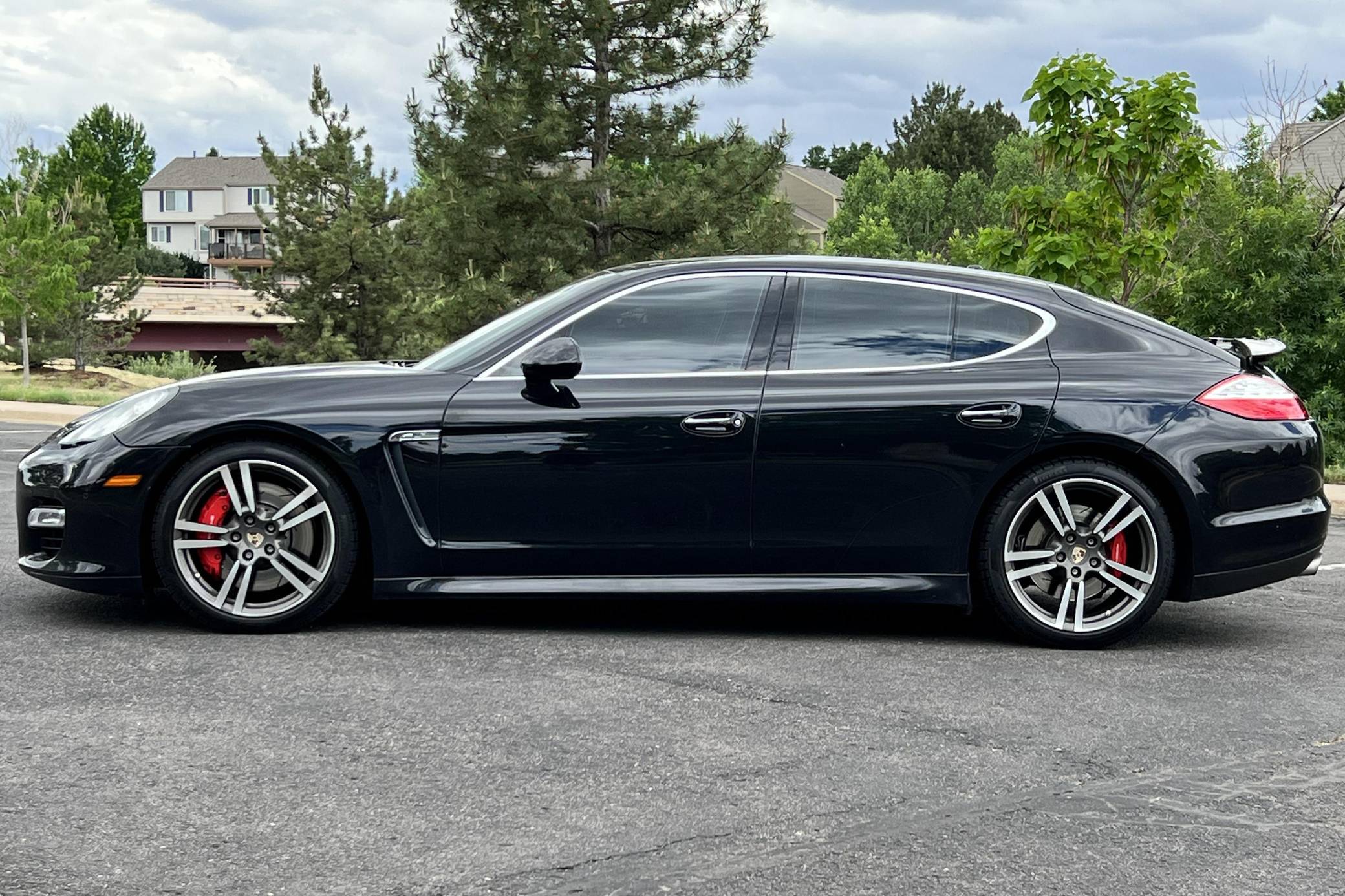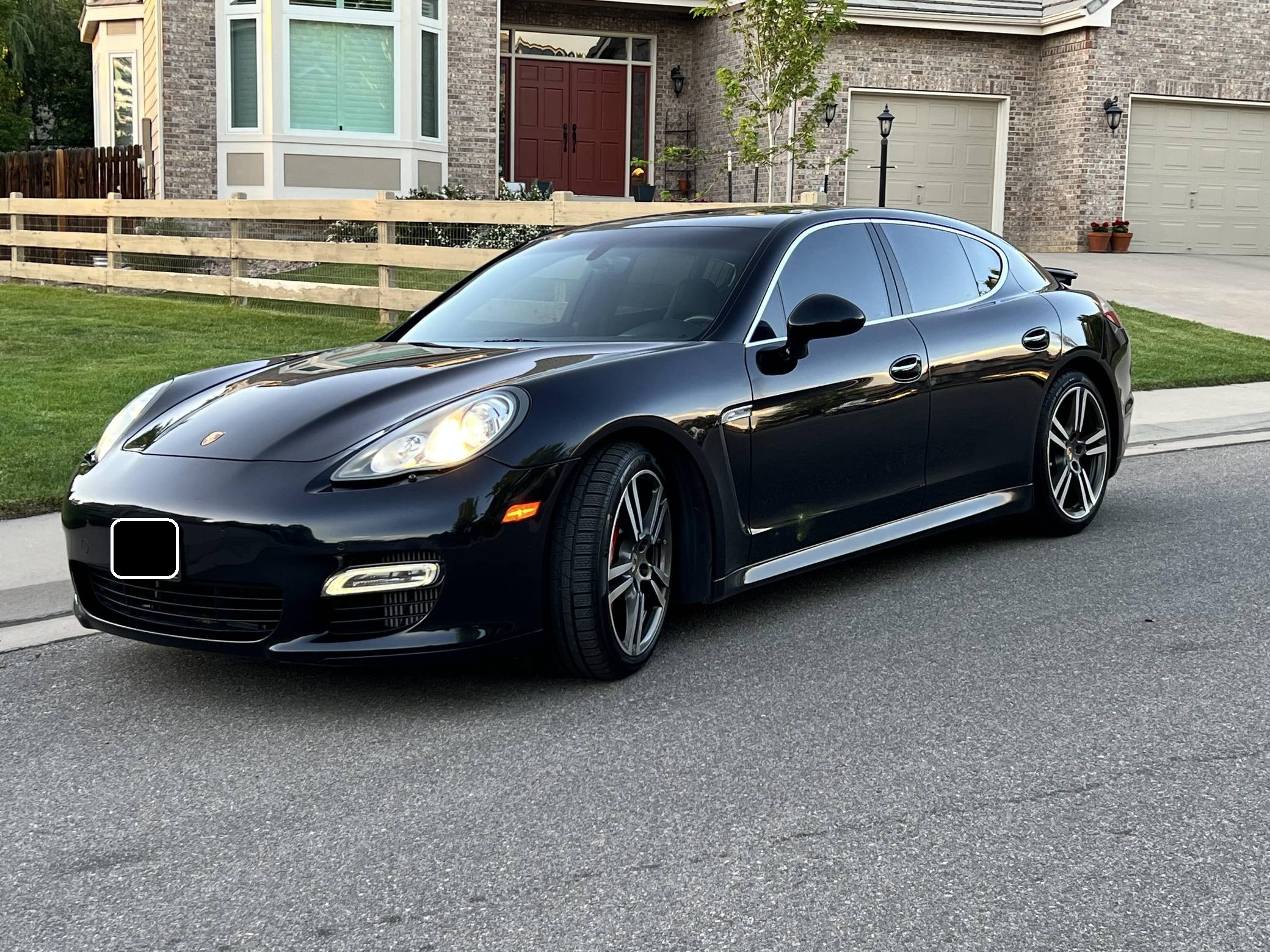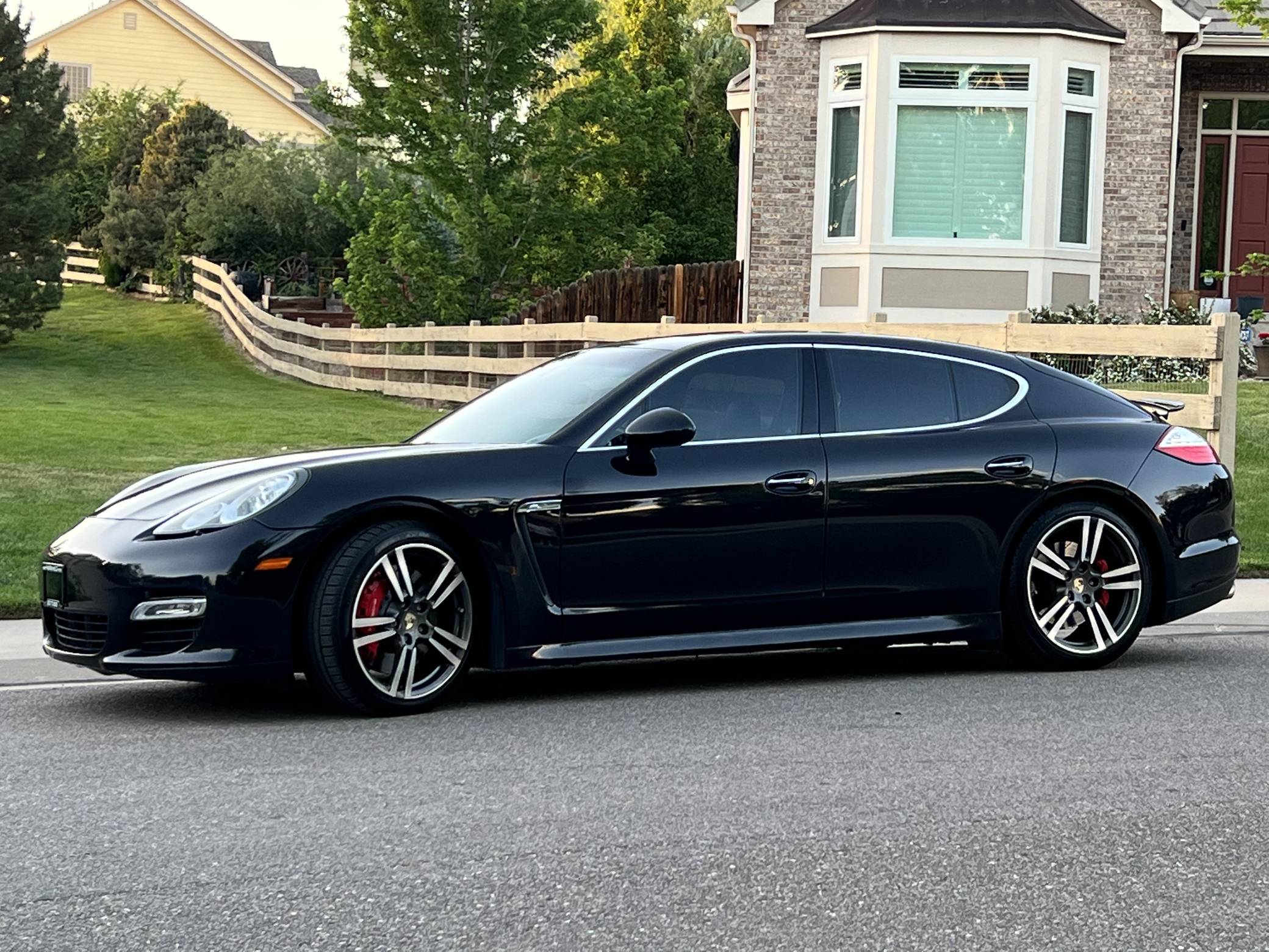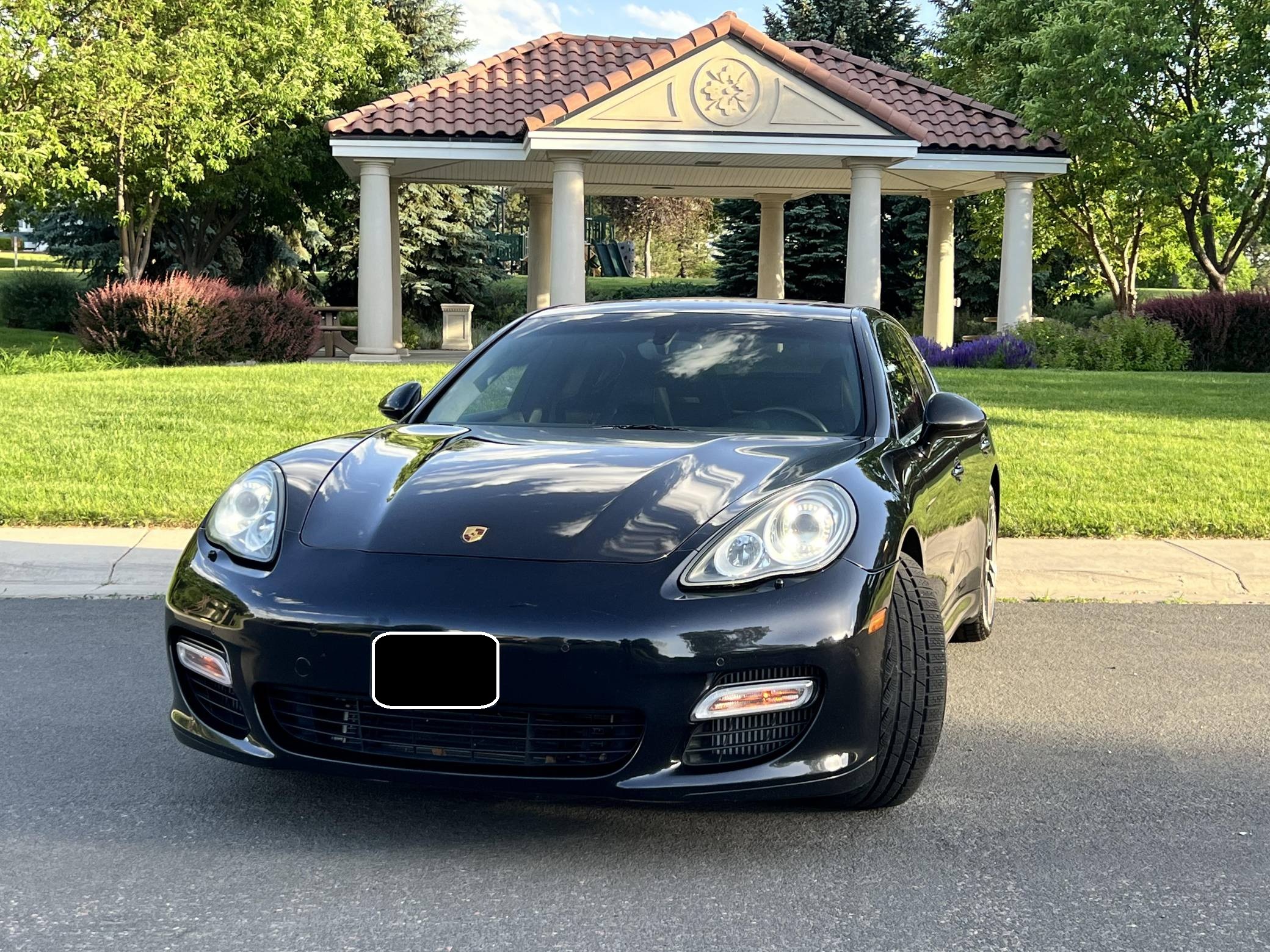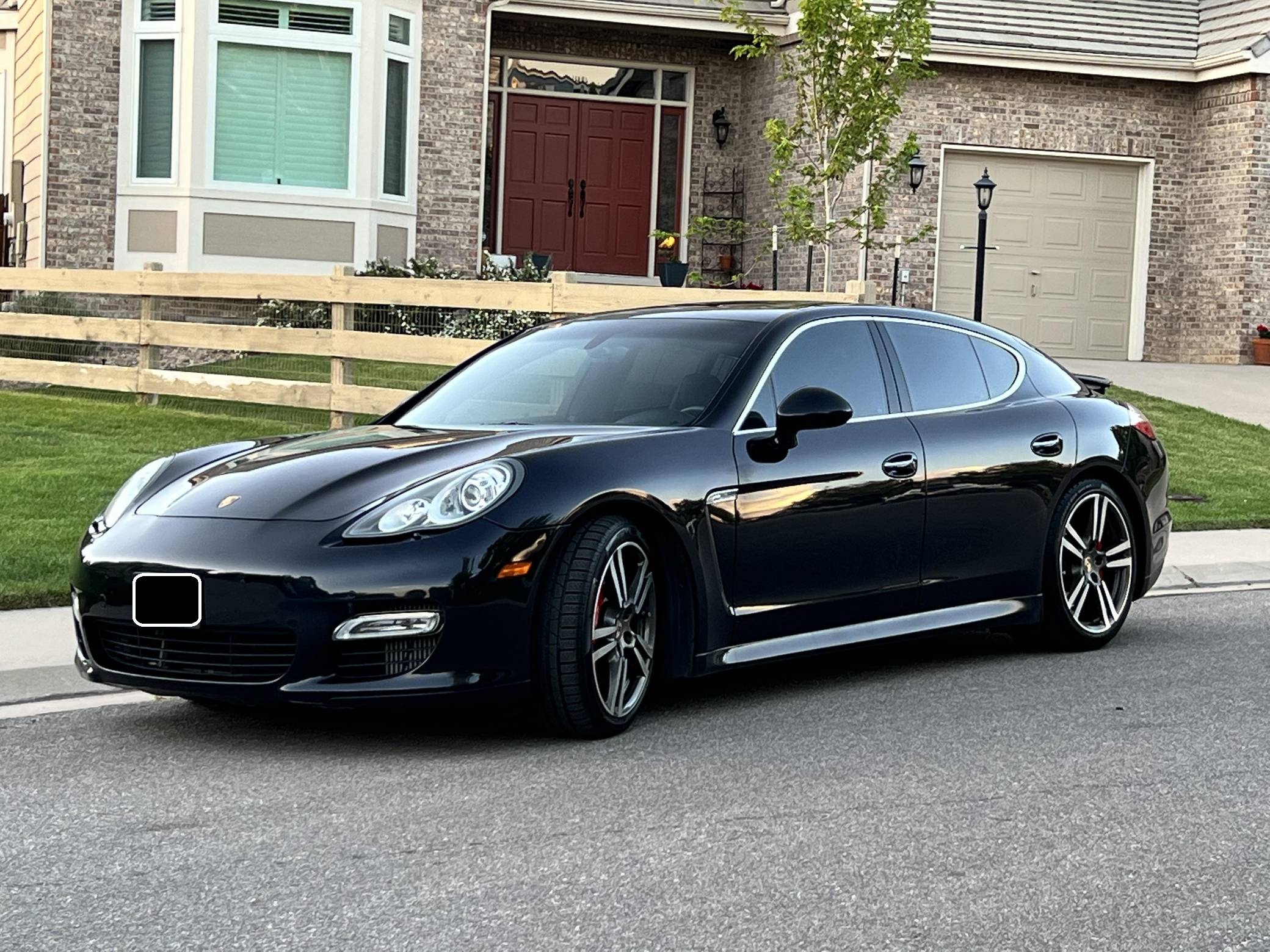 2010 Porsche Panamera Turbo, finished in Basalt Black Metallic with a black interior. The odometer indicates approximately 53,800 miles. Factory equipment includes 20-inch 911 Turbo II wheels, Porsche Dynamic Chassis Control (PDCC) with adaptive air suspension and the Porsche Torque Vectoring Plus, a full leather interior, Tineo wood interior trim, heated and ventilated front and rear seats, power rear sunshades, ParkAssist, and a Bose sound system. Modifications reported by the seller are limited to paint protection film on forward-facing surfaces and tinted windows. After several false starts, Porsche entered the sedan segment for the first time when it launched the original Panamera for 2010. While its design and its very existence were controversial, the Panamera ultimately drew praise as the sportiest model in its segment and it achieved this distinction without sacrificing comfort or luxury. The Turbo model slotted near the top of the line-up when it arrived for 2011. Power comes from a 4. 8-liter twin-turbocharged V8, rated at 500 horsepower and 516 lb-ft of torque. It spins all four wheels via a 7-speed double-clutch automatic transmission.