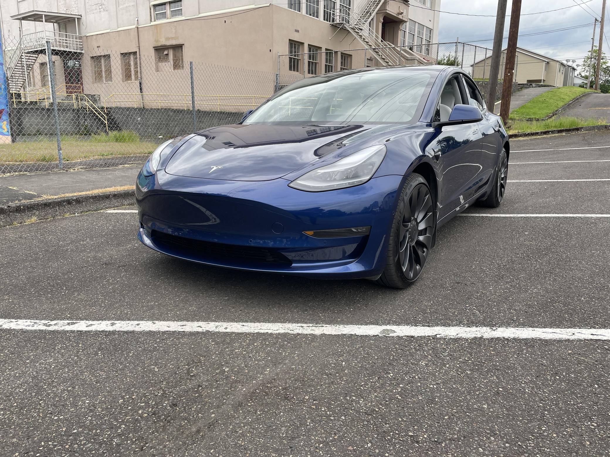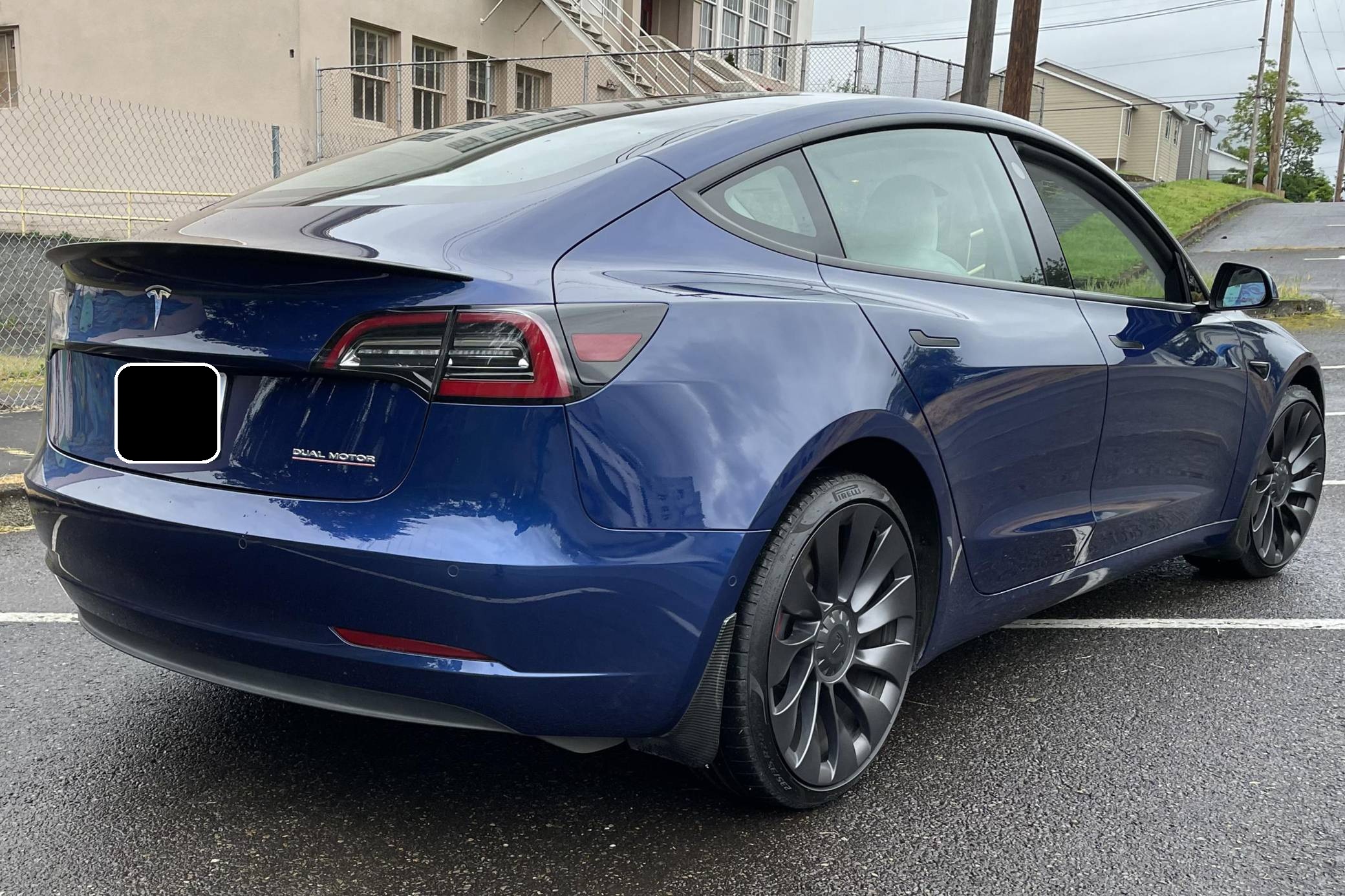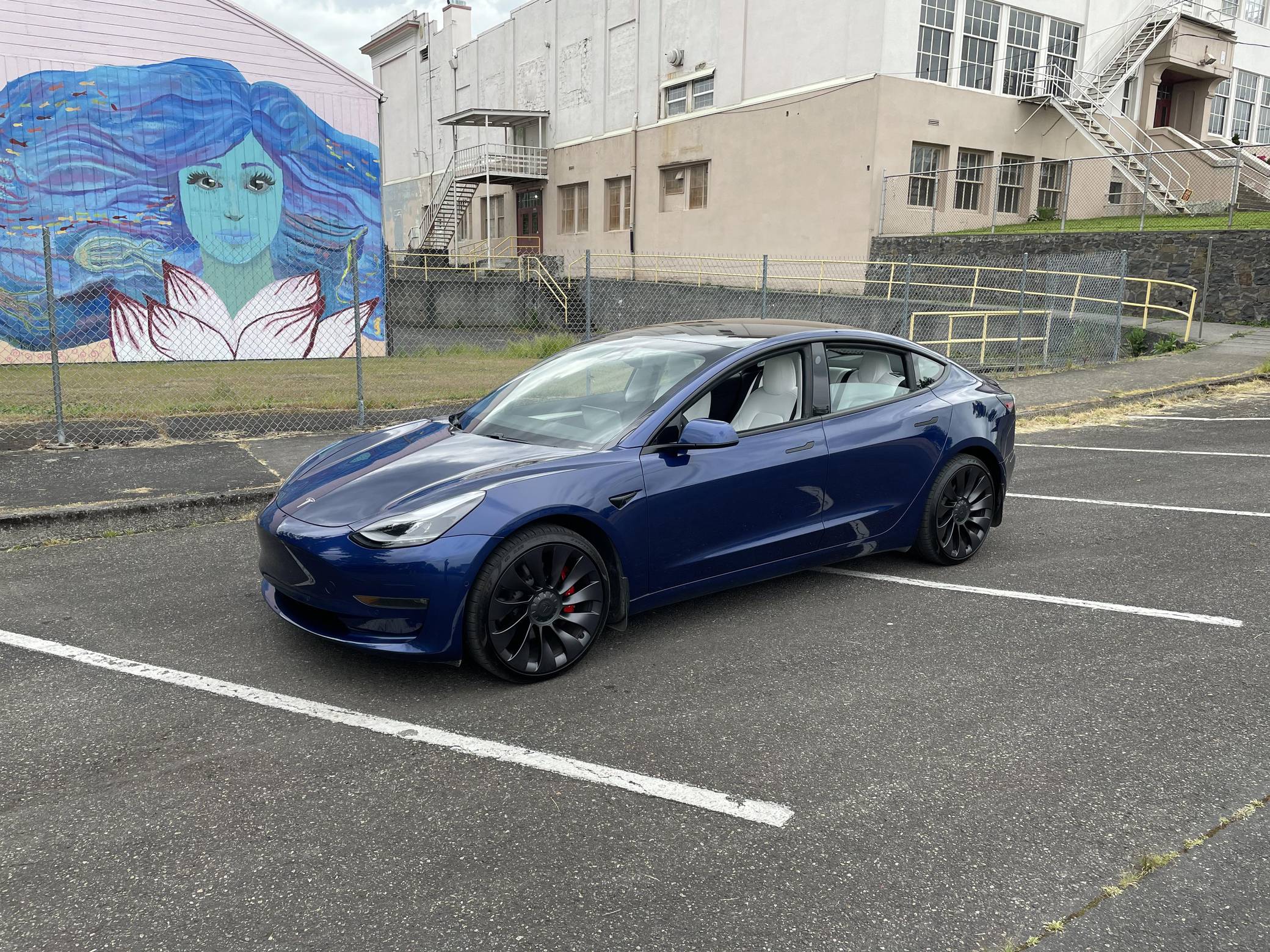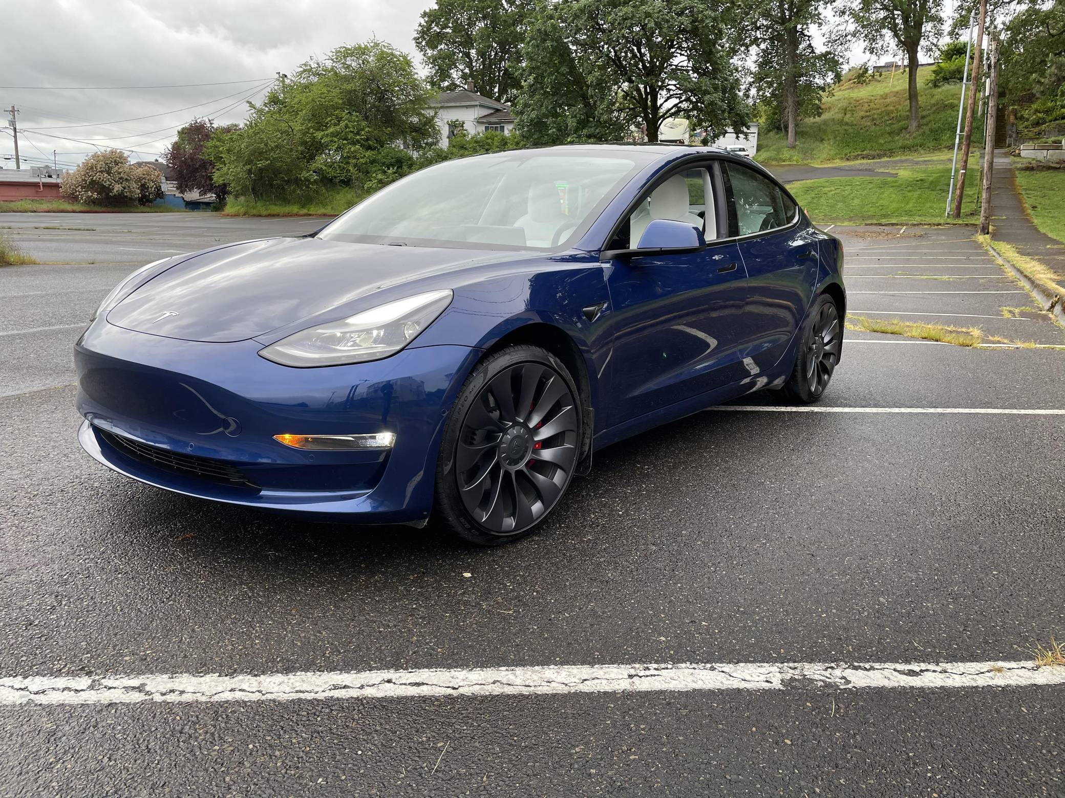 2021 Tesla Model 3 Performance, finished in Deep Blue Metallic with a white interior. Factory equipment includes the Premium Interior package, 20-inch Überturbine wheels, Performance brakes, a carbon fiber rear spoiler, Autopilot, and more as listed below. The seller reports no modifications. Positioned as Tesla's entry-level car, the Model 3 was celebrated as a premium EV with a usable range and respectable performance, all at a reasonably attainable price. It's still available today, and it has gone through several evolutions (including many software updates) since its introduction. Power comes from a pair of electric motors that draw electricity from an 82-kilowatt-hour lithium-ion battery pack to zap the four wheels with approximately 470 horsepower, according to third-party estimates. This Model 3's maximum driving range was rated at 315 miles in 2021 by the EPA.