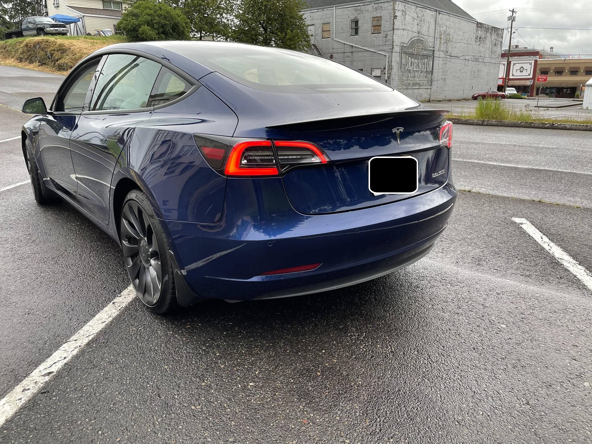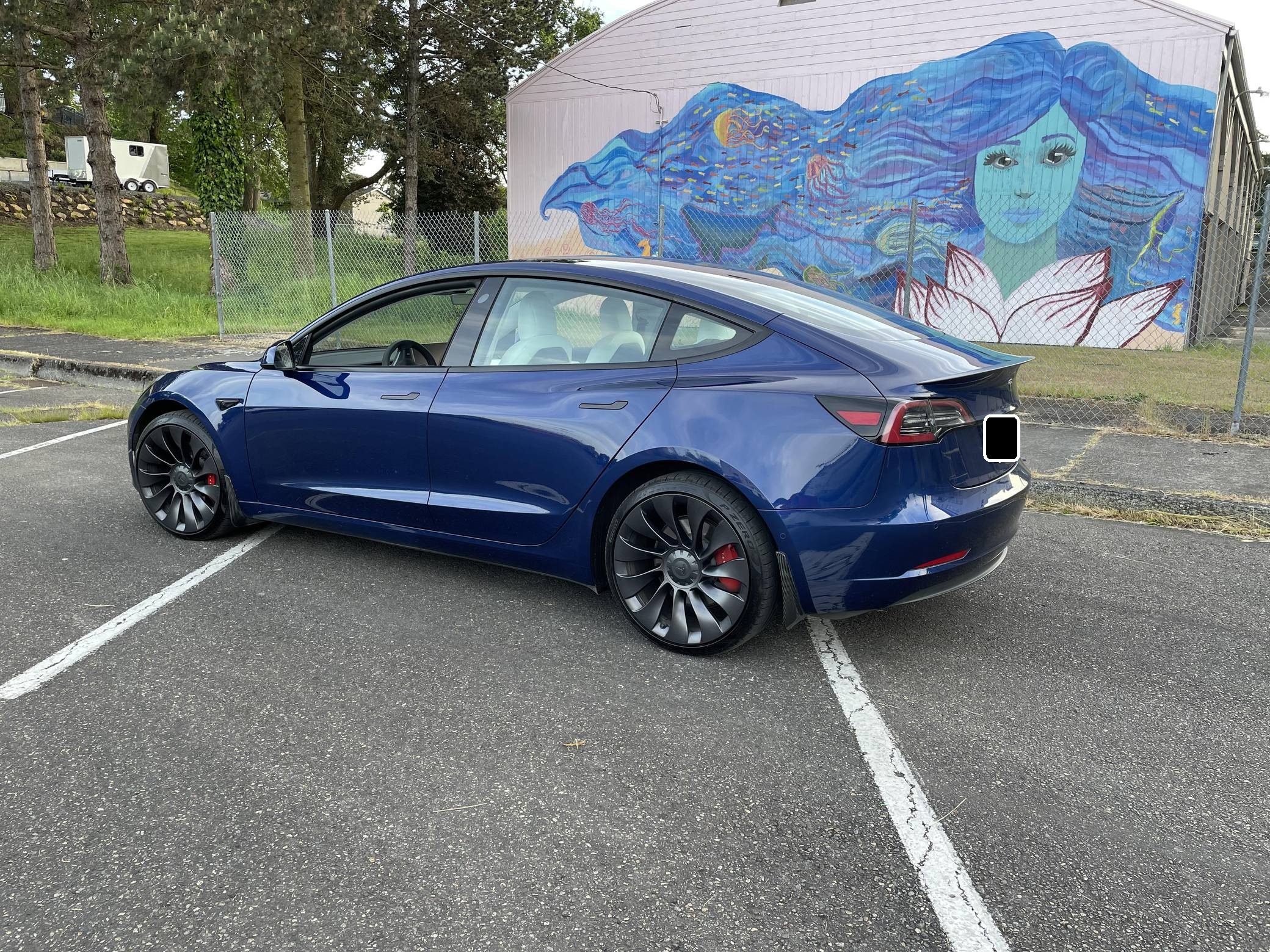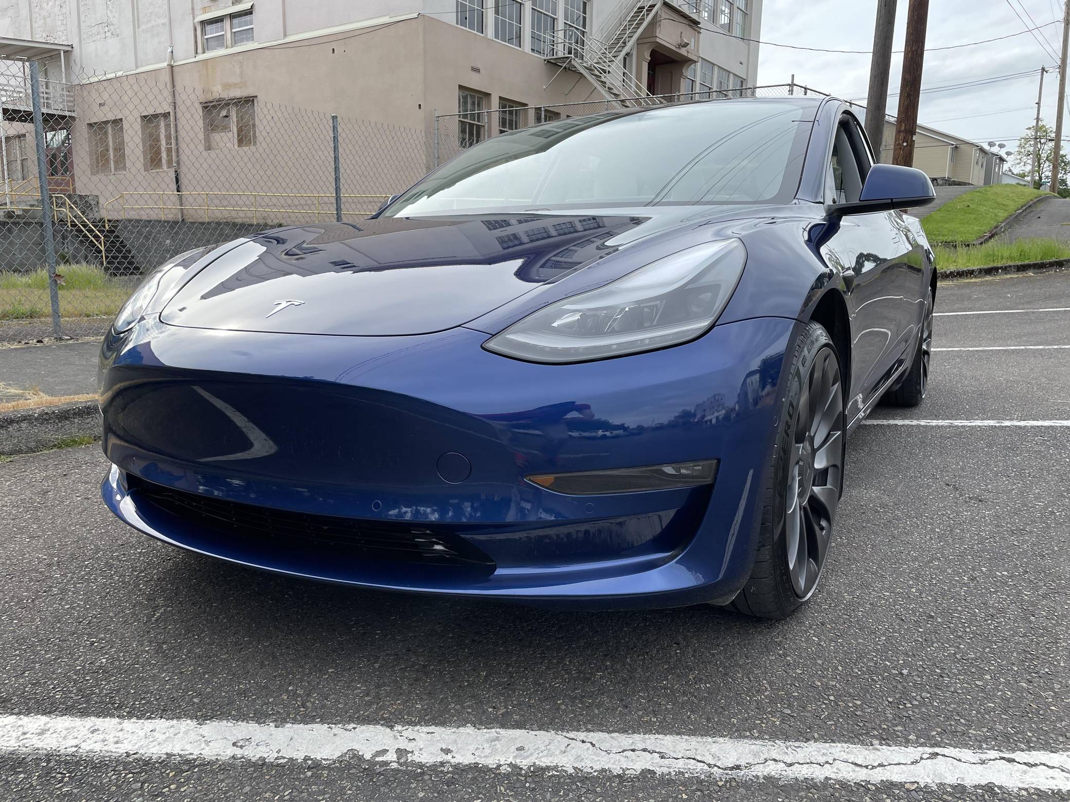 2021 Tesla Model 3 Performance, finished in Deep Blue Metallic with a white interior. Factory equipment includes the Premium Interior package, 20-inch Überturbine wheels, Performance brakes, a carbon fiber rear spoiler, Autopilot, and more as listed below. The seller reports no modifications. Positioned as Tesla's entry-level car, the Model 3 was celebrated as a premium EV with a usable range and respectable performance, all at a reasonably attainable price. It's still available today, and it has gone through several evolutions (including many software updates) since its introduction. Power comes from a pair of electric motors that draw electricity from an 82-kilowatt-hour lithium-ion battery pack to zap the four wheels with approximately 470 horsepower, according to third-party estimates. This Model 3's maximum driving range was rated at 315 miles in 2021 by the EPA.