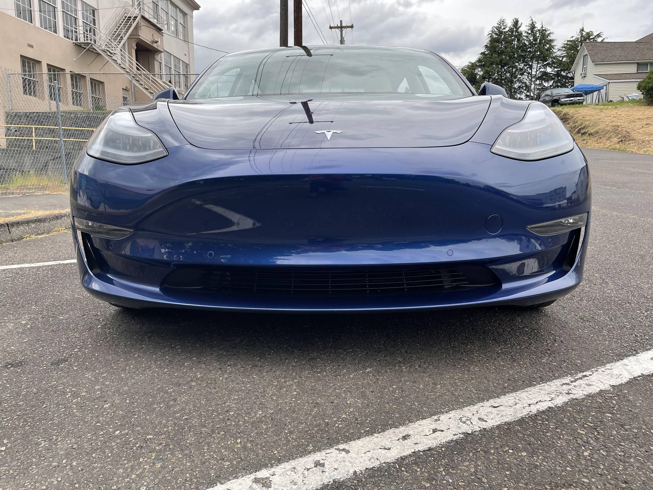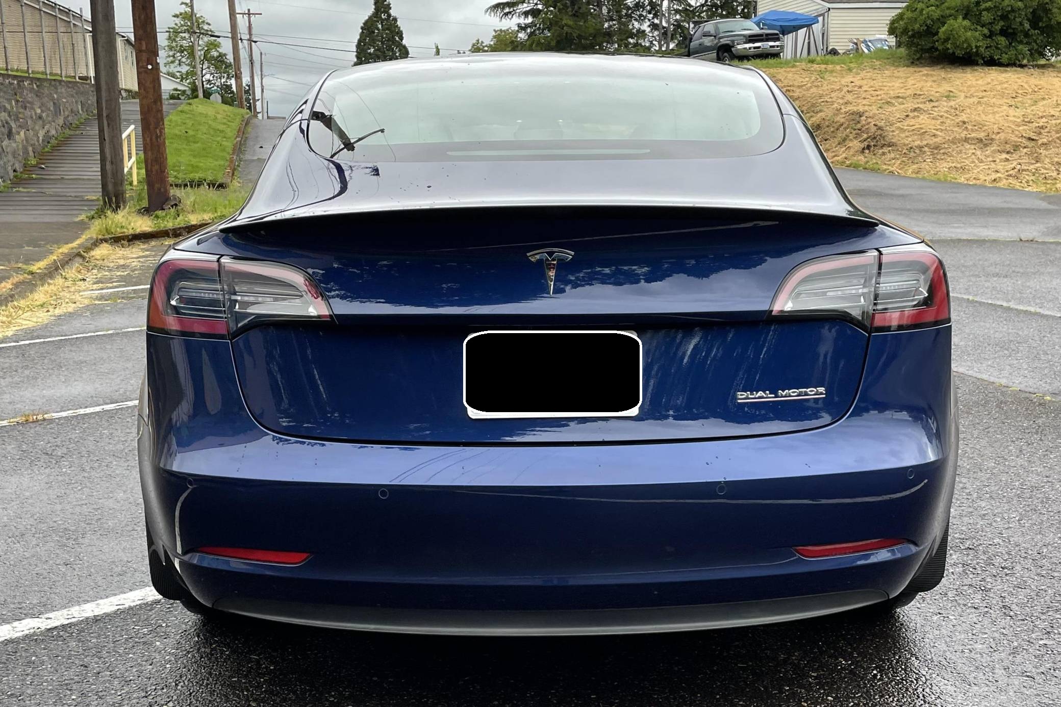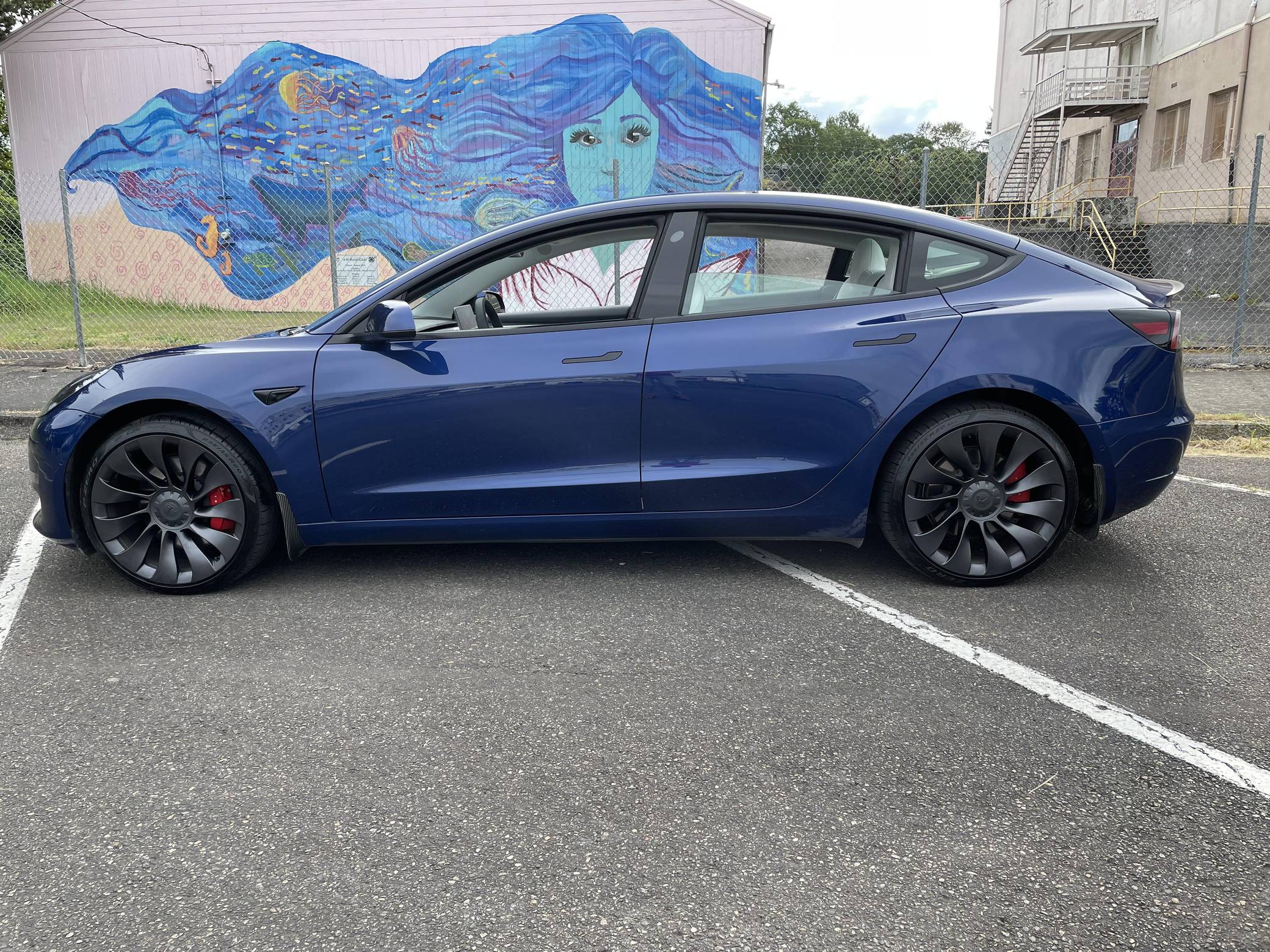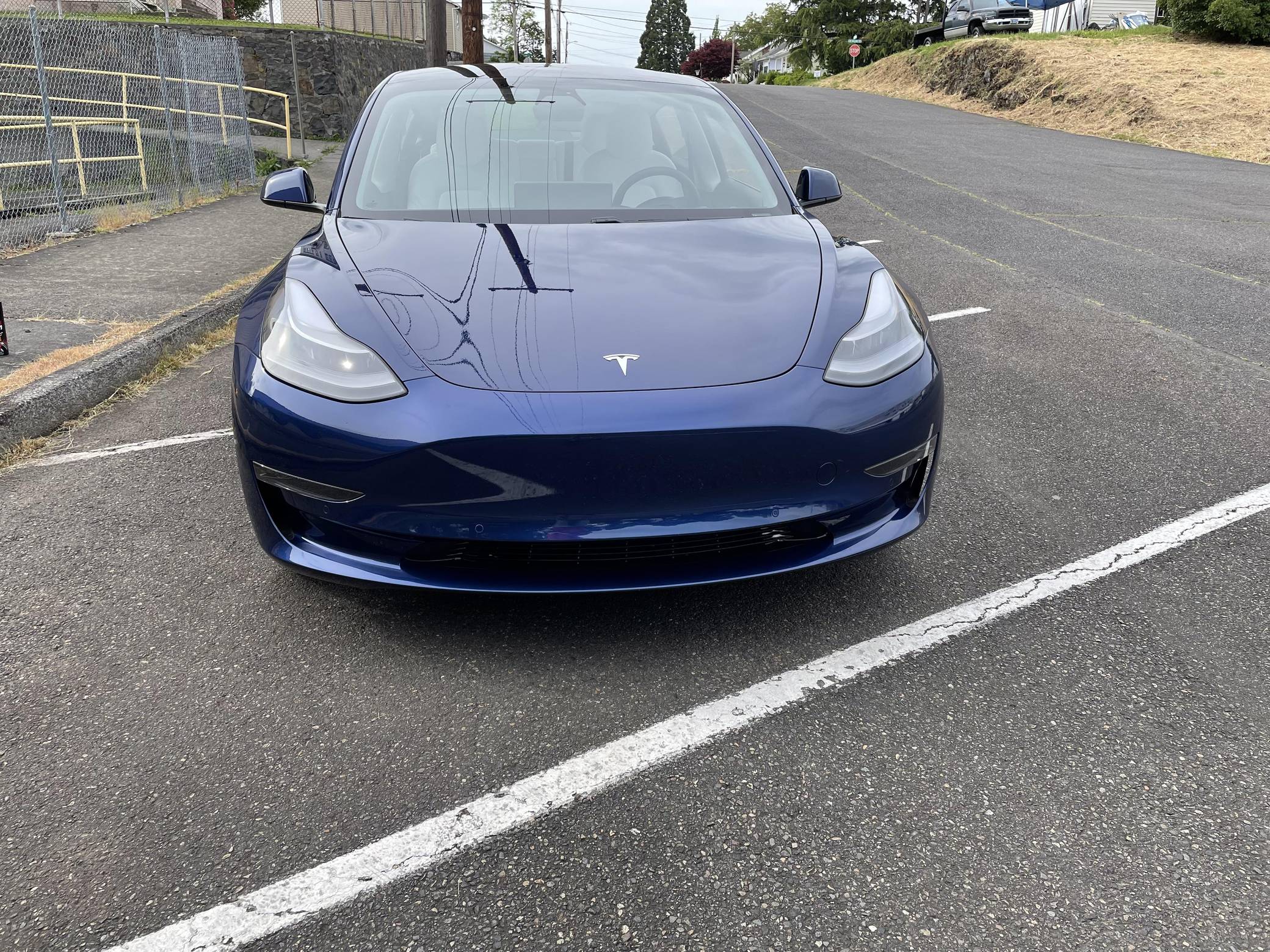2021 Tesla Model 3 Performance, finished in Deep Blue Metallic with a white interior. Factory equipment includes the Premium Interior package, 20-inch Überturbine wheels, Performance brakes, a carbon fiber rear spoiler, Autopilot, and more as listed below. The seller reports no modifications. Positioned as Tesla's entry-level car, the Model 3 was celebrated as a premium EV with a usable range and respectable performance, all at a reasonably attainable price. It's still available today, and it has gone through several evolutions (including many software updates) since its introduction. Power comes from a pair of electric motors that draw electricity from an 82-kilowatt-hour lithium-ion battery pack to zap the four wheels with approximately 470 horsepower, according to third-party estimates. This Model 3's maximum driving range was rated at 315 miles in 2021 by the EPA.
