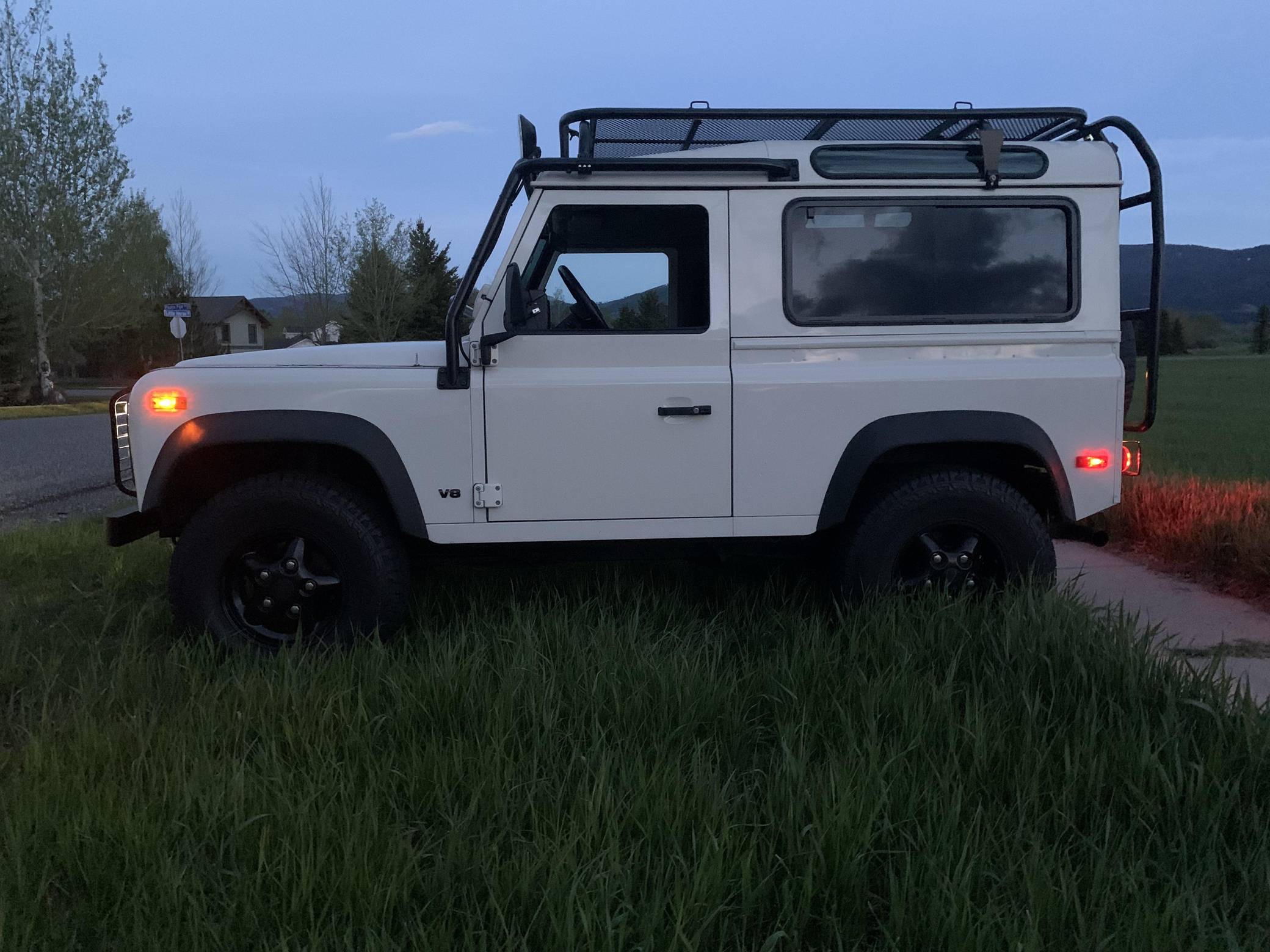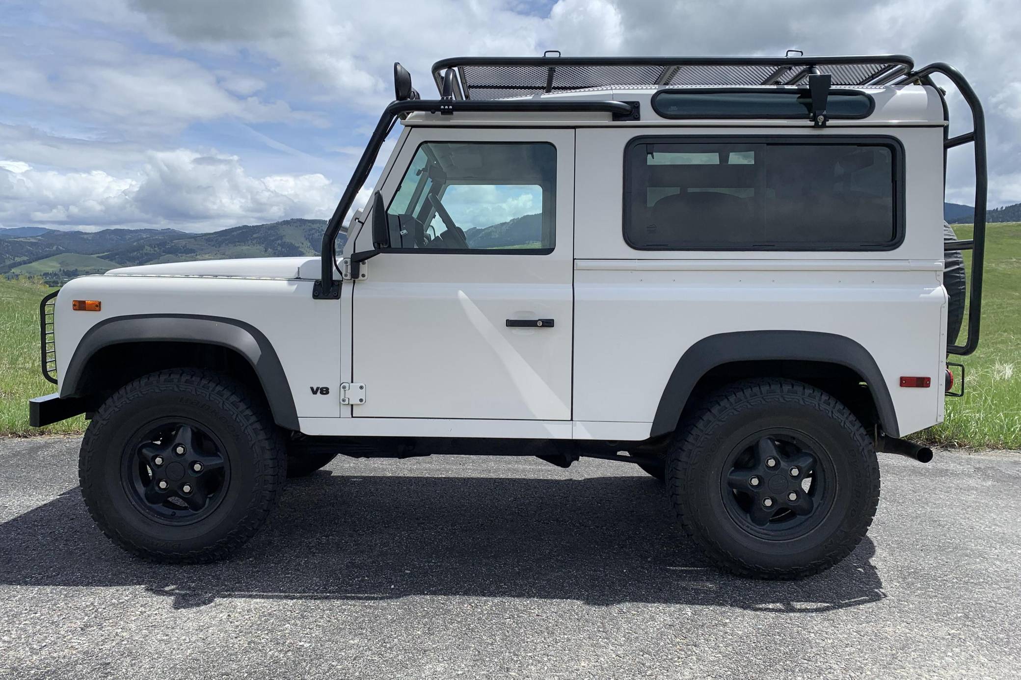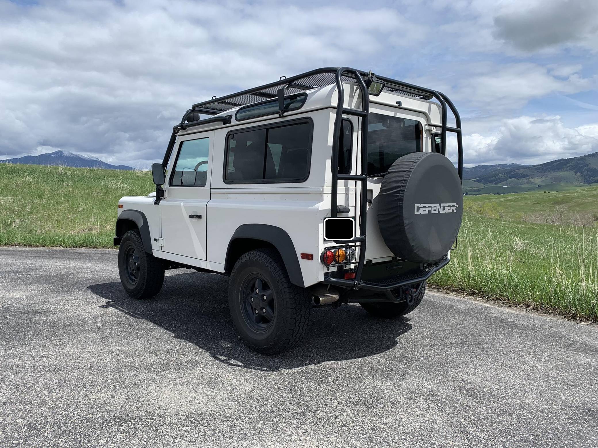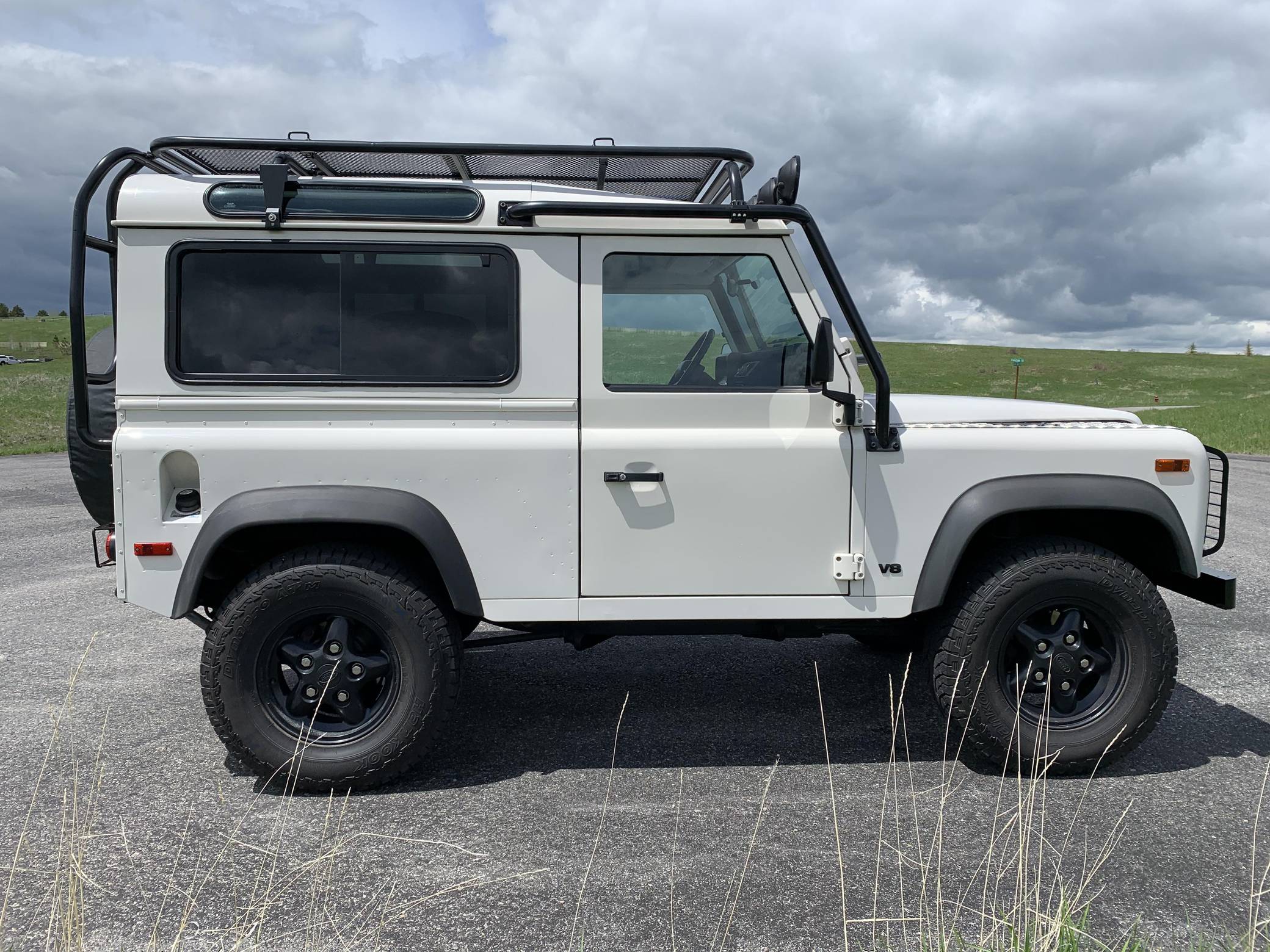 1995 Land Rover Defender 90 NAS, finished in Alpine White with a black interior. Factory equipment includes 16-inch alloy wheels, a dual-range transfer case, air conditioning, and manual windows, among others listed below. Modifications to this Defender 90 are extensive, and the full list is detailed below. include a 4. 6 Rover V8 from a 2003 Land Rover Discovery, LED exterior lights, a Lelo Fabrication roof rack and ladder system, Puma doors, aftermarket leather upholstery, aftermarket headliner and carpet, and a Mud-UK center dashboard console. The NAS Defender 90 was sold new in North America with revisions designed to comply with U. S. market demands and regulations; accordingly, NAS Defender 90 models are legal to register throughout the United States and Canada (including California). NAS Defender 90 models were offered in the U. S. for the 1994, 1995, and 1997 model years. They differed from their rest-of-world counterparts in that they came with a V8 engine, unique bodywork, and an external roll cage. Power comes from a 4. 6-liter Rover V8, rated at 217 horsepower and 300 lb-ft of torque. This engine may be making more power as a result of the modifications, though a dyno sheet is not included. Output is sent to all four wheels through a 5-speed manual transmission and a 2-speed transfer case with a locking center differential.