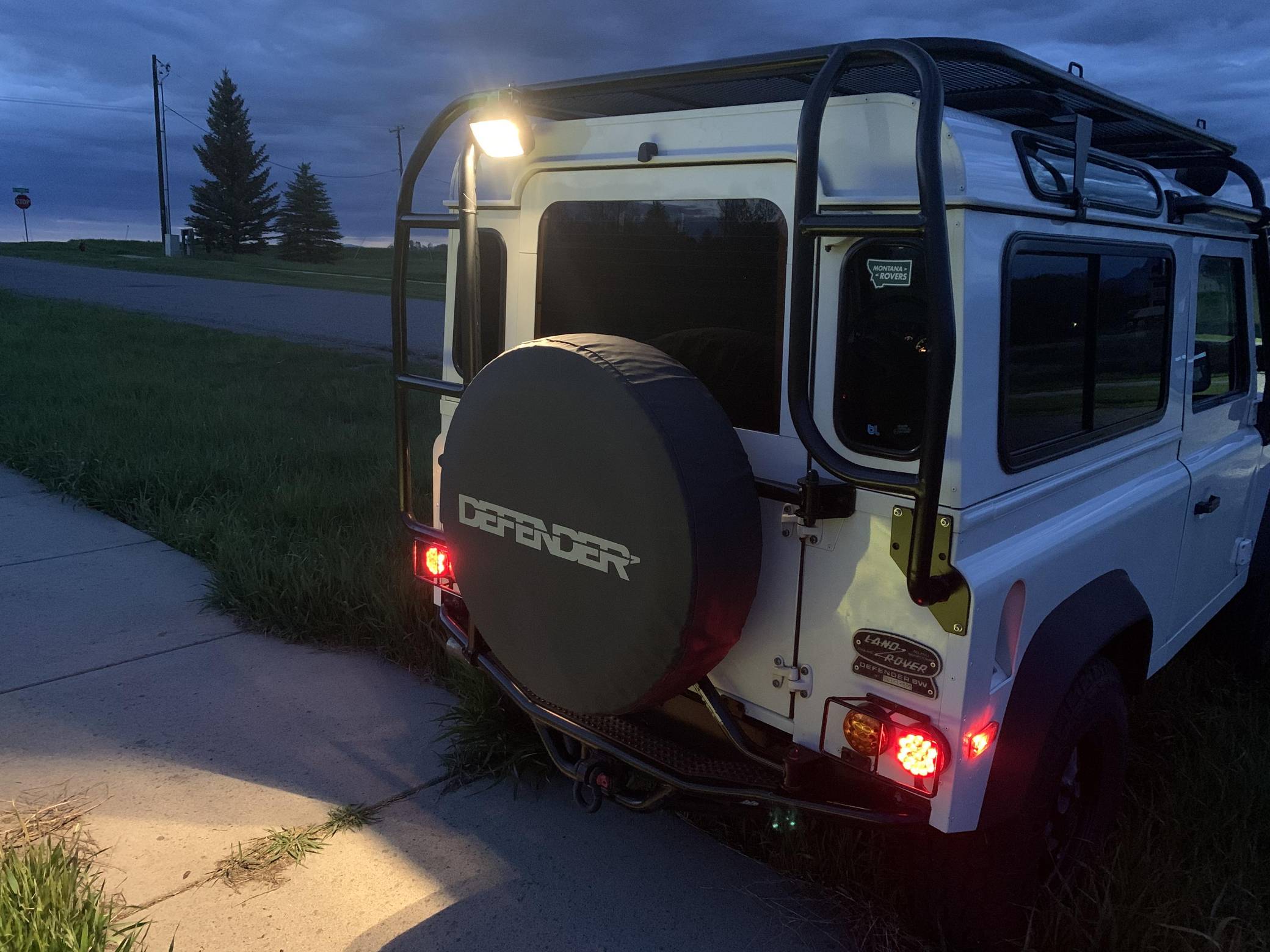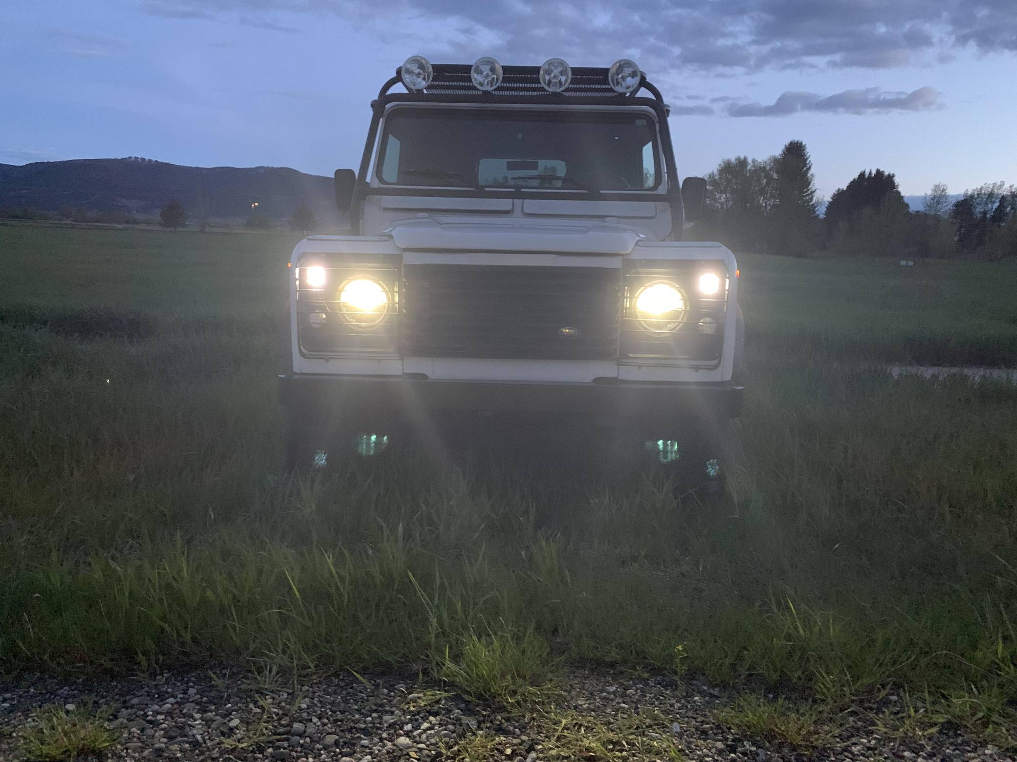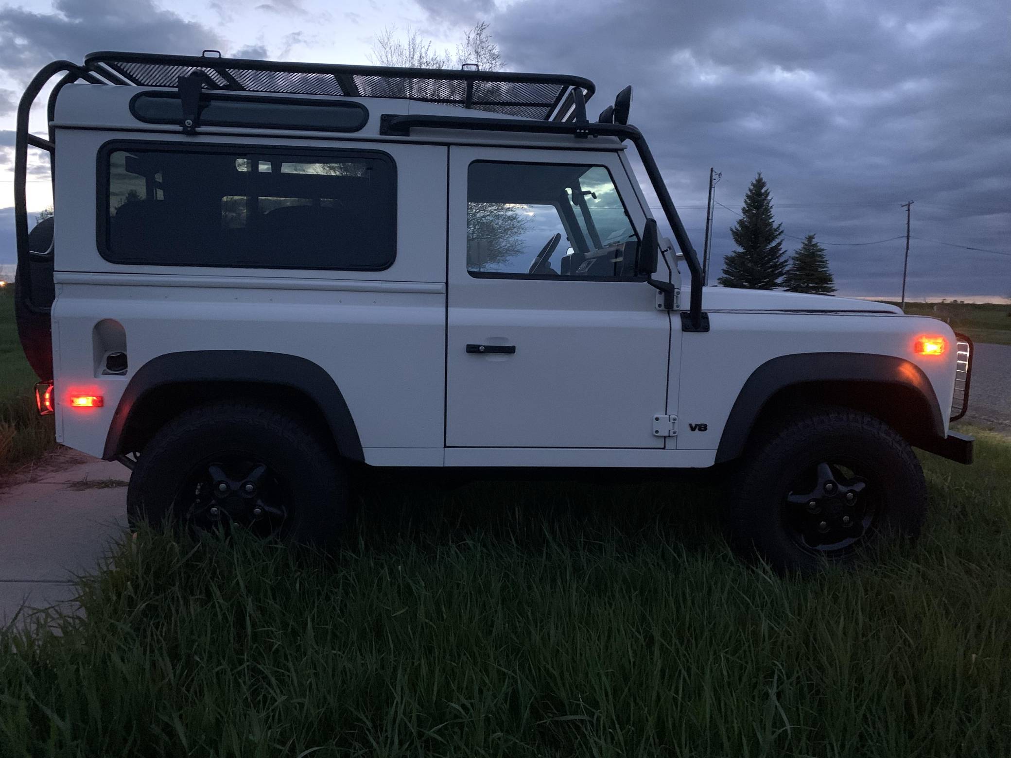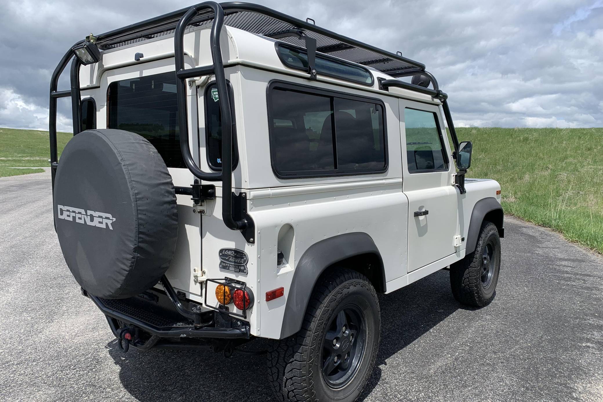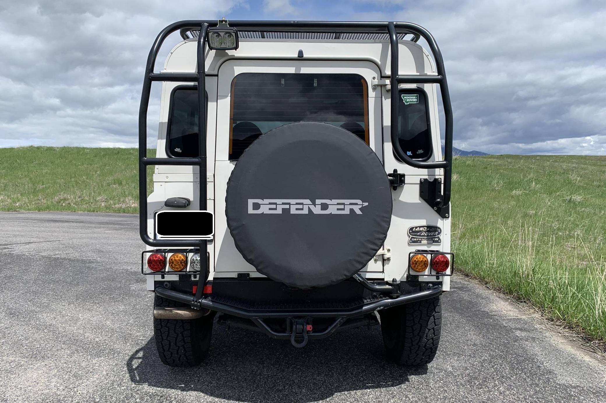 1995 Land Rover Defender 90 NAS, finished in Alpine White with a black interior. Factory equipment includes 16-inch alloy wheels, a dual-range transfer case, air conditioning, and manual windows, among others listed below. Modifications to this Defender 90 are extensive, and the full list is detailed below. include a 4. 6 Rover V8 from a 2003 Land Rover Discovery, LED exterior lights, a Lelo Fabrication roof rack and ladder system, Puma doors, aftermarket leather upholstery, aftermarket headliner and carpet, and a Mud-UK center dashboard console. The NAS Defender 90 was sold new in North America with revisions designed to comply with U. S. market demands and regulations; accordingly, NAS Defender 90 models are legal to register throughout the United States and Canada (including California). NAS Defender 90 models were offered in the U. S. for the 1994, 1995, and 1997 model years. They differed from their rest-of-world counterparts in that they came with a V8 engine, unique bodywork, and an external roll cage. Power comes from a 4. 6-liter Rover V8, rated at 217 horsepower and 300 lb-ft of torque. This engine may be making more power as a result of the modifications, though a dyno sheet is not included. Output is sent to all four wheels through a 5-speed manual transmission and a 2-speed transfer case with a locking center differential.