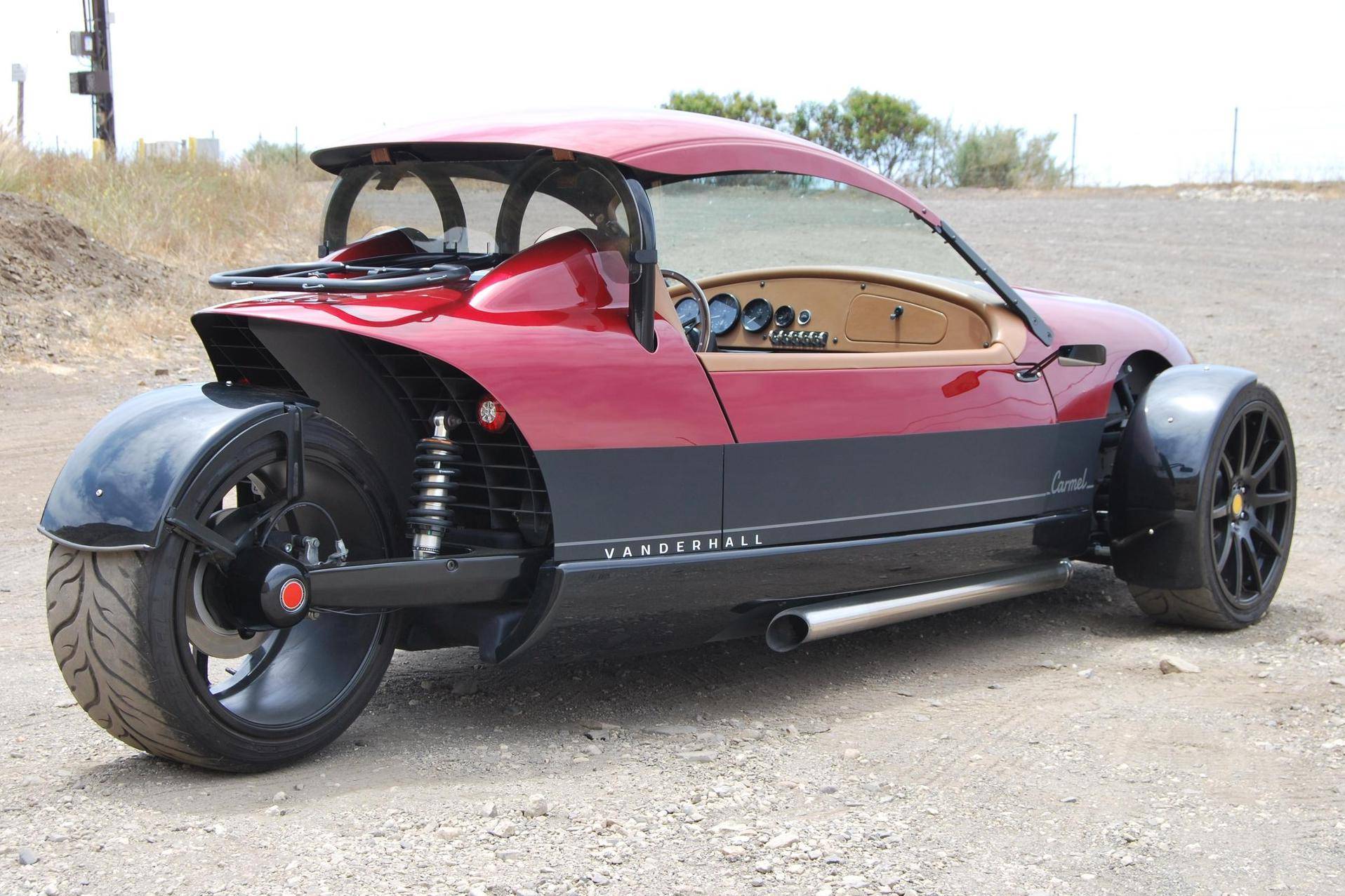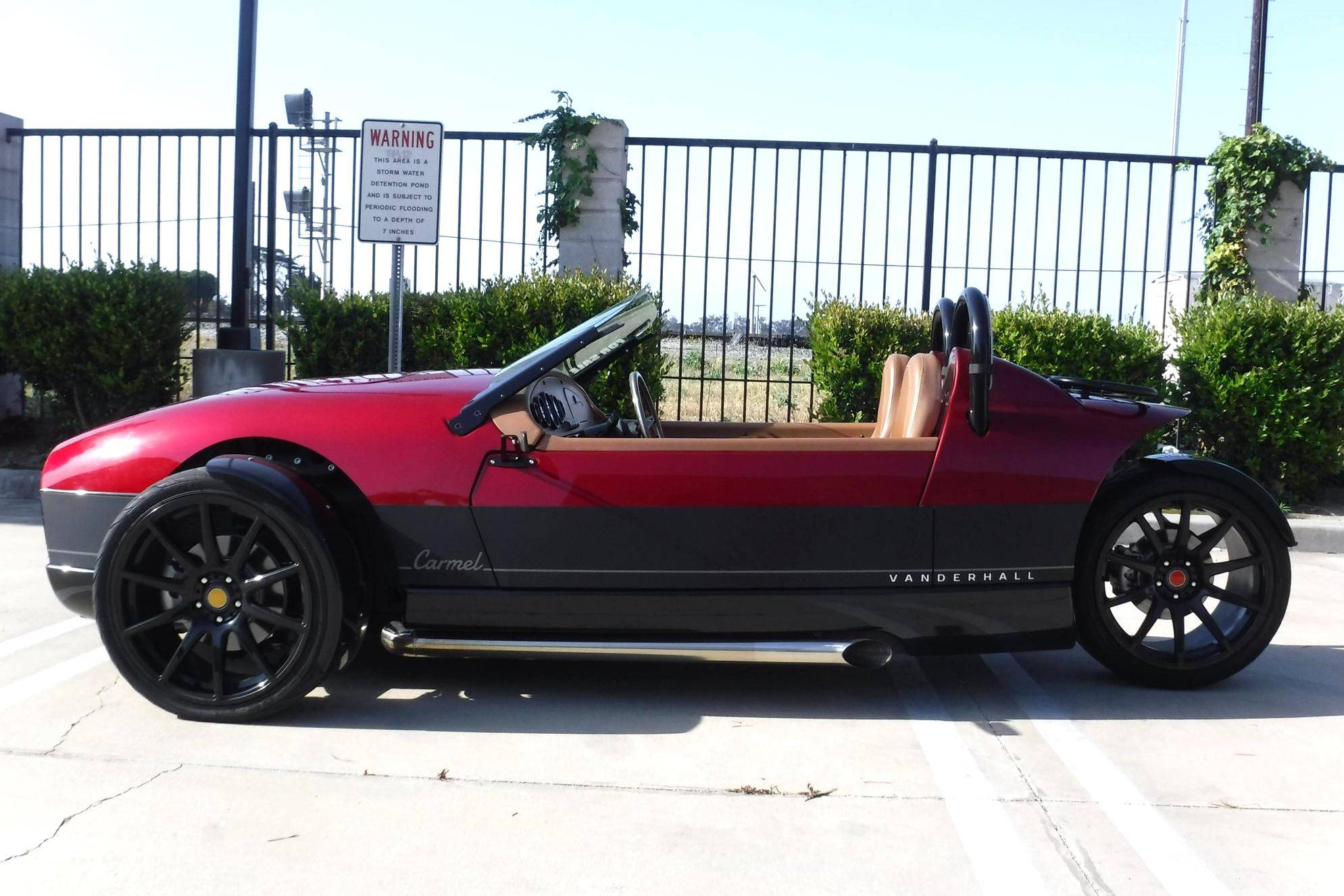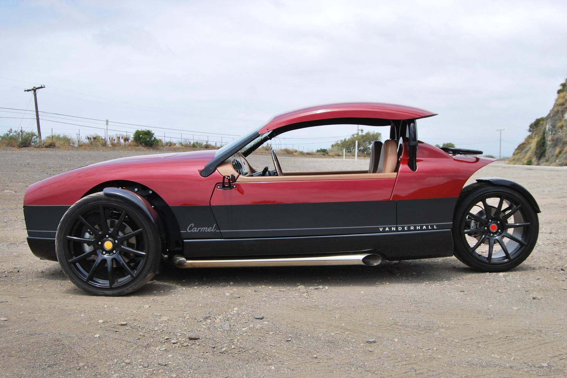 2020 Vanderhall Carmel GT, finished in Ruby Metallic with a color-matched removable hardtop and a tan interior. The odometer currently indicates approximately 6,300 miles. Equipment includes 19-inch wheels, a pushrod suspension system, a 3-inch sport exhaust, composite bodywork, a color-matched removable hardtop, rear-hinged doors, leather upholstery, heated seats, a wood-rimmed steering wheel, cruise control, and more as detailed below. A partial list of modifications reported by the seller includes a custom rear windscreen, aftermarket mirrors, LED lighting for turn signals and DRLs, an aftermarket luggage rack, a reversing camera, a custom sound system, and a center console with USB port. The Vanderhall Carmel GT exists in a small niche of enthusiast vehicles occupied by the Morgan 3 Wheeler, Polaris Slingshot, MEV tR1ke, and a few others. Positioned near the upper end of the market, the Carmel GT comes with a GM four cylinder that propels this machine from 0 to 60 mph in just over four seconds, according to Vanderhall. Power comes from a 1. 5-liter turbocharged inline-4, rated at 194 horsepower and 203 lb-ft of torque. Output is sent to the front wheels through a 6-speed automatic transmission.