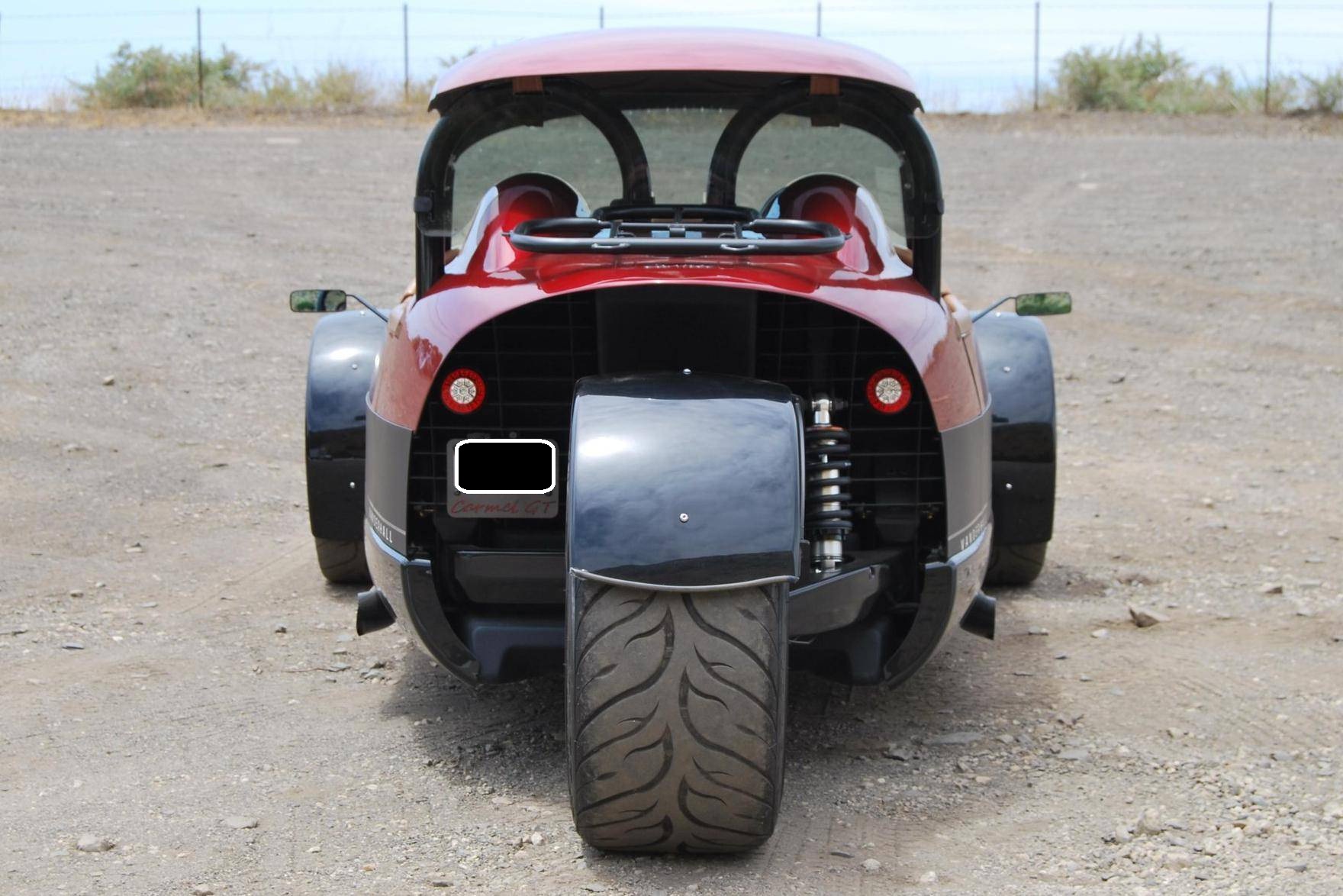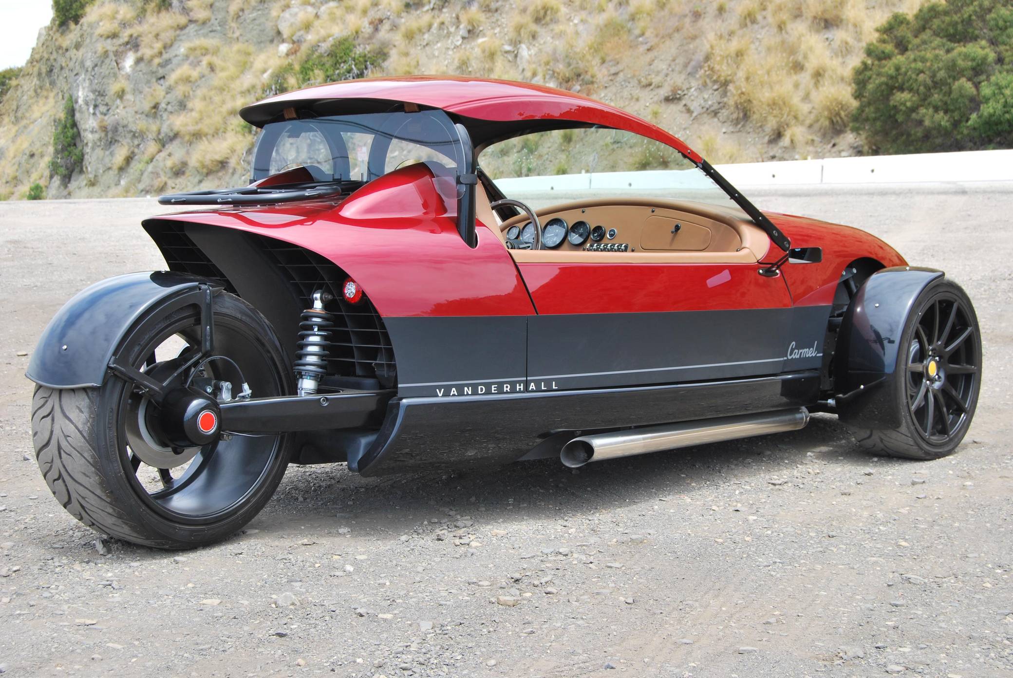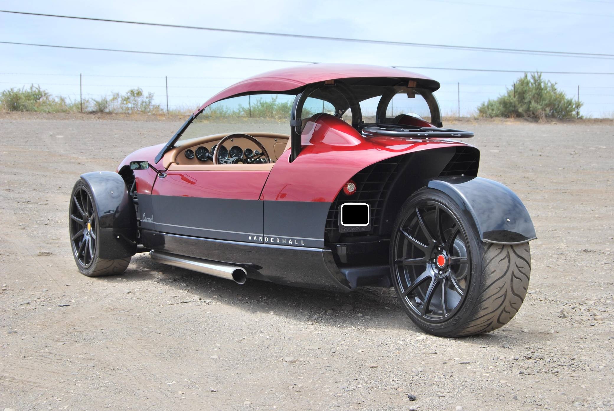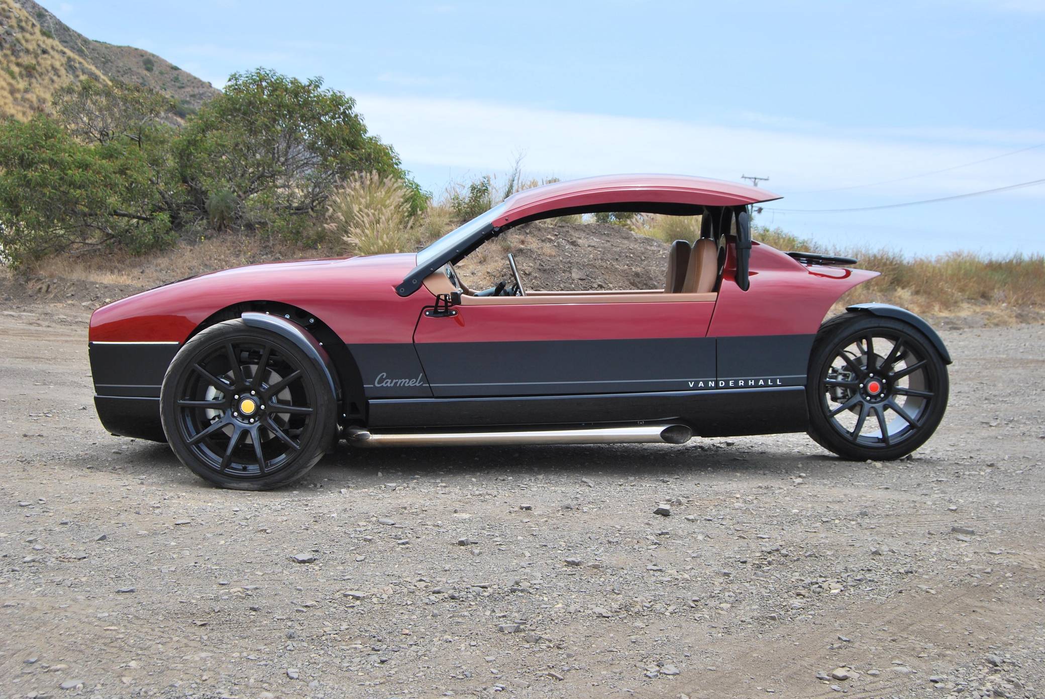 2020 Vanderhall Carmel GT, finished in Ruby Metallic with a color-matched removable hardtop and a tan interior. The odometer currently indicates approximately 6,300 miles. Equipment includes 19-inch wheels, a pushrod suspension system, a 3-inch sport exhaust, composite bodywork, a color-matched removable hardtop, rear-hinged doors, leather upholstery, heated seats, a wood-rimmed steering wheel, cruise control, and more as detailed below. A partial list of modifications reported by the seller includes a custom rear windscreen, aftermarket mirrors, LED lighting for turn signals and DRLs, an aftermarket luggage rack, a reversing camera, a custom sound system, and a center console with USB port. The Vanderhall Carmel GT exists in a small niche of enthusiast vehicles occupied by the Morgan 3 Wheeler, Polaris Slingshot, MEV tR1ke, and a few others. Positioned near the upper end of the market, the Carmel GT comes with a GM four cylinder that propels this machine from 0 to 60 mph in just over four seconds, according to Vanderhall. Power comes from a 1. 5-liter turbocharged inline-4, rated at 194 horsepower and 203 lb-ft of torque. Output is sent to the front wheels through a 6-speed automatic transmission.