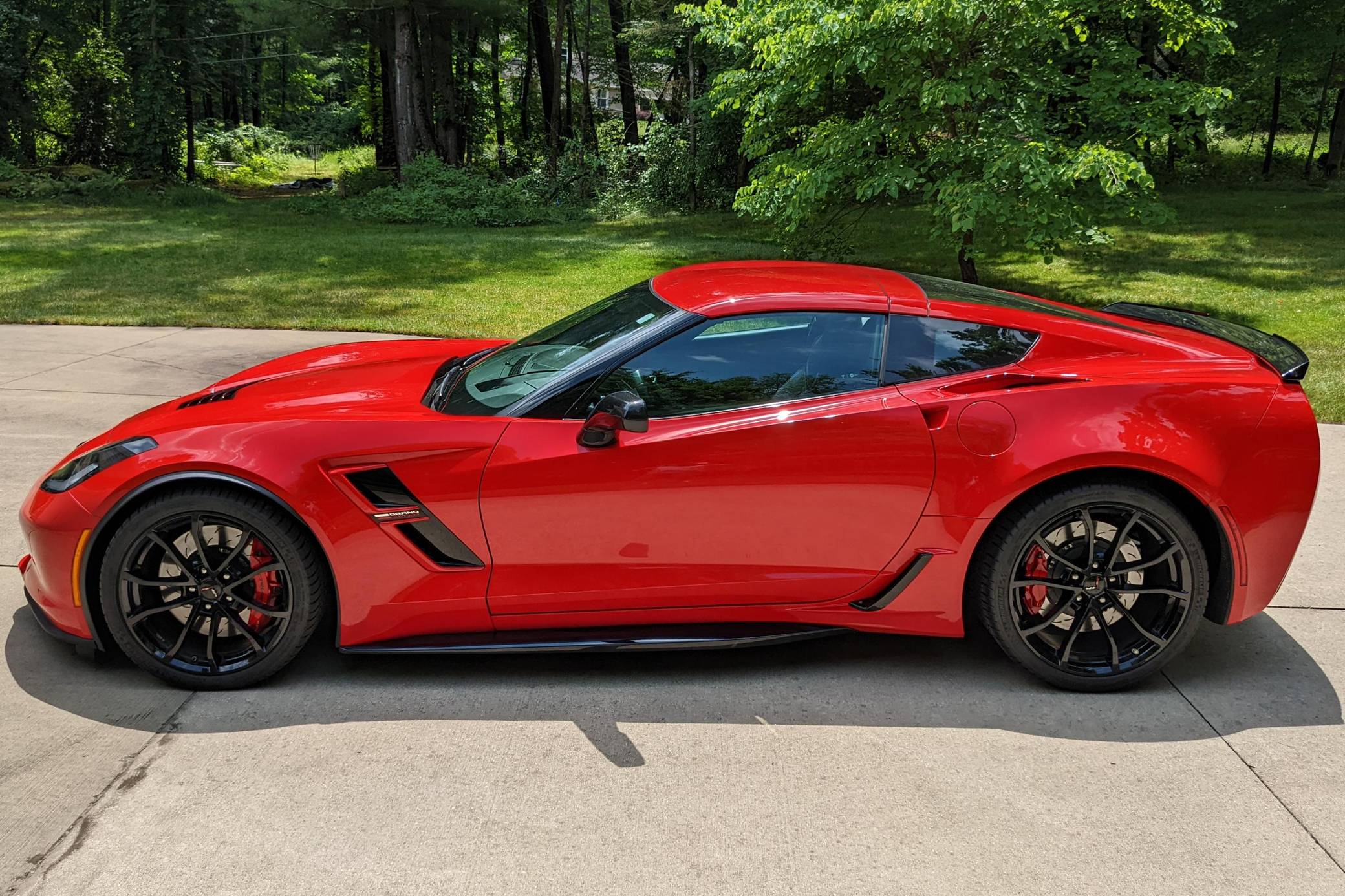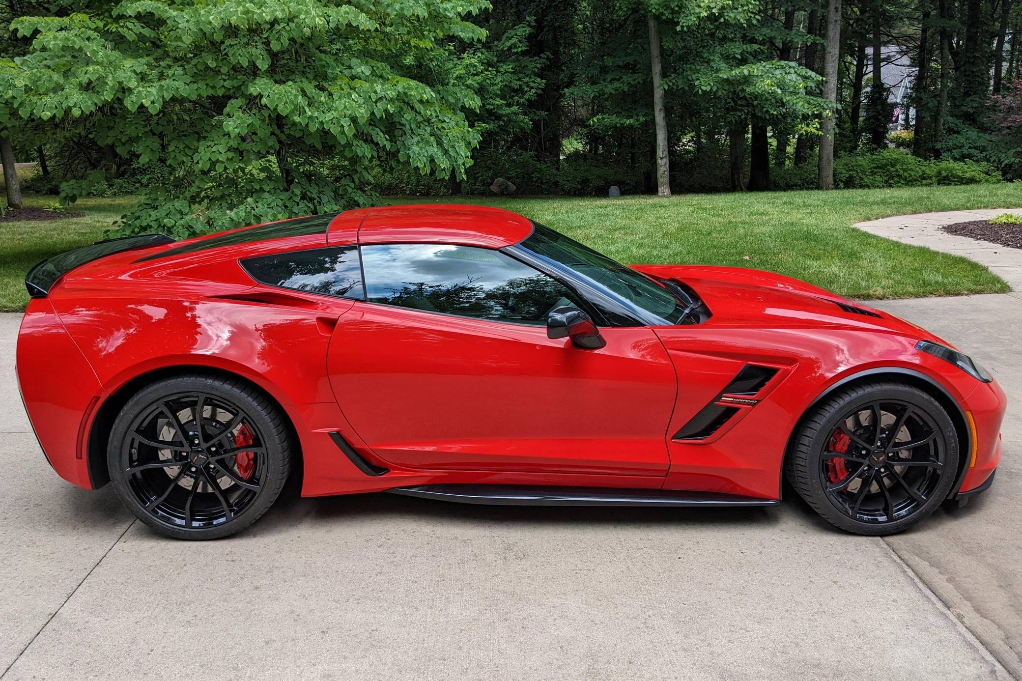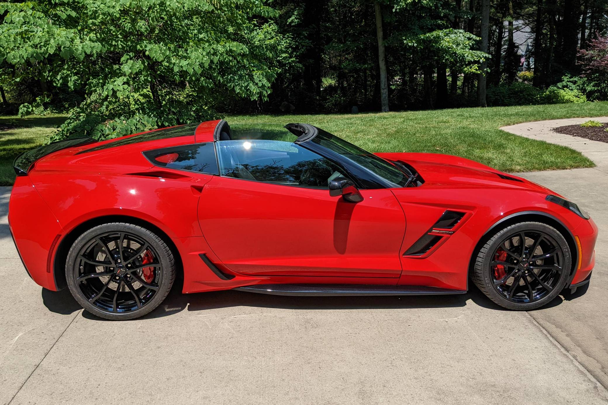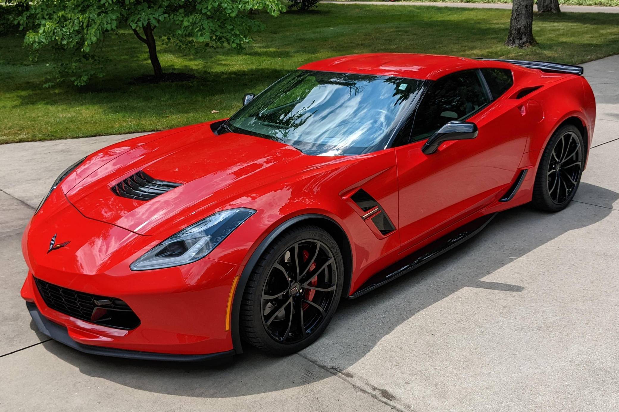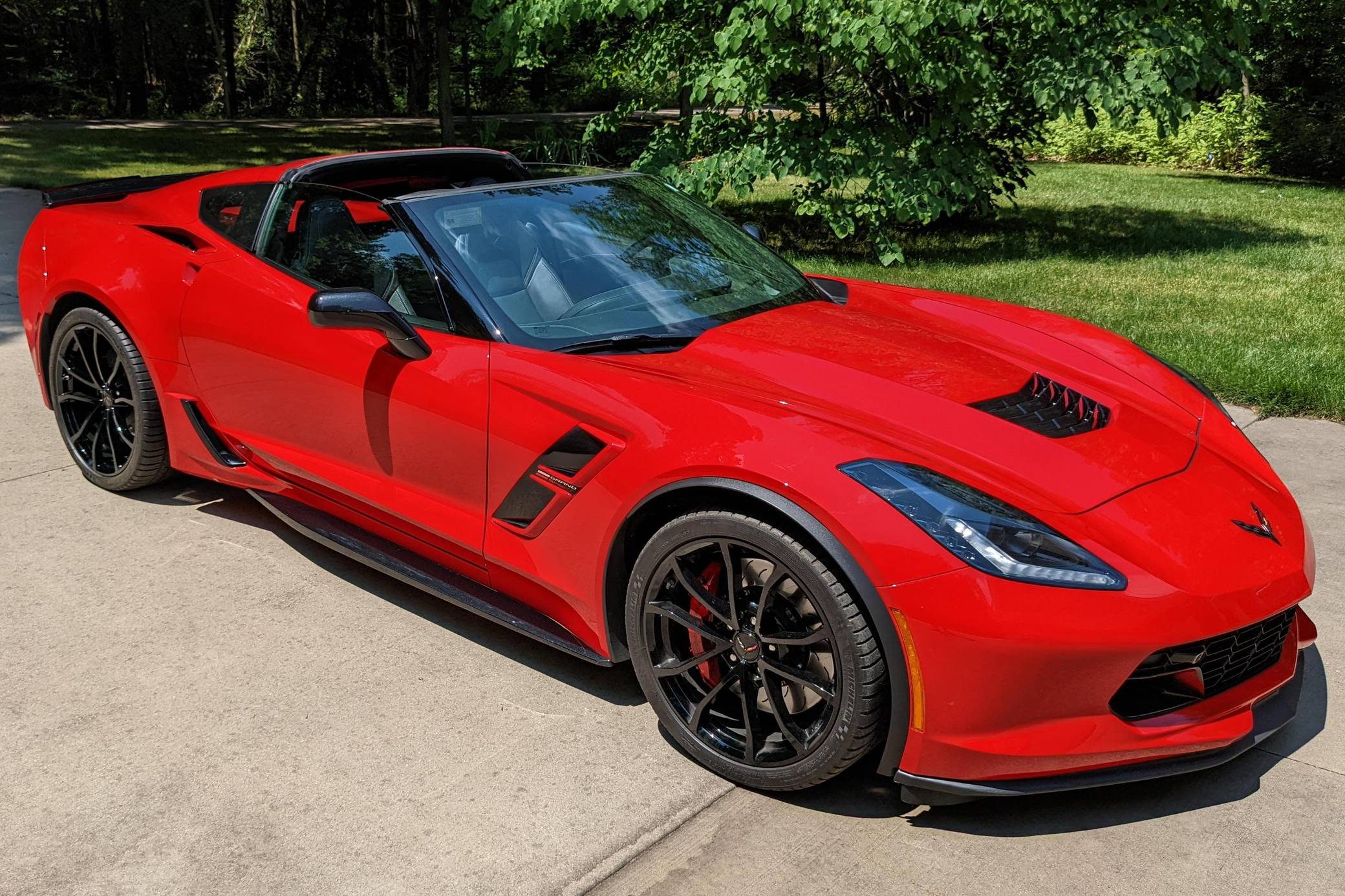 2018 Chevrolet Corvette Grand Sport Coupe, finished in Torch Red with a Jet Black interior. The odometer currently indicates approximately 12,000 miles. Equipped with the 2LT Package, 19-inch front and 20-inch rear wheels, Magnetic Ride Control suspension, a performance exhaust system, a removable roof panel, leather upholstery, a touchscreen infotainment system with Apple CarPlay and Android Auto capabilities, a performance data and video recorder, and more as detailed below. Modifications reported by the seller are limited to paint protection film. Chevrolet launched the seventh-generation "C7" Corvette for the 2014 model year. It offered a more user-friendly interior, a sharper-looking exterior design, and, significantly, the then-new "LT1" small-block V8. Released for 2017, the Grand Sport was a track-bred model positioned near the middle of the range. It offered enthusiasts Z06-like wide body panels, a naturally-aspirated V8 shared with the Stingray, and performance upgrades like an electronic limited-slip differential. Power for this Corvette comes from a 6. 2-liter "LT1" V8, rated at 460 horsepower and 465 lb-ft of torque. Output is sent to the rear wheels via an 8-speed automatic transmission.