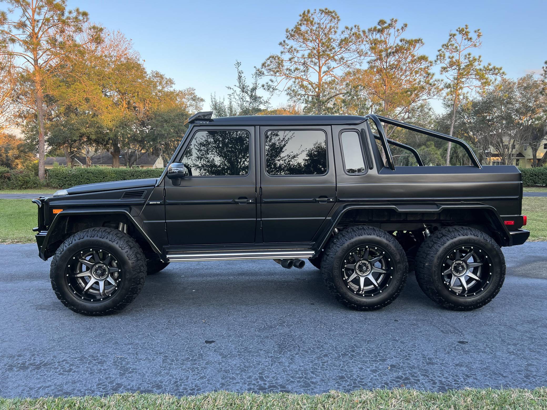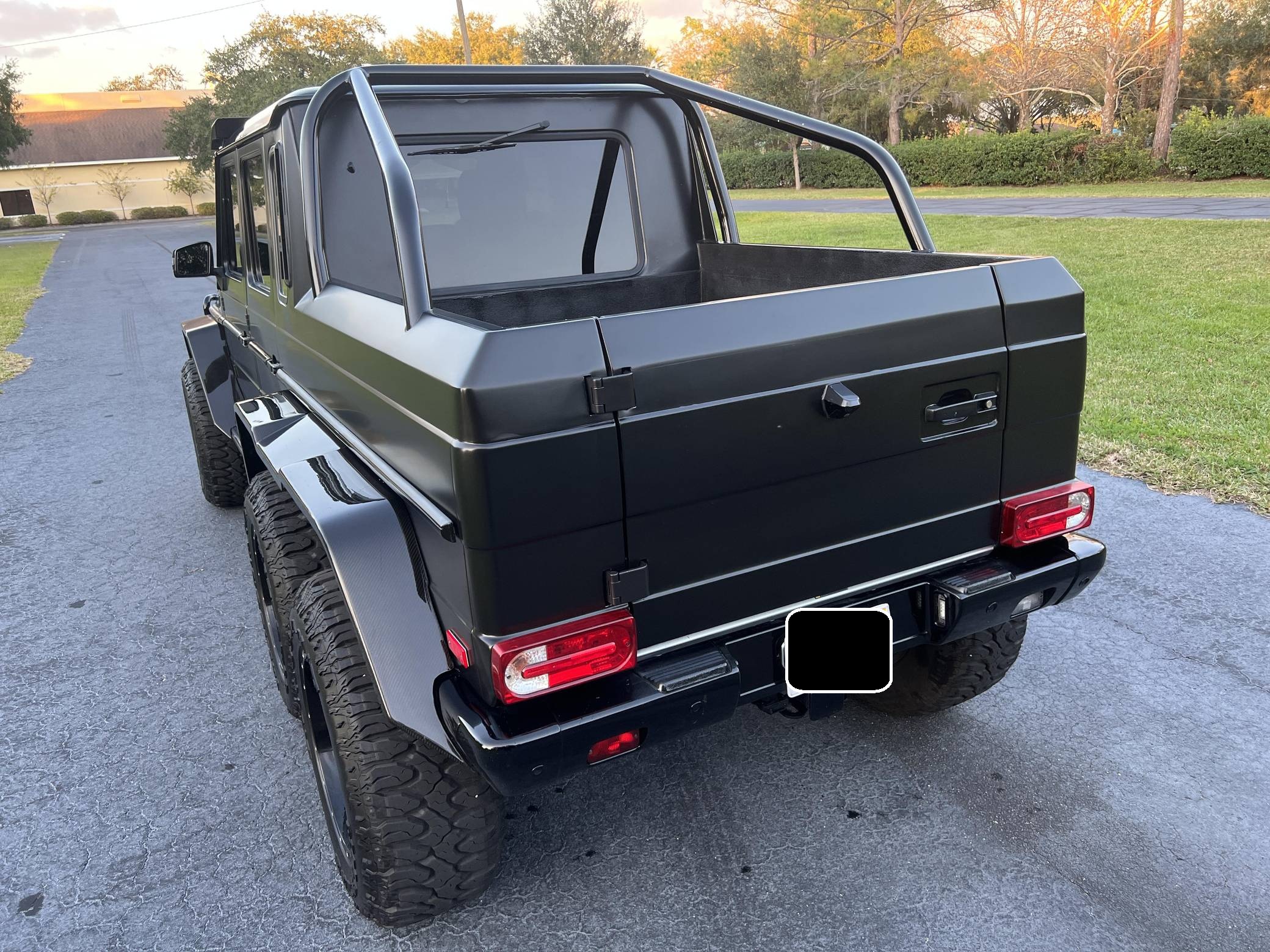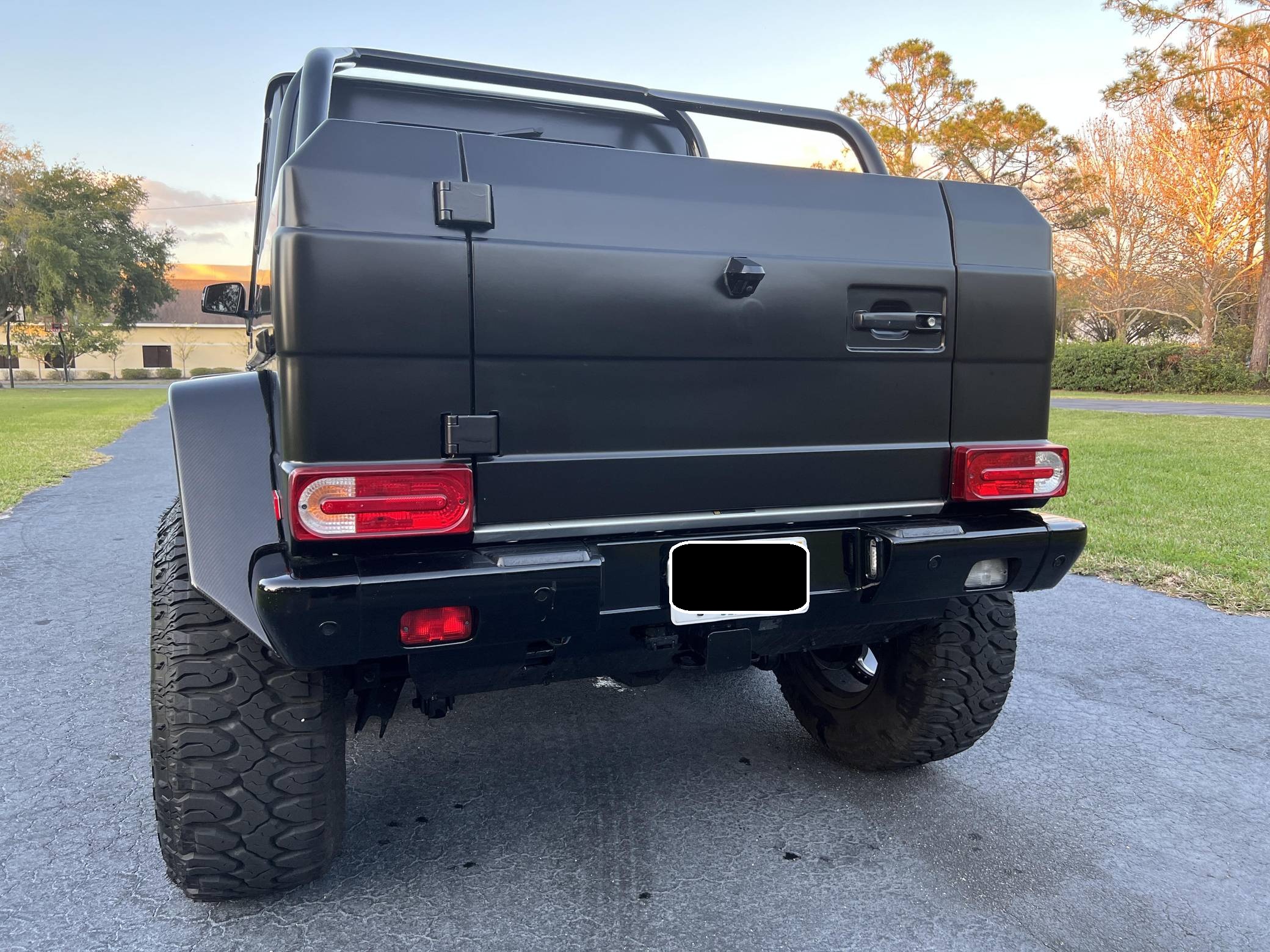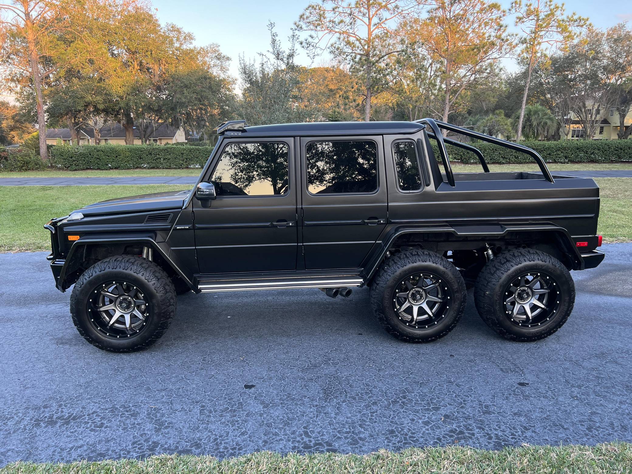 2016 Mercedes-Benz G63 AMG, finished in Iridium Silver Metallic with a black exterior wrap and a blue and black interior. This truck's odometer displays about 26,000 miles. Reportedly performed by Fort Lauderdale-based South Florida Jeeps, the work included adding a 60-inch cargo box, extended quarter panels, an aluminum roll bar, and a second rear axle, among other modifications. The list of aftermarket parts reported by the seller also includes a RENNtech ECU tune, a QuickSilver axle-back exhaust system, 20-inch Fuel Off-Road wheels, FOX components in the suspension system, carbon fiber flares on the wheel arches, and a starlight headliner. Factory equipment includes running boards, a sunroof, heated, ventilated, and power-adjustable front seats, heated rear seats, a Harman Kardon surround sound system, a navigation system, plus front and rear parking sensors. This G63's build sheet is pictured in the gallery. Mercedes-Benz joined forces with Steyr-Daimler-Puch to create the original G-Class (W460). It was released in 1979 and aimed largely at farmers and adventurers; Beverly Hills wasn't on the company's radar yet. The G's upmarket ascent started when the extensively updated W463 arrived in 1990. It looked a lot like the original G but it gained a longer list of features that made it more comfortable on the pavement and a permanent four-wheel-drive system. Civilian production ended in 2018. Power comes from a 5. 5-liter twin-turbocharged V8, rated at 563 horsepower and 561 lb-ft of torque when left stock. The seller states that the tune increases horsepower to about 700 but a dyno sheet is not available. Called "M157" internally, the engine spins the six wheels via a 7-speed automatic transmission linked to a pair of shift paddles, three locking differentials, and a 2-speed transfer case.