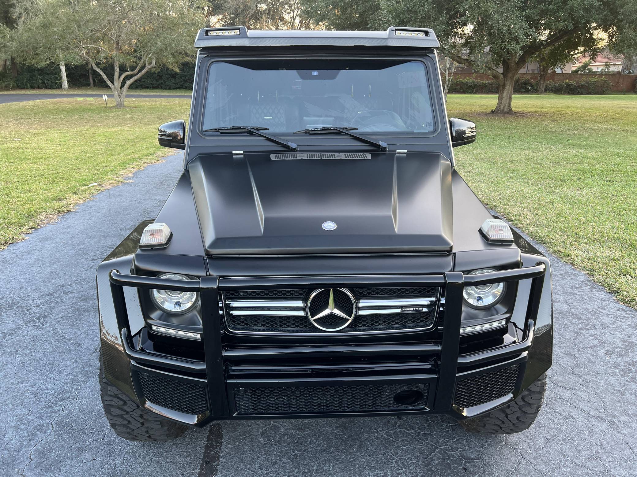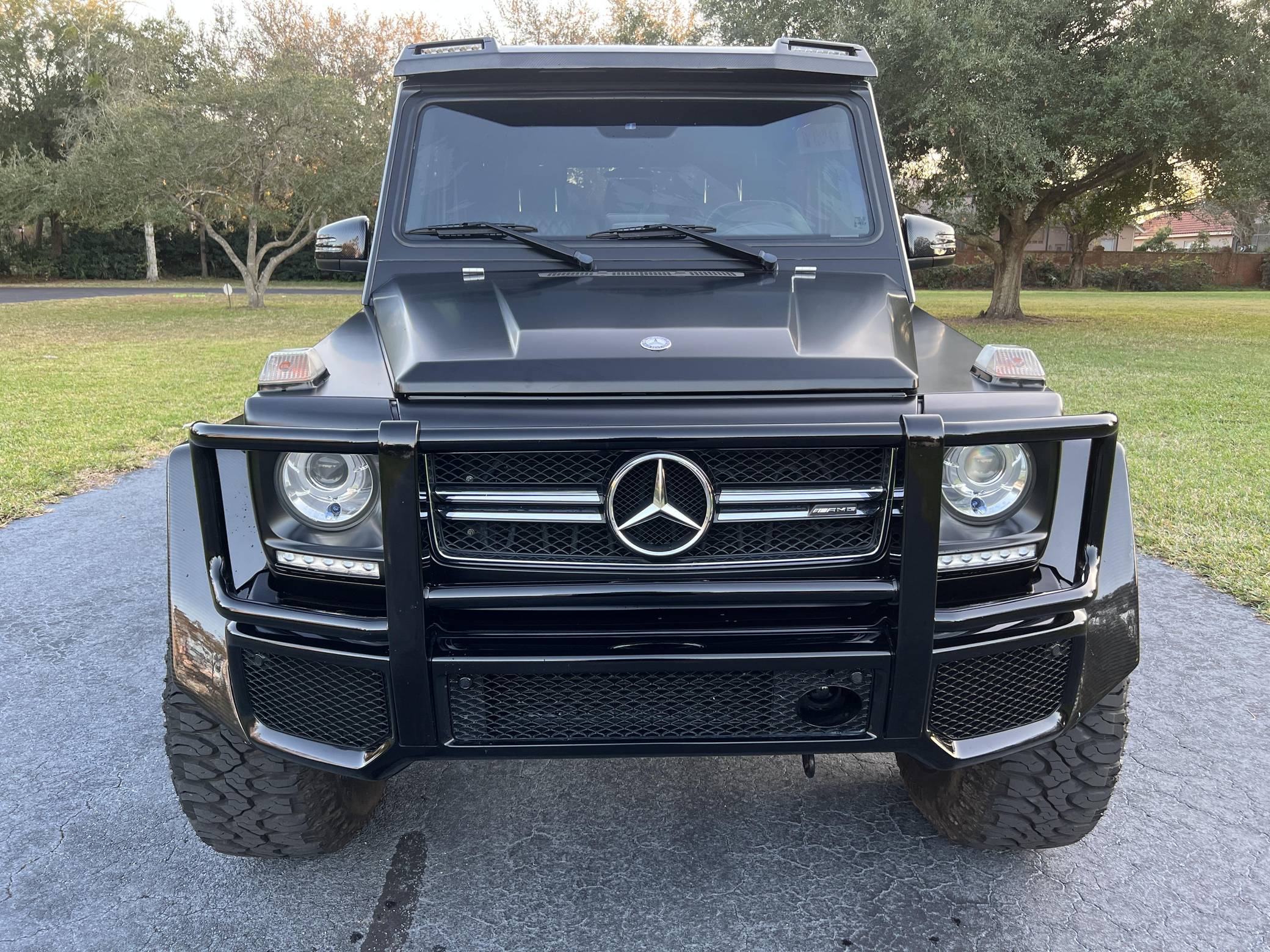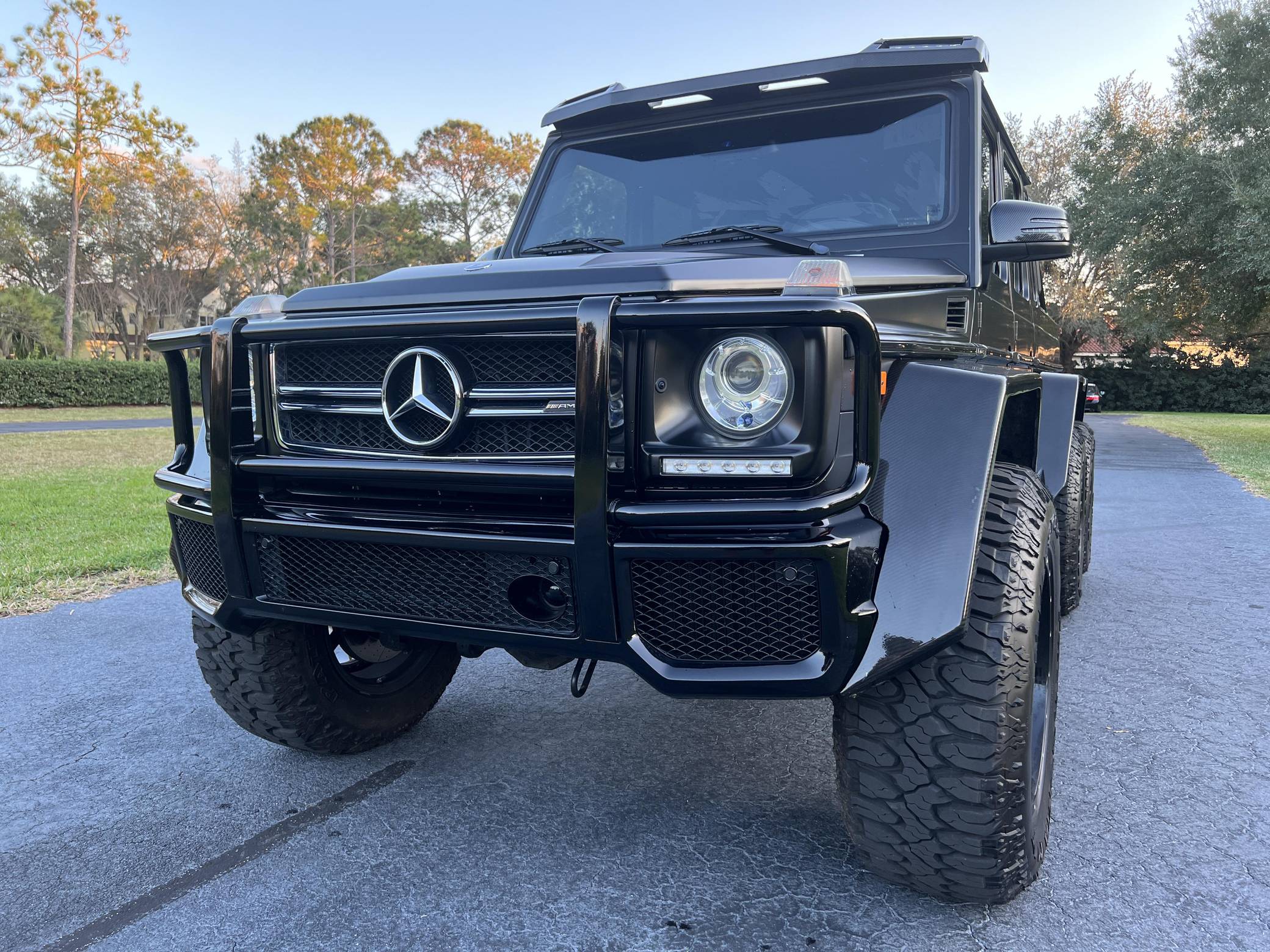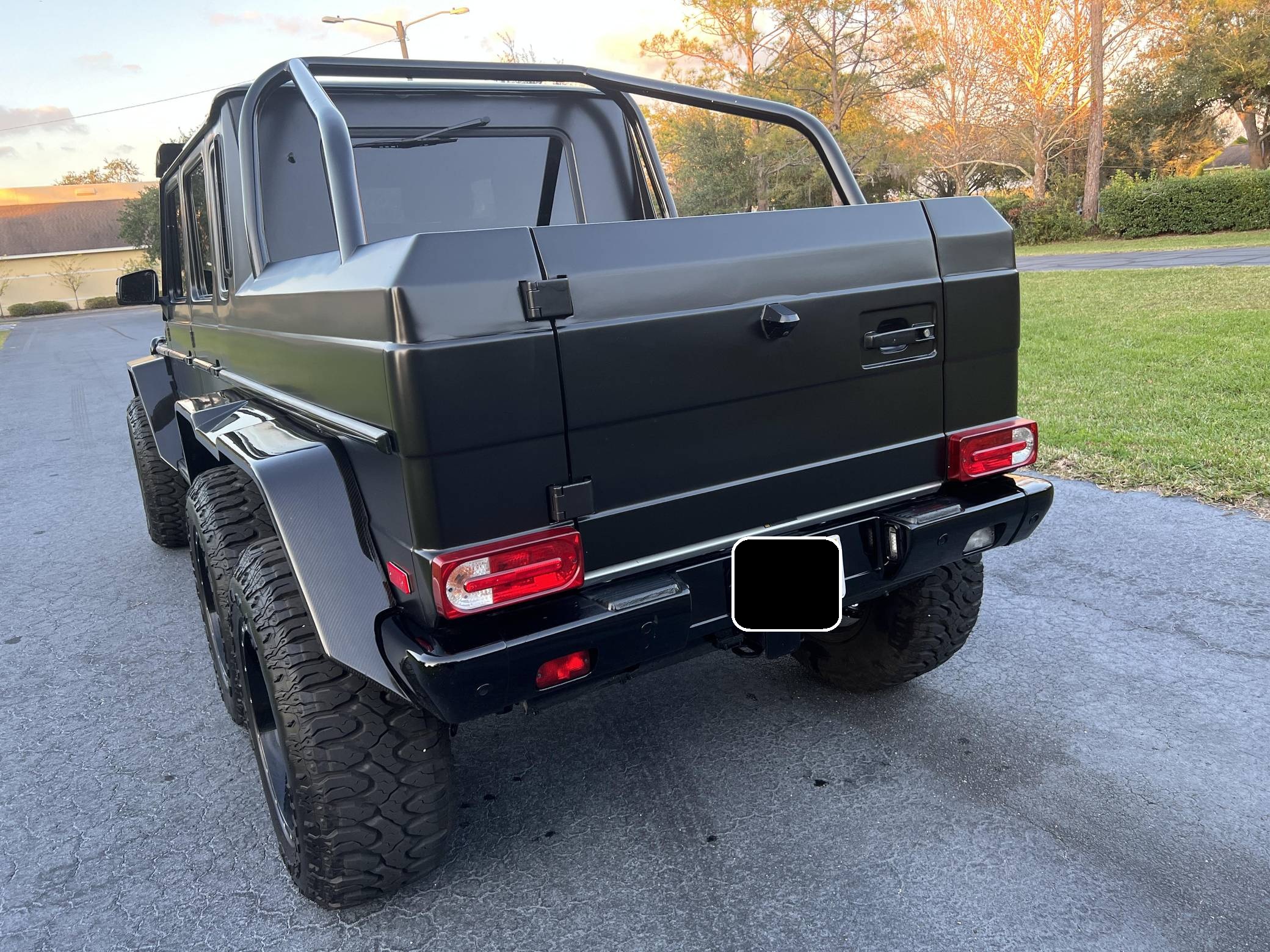 2016 Mercedes-Benz G63 AMG, finished in Iridium Silver Metallic with a black exterior wrap and a blue and black interior. This truck's odometer displays about 26,000 miles. Reportedly performed by Fort Lauderdale-based South Florida Jeeps, the work included adding a 60-inch cargo box, extended quarter panels, an aluminum roll bar, and a second rear axle, among other modifications. The list of aftermarket parts reported by the seller also includes a RENNtech ECU tune, a QuickSilver axle-back exhaust system, 20-inch Fuel Off-Road wheels, FOX components in the suspension system, carbon fiber flares on the wheel arches, and a starlight headliner. Factory equipment includes running boards, a sunroof, heated, ventilated, and power-adjustable front seats, heated rear seats, a Harman Kardon surround sound system, a navigation system, plus front and rear parking sensors. This G63's build sheet is pictured in the gallery. Mercedes-Benz joined forces with Steyr-Daimler-Puch to create the original G-Class (W460). It was released in 1979 and aimed largely at farmers and adventurers; Beverly Hills wasn't on the company's radar yet. The G's upmarket ascent started when the extensively updated W463 arrived in 1990. It looked a lot like the original G but it gained a longer list of features that made it more comfortable on the pavement and a permanent four-wheel-drive system. Civilian production ended in 2018. Power comes from a 5. 5-liter twin-turbocharged V8, rated at 563 horsepower and 561 lb-ft of torque when left stock. The seller states that the tune increases horsepower to about 700 but a dyno sheet is not available. Called "M157" internally, the engine spins the six wheels via a 7-speed automatic transmission linked to a pair of shift paddles, three locking differentials, and a 2-speed transfer case.