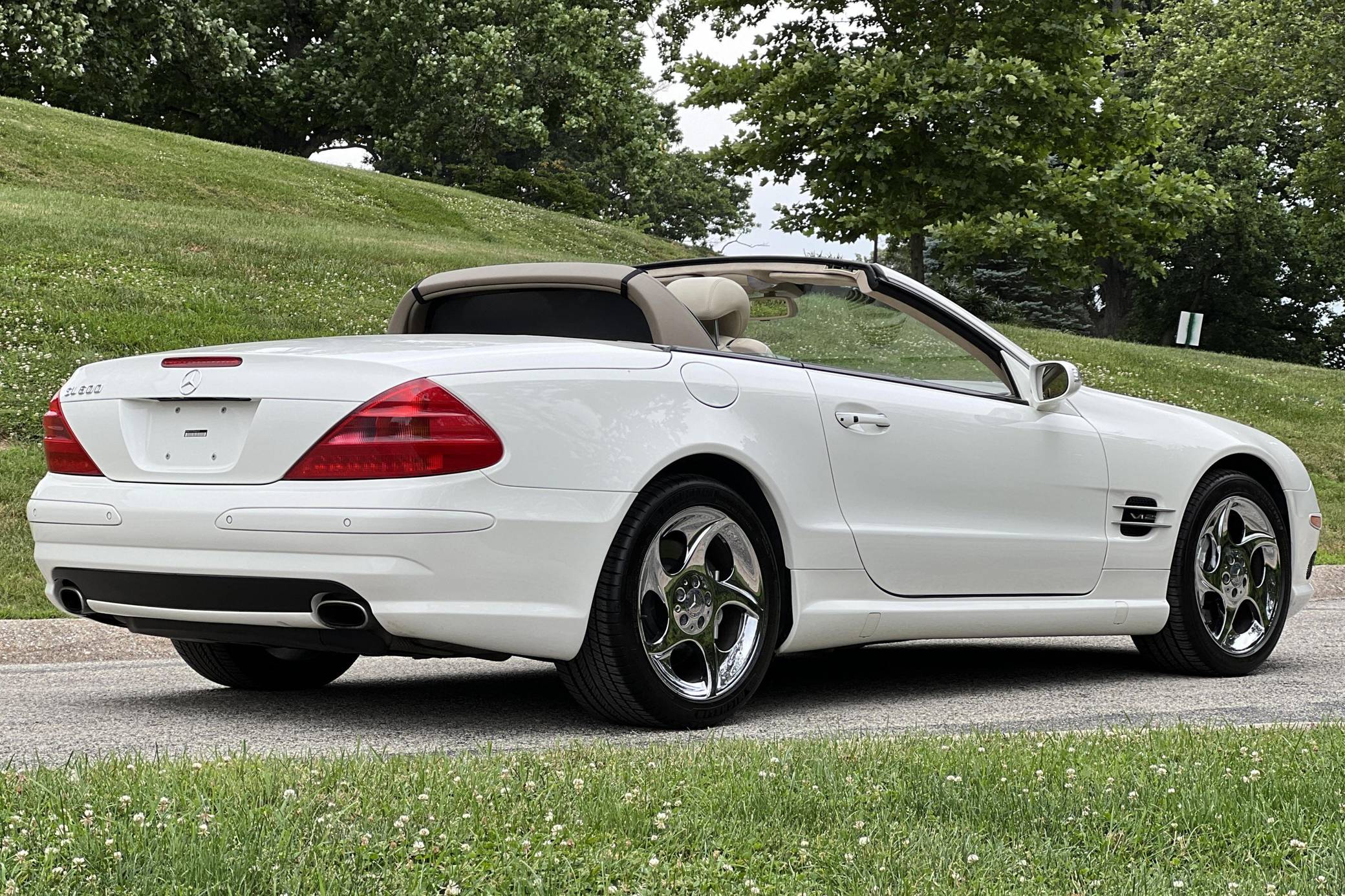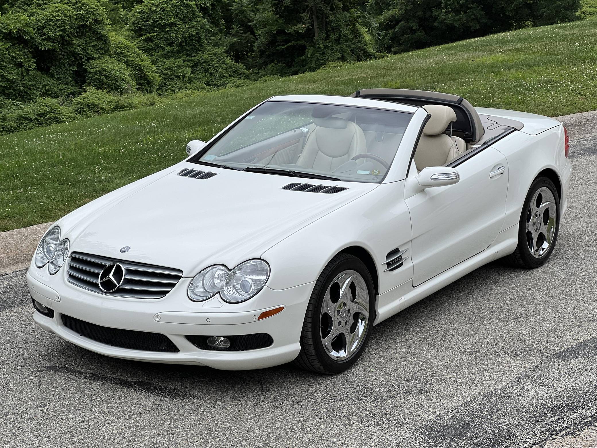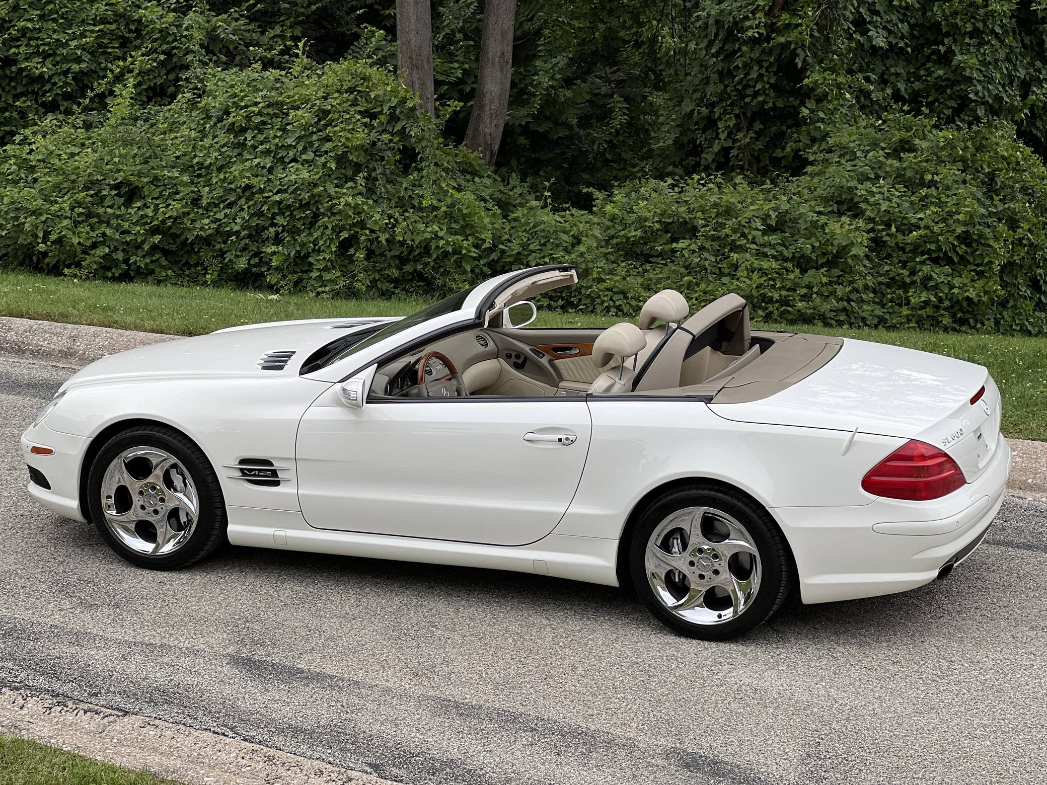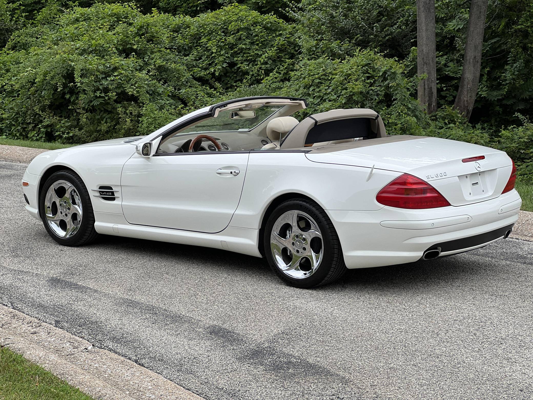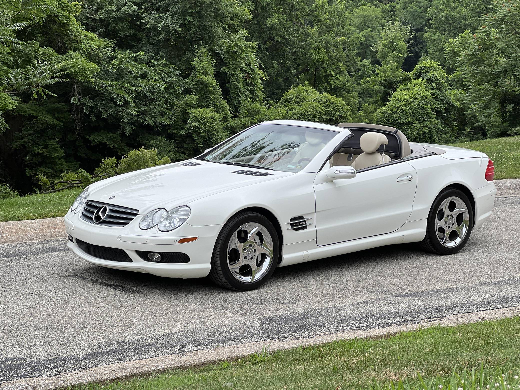 2004 Mercedes-Benz SL600, finished in Alabaster White with a beige interior. The odometer on this SL600 currently displays about 27,700 miles. Factory equipment on this SL600 includes 18-inch alloy wheels, xenon headlights, a power-folding hardtop, wood interior trim, Exclusive leather upholstery, a Bose premium sound system, heated and ventilated multi-contour seats, and Parktronic. The seller reports no modifications. Called R230 internally, the first new SL of the 21st century made its debut for the 2003 model year as a replacement for the venerable R129 model. It was appreciably quicker and far more advanced than its predecessor, it ditched the boxy lines for a sleeker and more rounded design, and it came standard with a power-retractable hardtop. Power comes from a twin-turbocharged 5. 5-liter V12, rated at 493 horsepower and 590 lb-ft of torque. It spins the rear wheels via a 5-speed automatic transmission.