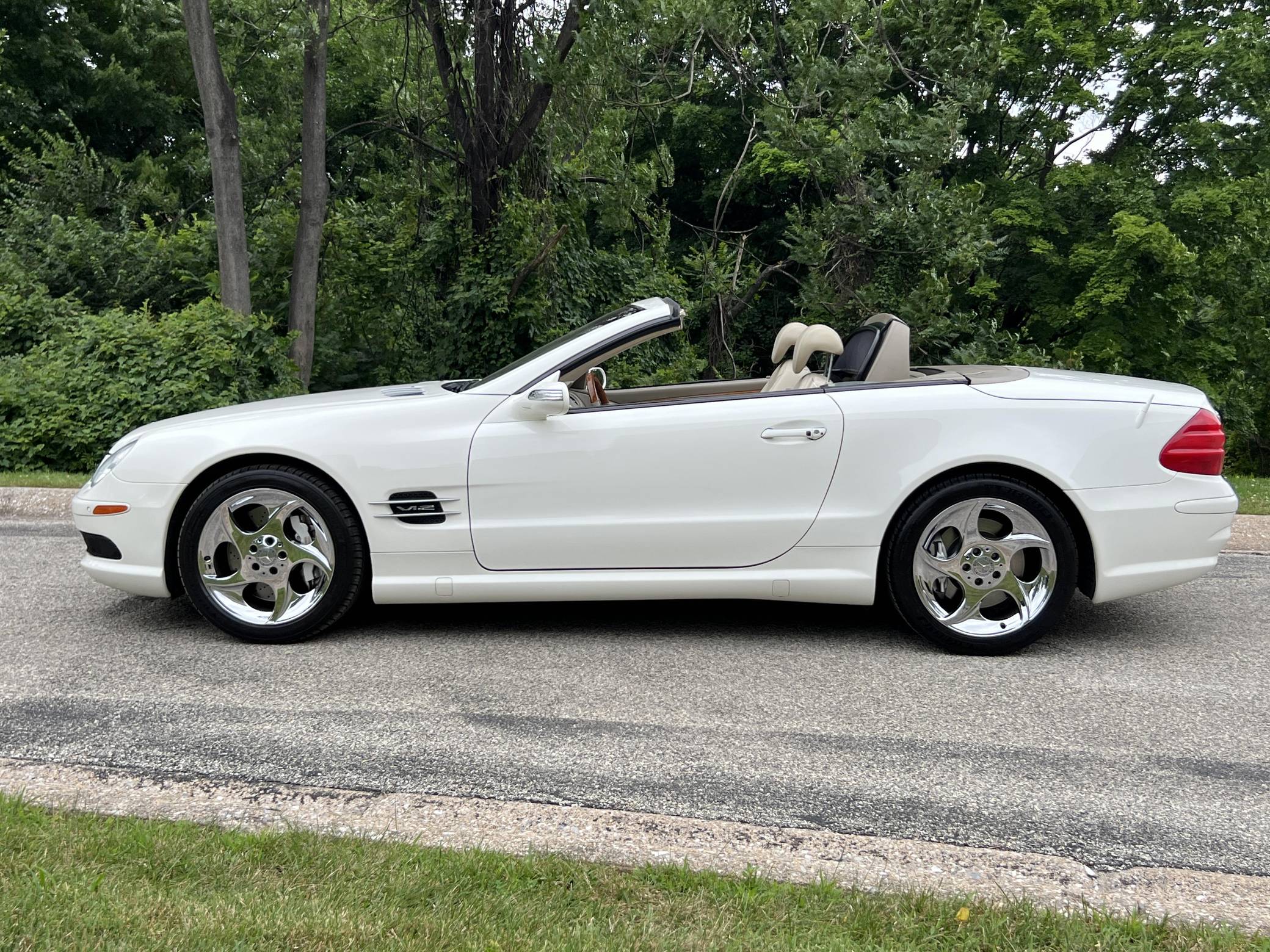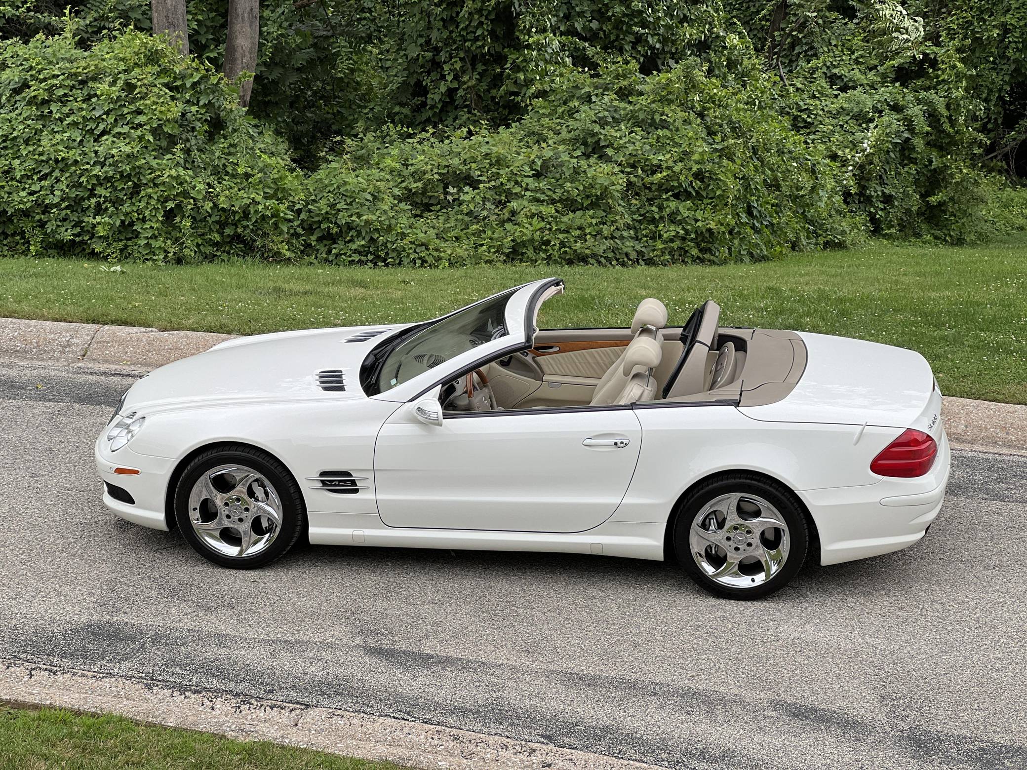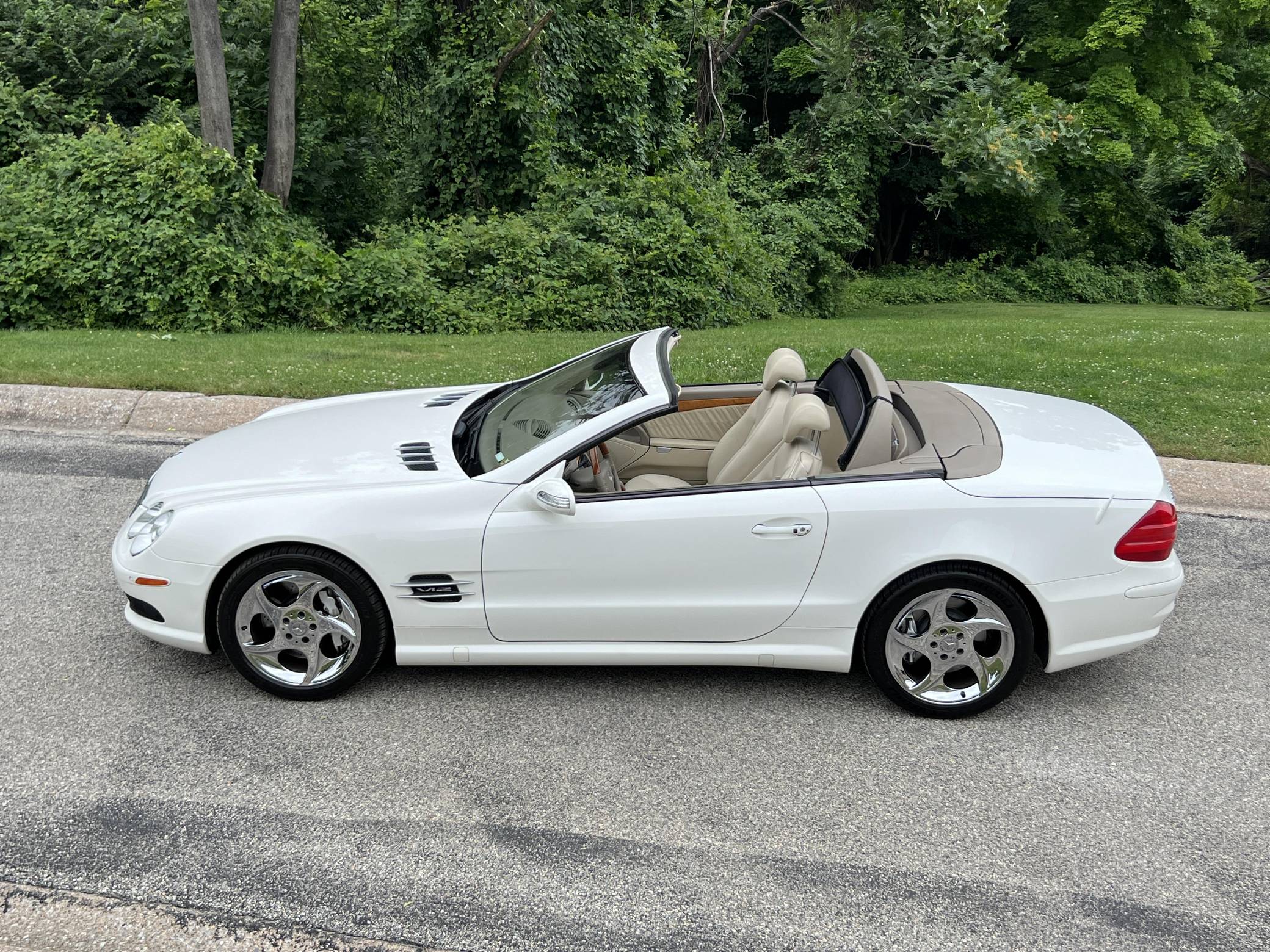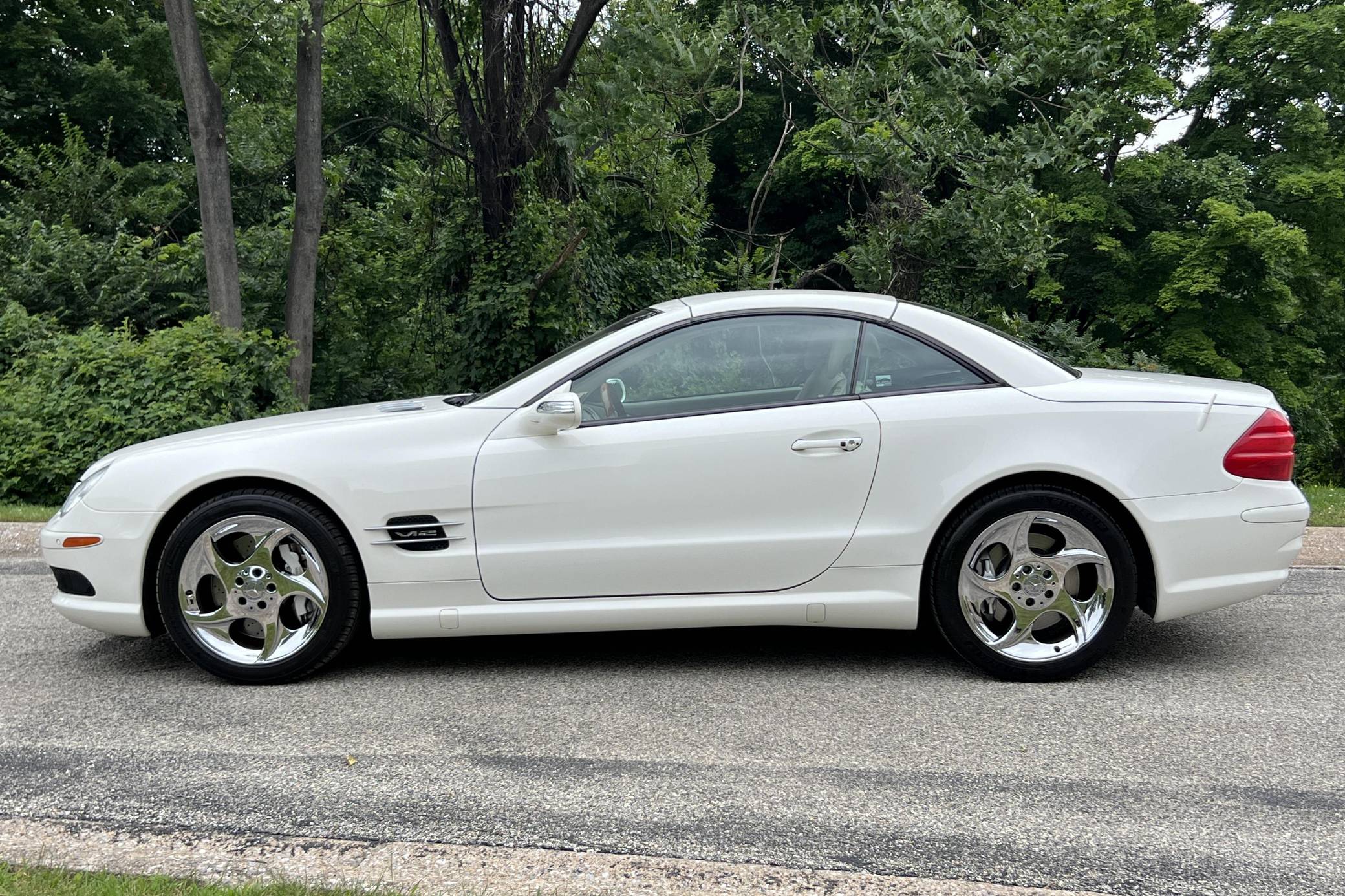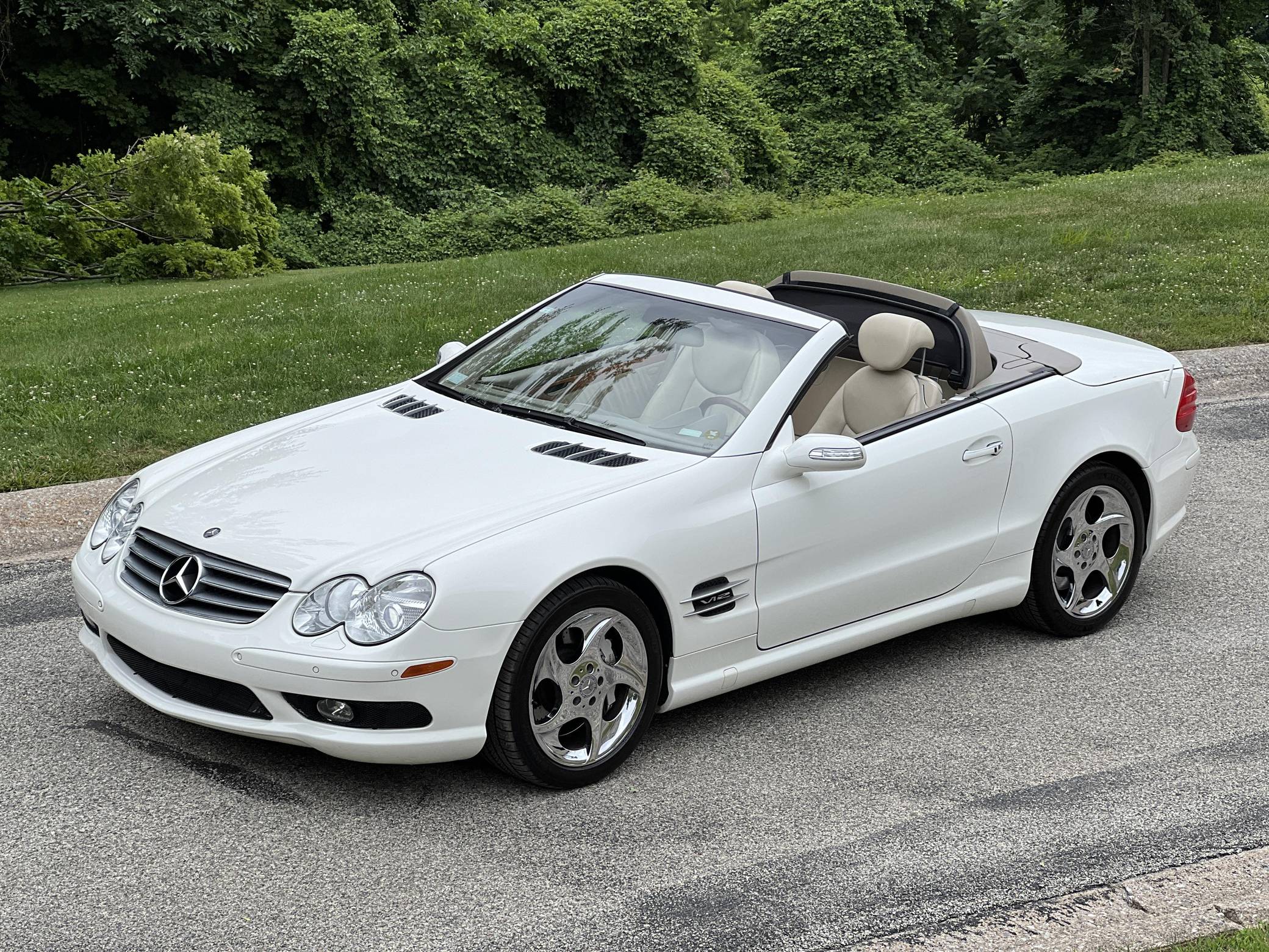2004 Mercedes-Benz SL600, finished in Alabaster White with a beige interior. The odometer on this SL600 currently displays about 27,700 miles. Factory equipment on this SL600 includes 18-inch alloy wheels, xenon headlights, a power-folding hardtop, wood interior trim, Exclusive leather upholstery, a Bose premium sound system, heated and ventilated multi-contour seats, and Parktronic. The seller reports no modifications. Called R230 internally, the first new SL of the 21st century made its debut for the 2003 model year as a replacement for the venerable R129 model. It was appreciably quicker and far more advanced than its predecessor, it ditched the boxy lines for a sleeker and more rounded design, and it came standard with a power-retractable hardtop. Power comes from a twin-turbocharged 5. 5-liter V12, rated at 493 horsepower and 590 lb-ft of torque. It spins the rear wheels via a 5-speed automatic transmission.