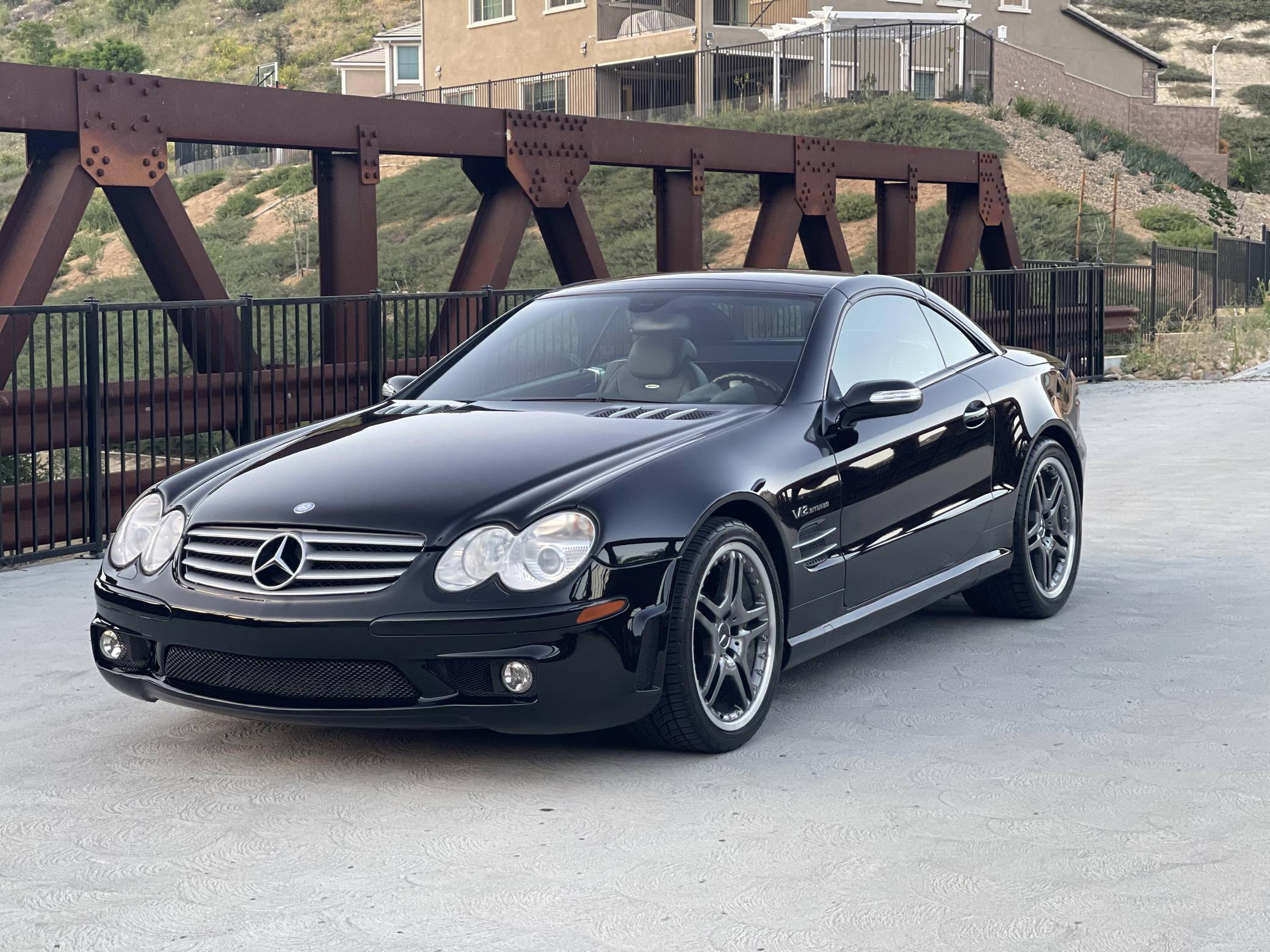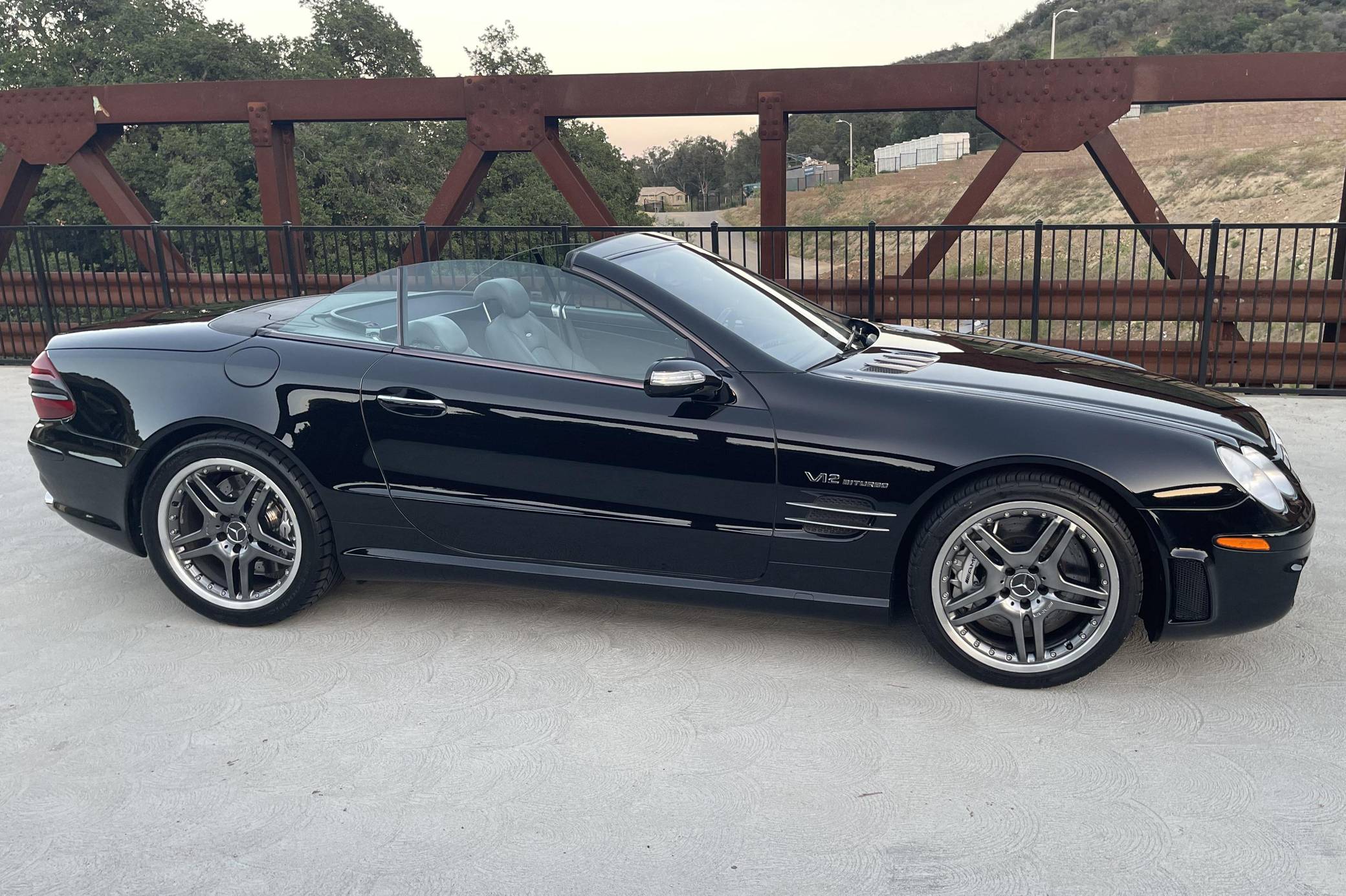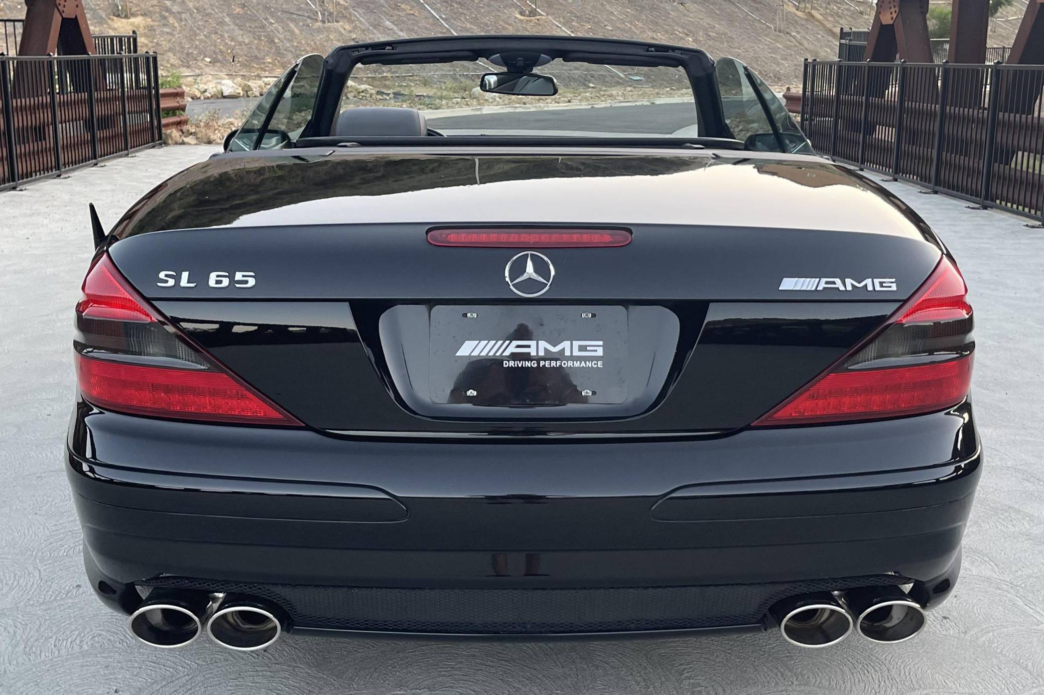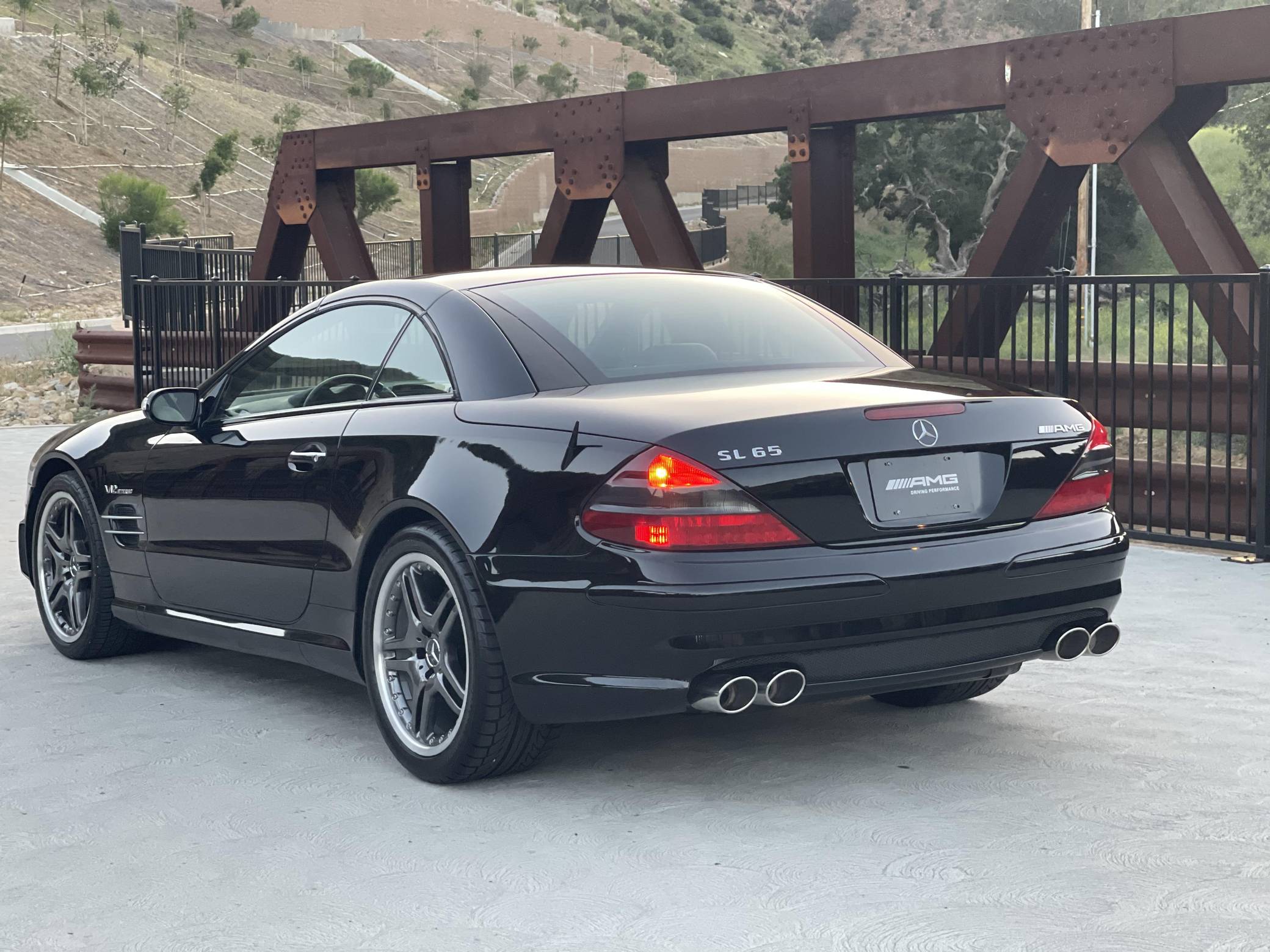 2005 Mercedes-Benz SL65 AMG, finished in black with a black interior. This roadster's odometer displays about 77,700 miles. Factory equipment includes 19-inch wheels, the Active Body Control (ABC) suspension system, bi-xenon headlights, wood interior trim, leather upholstery, heated, ventilated, and power-adjustable multi-contour seats, and a Bose sound system. This SL65's build sheet is pictured in the gallery, and the only modification reported by the seller is a pair of MagnaFlow mufflers. Called R230 internally, the first new SL of the 21st century made its debut for 2003 as a replacement for the venerable R129 model. It was appreciably quicker and far more advanced than its predecessor, it ditched the boxy lines for a sleeker and more rounded design that was aligned with the rest of the Mercedes-Benz range, and it came standard with a power-retractable hardtop. Production ended in 2011. Power comes from a 6. 0-liter twin-turbocharged V12, rated at 604 horsepower and 738 lb-ft of torque. Called "M275" internally, it spins the rear wheels via a 5-speed automatic transmission.