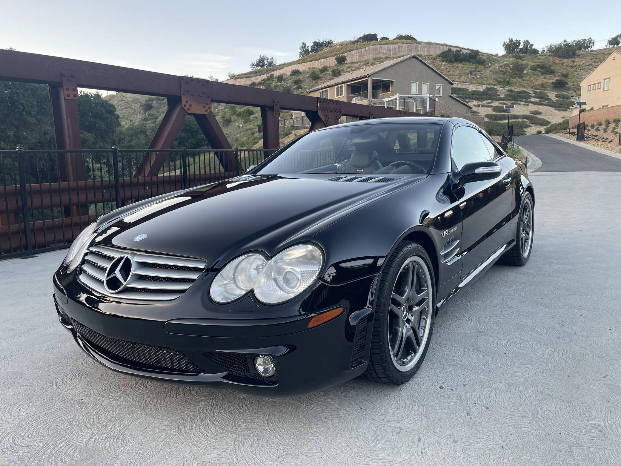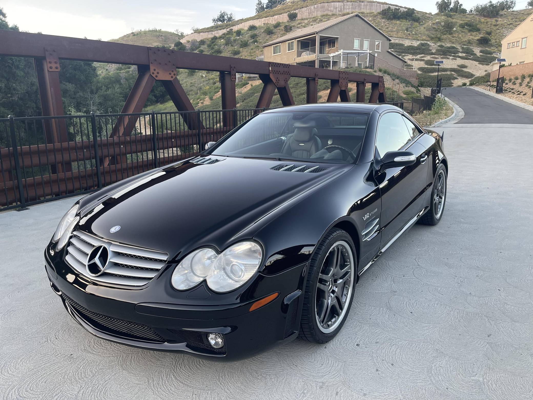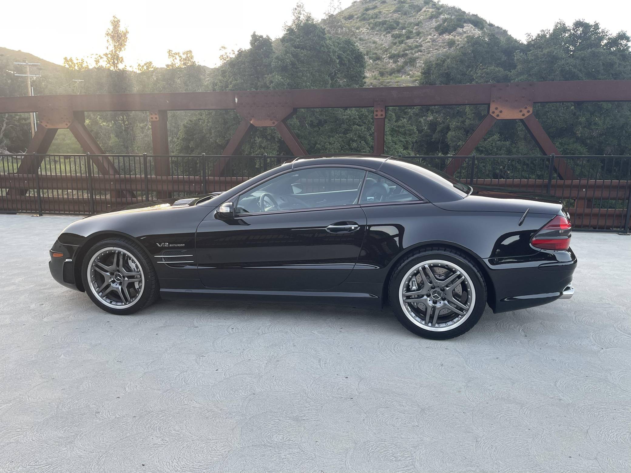 2005 Mercedes-Benz SL65 AMG, finished in black with a black interior. This roadster's odometer displays about 77,700 miles. Factory equipment includes 19-inch wheels, the Active Body Control (ABC) suspension system, bi-xenon headlights, wood interior trim, leather upholstery, heated, ventilated, and power-adjustable multi-contour seats, and a Bose sound system. This SL65's build sheet is pictured in the gallery, and the only modification reported by the seller is a pair of MagnaFlow mufflers. Called R230 internally, the first new SL of the 21st century made its debut for 2003 as a replacement for the venerable R129 model. It was appreciably quicker and far more advanced than its predecessor, it ditched the boxy lines for a sleeker and more rounded design that was aligned with the rest of the Mercedes-Benz range, and it came standard with a power-retractable hardtop. Production ended in 2011. Power comes from a 6. 0-liter twin-turbocharged V12, rated at 604 horsepower and 738 lb-ft of torque. Called "M275" internally, it spins the rear wheels via a 5-speed automatic transmission.