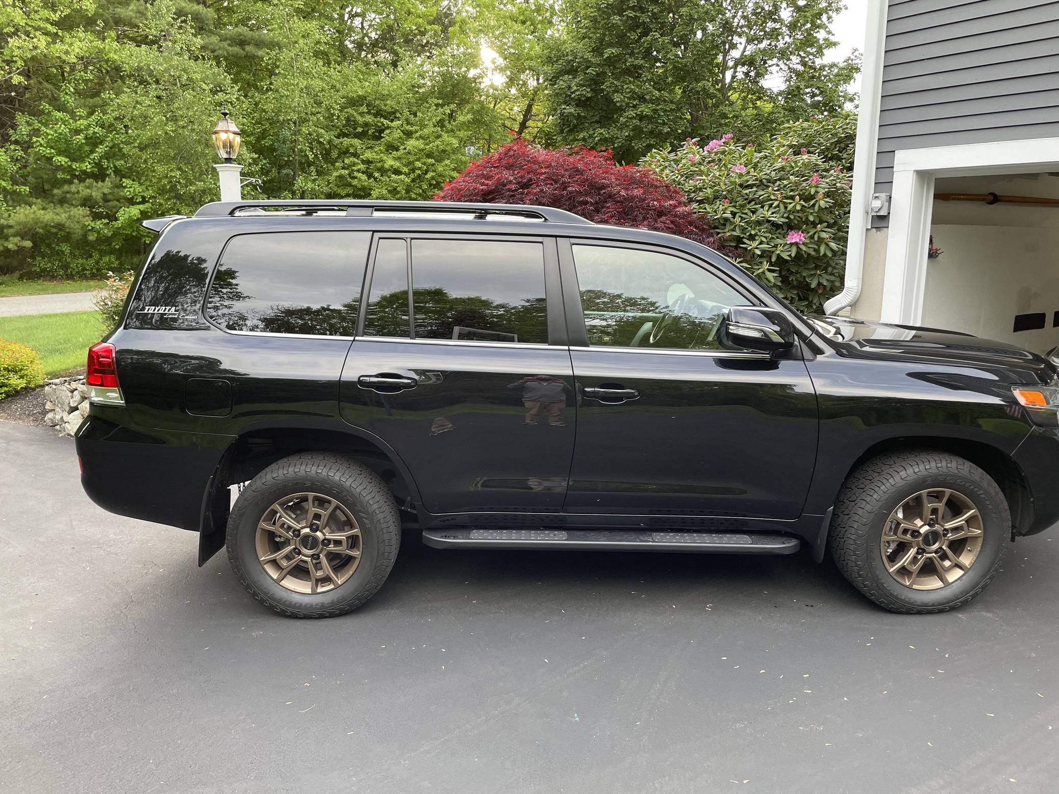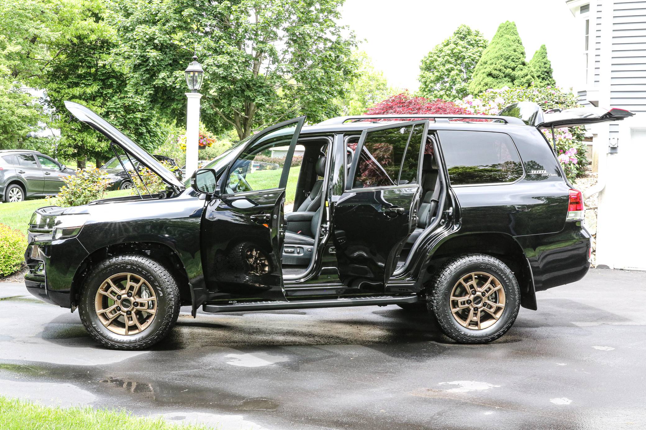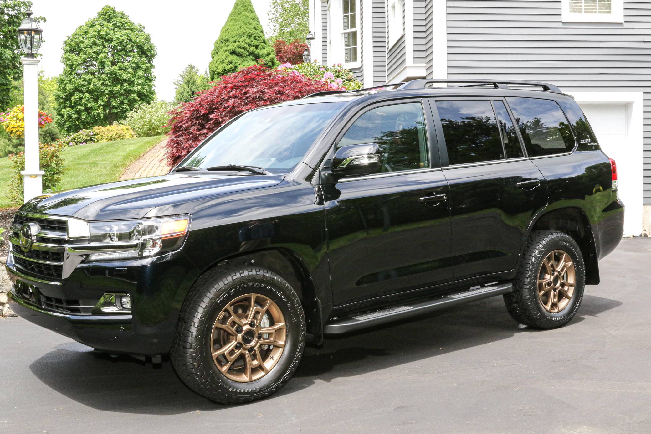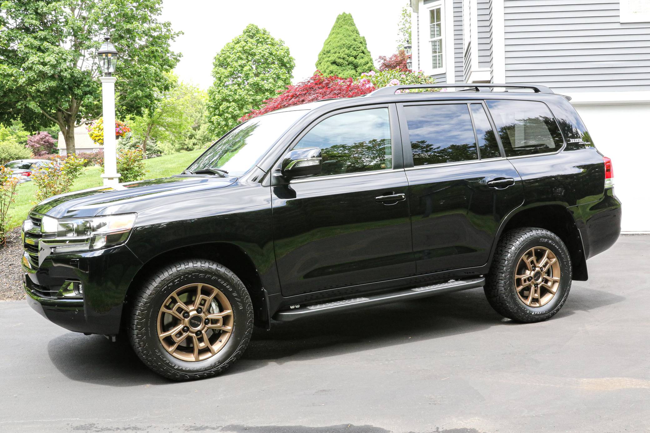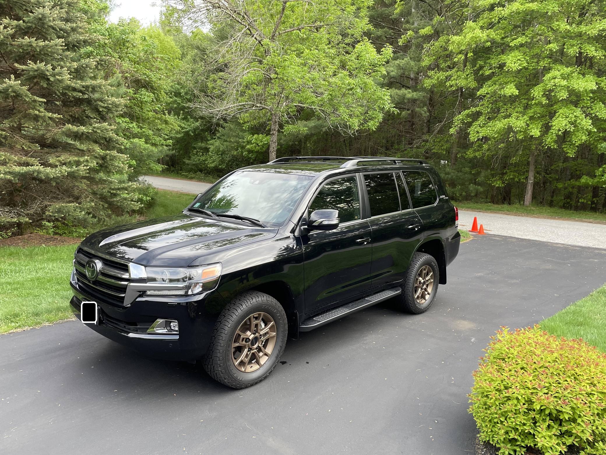 THIS. . . is a 2021 Toyota Land Cruiser, finished in Midnight Black Metallic with a black interior. Factory equipment includes 18-inch BBS wheels, "Toyota Land Cruiser" Heritage badging, Multi-Terrain Select, a Torsen locking limited-slip center differential, Kinetic Dynamic suspension system, a power sunroof, perforated leather upholstery, a 14-speaker JBL audio system, heated and ventilated front seats, and a heated steering wheel. Modifications reported by the seller include a set of BFGoodrich Trail-Terrain T/A tires, Slee rock sliders, and XPEL paint protection film on the front bumper and side mirrors. Introduced for the 2008 model year, the 200-Series Land Cruiser is notable for maintaining its reputation for off-road prowess while further increasing the luxury aspects of the truck. In 2016 the 200-Series was refreshed with an updated interior and exterior, new 18-inch alloy wheels, larger front disc brakes, a new 8-speed electronically-controlled automatic transmission, among other modern convenience updates. Power comes from a "3UR-FE" 5. 7-liter V8, rated at 381 horsepower and 401 lb-ft of torque. Output is sent to all four wheels via an 8-speed automatic transmission and full-time all-wheel drive system.