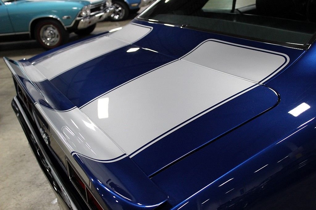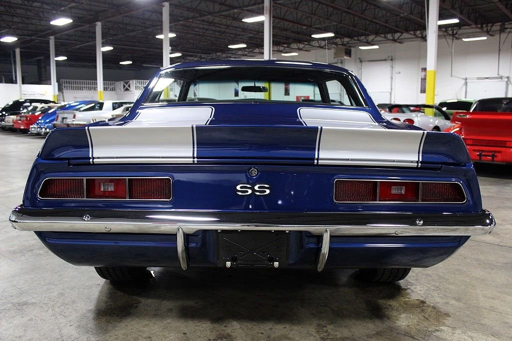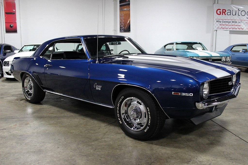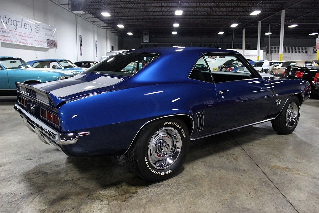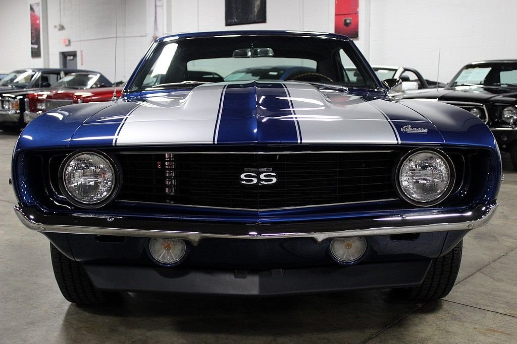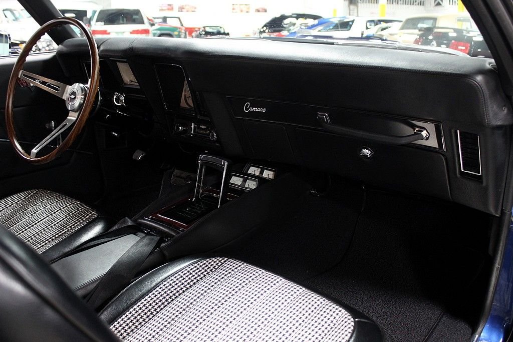 This muscle car is the recent recipient of a high quality and meticulous rotisserie restoration performed by PSI Motorsports in Sterling Heights, MI. It is a real X55 SS 350 300hp car and even though it is non-numbers matching nor in its original color, it is stunningly restored with a correct 350ci V8 and looks killer in its Code-51 Dusk Blue exterior and Code-713 Black Houndstooth interior with bucket seats. Decoding the VIN reveals: • 1 = Chevrolet • 2 = Camaro • 4 = V8 Engine • 37 = 2 Door Coupe • 9 = 1969 • N = Norwood, Ohio Assembly • 631255 = 31,255th in production sequence Decoding the Cowl Tag reveals: • Model Year; 69 = 1969 • Body Type; 12437 = Camaro Coupe • Assembly Plant; NOR = Norwood, Ohio • Trim; 712 = Black Vinyl Custom Buckets • Paint: 72B = Hugger Orange with Black Vinyl Top It has 1,327 miles on the clock since its immaculate concourse-level rotisserie restoration. The 350ci V8 has more chrome than a semi-truck and features aluminum Edelbrock finned valve covers, Edelbrock air cleaner, Edelbrock carburetor, Hooker headers, a Be Cool aluminum radiator, MSD ignition, March billet pulleys, and a mild cam. This engine sounds spectacular and just what a '69 Camaro SS should sound like delivering North of 400hp. The interior is in perfect condition and features Houndstooth bucket seats, a custom leather dashboard, custom leather door panels with billet door handles and window cranks, a custom leather wrapped speaker box on the rear package tray, a teakwood SS steering wheel, white face AC gauges, and Rally Sport gauges. It features power steering, power brakes with 4-wheel discs, and heat. Being a true X55 SS 350 car in this pristine of condition offers up a superb investment opportunity.