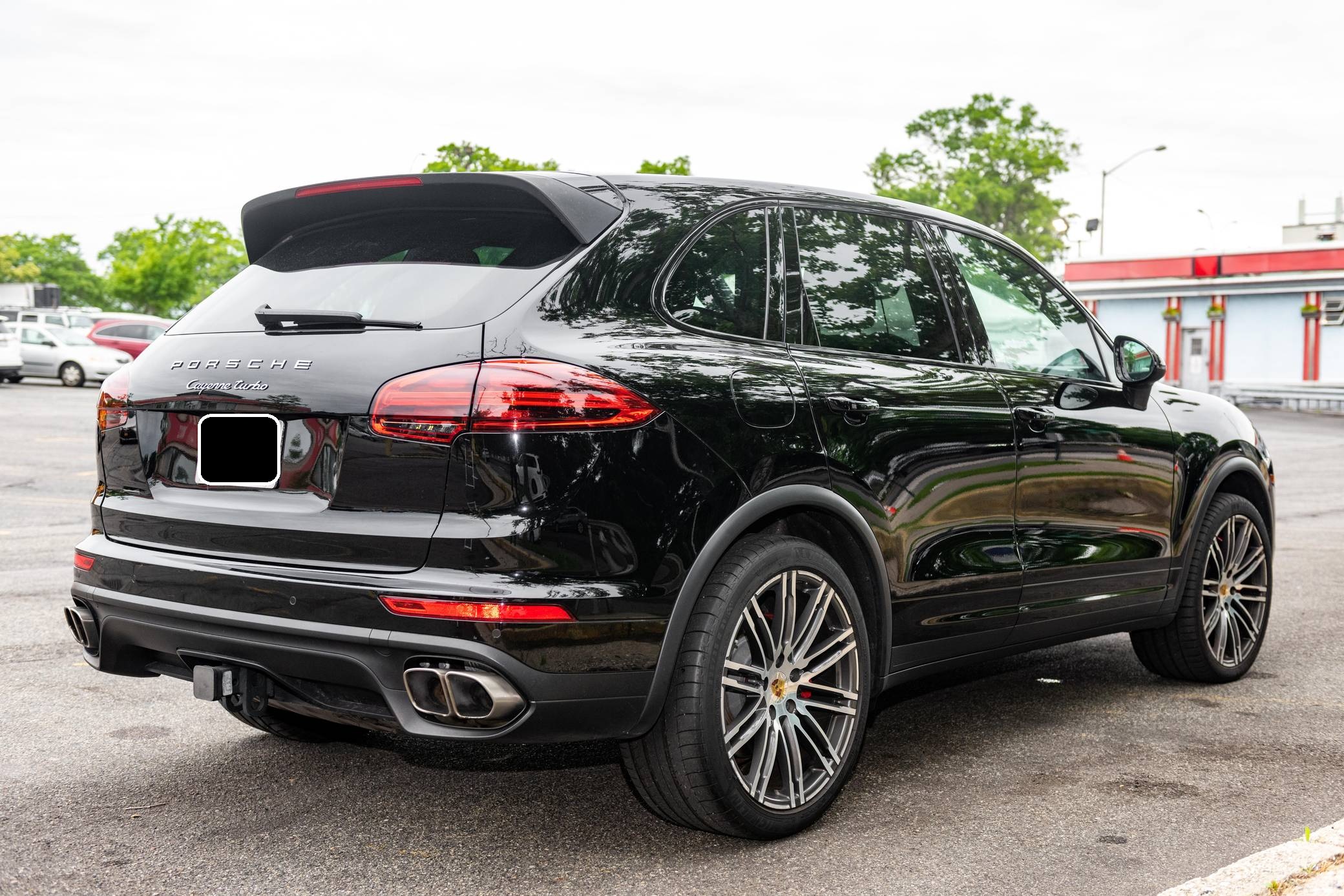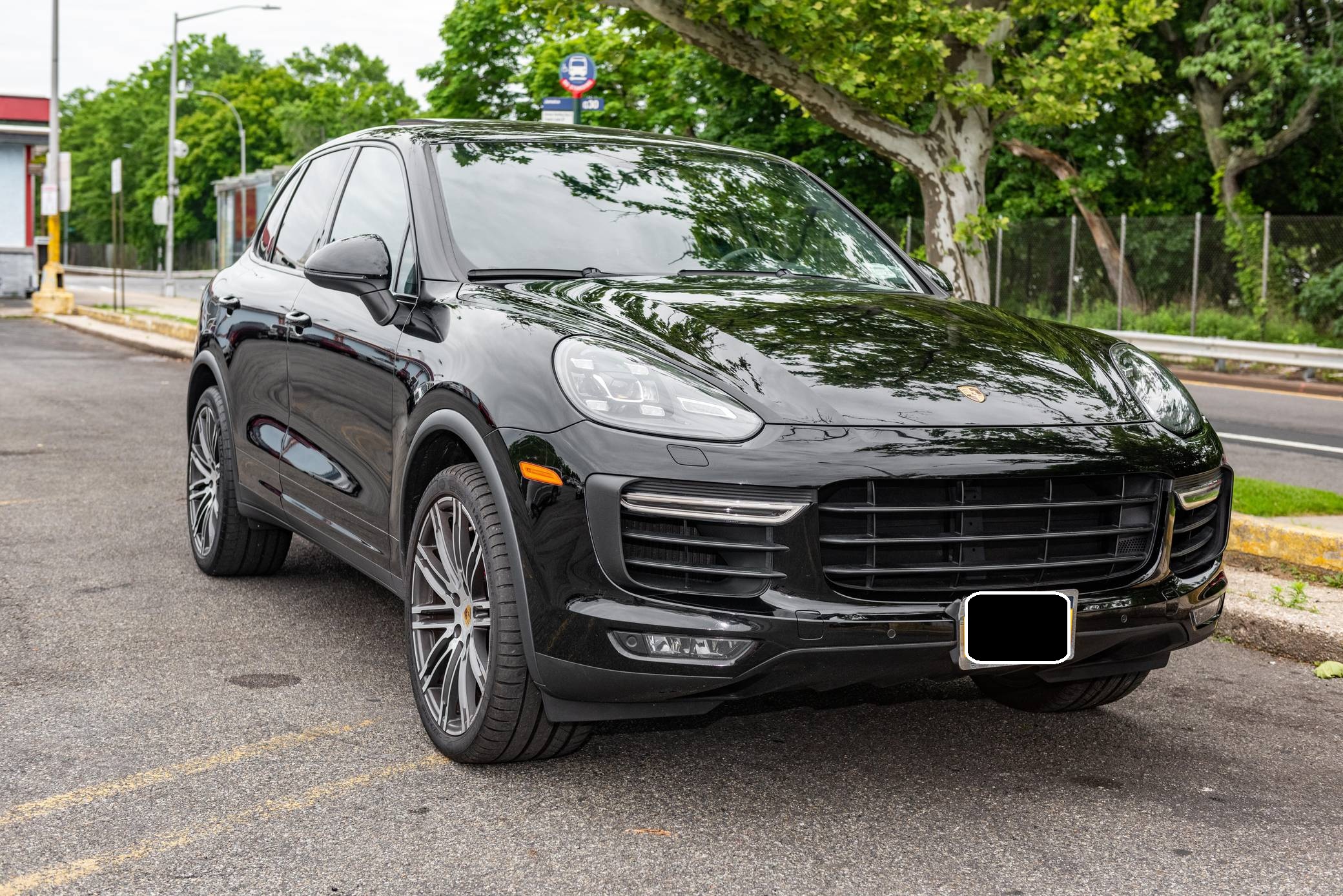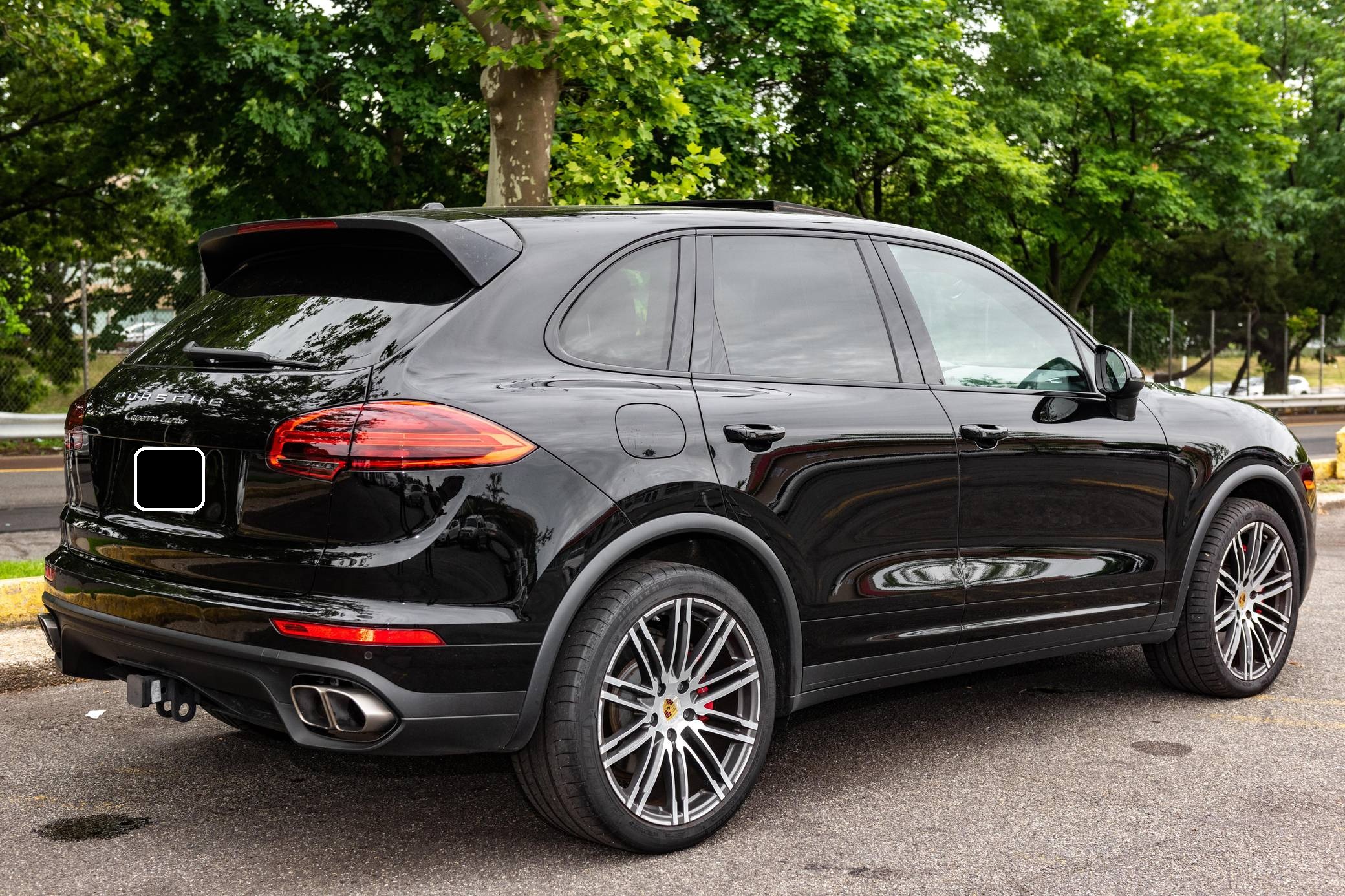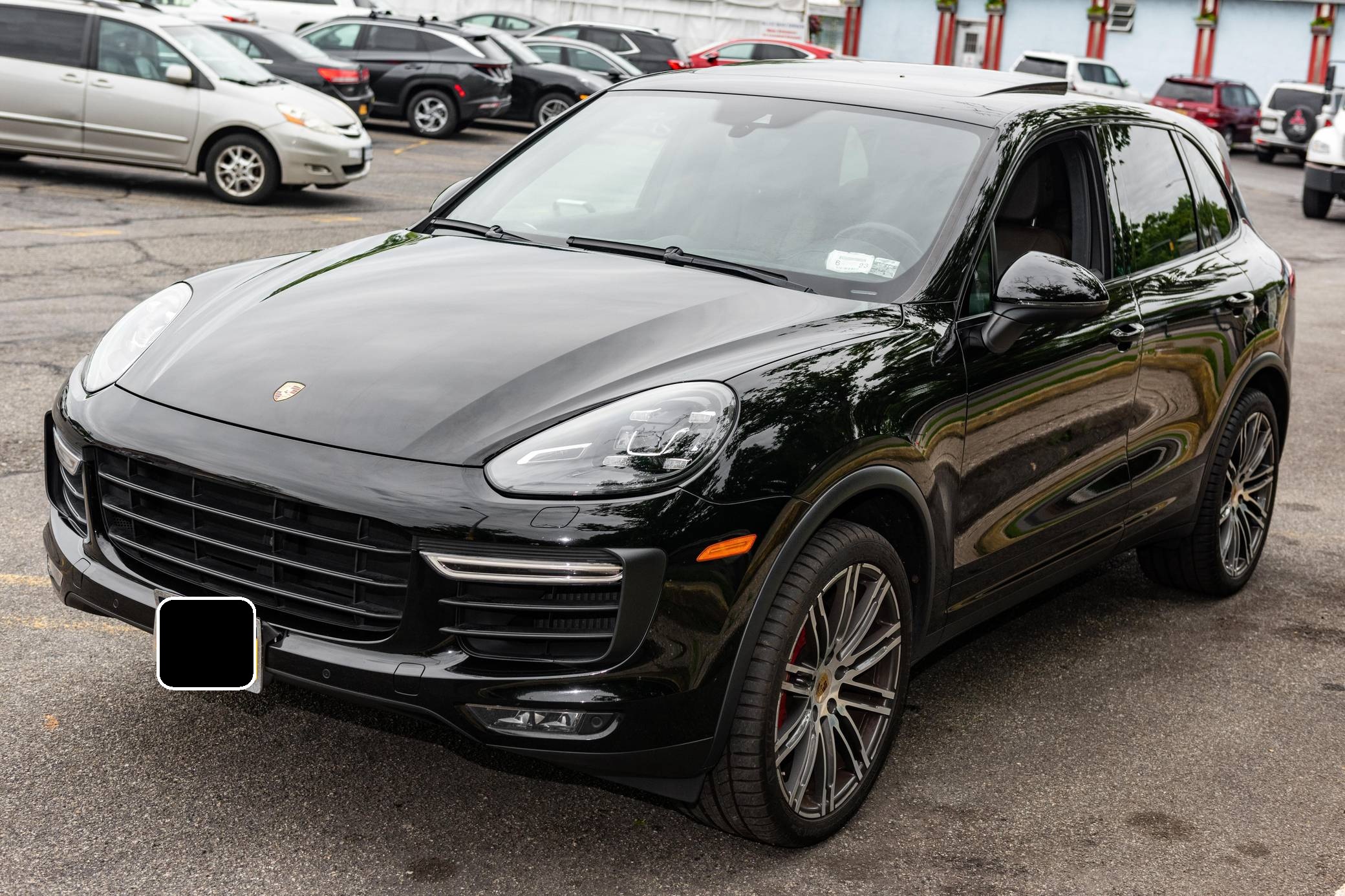 2016 Porsche Cayenne Turbo, finished in black with a Saddle Brown interior. The odometer on this Cayenne Turbo currently displays approximately 36,600 miles. According to the build sheet provided in the gallery, factory equipment includes the Premium Package Plus, 21-inch 911 Turbo Design wheels, an air suspension system with Porsche Active Suspension Management (PASM), front and rear heated seats, a Burmester surround sound system, and a navigation system. The seller reports no modifications. Released for the 2011 model year, the second-generation Cayenne (called "958" internally) was slightly bigger and significantly lighter than its predecessor. It offered a smoother ride thanks to additional technology and luxury features, it was just as capable off-road, and critics agreed it was noticeably sportier than the first-generation model. Production ended in 2017. Power comes from a 4. 8-liter twin-turbocharged V8, rated at 520 horsepower and 553 lb-ft of torque. Output is sent to all four wheels via an 8-speed automatic transmission.