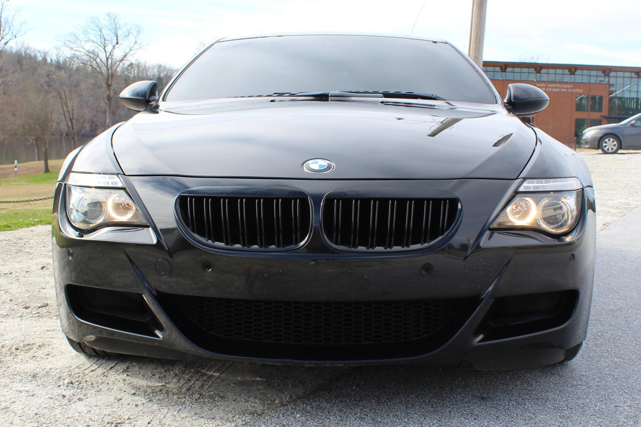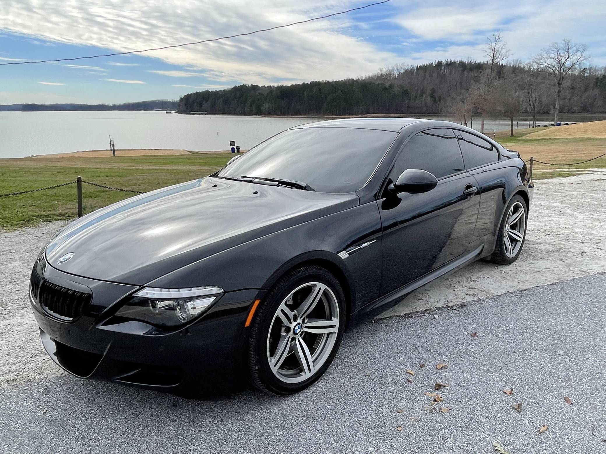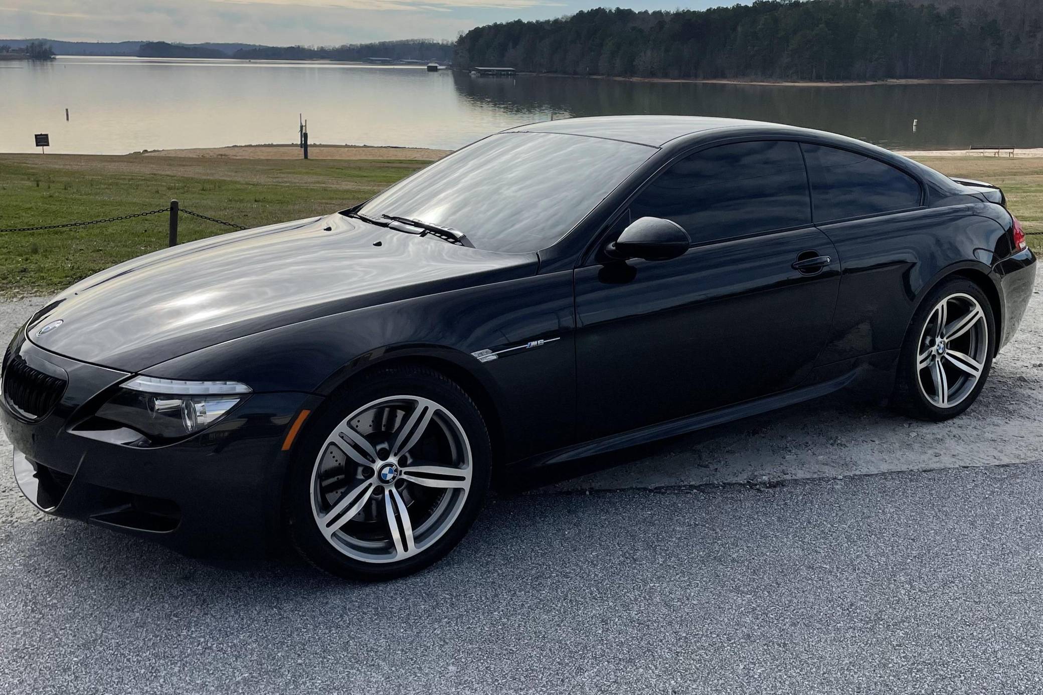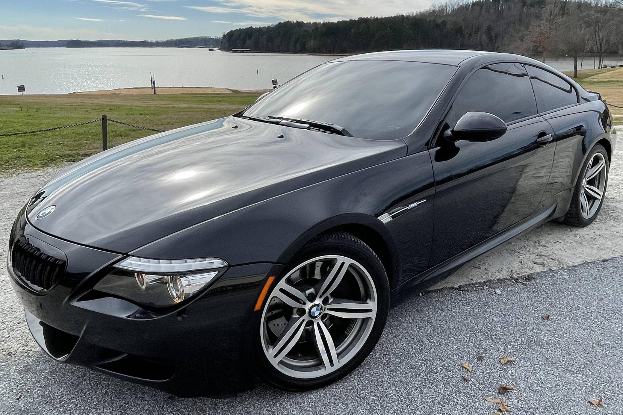 2010 BMW M6, finished in Black Sapphire Metallic with a black interior. Factory equipment includes 19-inch Style 167M wheels, adaptive xenon headlights, a carbon fiber roof panel, soft-close doors, Merino leather upholstery, heated and power-adjustable front seats, and a head-up display, among other features. Modifications reported by the seller are limited to black kidney grilles and a window tint. BMW resurrected the dormant M6 nameplate on the high-performance variant of the second-generation 6 Series released for the 2006 model year. Called "E63" (coupe) and "E64" (convertible) internally, the model features a high-revving V10 engine and sport-tuned suspension built with parts shared with the "E60" M5. It wears a reasonably subtle design that allows it to fly under the radar, and its generous dimensions give it the ability to seat four passengers in relative comfort. Power comes from an "S85" 5. 0-liter V10, rated at 500 horsepower and 383 lb-ft of torque. It spins the rear wheels via a 7-speed Sequential Manual Gearbox (SMG III) transmission.