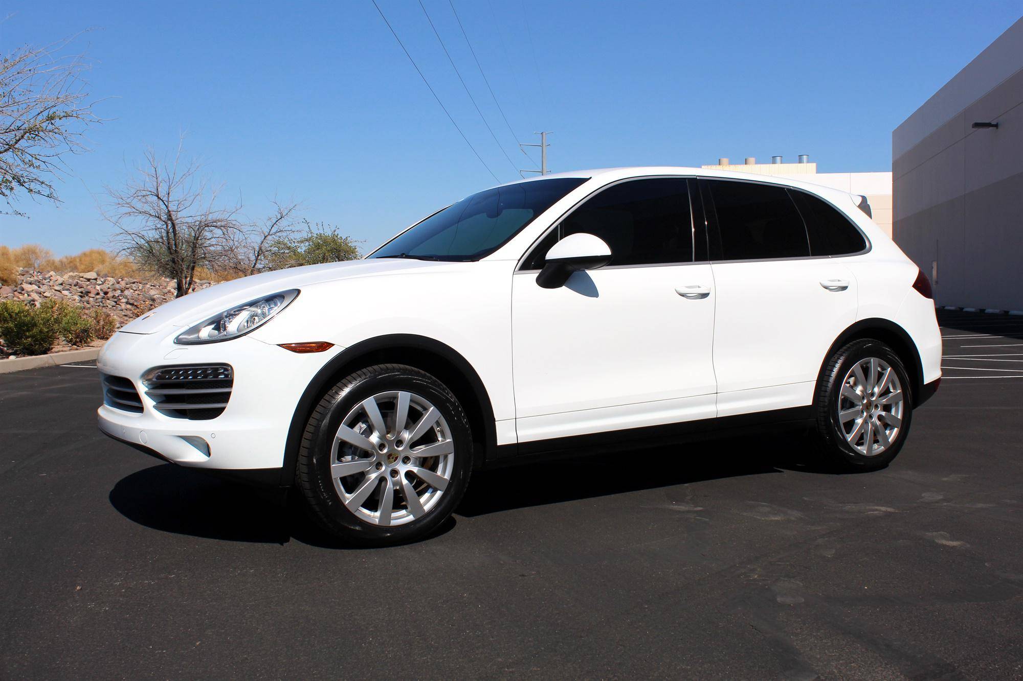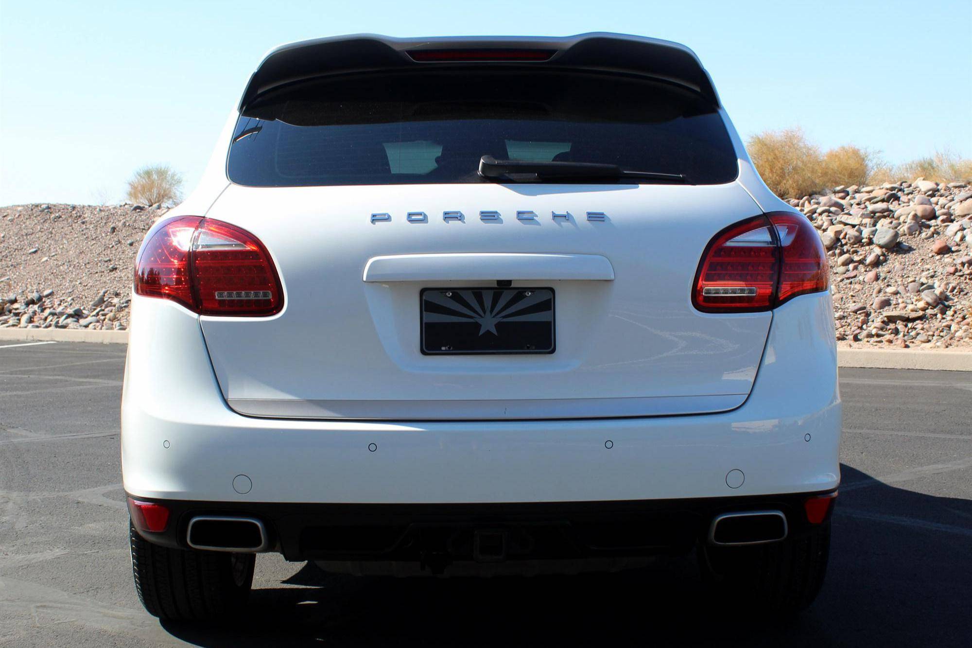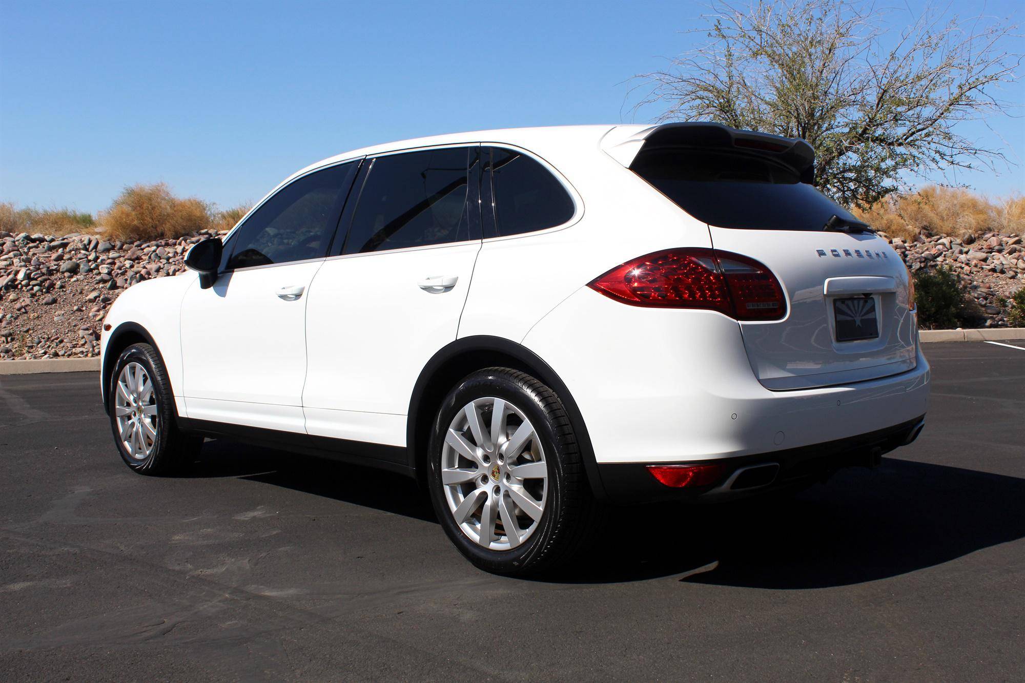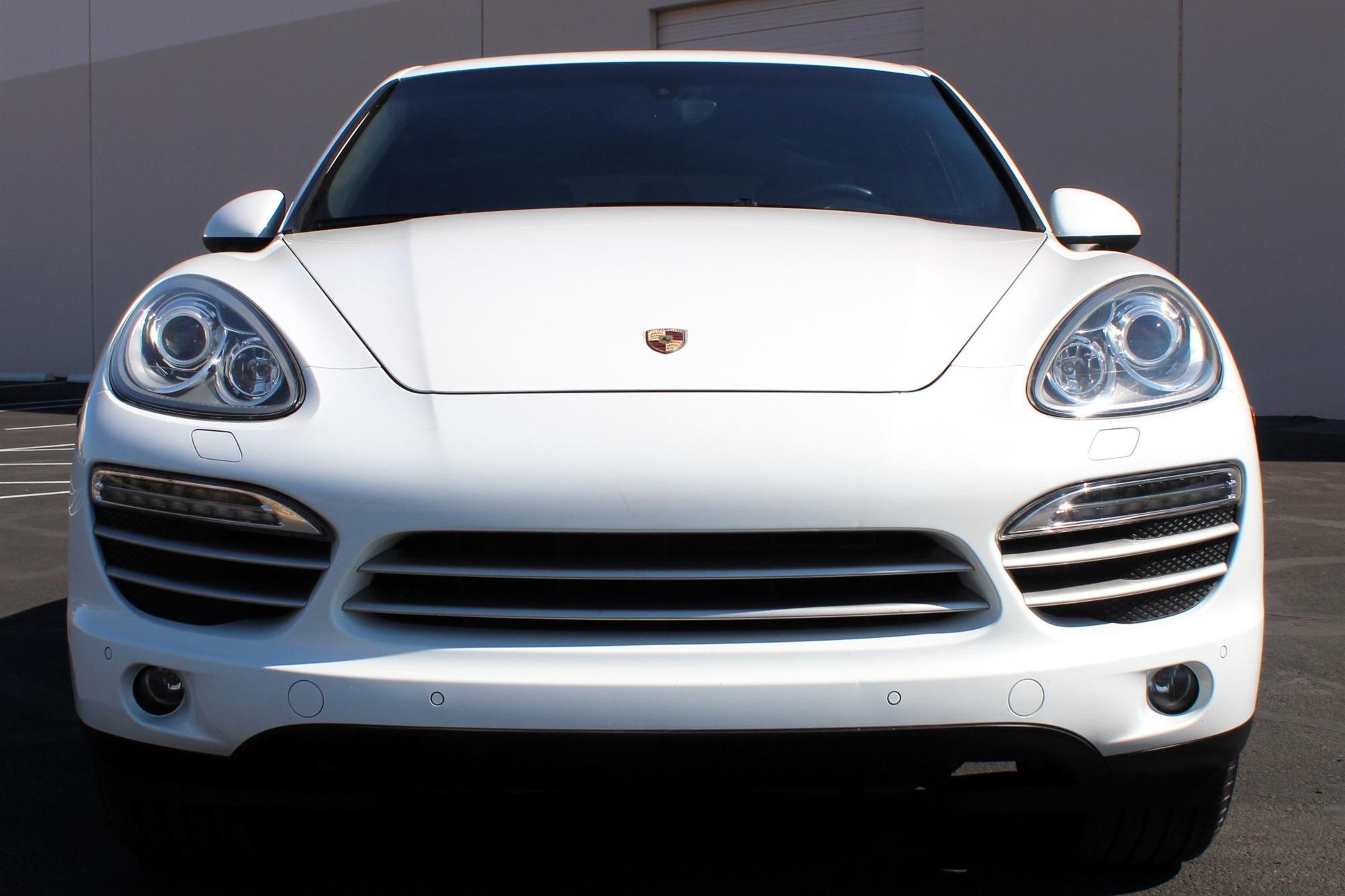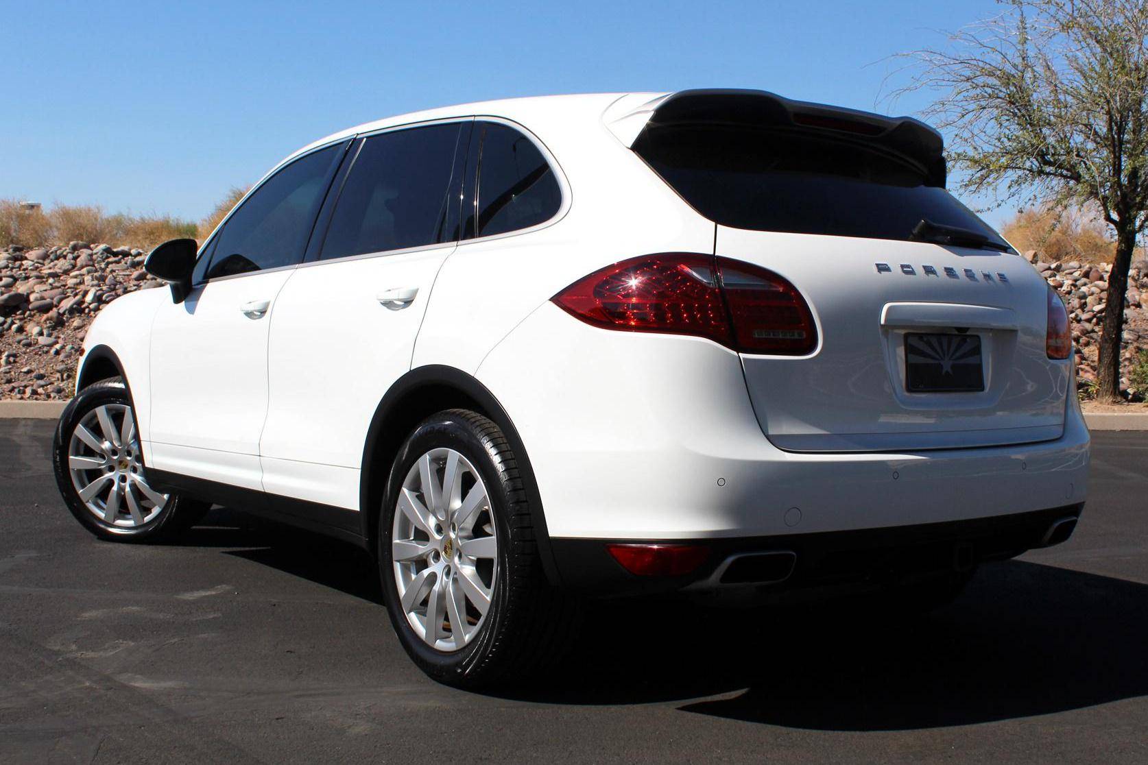 2014 Porsche Cayenne Platinum Edition, finished in white with a black interior. A build sheet is provided in the photo gallery, and a partial list of notable equipment includes the Platinum Edition trim, Sport Chrono Package, 20-inch Cayenne SportDesign II wheels, leather upholstery, power-adjustable and ventilated front seats, a Bose audio system, and more as detailed below. Modifications reported by the seller are limited to tinted windows. Released for the 2011 model year, the second-generation Cayenne (called "958" internally) was slightly bigger and significantly lighter than its predecessor. It offered a smoother ride thanks to additional technology and luxury features, it was just as capable off-road, and critics agreed it was noticeably sportier than the first-generation model. Production ended in 2017. Power comes from a 3. 6-liter V6, rated at 300 horsepower and 295 lb-ft of torque. Output is sent to all four wheels via an 8-speed automatic transmission and a permanent all-wheel drive system.