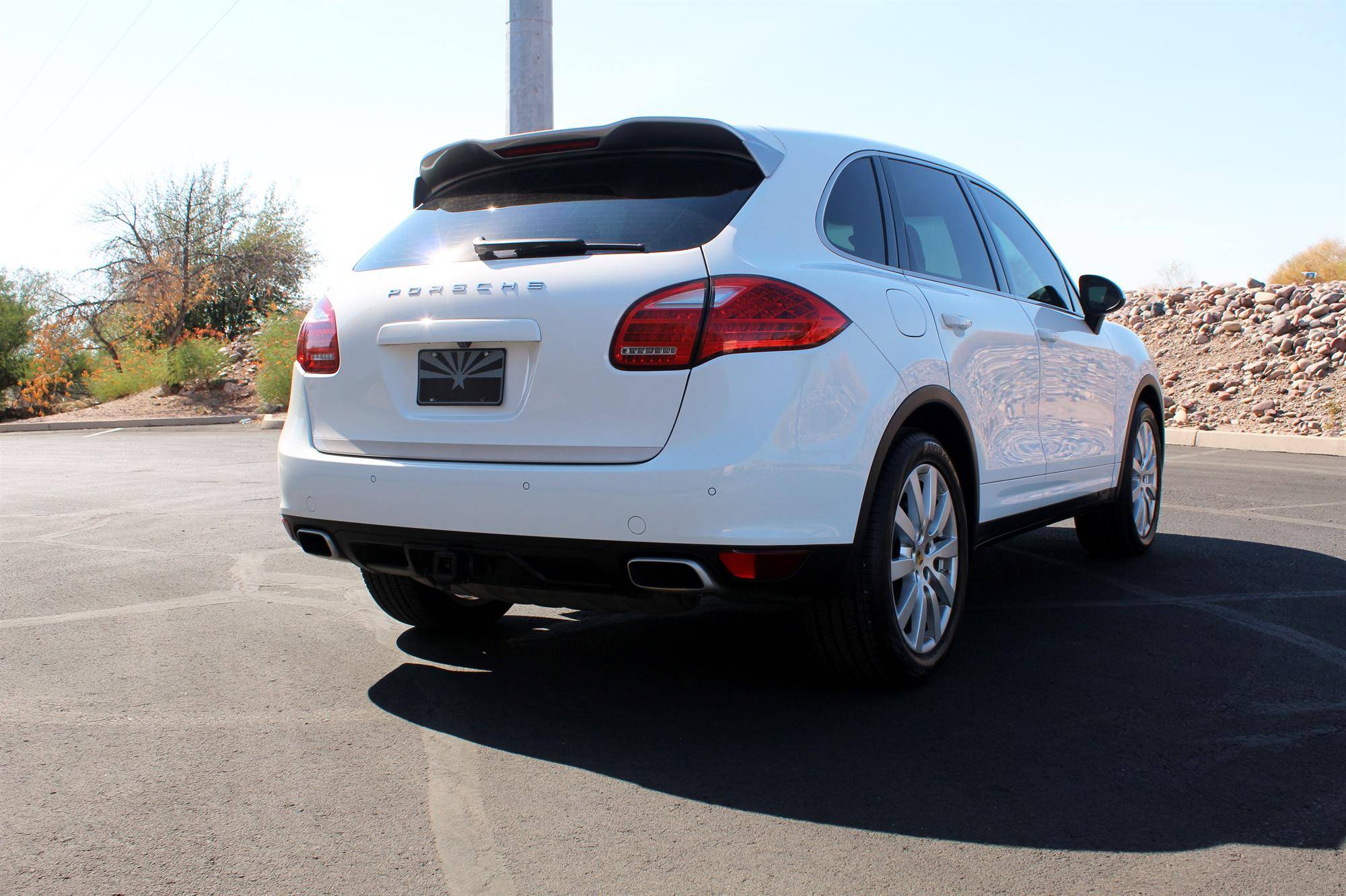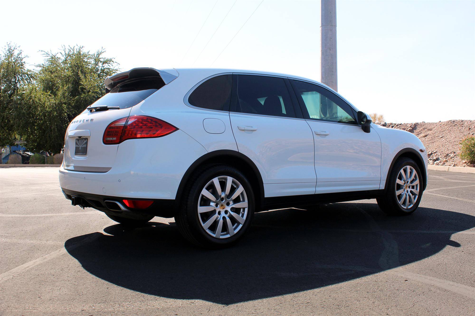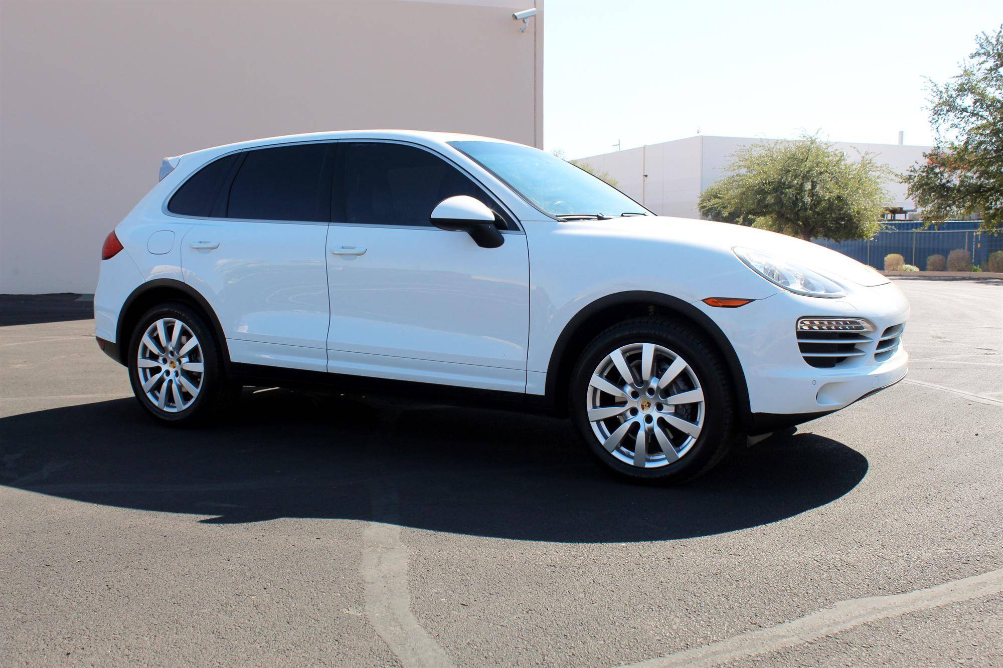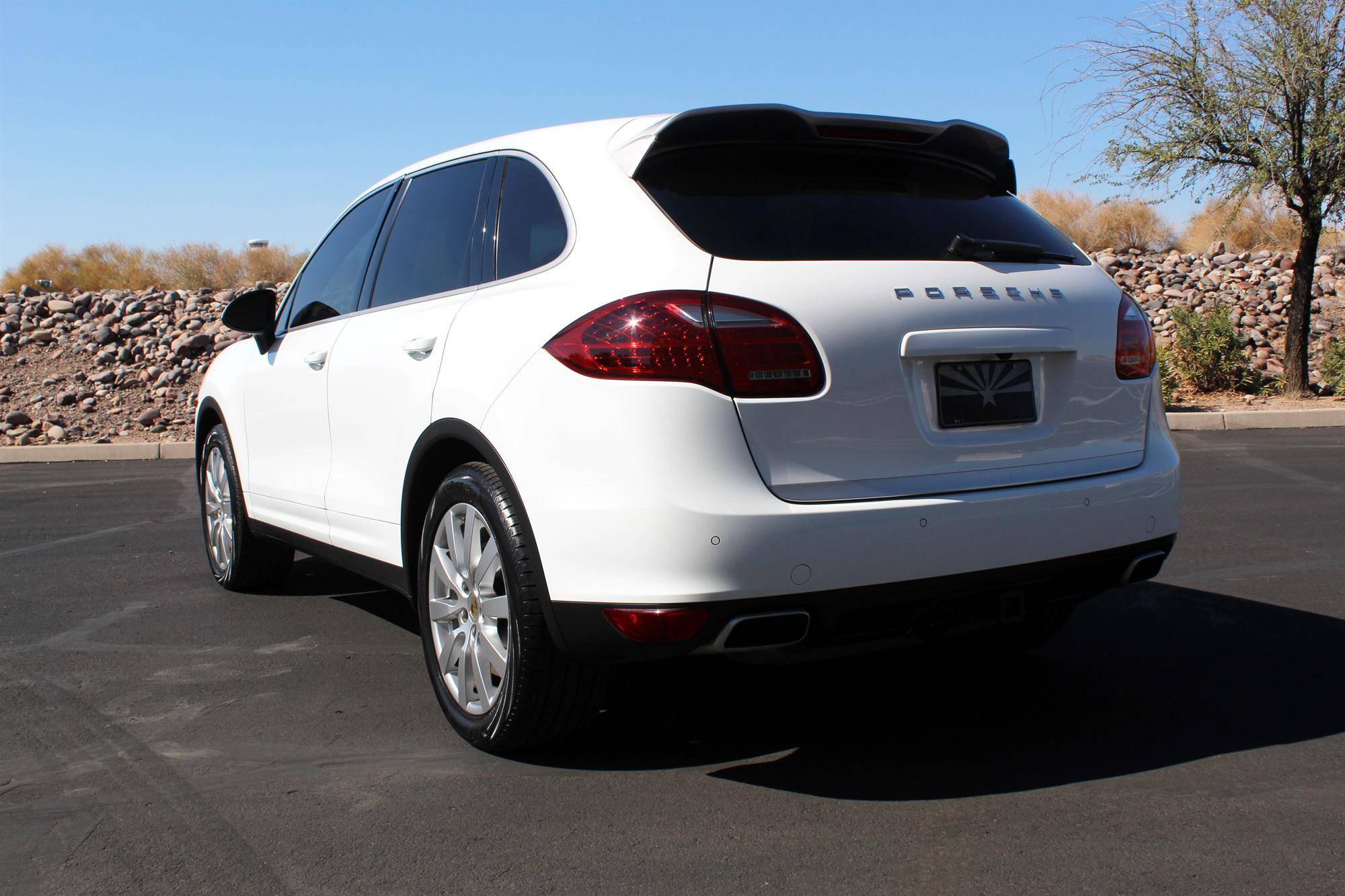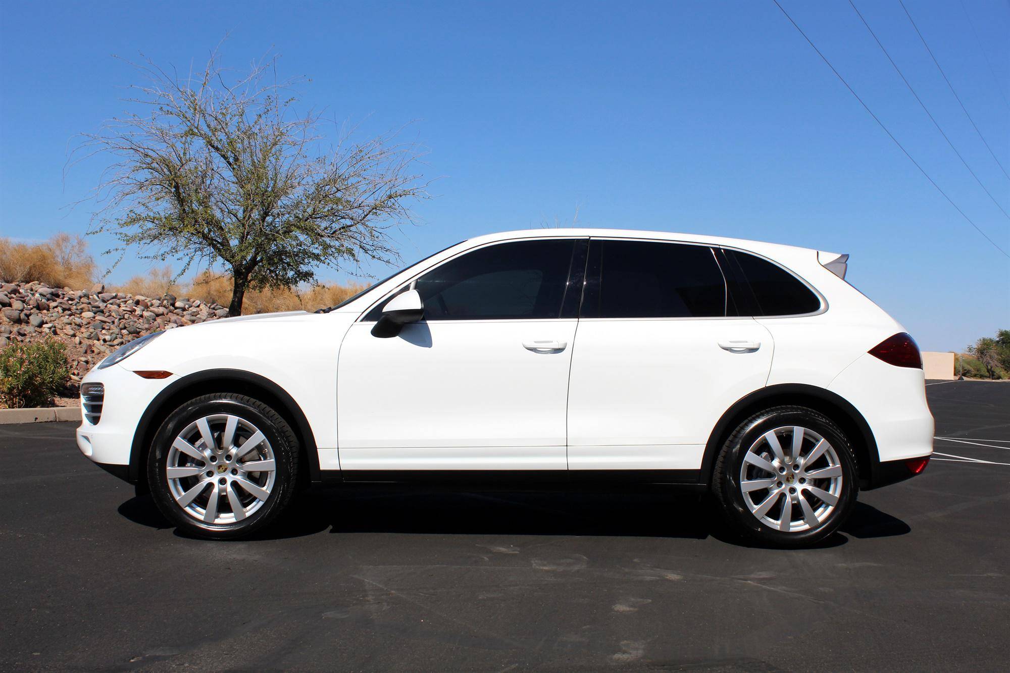 2014 Porsche Cayenne Platinum Edition, finished in white with a black interior. A build sheet is provided in the photo gallery, and a partial list of notable equipment includes the Platinum Edition trim, Sport Chrono Package, 20-inch Cayenne SportDesign II wheels, leather upholstery, power-adjustable and ventilated front seats, a Bose audio system, and more as detailed below. Modifications reported by the seller are limited to tinted windows. Released for the 2011 model year, the second-generation Cayenne (called "958" internally) was slightly bigger and significantly lighter than its predecessor. It offered a smoother ride thanks to additional technology and luxury features, it was just as capable off-road, and critics agreed it was noticeably sportier than the first-generation model. Production ended in 2017. Power comes from a 3. 6-liter V6, rated at 300 horsepower and 295 lb-ft of torque. Output is sent to all four wheels via an 8-speed automatic transmission and a permanent all-wheel drive system.