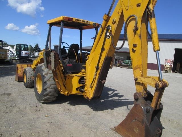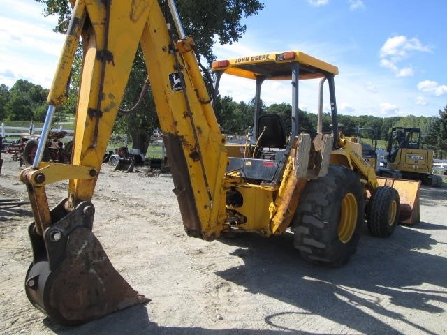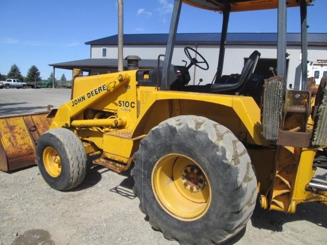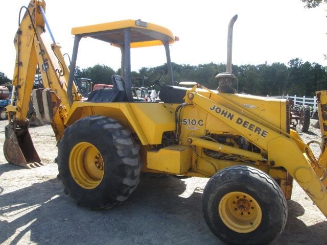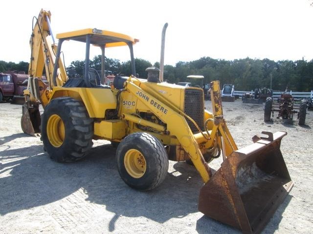 1990 John Deere 510C backhoe, hp 85, 2WD, Rops, std hoe, 4 cyl John Deere diesel with turbo, 90" front bucket with bolt-on cutting edge, 16" rear bucket, rear plumbing, 19.5-24 rear tires, 14.5-16.1 front tires, 2 lever backhoe controls, 4-speed shuttle trans, digs 16' deep, weighs 16,000lbs, runs and operates great.