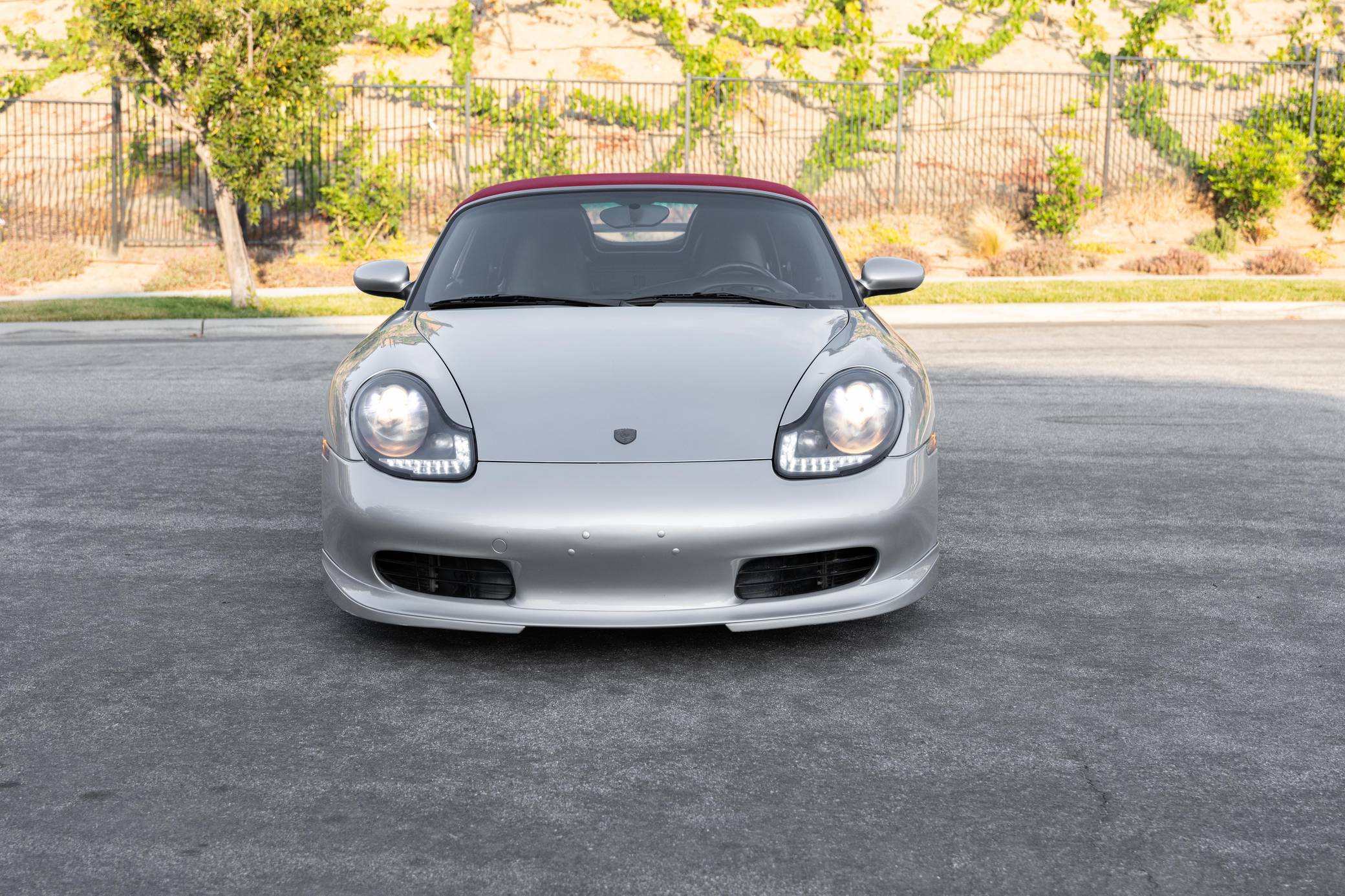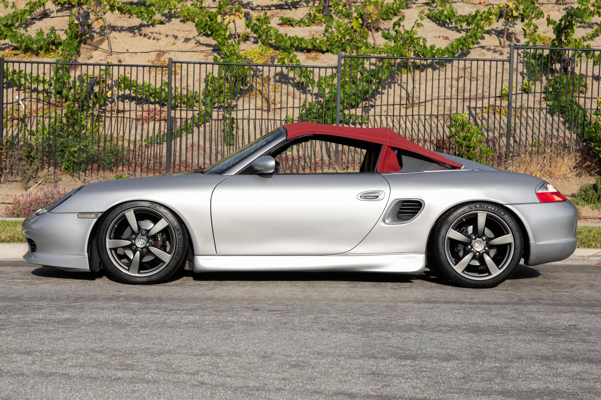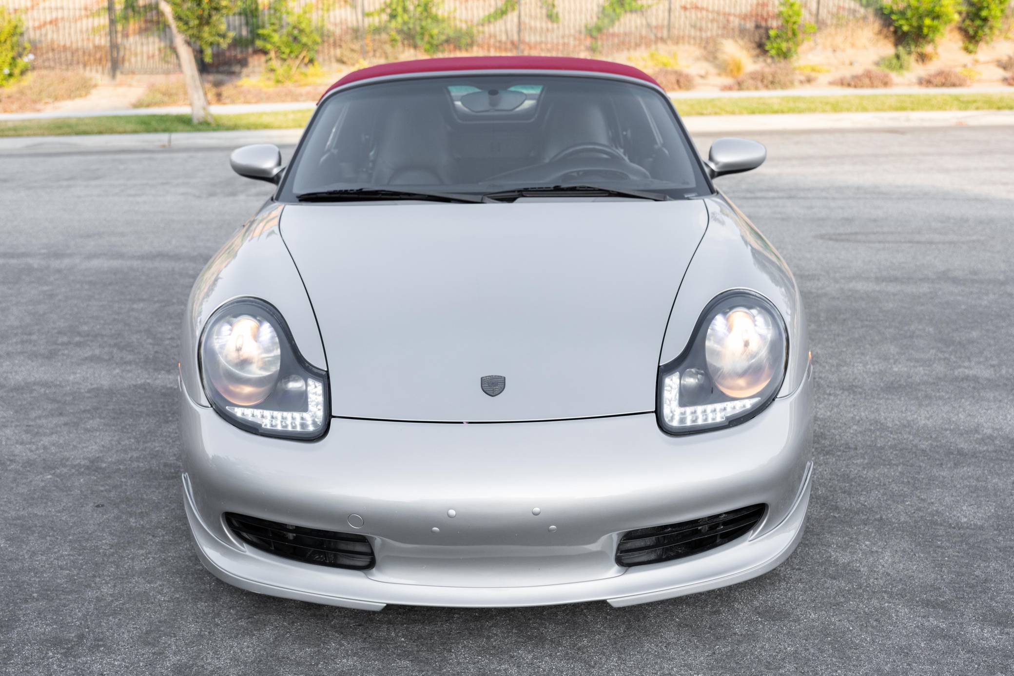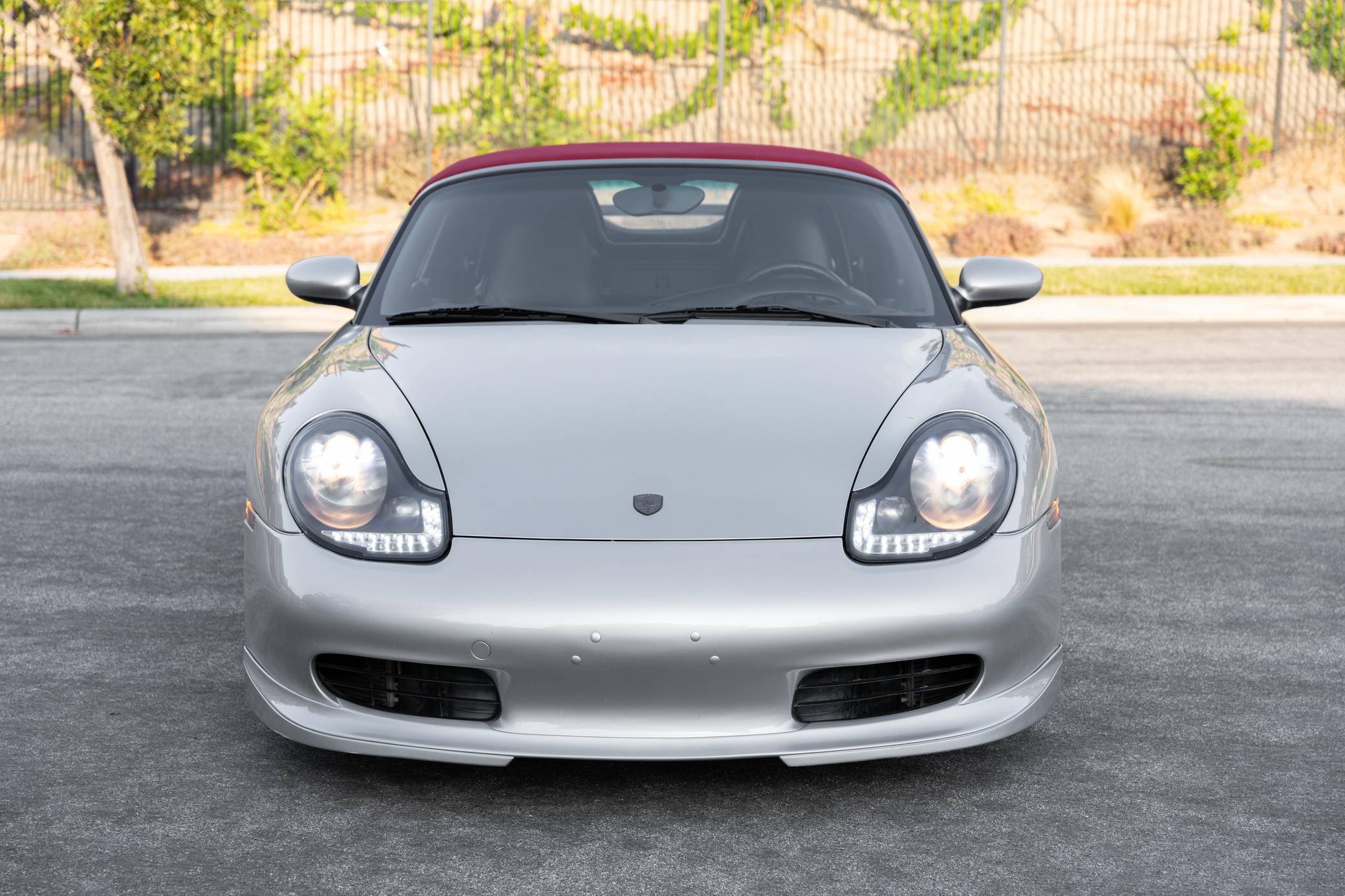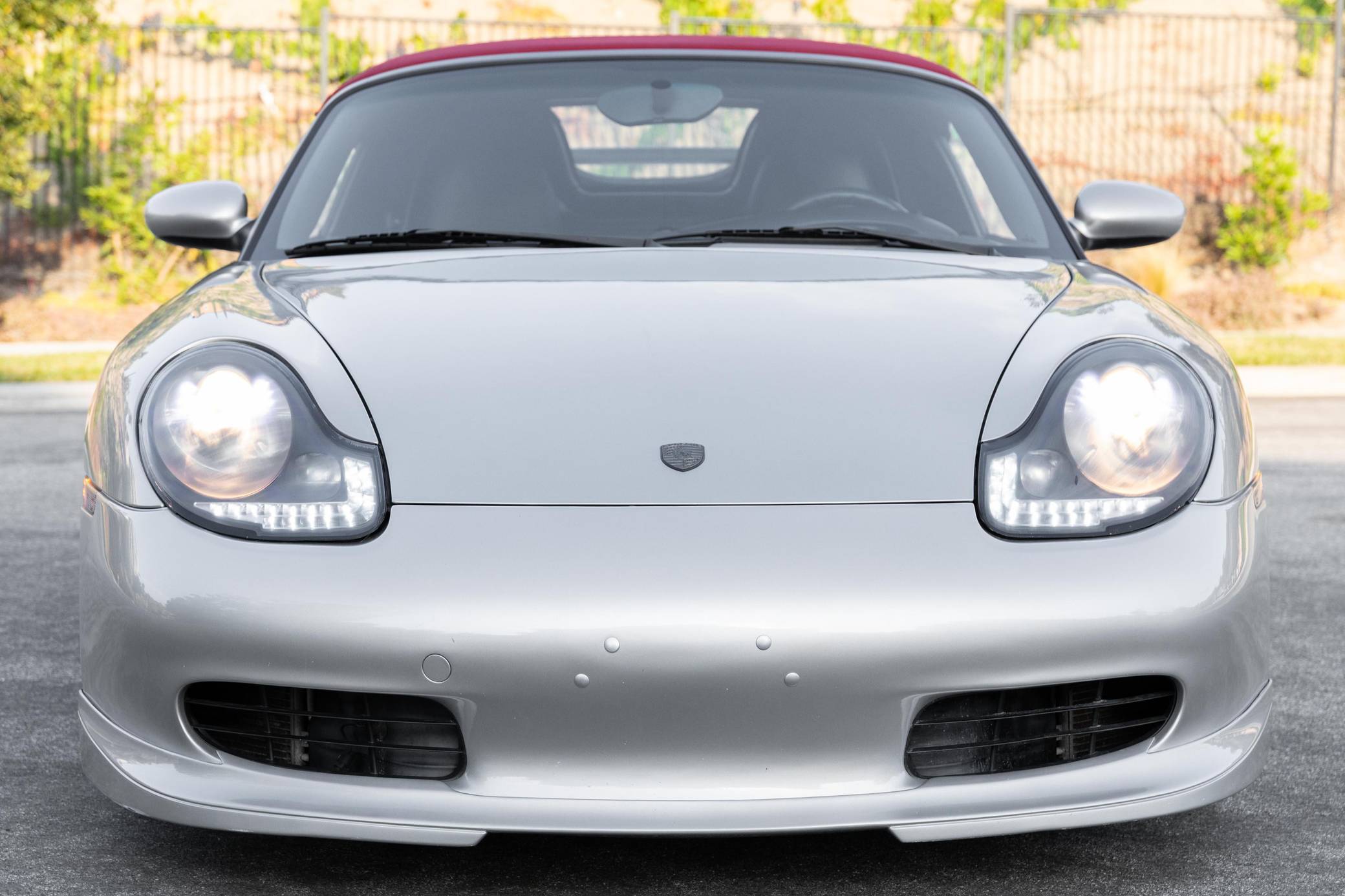 2001 Porsche Boxster, finished in Arctic Silver Metallic with a red soft top and a black interior. This roadster is equipped with the desirable 5-speed manual transmission, and its odometer displays about 50,200 miles. This Boxster is fitted with a 986 Spyder conversion kit from TuneRS Motorsports. The list of modifications reported by the seller also includes a Dansk exhaust system, high-flow catalytic converters, 18-inch wheels from a Cayman S, a KW automotive V1 coilover kit, LED headlights, TuneRS Motorsports side skirts, a flat-bottom steering wheel, and an aftermarket shift knob. More details about the aftermarket parts installed on this Porsche are provided below. Factory equipment includes the Sport Package, partial leather upholstery, and air conditioning. Called "986" internally, the first-generation Boxster was introduced for 1997 as Porsche's long-awaited entry-level model. It was immediately well-received by driving enthusiasts; some even called it a better overall platform than the 911 thanks to its mid-mounted engine. In hindsight, it's one of the cars that saved Porsche from an uncertain fate. Power comes from a 2. 7-liter flat-6, rated at 217 horsepower and 192 lb-ft of torque. It spins the rear wheels via a 5-speed manual transmission.