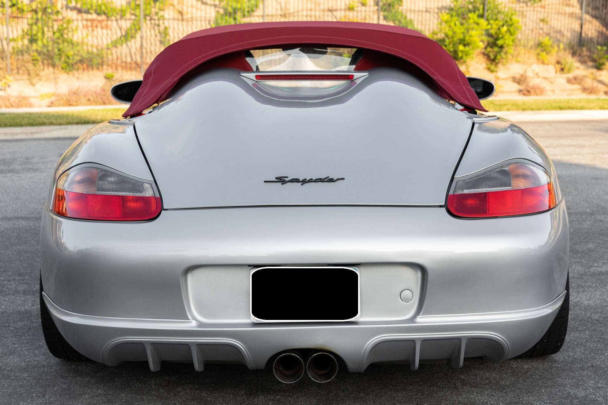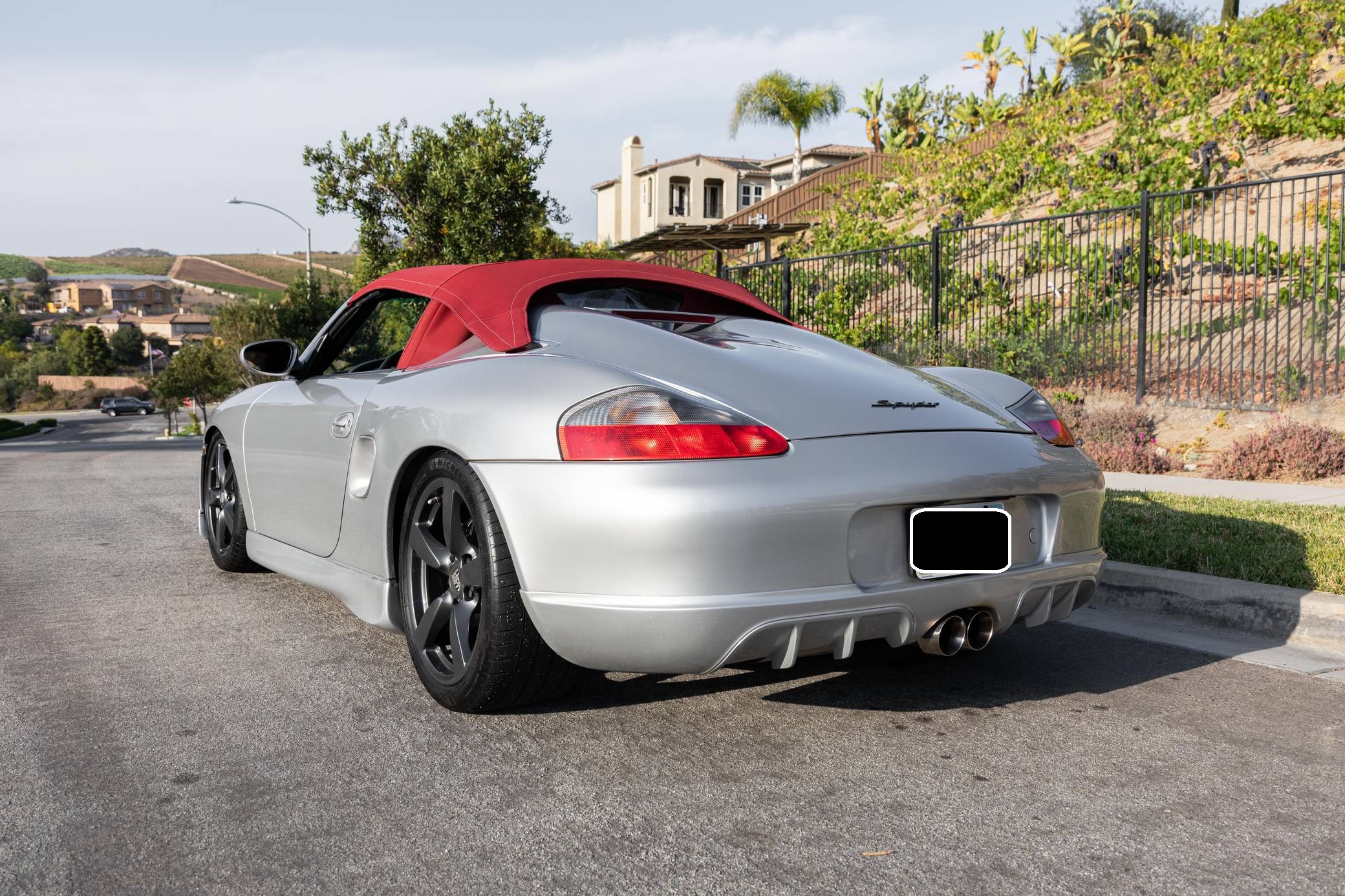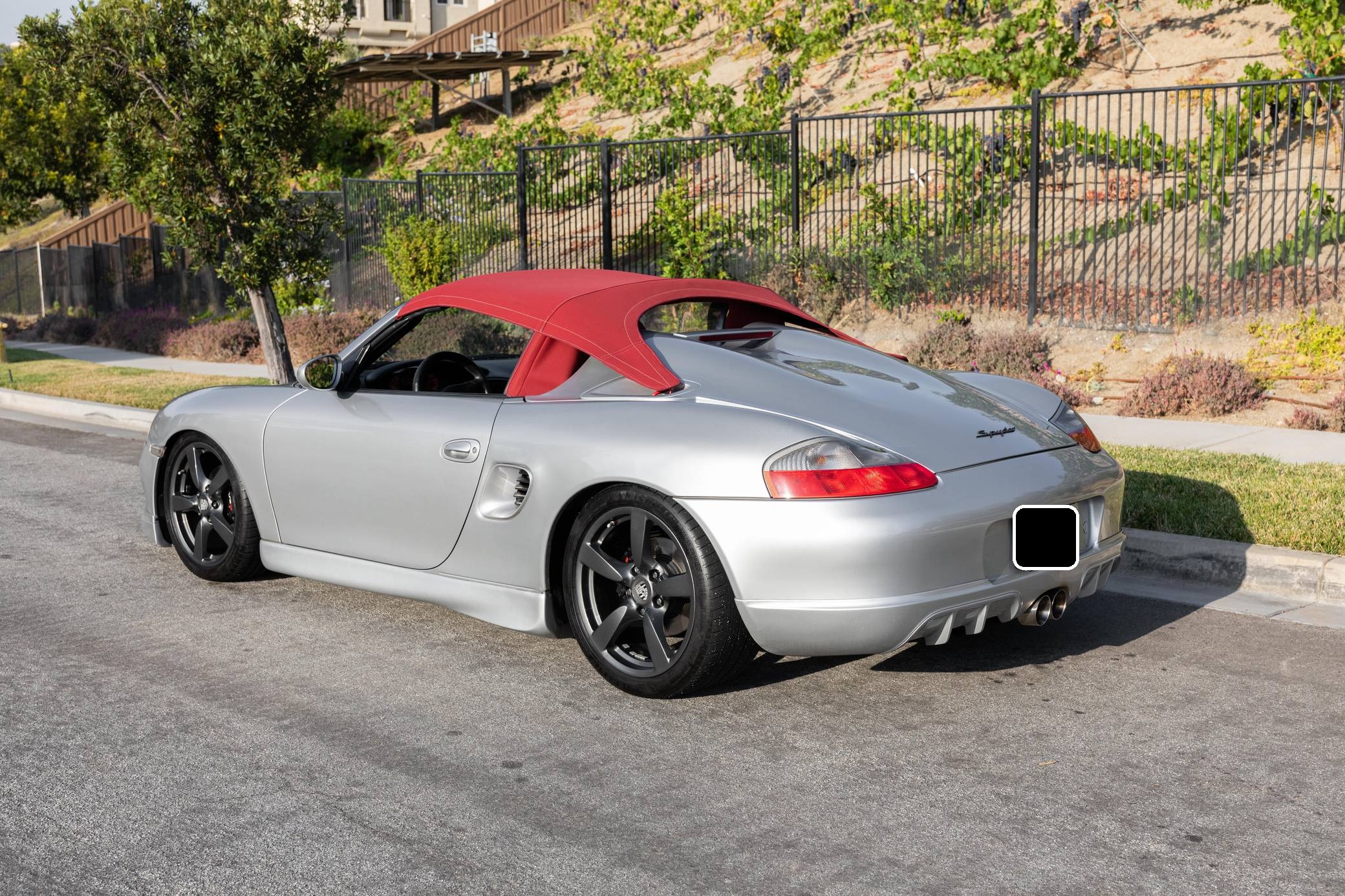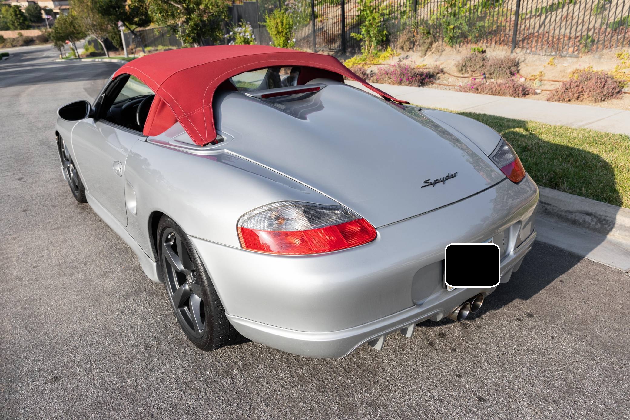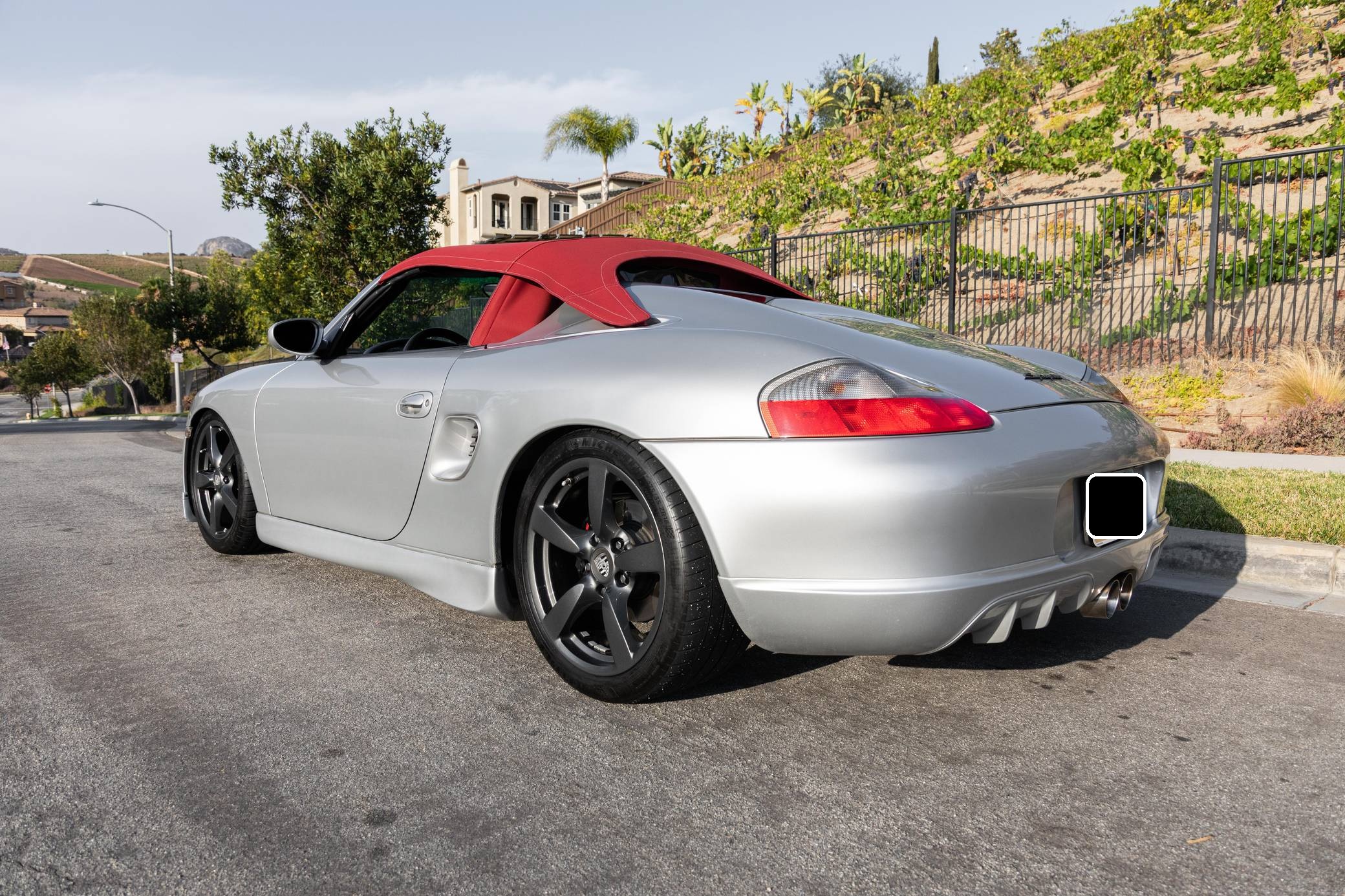 2001 Porsche Boxster, finished in Arctic Silver Metallic with a red soft top and a black interior. This roadster is equipped with the desirable 5-speed manual transmission, and its odometer displays about 50,200 miles. This Boxster is fitted with a 986 Spyder conversion kit from TuneRS Motorsports. The list of modifications reported by the seller also includes a Dansk exhaust system, high-flow catalytic converters, 18-inch wheels from a Cayman S, a KW automotive V1 coilover kit, LED headlights, TuneRS Motorsports side skirts, a flat-bottom steering wheel, and an aftermarket shift knob. More details about the aftermarket parts installed on this Porsche are provided below. Factory equipment includes the Sport Package, partial leather upholstery, and air conditioning. Called "986" internally, the first-generation Boxster was introduced for 1997 as Porsche's long-awaited entry-level model. It was immediately well-received by driving enthusiasts; some even called it a better overall platform than the 911 thanks to its mid-mounted engine. In hindsight, it's one of the cars that saved Porsche from an uncertain fate. Power comes from a 2. 7-liter flat-6, rated at 217 horsepower and 192 lb-ft of torque. It spins the rear wheels via a 5-speed manual transmission.