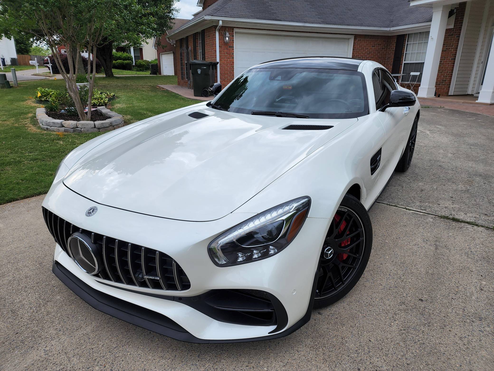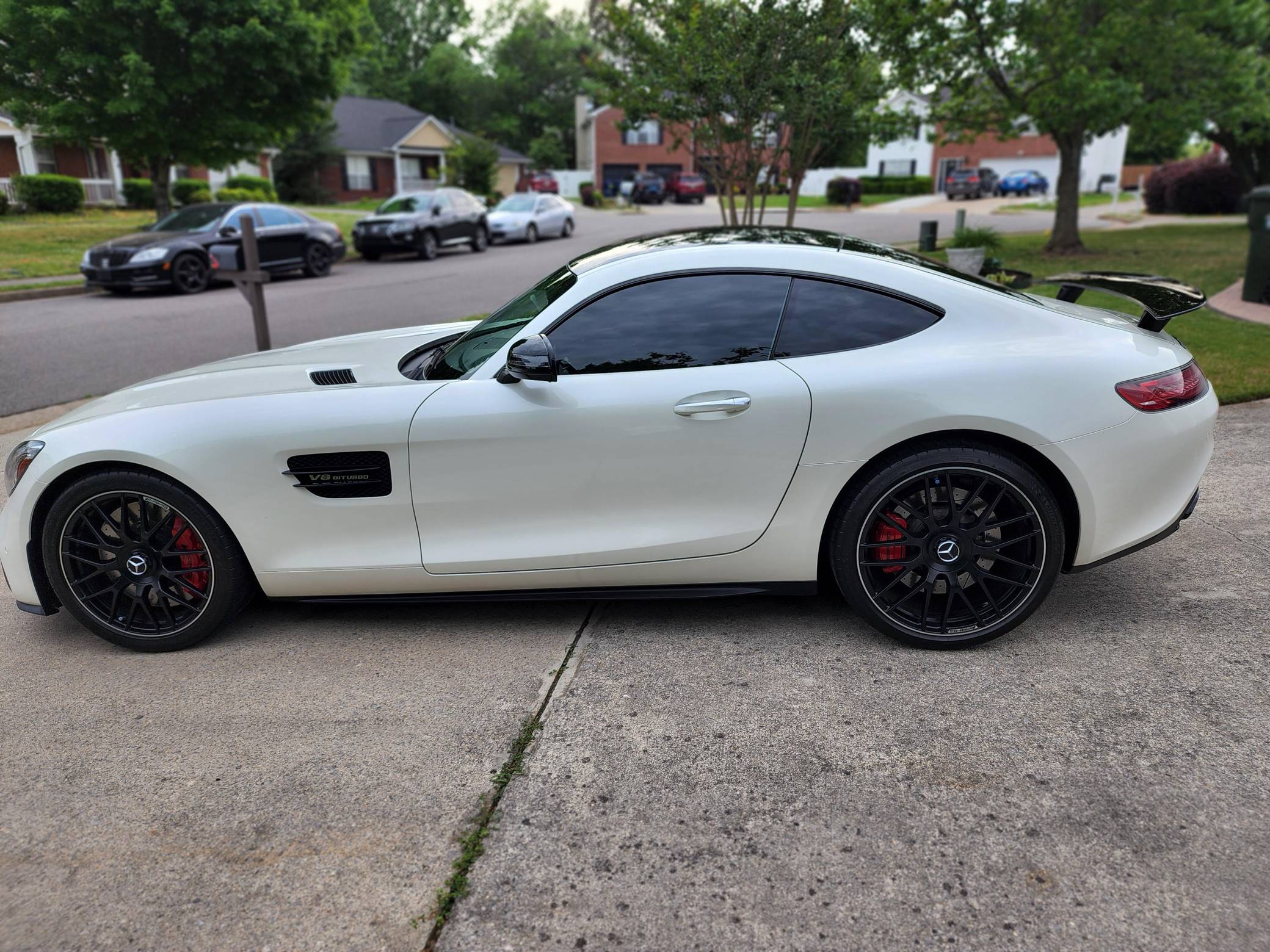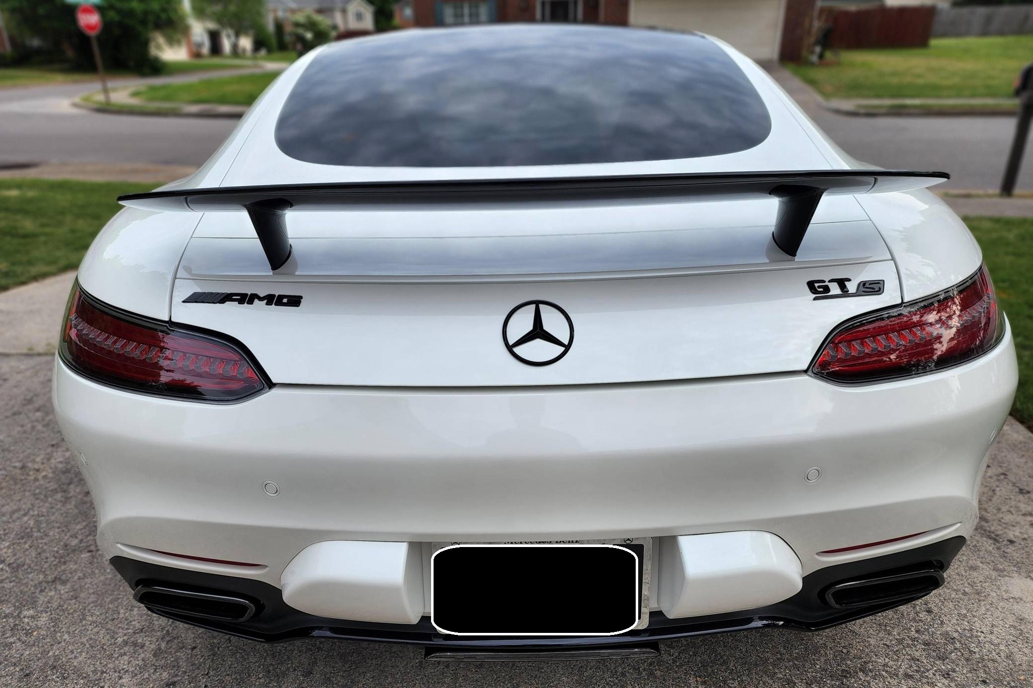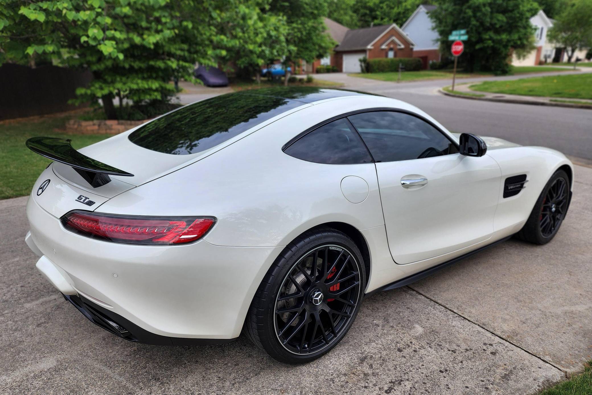 2018 Mercedes-AMG GT S Coupe, finished in Designo Diamond White Metallic with a Red Pepper and black interior. The odometer currently indicates approximately 15,700 miles. According to the build sheet provided in the gallery, this GT S had an original MSRP of $152,035, including $18,640 in options. Factory equipment includes the AMG Aerodynamics Package, Lane Tracking Package, a panoramic sunroof, Nappa leather interior, AMG carbon fiber interior trim, heated, ventilated, and power-adjustable sport seats, and a Burmester surround sound system. Modifications are limited to tinted windows. The GT S is a better-equipped version of the Mercedes-AMG GT -- adding a tuned engine, the AMG Ride Control adaptive suspension system, an AMG Performance Exhaust system, and, most importantly, an electronically-controlled limited-slip differential. It launched alongside the GT in 2015 and was assembled at the Mercedes-Benz plant in Sindelfingen, Germany. Power comes from a twin-turbocharged 4. 0-liter V8, rated at 515 horsepower and 494 lb-ft of torque. Output is sent to the rear wheels through a 7-speed double-clutch automatic transmission.