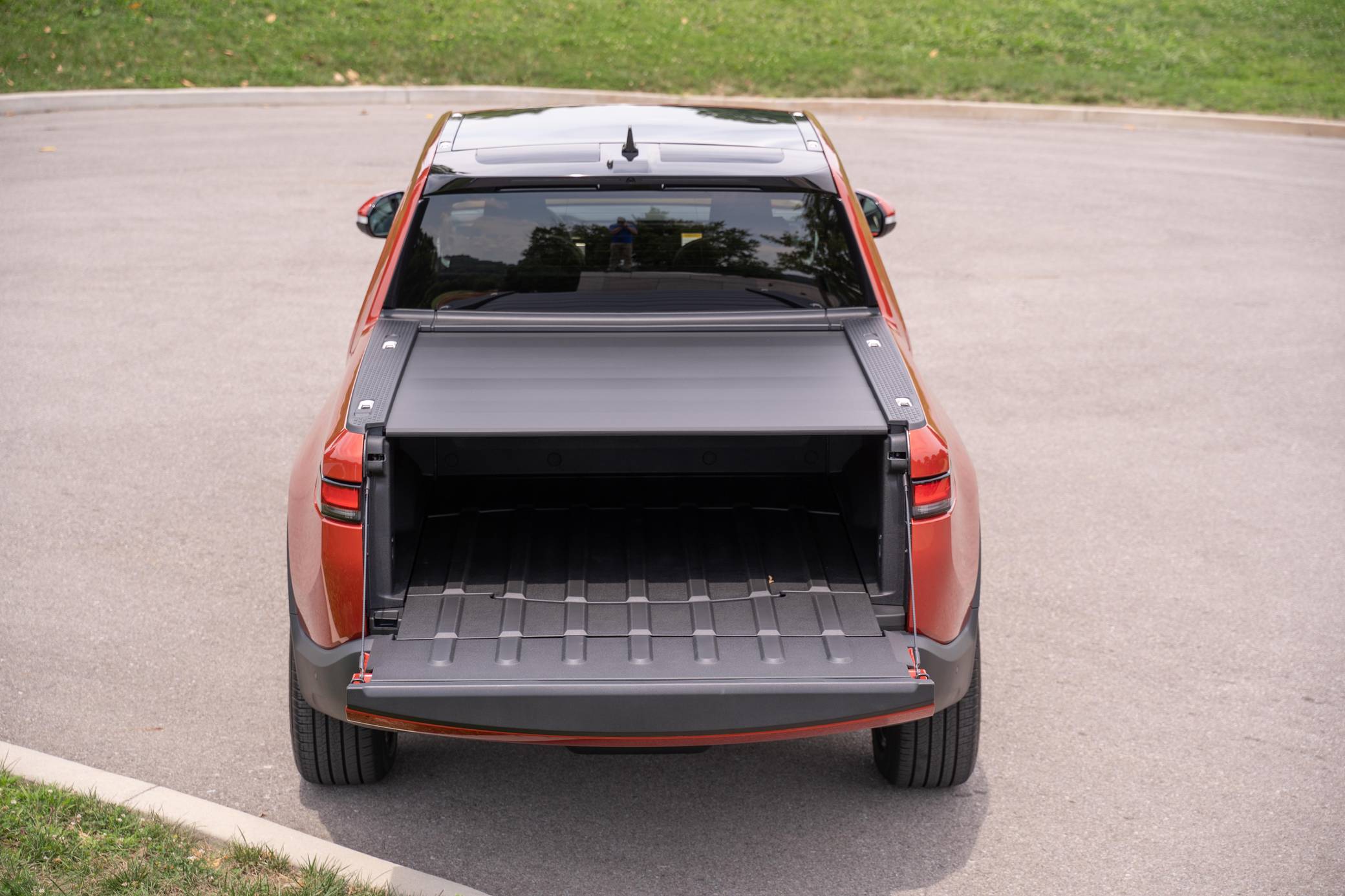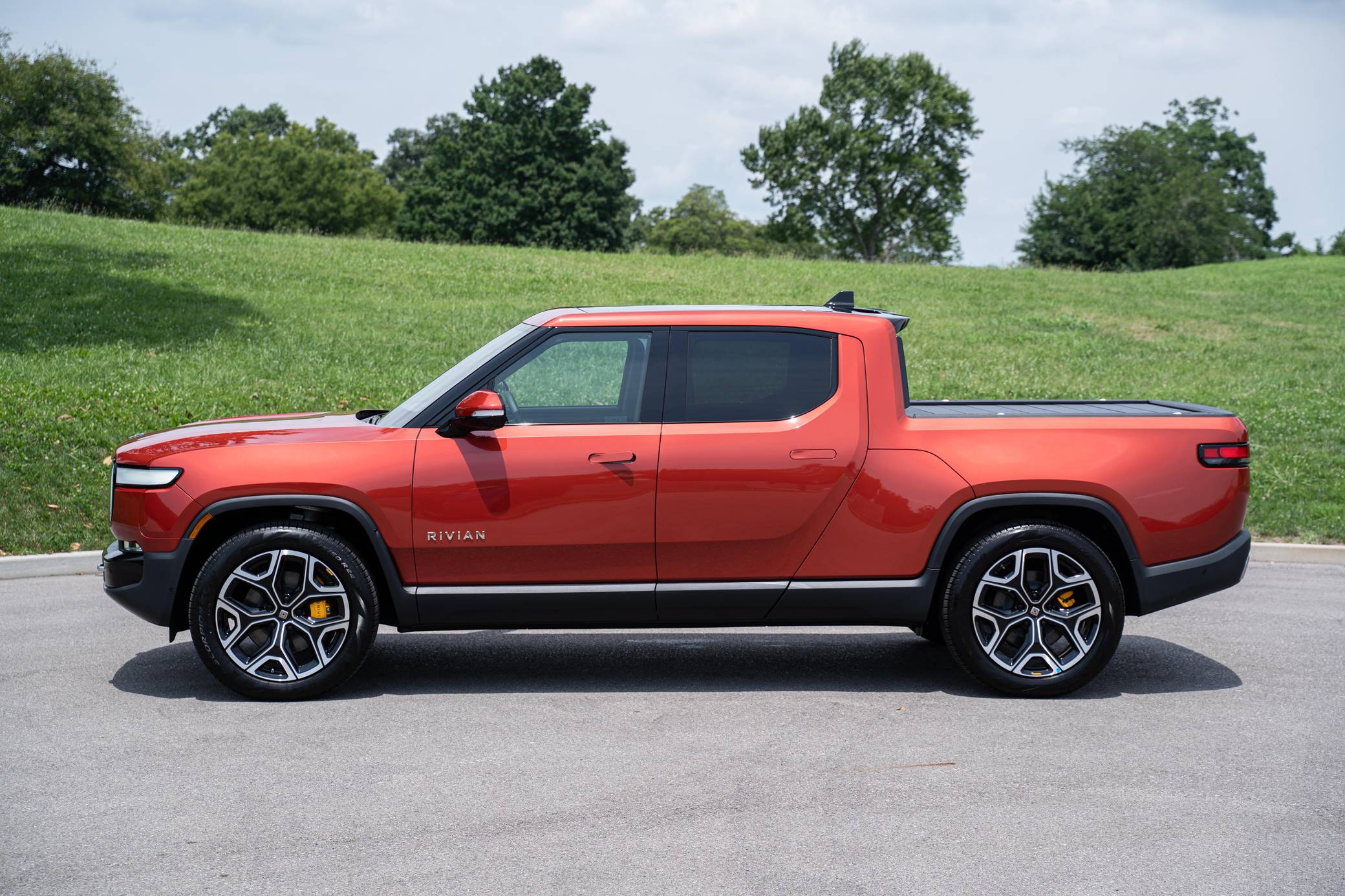 2022 Rivian R1T Adventure Edition, finished in Red Canyon with a Black Mountain interior. It's equipped with the Adventure Edition Package, 22-inch "Sport Bright" wheels, an air suspension system, a power-operated tonneau cover, an air compressor in the cargo box, natural-grained ash wood interior trim, power-adjustable heated and ventilated front seats, a 16-inch touchscreen for the infotainment system, and a Rivian Elevation by Meridian sound system, and more as detailed below. The seller reports no modifications. Released for 2022, the R1T has a lot of firsts on its resume. It's notably the first model released by Rivian and the first modern electric pickup to enter production. It was developed on a blank sheet of paper with the outdoors in mind, so it offers several clever features like a Gear Tunnel located between the cargo box and the cab. It's still available new, in both Adventure Package and Explore Package models. Power comes from four electric motors, which draw electricity from a 135-kilowatt-hour lithium-ion battery pack to zap the four wheels with 835 horsepower and 908 lb-ft of torque. The R1T earned a maximum driving range rating of 314 miles from the EPA.