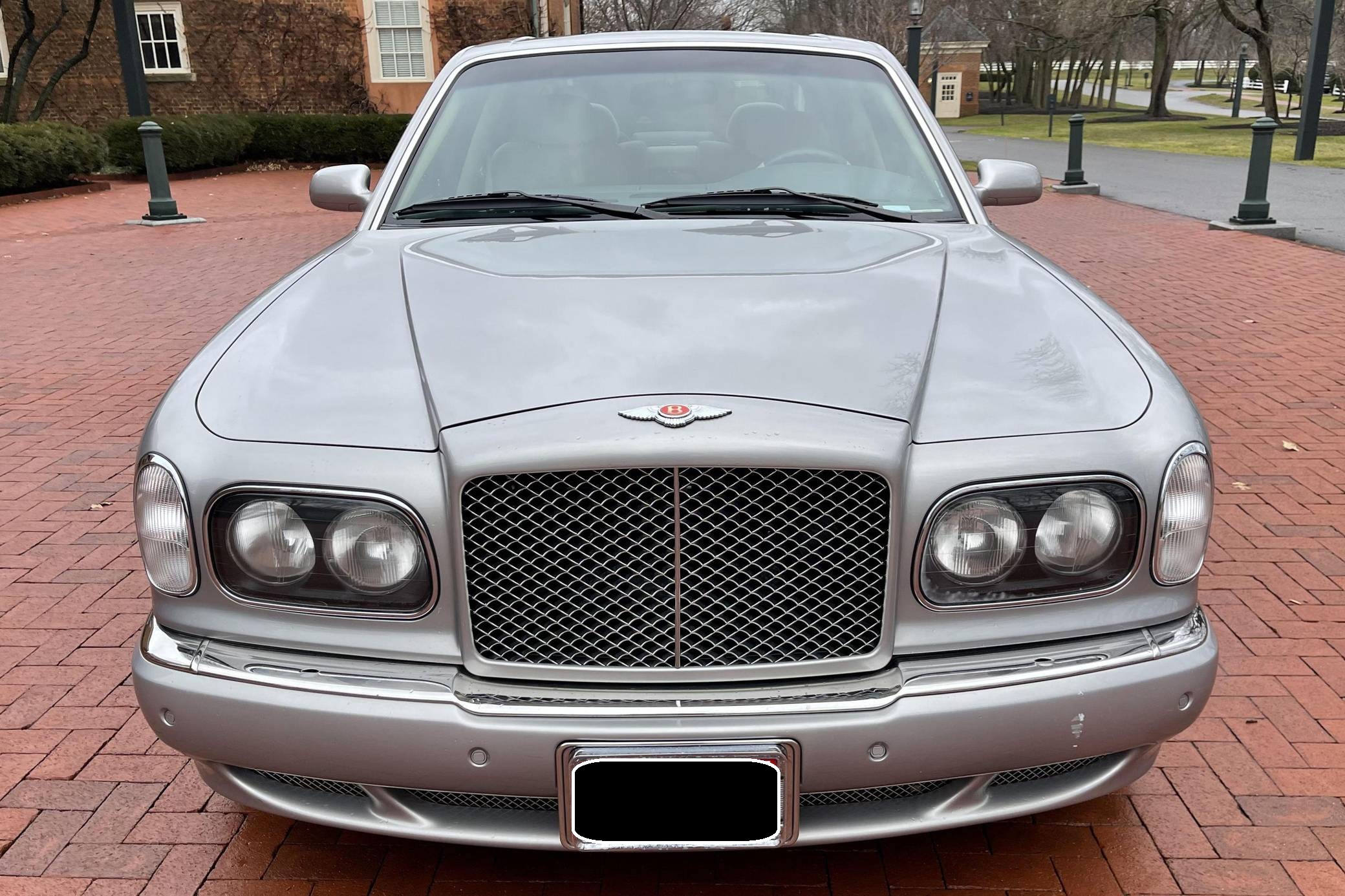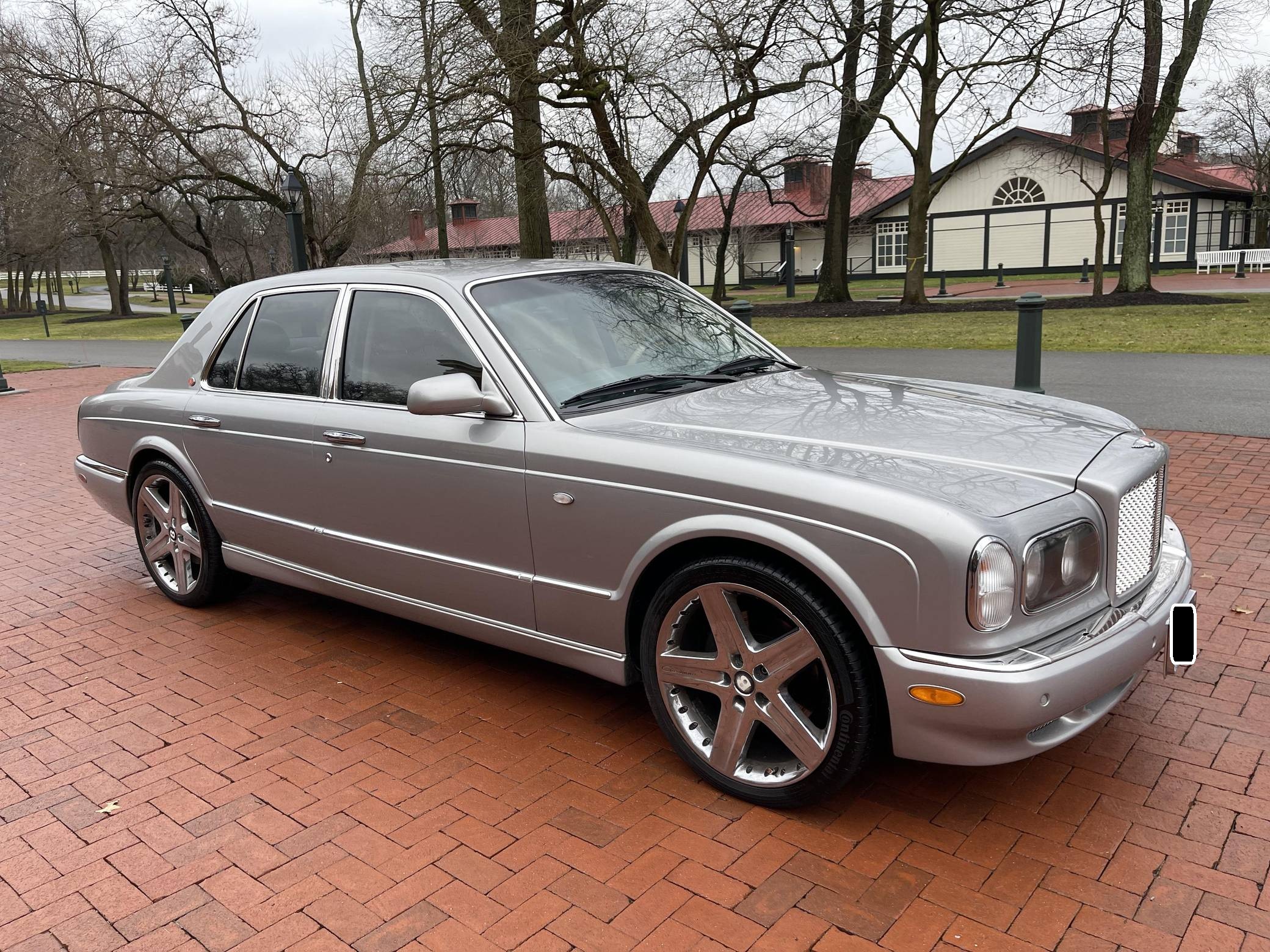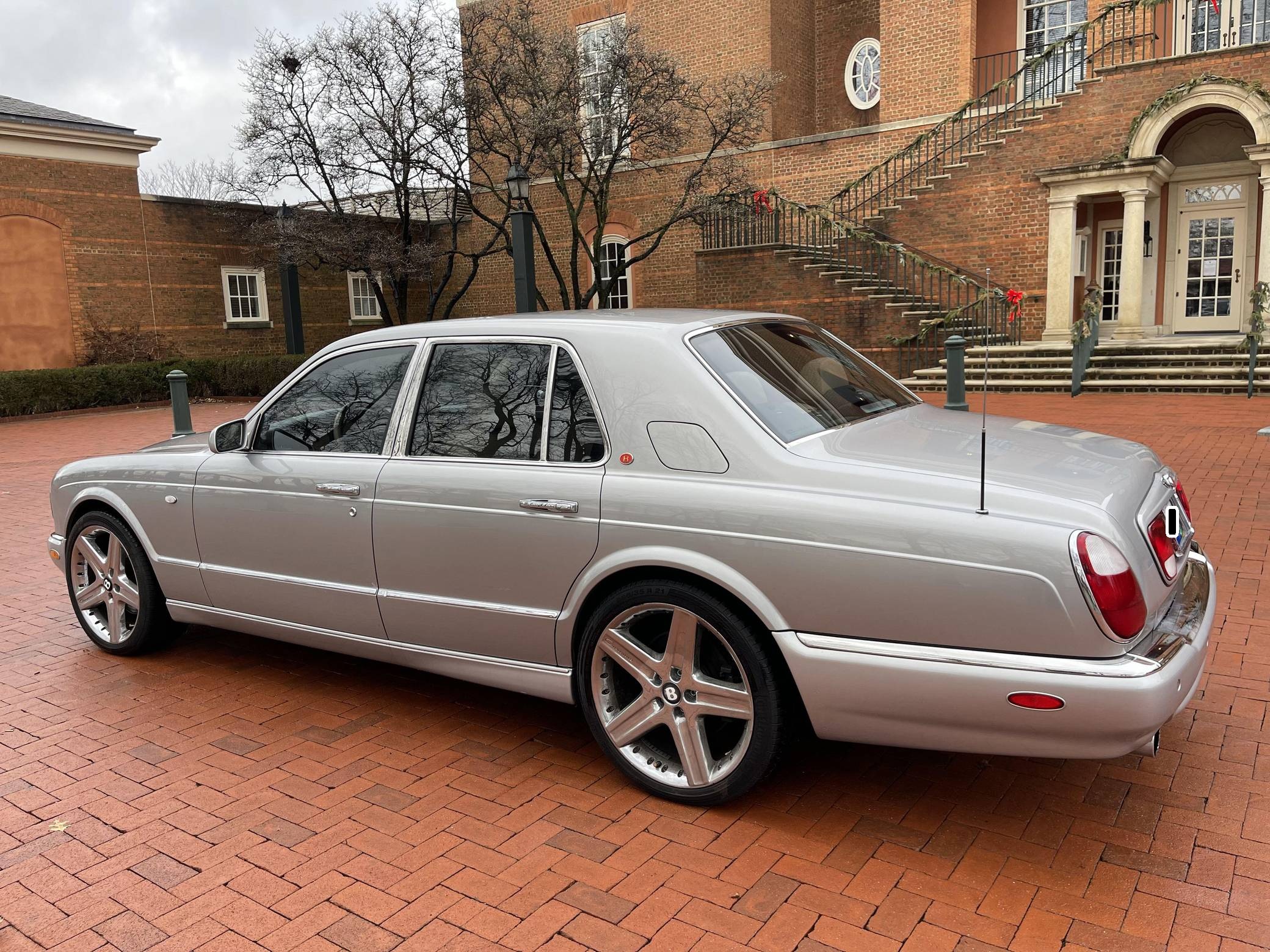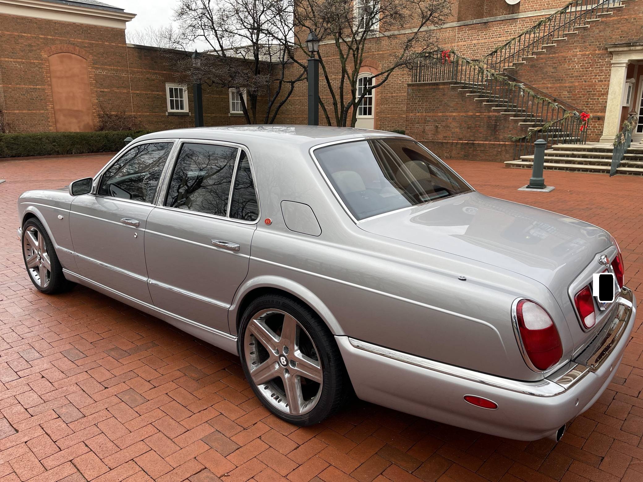 2000 Bentley Arnage, finished in silver with a tan interior. The odometer on this Bentley currently displays approximately 33,900 miles. Factory equipment includes a power sunroof, leather upholstery with contrast piping, wood interior trim, heated front seats, rear picnic tables, three-zone climate control, and more as detailed below. Modifications are limited to a set of 21-inch Giovanna chrome wheels. Closely related to the Rolls-Royce Silver Seraph, the Arnage arrived as Bentley's range-topping sedan for the 1999 model year. In the 2000s, the range included the comfort-oriented Arnage R, the long-wheelbase Arnage RL, and the sporty Arnage T. The Red Label references the use of red badging to distinguish sporty models from their standard brethren. If the badges don't give away the sporting nature of this Bentley, the additional 50 hp and 206 lb-ft over the regular Arnage surely will. Power for this Arnage comes from a turbocharged 6. 75-liter V8, rated at 400 horsepower and 619 lb-ft of torque. It spins the rear wheels via a 4-speed automatic transmission.