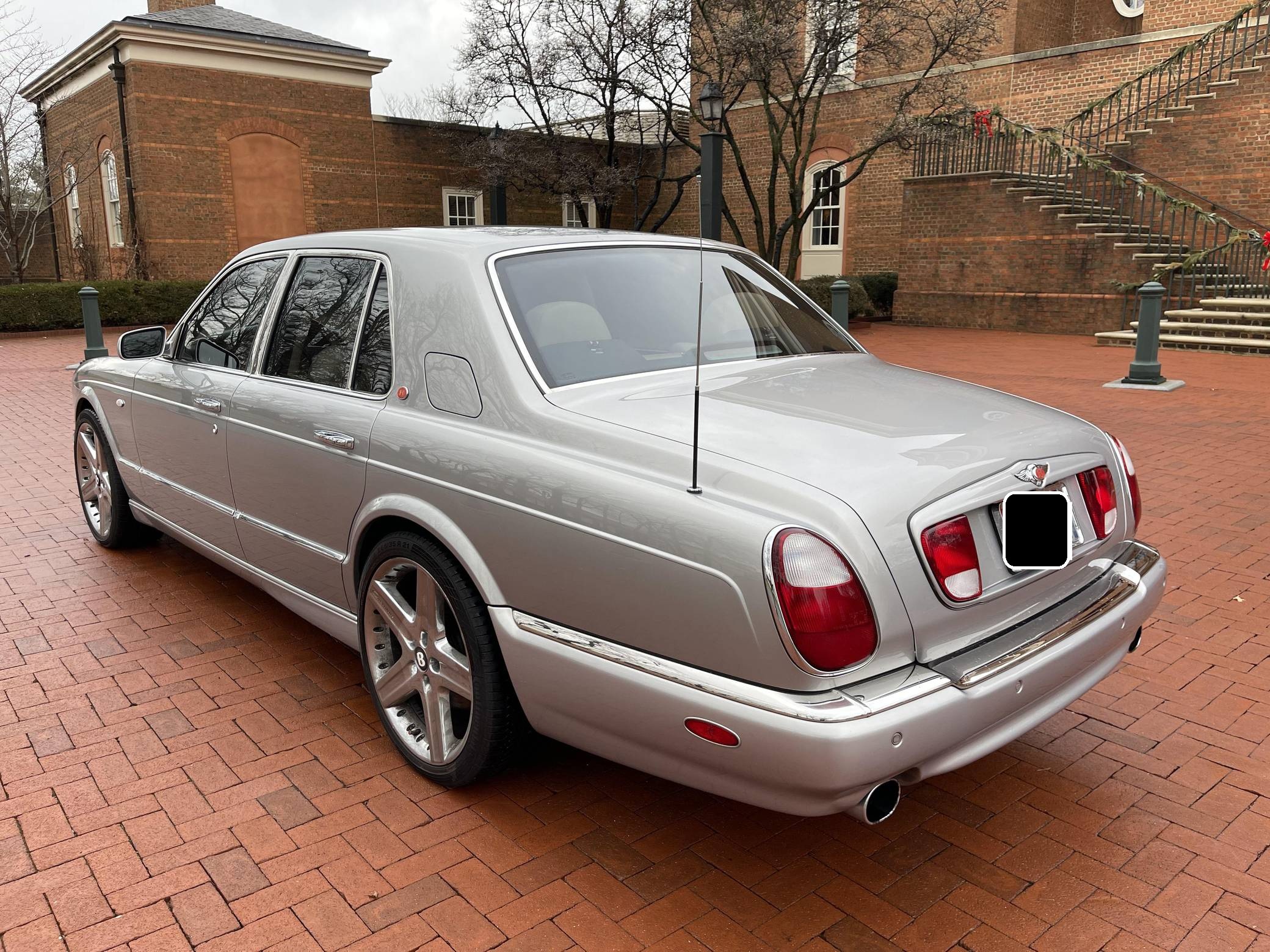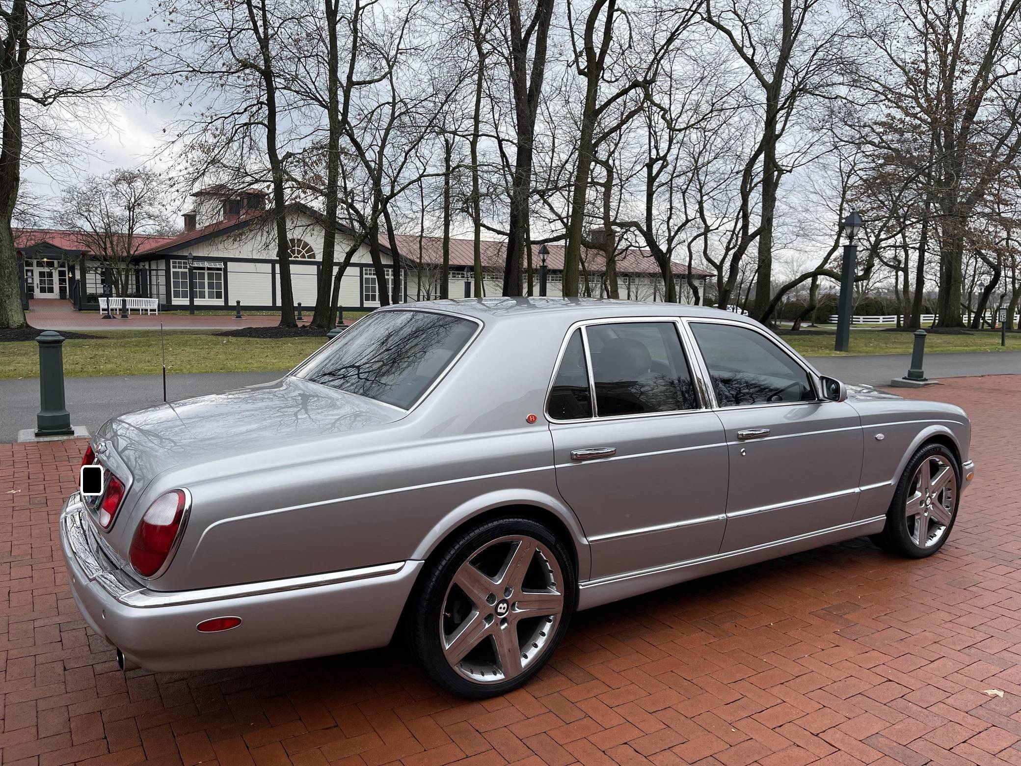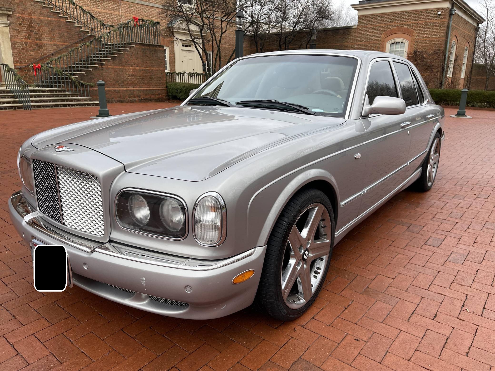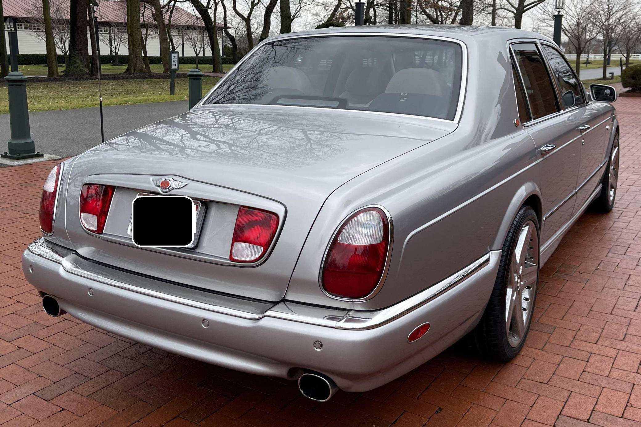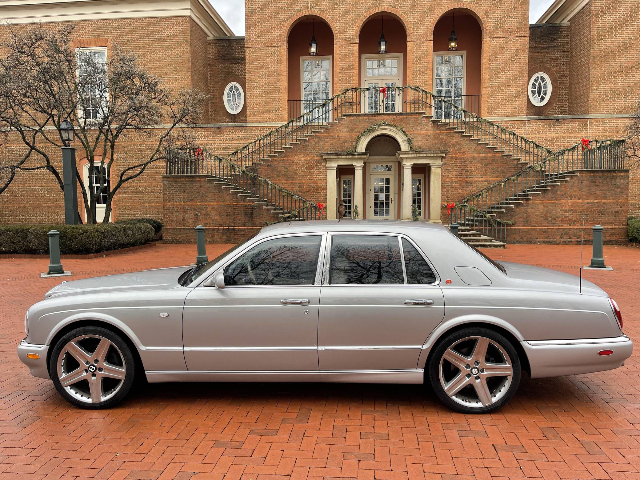 2000 Bentley Arnage, finished in silver with a tan interior. The odometer on this Bentley currently displays approximately 33,900 miles. Factory equipment includes a power sunroof, leather upholstery with contrast piping, wood interior trim, heated front seats, rear picnic tables, three-zone climate control, and more as detailed below. Modifications are limited to a set of 21-inch Giovanna chrome wheels. Closely related to the Rolls-Royce Silver Seraph, the Arnage arrived as Bentley's range-topping sedan for the 1999 model year. In the 2000s, the range included the comfort-oriented Arnage R, the long-wheelbase Arnage RL, and the sporty Arnage T. The Red Label references the use of red badging to distinguish sporty models from their standard brethren. If the badges don't give away the sporting nature of this Bentley, the additional 50 hp and 206 lb-ft over the regular Arnage surely will. Power for this Arnage comes from a turbocharged 6. 75-liter V8, rated at 400 horsepower and 619 lb-ft of torque. It spins the rear wheels via a 4-speed automatic transmission.