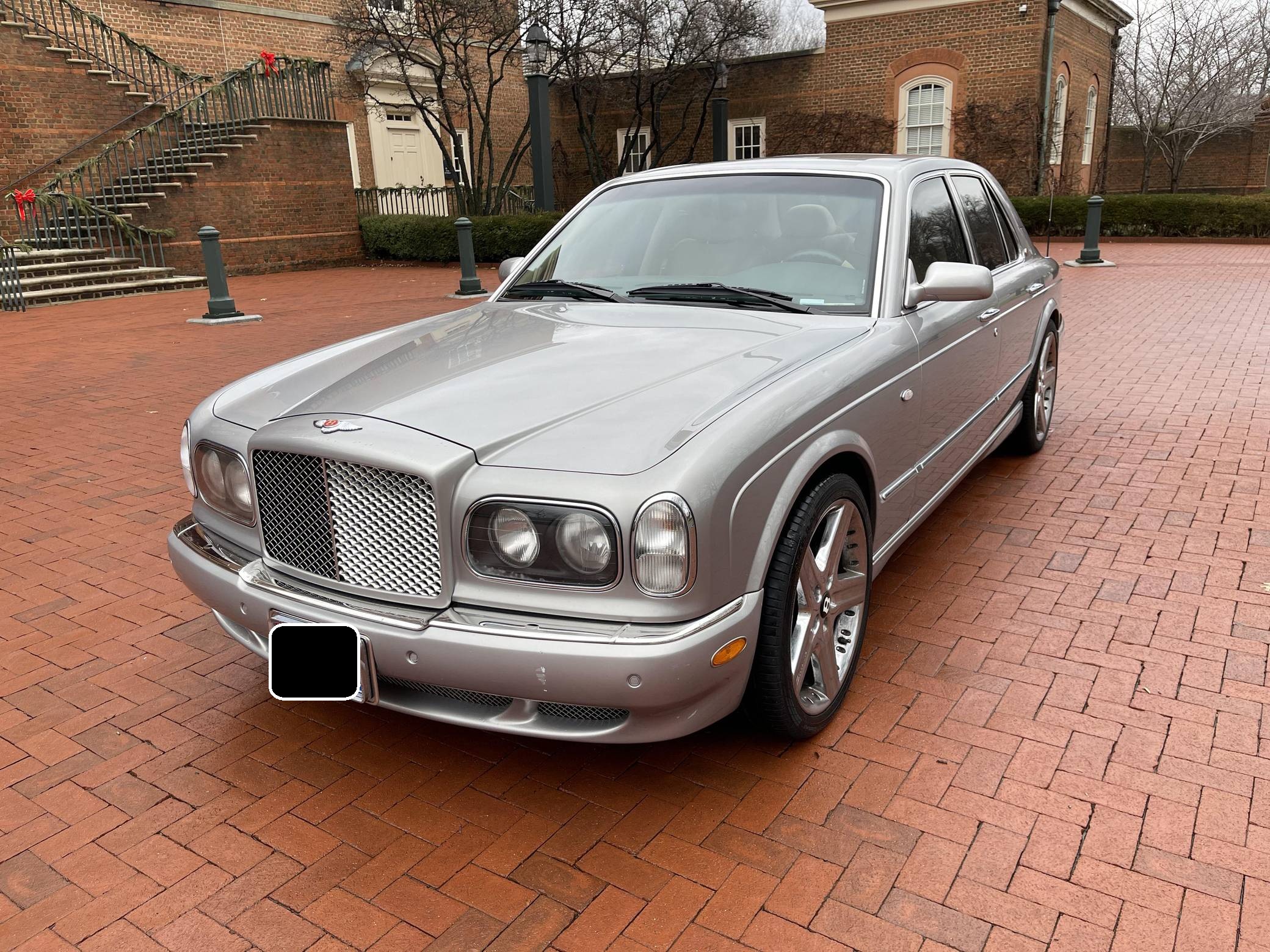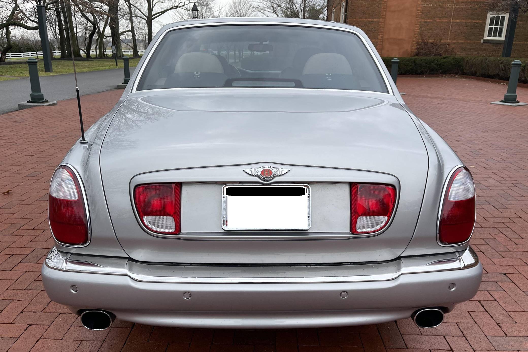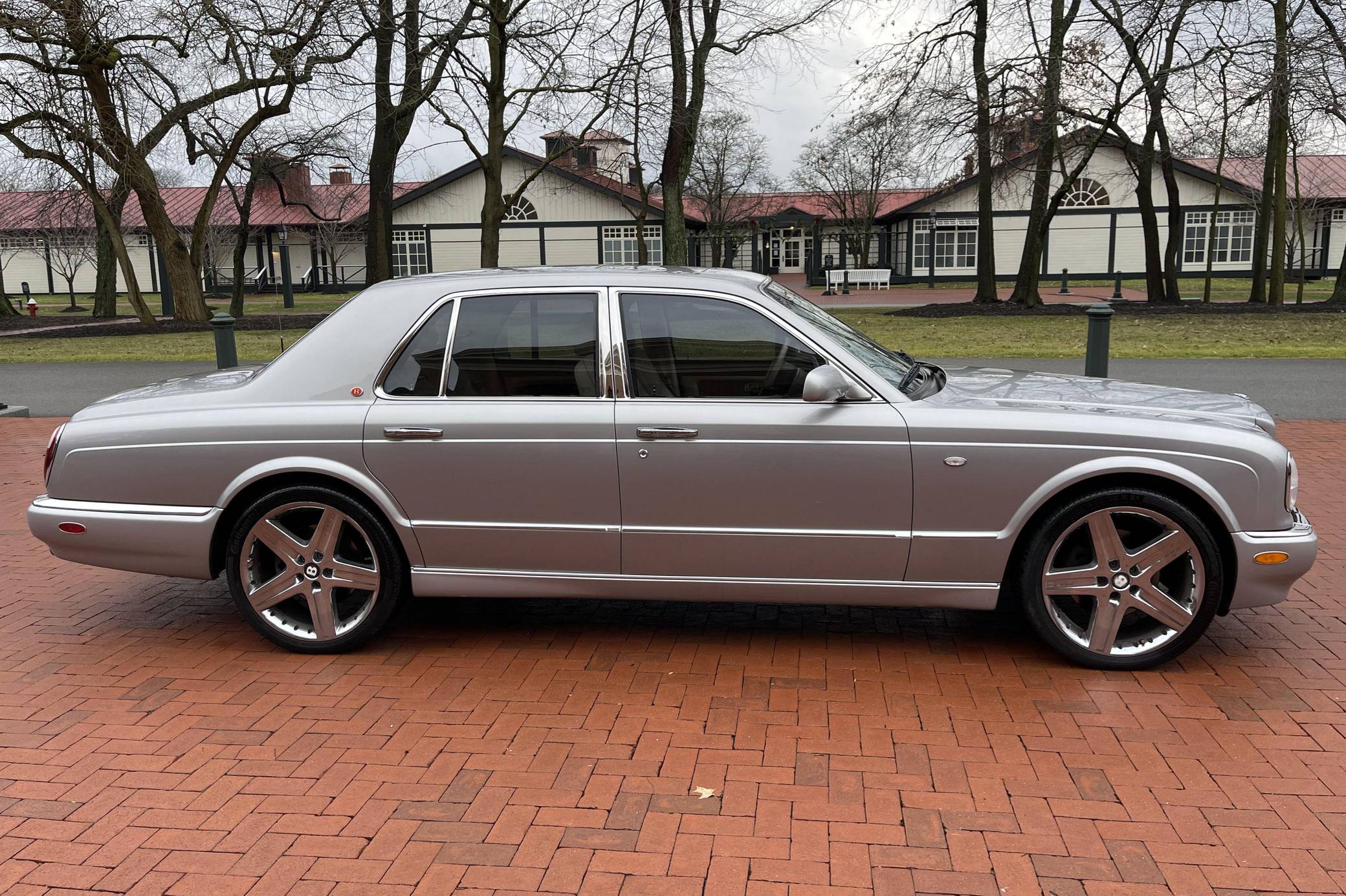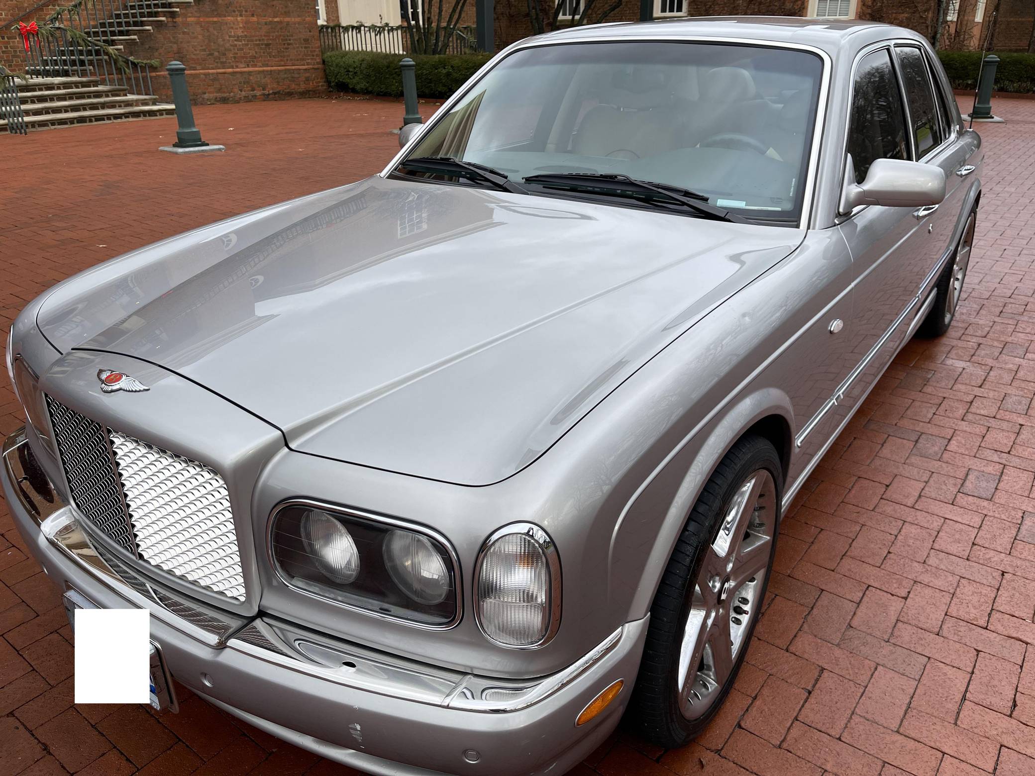 2000 Bentley Arnage, finished in silver with a tan interior. The odometer on this Bentley currently displays approximately 33,900 miles. Factory equipment includes a power sunroof, leather upholstery with contrast piping, wood interior trim, heated front seats, rear picnic tables, three-zone climate control, and more as detailed below. Modifications are limited to a set of 21-inch Giovanna chrome wheels. Closely related to the Rolls-Royce Silver Seraph, the Arnage arrived as Bentley's range-topping sedan for the 1999 model year. In the 2000s, the range included the comfort-oriented Arnage R, the long-wheelbase Arnage RL, and the sporty Arnage T. The Red Label references the use of red badging to distinguish sporty models from their standard brethren. If the badges don't give away the sporting nature of this Bentley, the additional 50 hp and 206 lb-ft over the regular Arnage surely will. Power for this Arnage comes from a turbocharged 6. 75-liter V8, rated at 400 horsepower and 619 lb-ft of torque. It spins the rear wheels via a 4-speed automatic transmission.