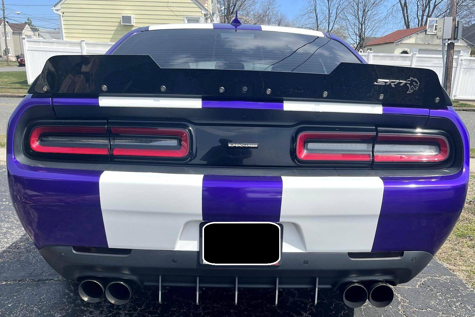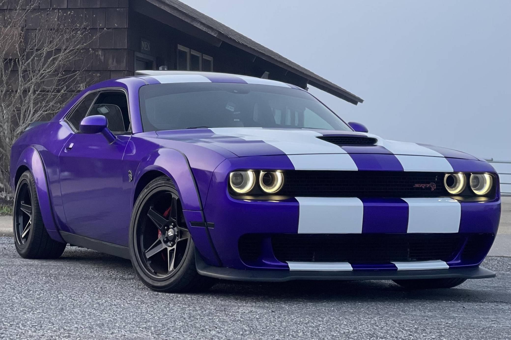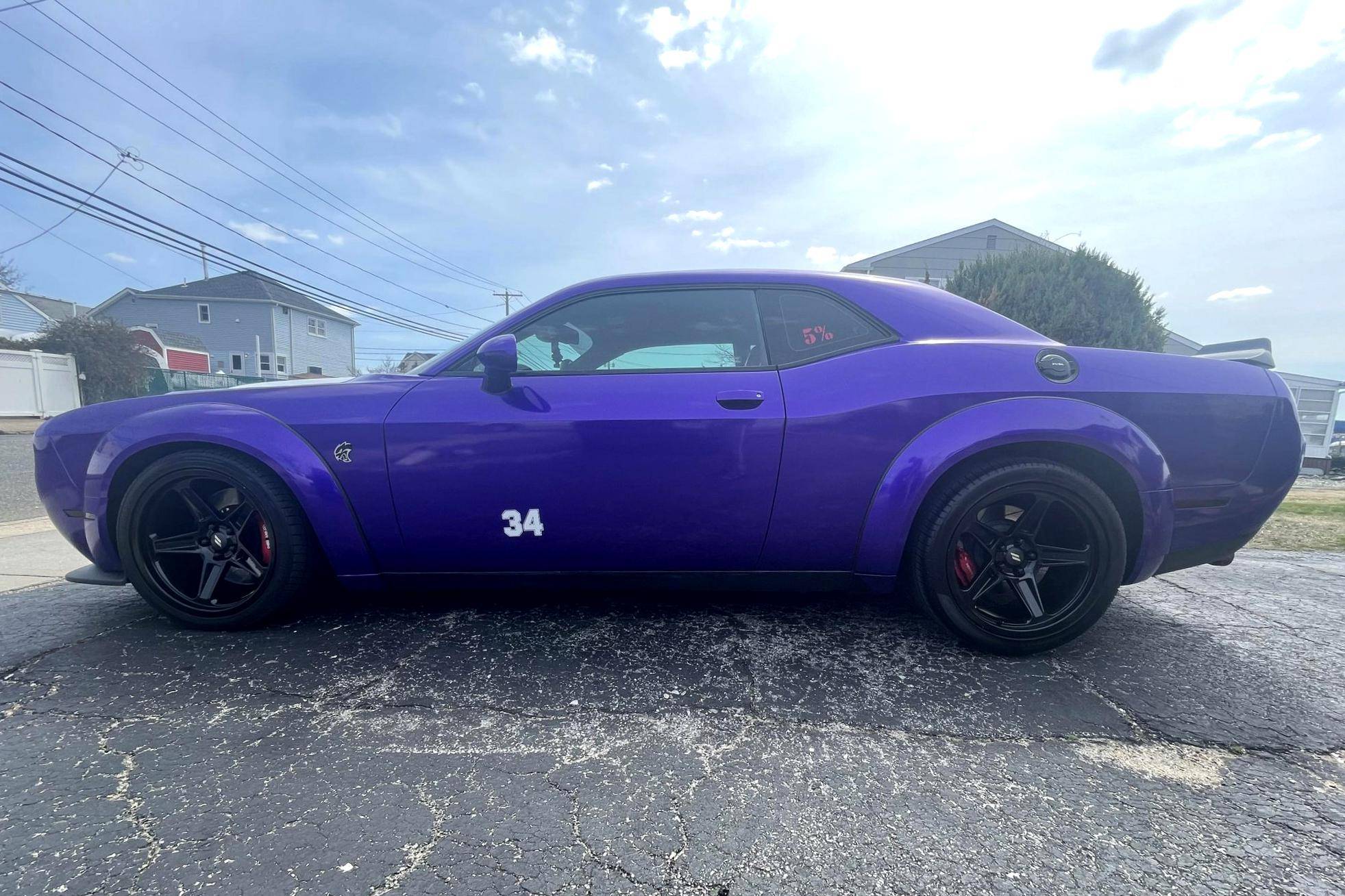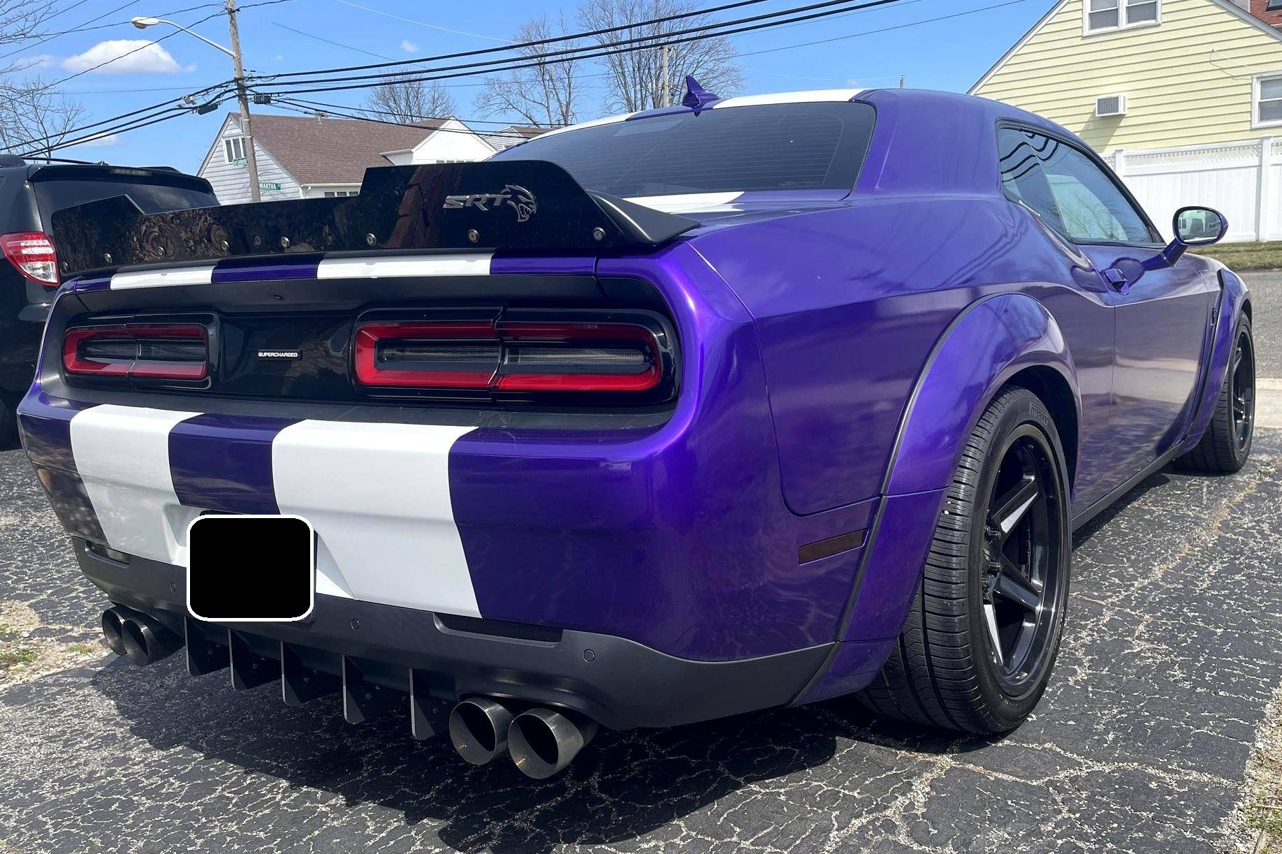 2016 Dodge Challenger SRT Hellcat, finished in Granite Crystal with a purple and white exterior wrap and a black and ruby red interior. Equipped with the SRT Hellcat Package 26R, a limited-slip differential, Bilsten 3-mode Competitive Suspension with adaptive damping, Brembo 6-piston brakes, Laguna/Alcantara upholstery, heated and ventilated front seats, a heated steering wheel, a power sunroof, an 18-speaker premium audio system, and more as detailed below. A partial list of modifications reported by the seller includes a custom exterior wrap, Eibach Pro-Kit lowering springs, wide-body fender flares, 4-inch quad exhaust tips, and a BWoody air intake. Released for the 2015 model year, the SRT Hellcat variant of the Dodge Challenger is an extremely powerful muscle car. Its stunning 707 horsepower output significantly upped the ante in the American muscle car horsepower wars. As a result, performance figures are pegged at a 0-to-60 mph time of 3. 6 seconds and an official top speed of 199 mph. Power comes from a 6. 2-liter supercharged "Hemi" V8, rated at 707 horsepower and 650 lb-ft of torque in stock form. This engine may be making slightly more power due to the modifications, though a dyno sheet was not provided to confirm. Output is sent to the rear wheels through an 8-speed automatic transmission.