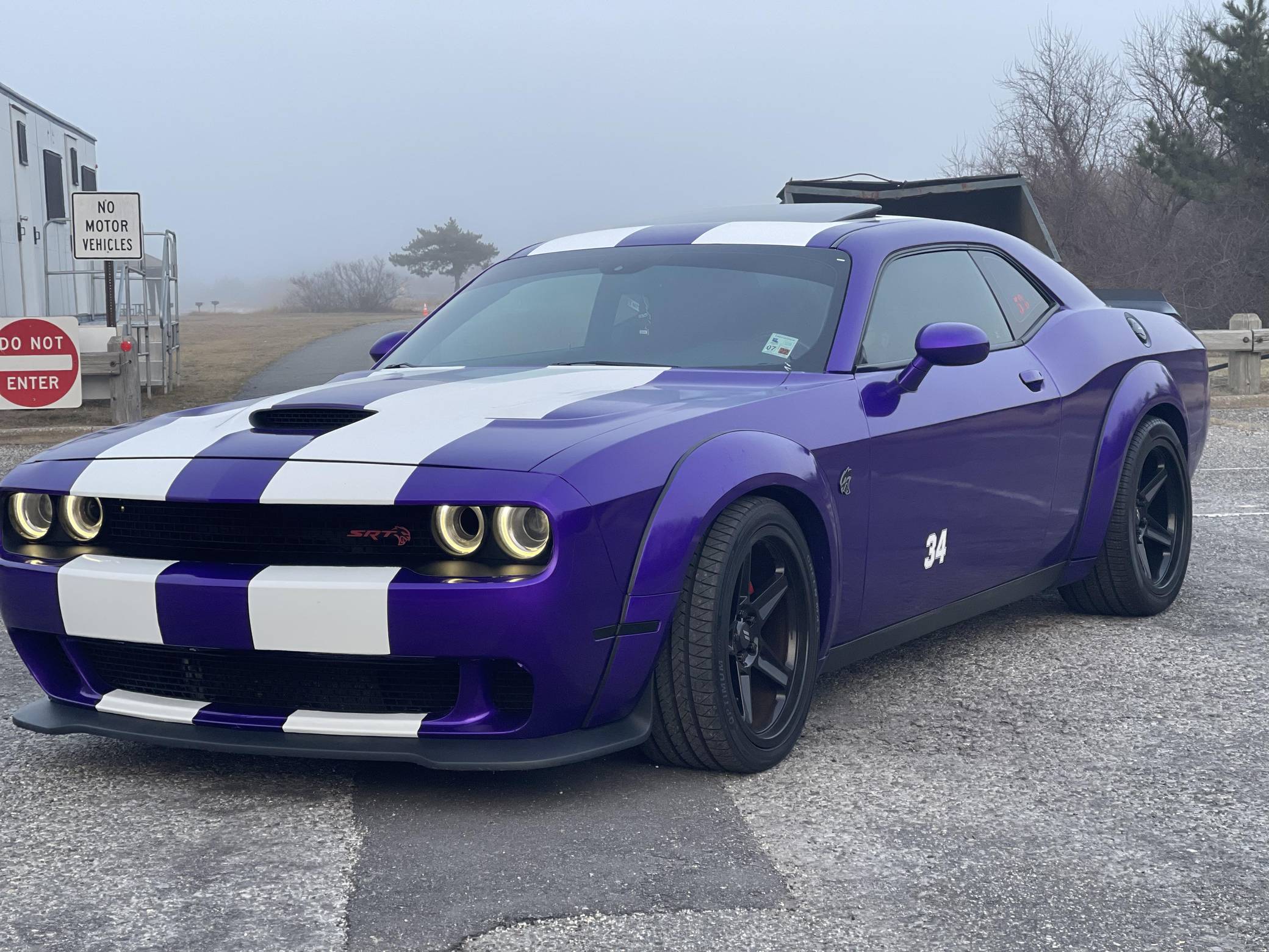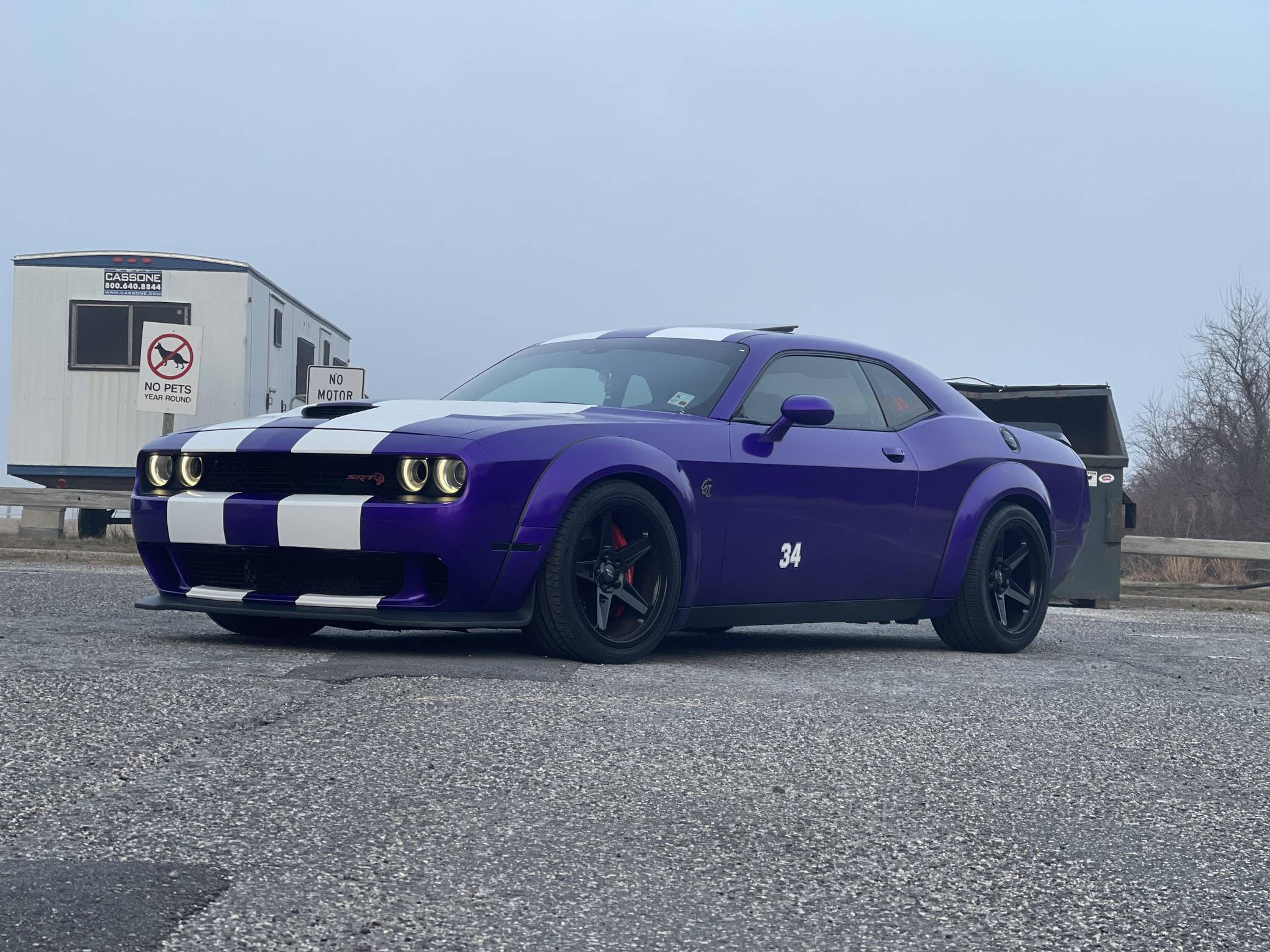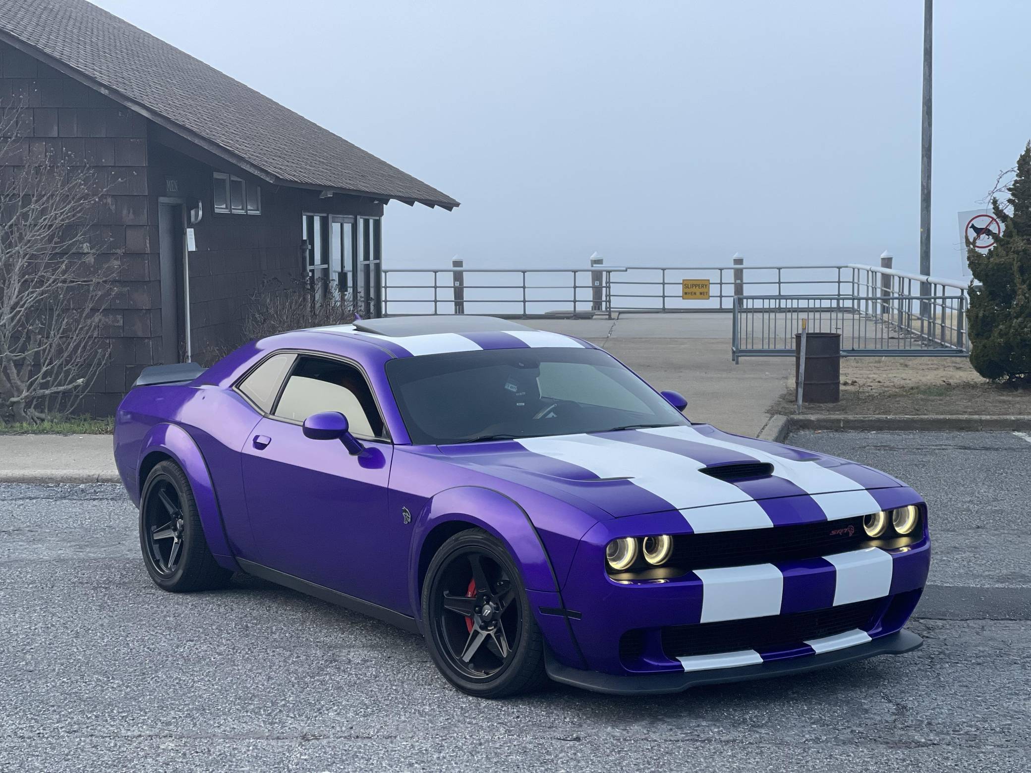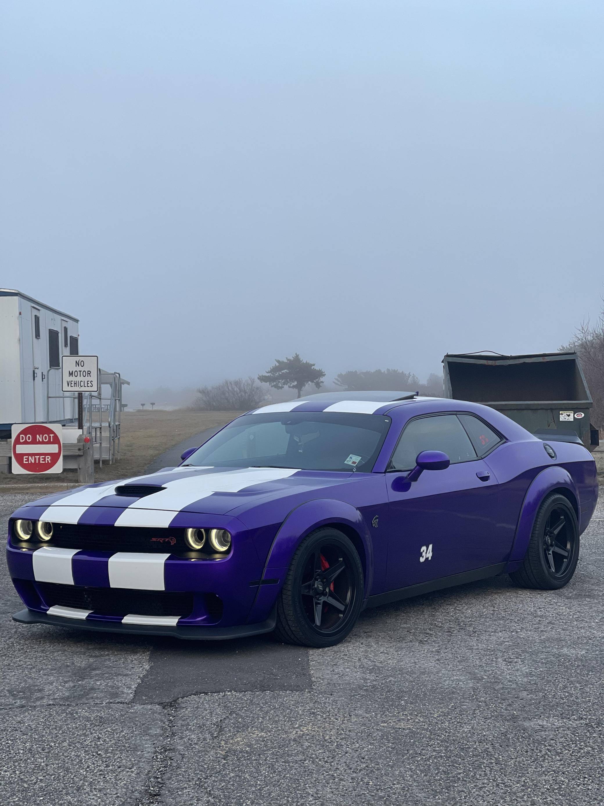2016 Dodge Challenger SRT Hellcat, finished in Granite Crystal with a purple and white exterior wrap and a black and ruby red interior. Equipped with the SRT Hellcat Package 26R, a limited-slip differential, Bilsten 3-mode Competitive Suspension with adaptive damping, Brembo 6-piston brakes, Laguna/Alcantara upholstery, heated and ventilated front seats, a heated steering wheel, a power sunroof, an 18-speaker premium audio system, and more as detailed below. A partial list of modifications reported by the seller includes a custom exterior wrap, Eibach Pro-Kit lowering springs, wide-body fender flares, 4-inch quad exhaust tips, and a BWoody air intake. Released for the 2015 model year, the SRT Hellcat variant of the Dodge Challenger is an extremely powerful muscle car. Its stunning 707 horsepower output significantly upped the ante in the American muscle car horsepower wars. As a result, performance figures are pegged at a 0-to-60 mph time of 3. 6 seconds and an official top speed of 199 mph. Power comes from a 6. 2-liter supercharged "Hemi" V8, rated at 707 horsepower and 650 lb-ft of torque in stock form. This engine may be making slightly more power due to the modifications, though a dyno sheet was not provided to confirm. Output is sent to the rear wheels through an 8-speed automatic transmission.
