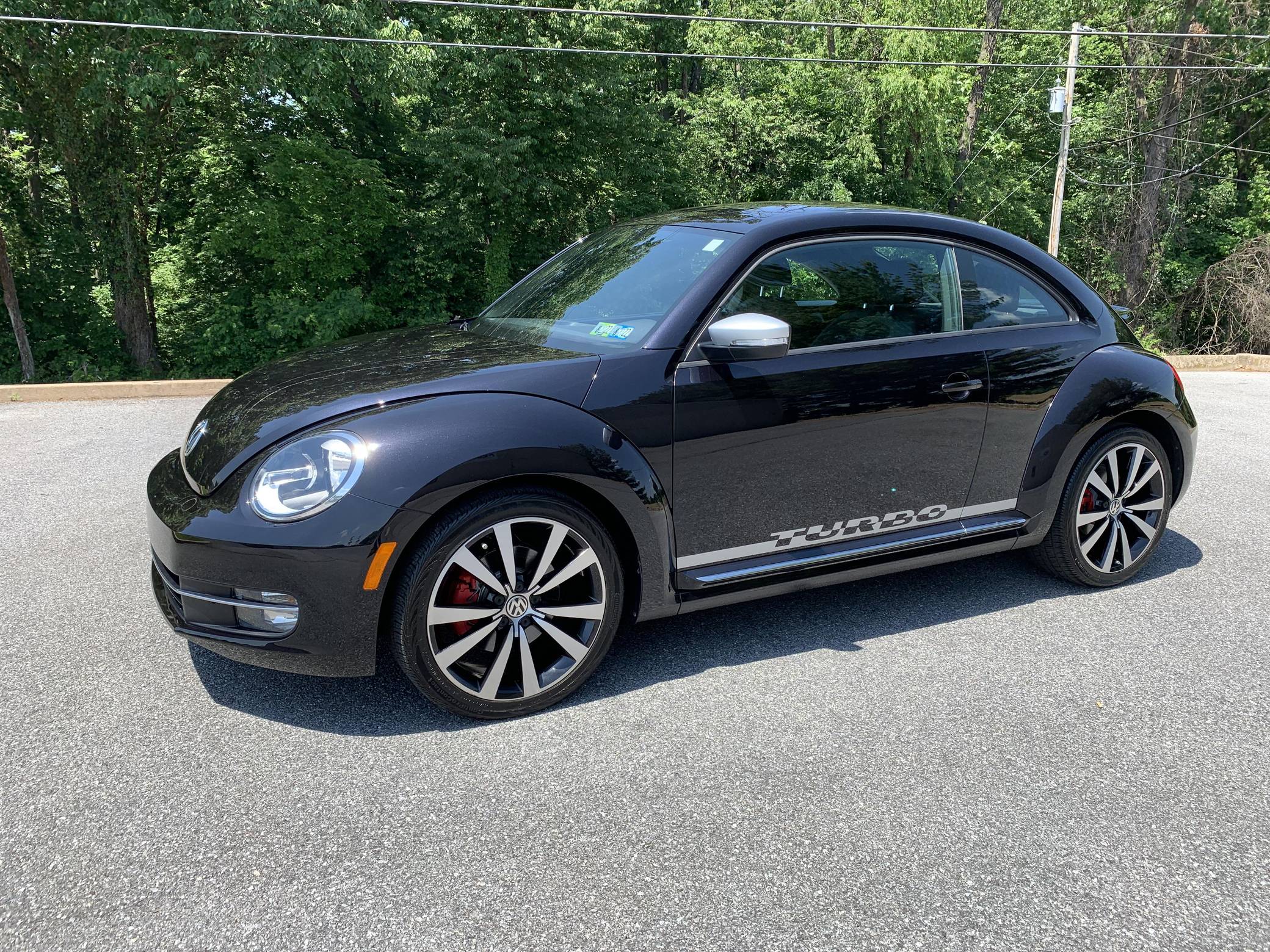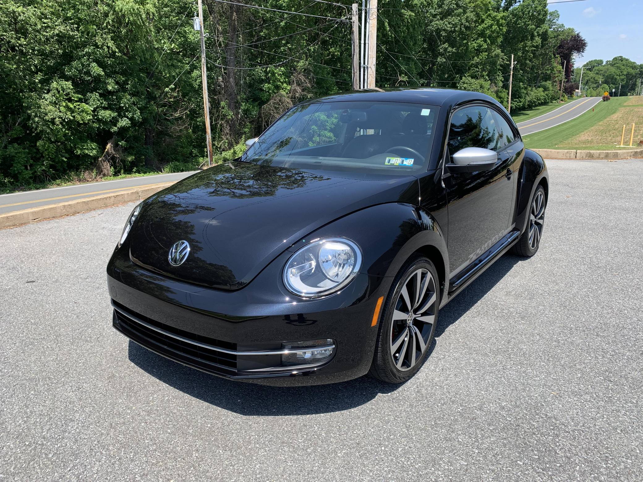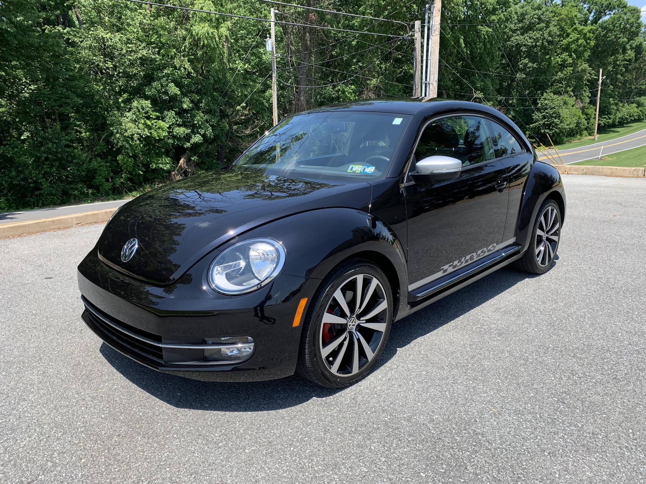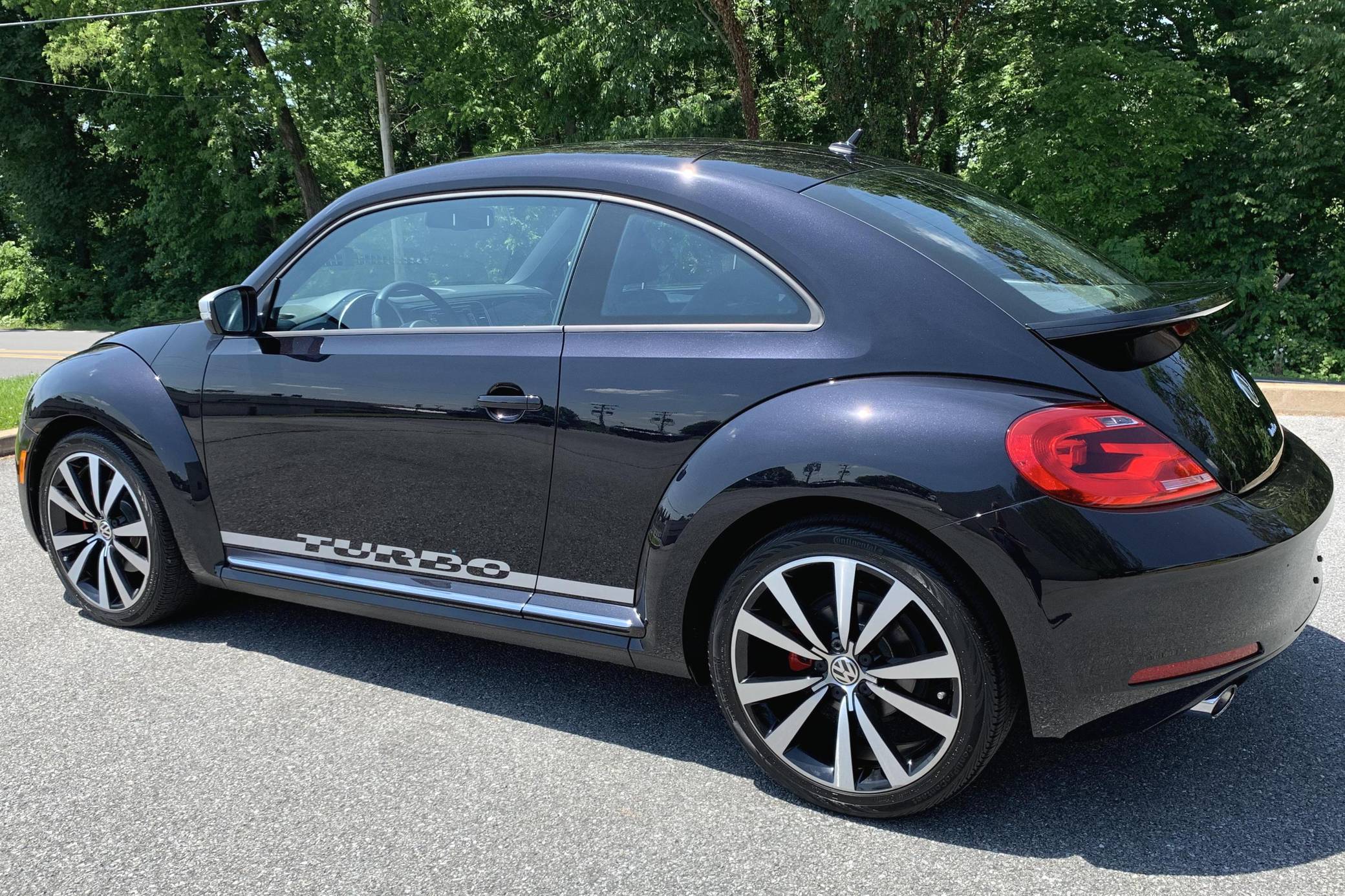 2012 Volkswagen Beetle Turbo Launch Edition, finished in Deep Black Pearl Metallic with a Titan Black interior. The odometer on this Beetle currently displays approximately 13,600 miles. It came equipped with Black Launch Edition upgrades (Deep Black Pearl Metallic exterior paint, Candy White door mirrors, Turbo side graphics, red brake calipers, front fog lights, rear spoiler, sport cloth front seats, color-matched interior trim), 19-inch alloy wheels, independent front and rear suspension, a leather-wrapped tilt and telescoping steering wheel, alloy pedals, heated front seats, a dealer-installed Volkswagen RNS 510 head unit with a navigation system, and an 8-speaker sound system. The seller reports no modifications. Volkswagen's Beetle was launched on the "A5" platform for the 2012 model year as a direct replacement for the New Beetle, itself a modern re-envisioning of Volkswagen's iconic Type 1 Beetle. The A5 Beetle gained a lower and more aggressive profile while retaining the New Beetle's retro styling cues, efficient front-wheel-drive platform shared with the Golf, and variety of gas and diesel engines. The Beetle spawned numerous special editions until production ended in 2019, the first of which was the Launch Edition. Limited to just 600 units of each color, the Launch Edition included a turbocharged engine, Deep Black or Candy White paint, a subtle rear spoiler, an upgraded interior, and more. Power comes from a 2. 0-liter turbocharged inline-4, rated at 200 horsepower and 207 lb-ft of torque. Output is sent to the front wheels via a 6-speed automatic "DSG" transmission.