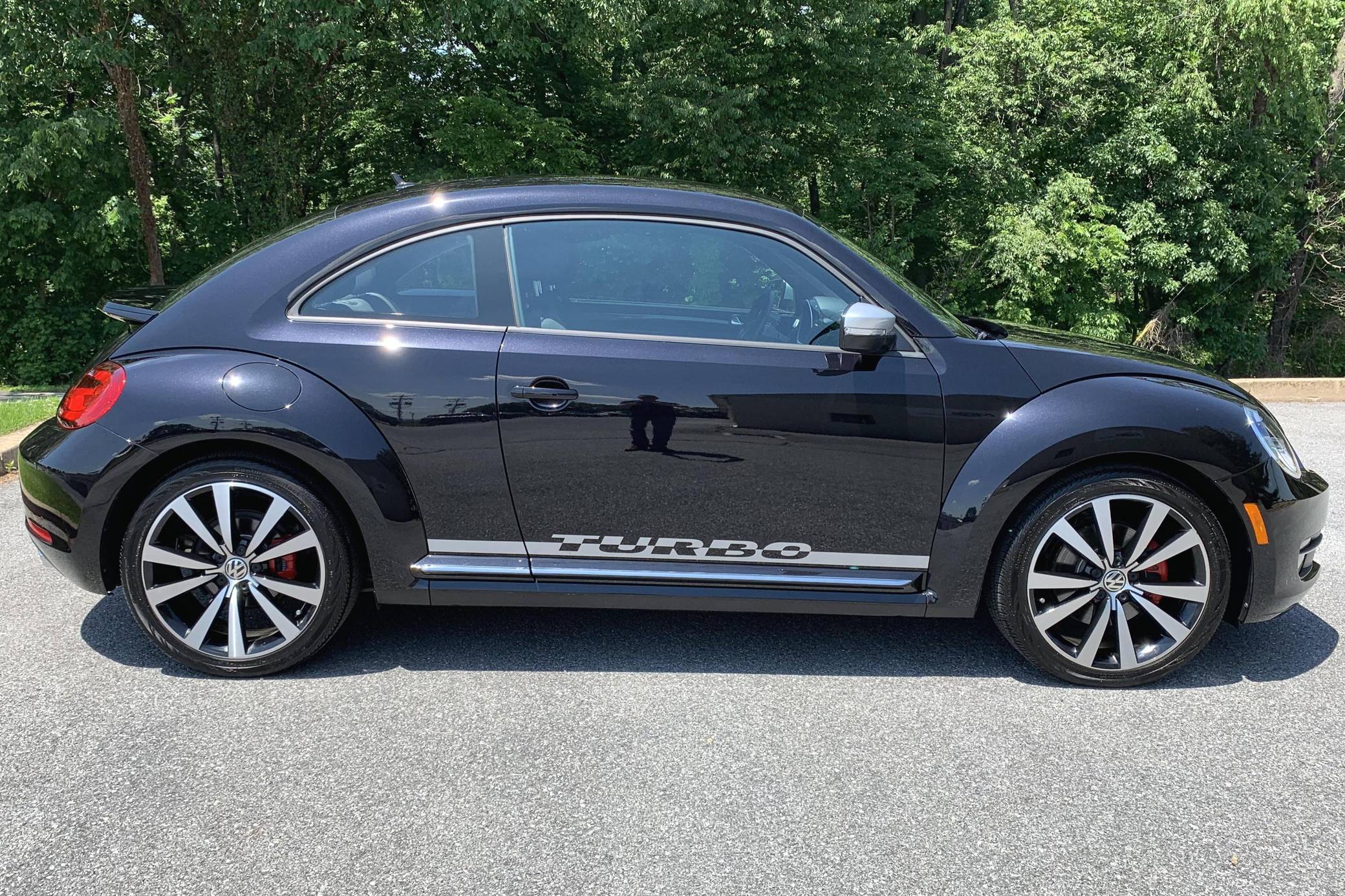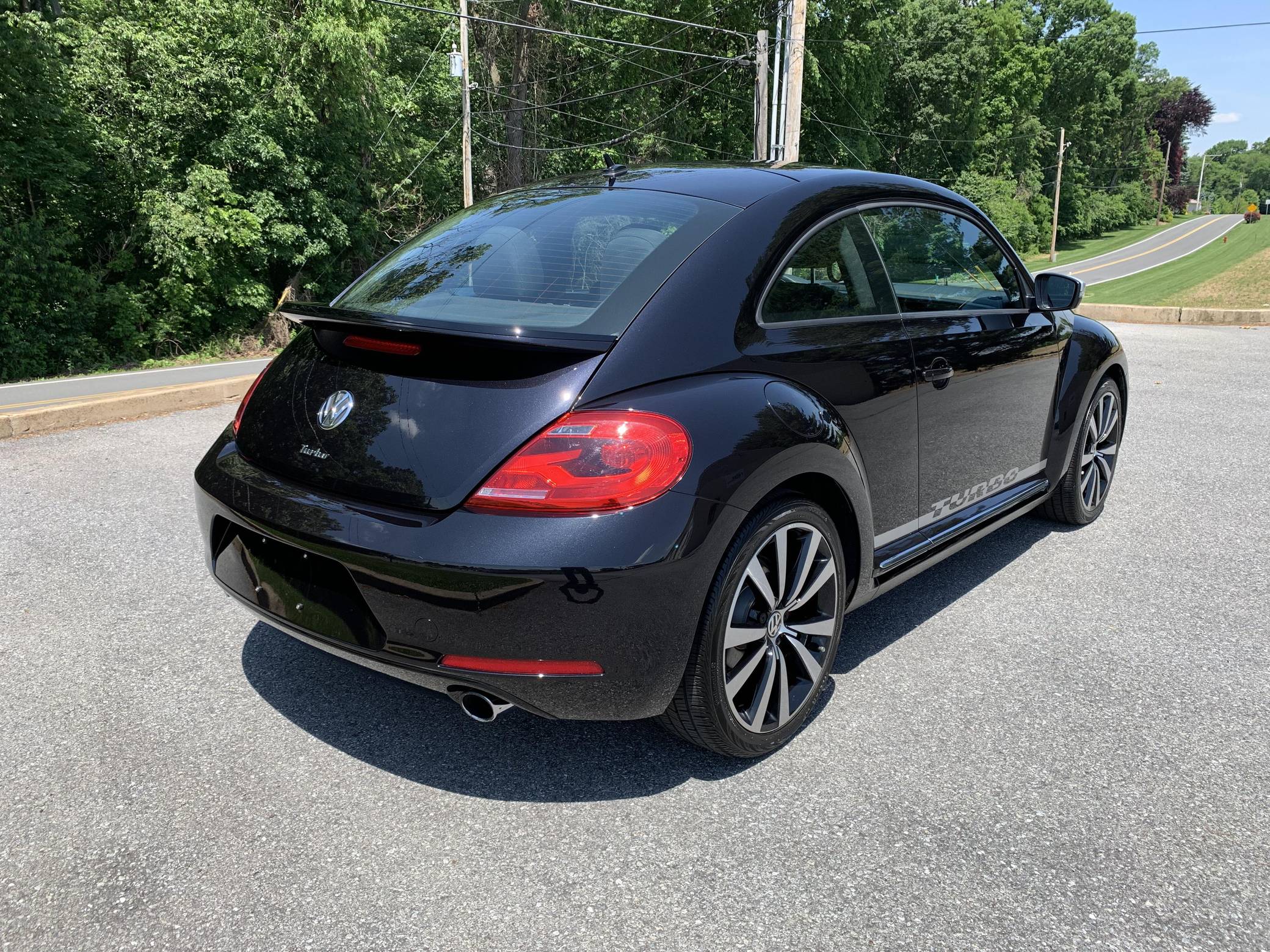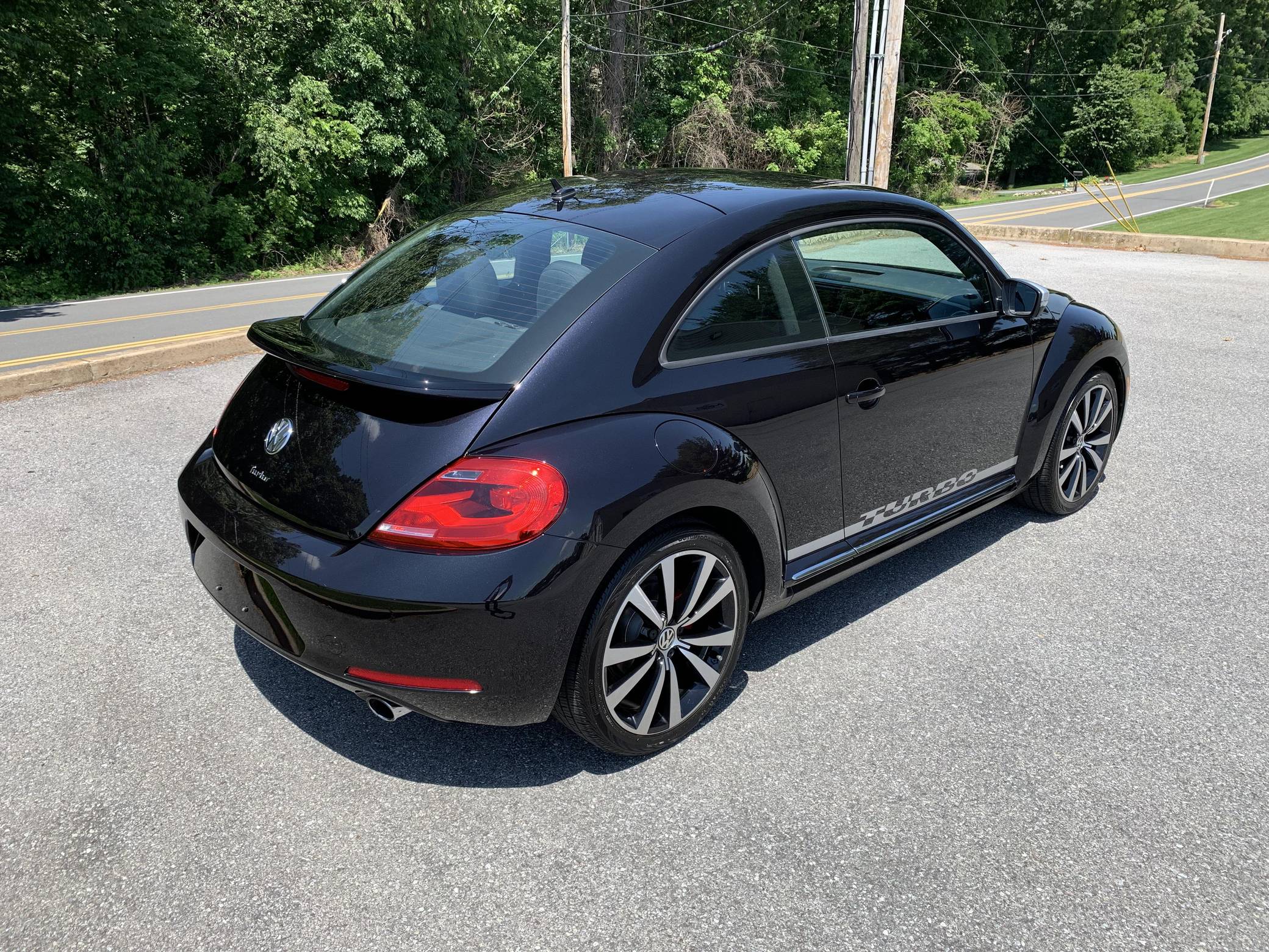 2012 Volkswagen Beetle Turbo Launch Edition, finished in Deep Black Pearl Metallic with a Titan Black interior. The odometer on this Beetle currently displays approximately 13,600 miles. It came equipped with Black Launch Edition upgrades (Deep Black Pearl Metallic exterior paint, Candy White door mirrors, Turbo side graphics, red brake calipers, front fog lights, rear spoiler, sport cloth front seats, color-matched interior trim), 19-inch alloy wheels, independent front and rear suspension, a leather-wrapped tilt and telescoping steering wheel, alloy pedals, heated front seats, a dealer-installed Volkswagen RNS 510 head unit with a navigation system, and an 8-speaker sound system. The seller reports no modifications. Volkswagen's Beetle was launched on the "A5" platform for the 2012 model year as a direct replacement for the New Beetle, itself a modern re-envisioning of Volkswagen's iconic Type 1 Beetle. The A5 Beetle gained a lower and more aggressive profile while retaining the New Beetle's retro styling cues, efficient front-wheel-drive platform shared with the Golf, and variety of gas and diesel engines. The Beetle spawned numerous special editions until production ended in 2019, the first of which was the Launch Edition. Limited to just 600 units of each color, the Launch Edition included a turbocharged engine, Deep Black or Candy White paint, a subtle rear spoiler, an upgraded interior, and more. Power comes from a 2. 0-liter turbocharged inline-4, rated at 200 horsepower and 207 lb-ft of torque. Output is sent to the front wheels via a 6-speed automatic "DSG" transmission.