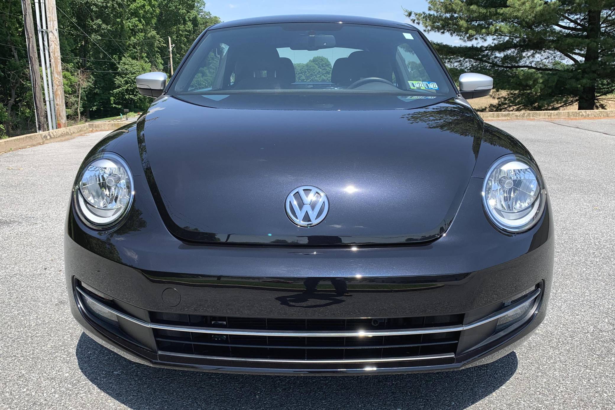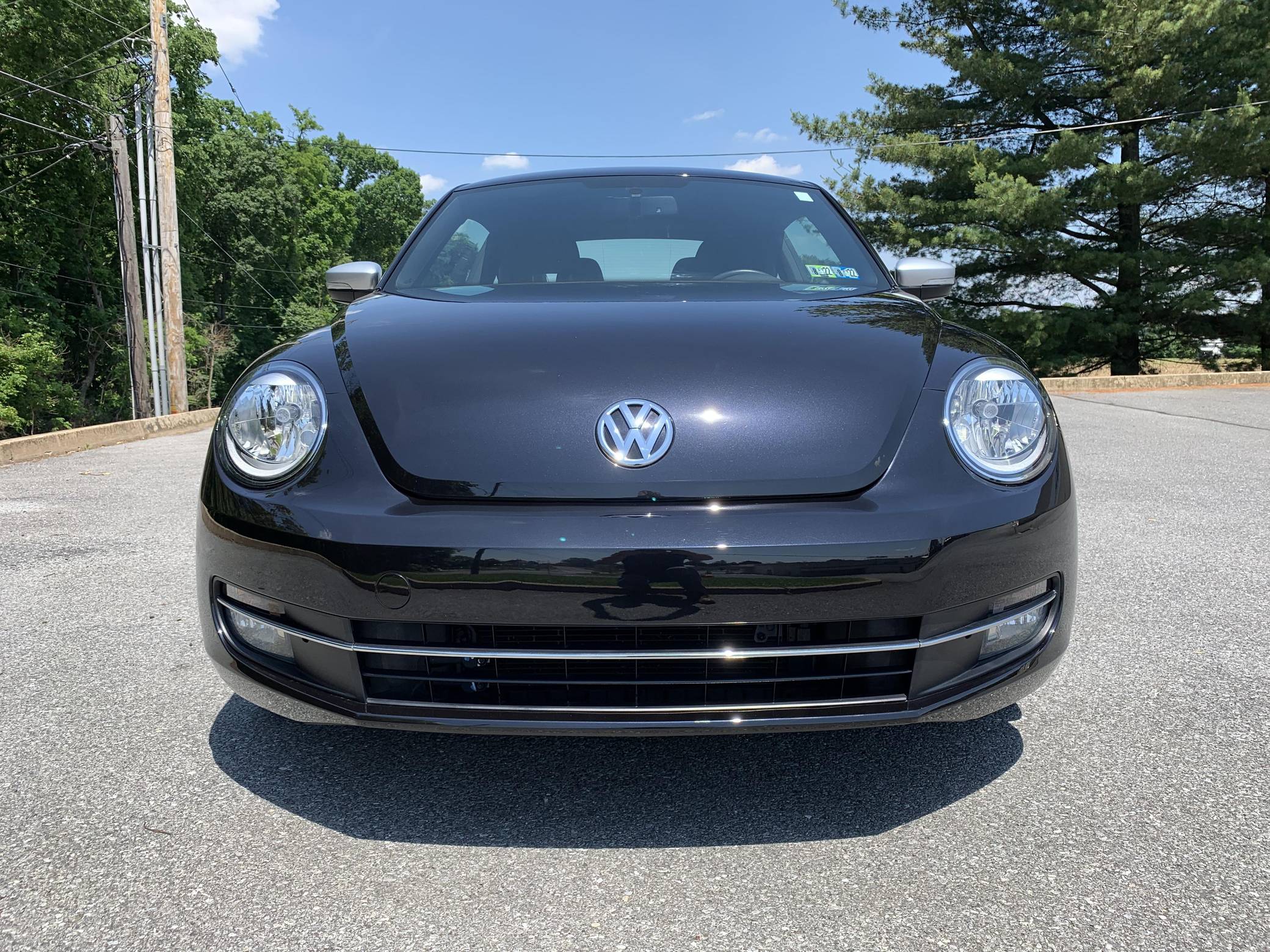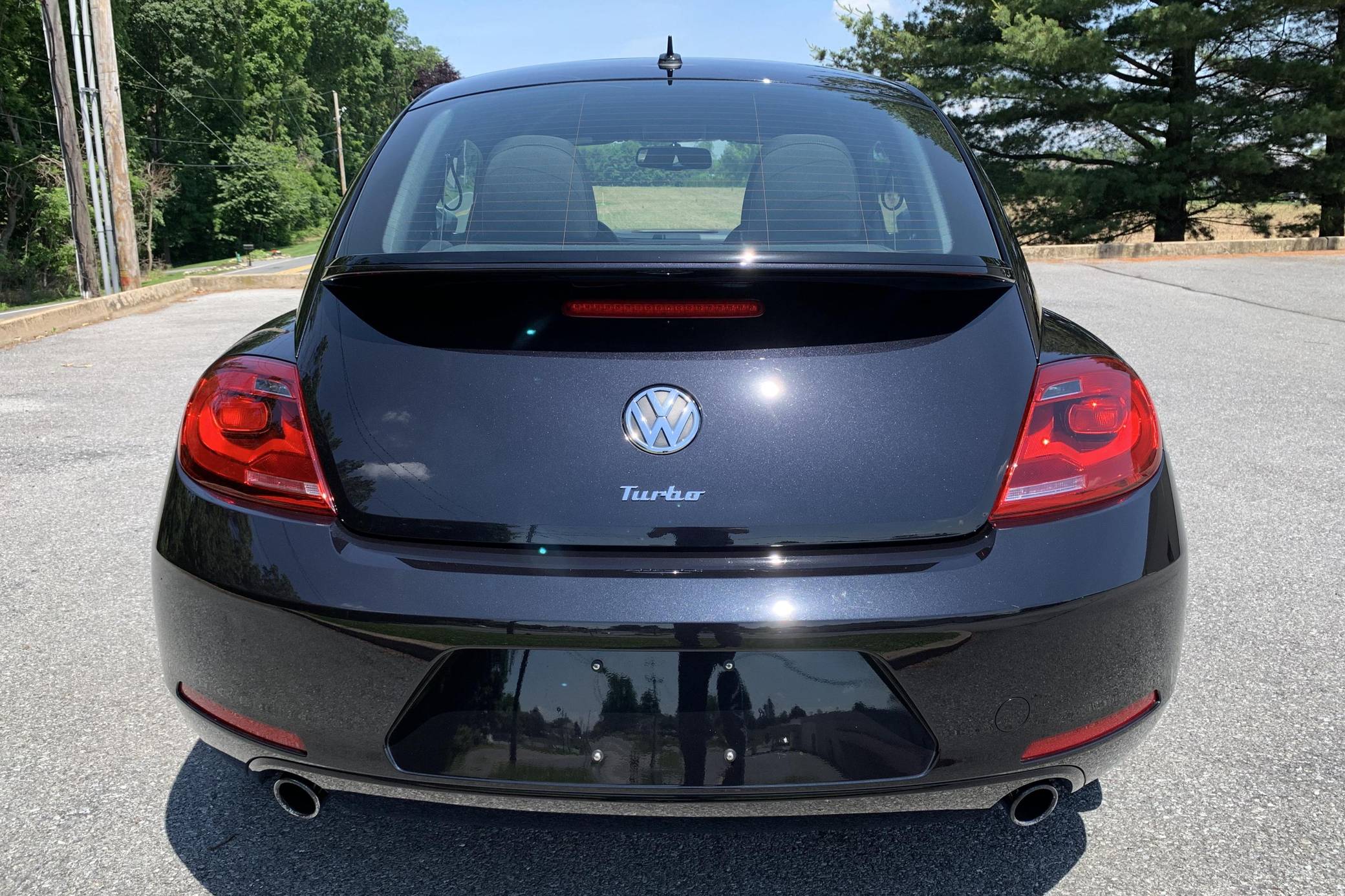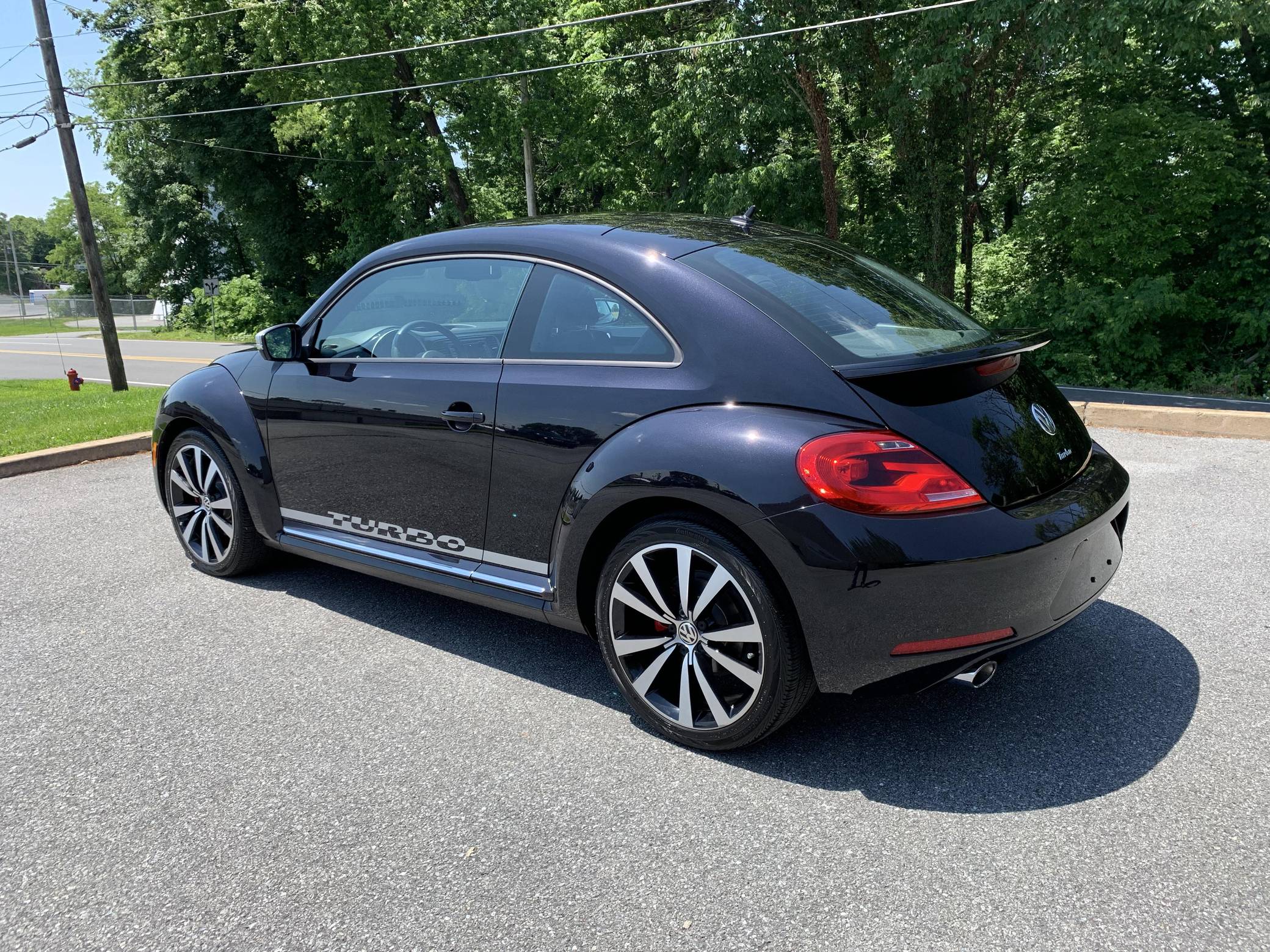 2012 Volkswagen Beetle Turbo Launch Edition, finished in Deep Black Pearl Metallic with a Titan Black interior. The odometer on this Beetle currently displays approximately 13,600 miles. It came equipped with Black Launch Edition upgrades (Deep Black Pearl Metallic exterior paint, Candy White door mirrors, Turbo side graphics, red brake calipers, front fog lights, rear spoiler, sport cloth front seats, color-matched interior trim), 19-inch alloy wheels, independent front and rear suspension, a leather-wrapped tilt and telescoping steering wheel, alloy pedals, heated front seats, a dealer-installed Volkswagen RNS 510 head unit with a navigation system, and an 8-speaker sound system. The seller reports no modifications. Volkswagen's Beetle was launched on the "A5" platform for the 2012 model year as a direct replacement for the New Beetle, itself a modern re-envisioning of Volkswagen's iconic Type 1 Beetle. The A5 Beetle gained a lower and more aggressive profile while retaining the New Beetle's retro styling cues, efficient front-wheel-drive platform shared with the Golf, and variety of gas and diesel engines. The Beetle spawned numerous special editions until production ended in 2019, the first of which was the Launch Edition. Limited to just 600 units of each color, the Launch Edition included a turbocharged engine, Deep Black or Candy White paint, a subtle rear spoiler, an upgraded interior, and more. Power comes from a 2. 0-liter turbocharged inline-4, rated at 200 horsepower and 207 lb-ft of torque. Output is sent to the front wheels via a 6-speed automatic "DSG" transmission.