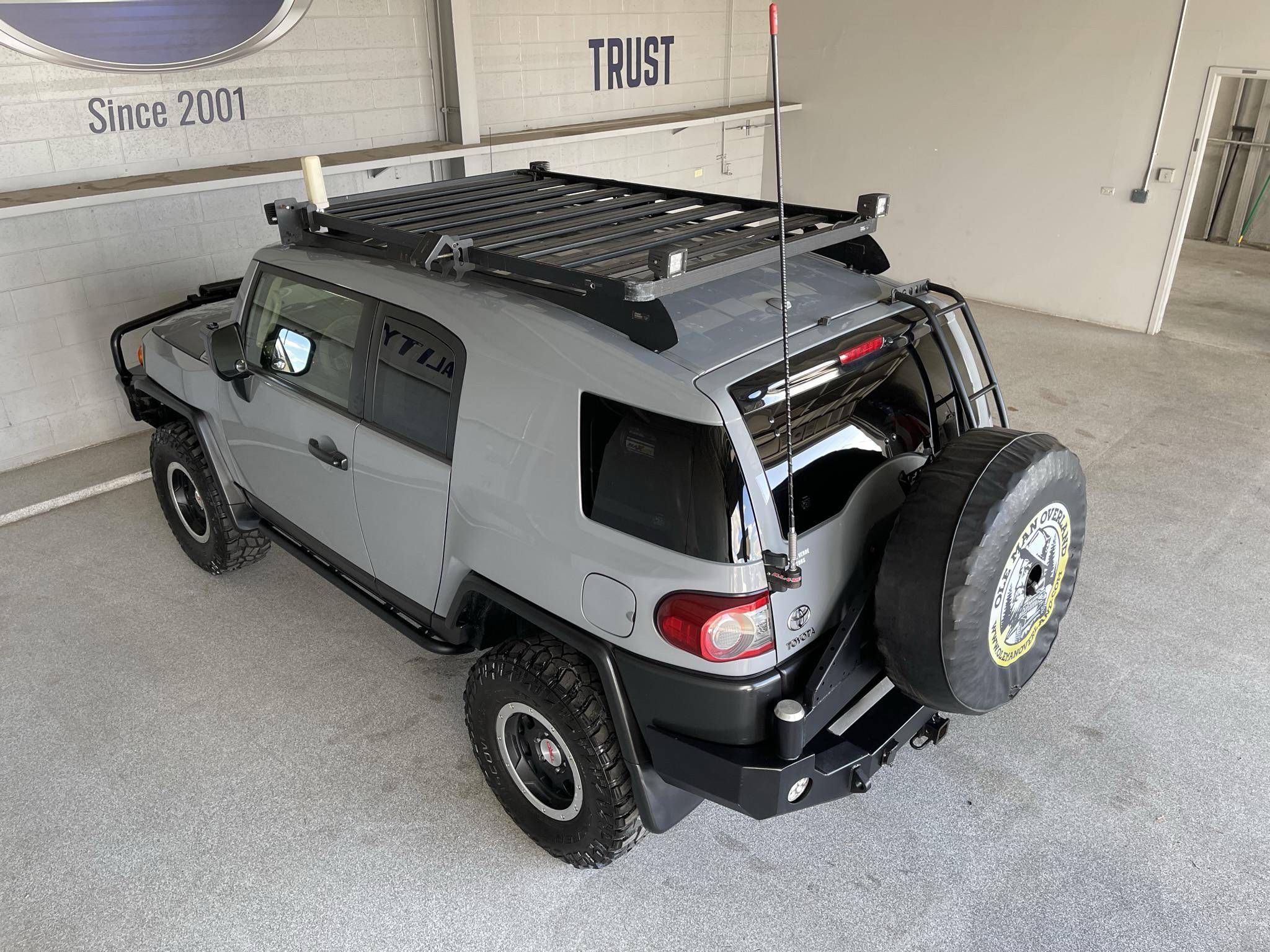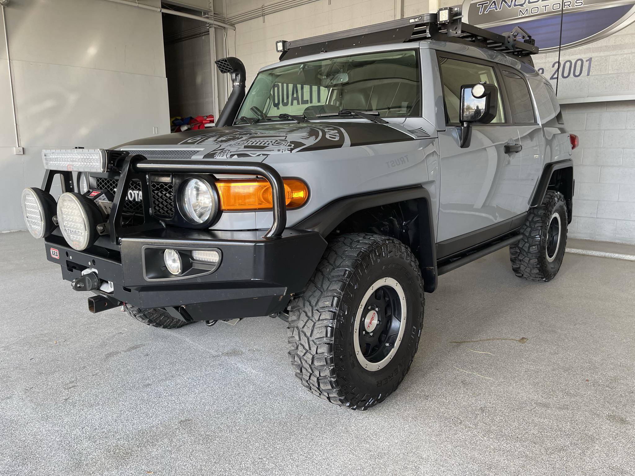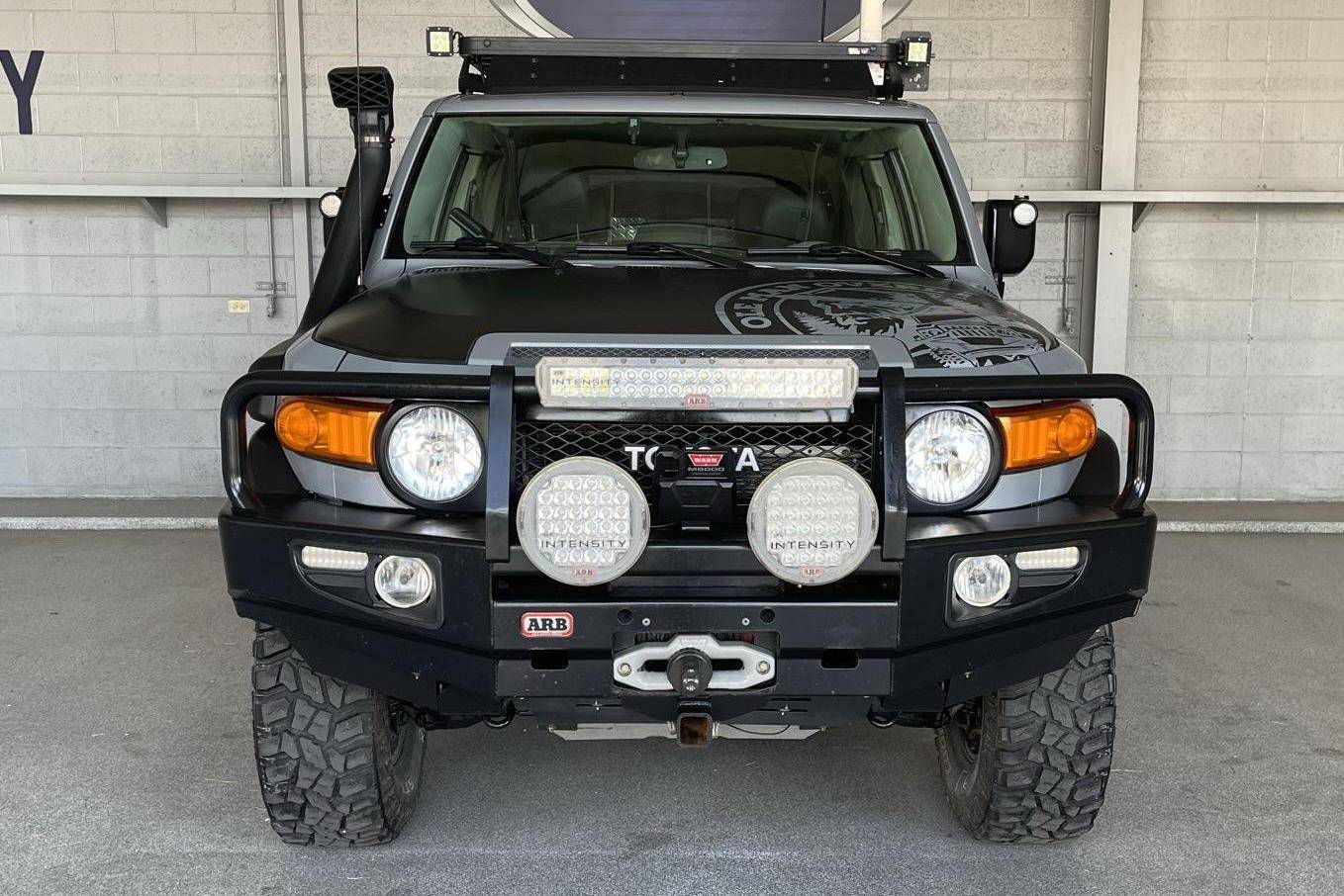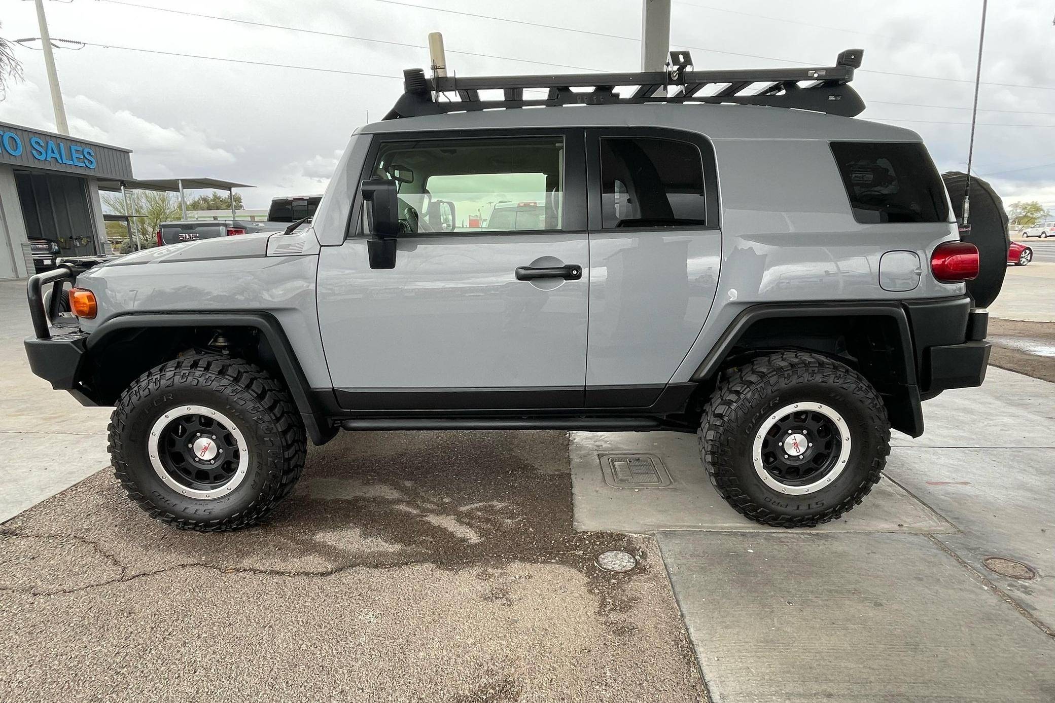 THIS. . . is a 2013 Toyota FJ Cruiser Trail Teams Special Edition, finished in Cement Gray with a black interior. Equipment includes the Trail Team package (A-TRAC traction control, rock rails, blackout body trim, and color-matched fabric seat inserts), a locking rear differential, rear-hinged rear doors, water-resistant upholstery, power windows, locks, and mirrors, a dash-mounted inclinometer, compass, and thermometer, stability control, and more as detailed below. A partial list of modifications reported by the seller includes a set of 16-inch TRD alloy wheels, Old Man Emu BP51 shocks, an Air Lift suspension system, ARB skid plates, an ARB front winch bumper, an ARB Safari snorkel, Expedition One rear bumper, an Overland solar charge controller, a WeBoost Drive 4G-X cell phone signal booster, and a Cobra remote start system. The FJ Cruiser was the modern throwback to Toyota roots with the FJ40 Land Cruisers. This FJ Cruiser was assembled in Japan as a body-on-frame truck-style design. It shares many structural underpinnings with the Toyota Land Cruiser Prado, and FJ Cruiser production ended for the North American market in 2014. Power comes from the "1GR-FE" 4. 0-liter V6, which produces 260 horsepower and 271 lb-ft of torque. The engine is mated to a 5-speed automatic transmission and a 4-wheel-drive system with a 2-speed transfer case.