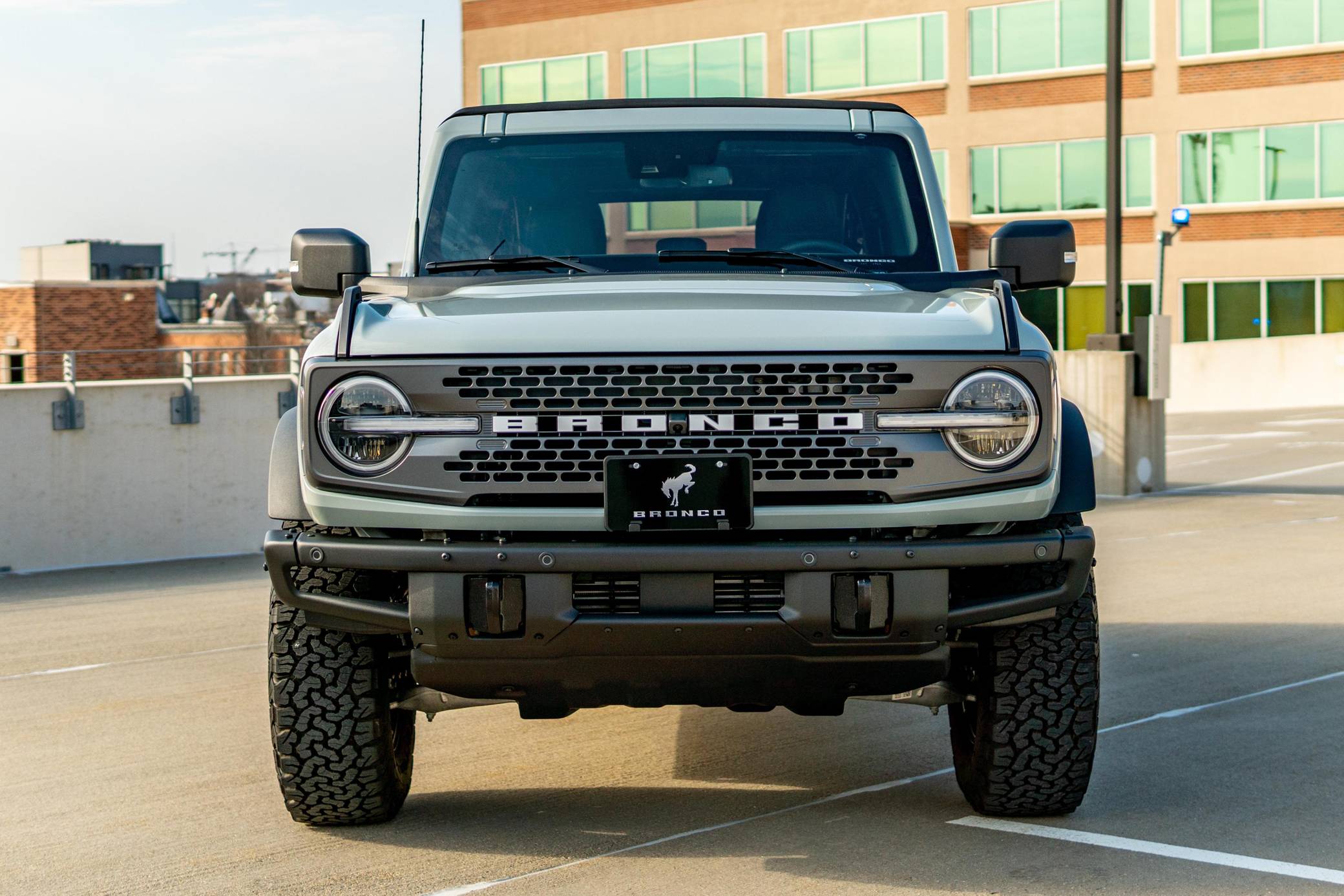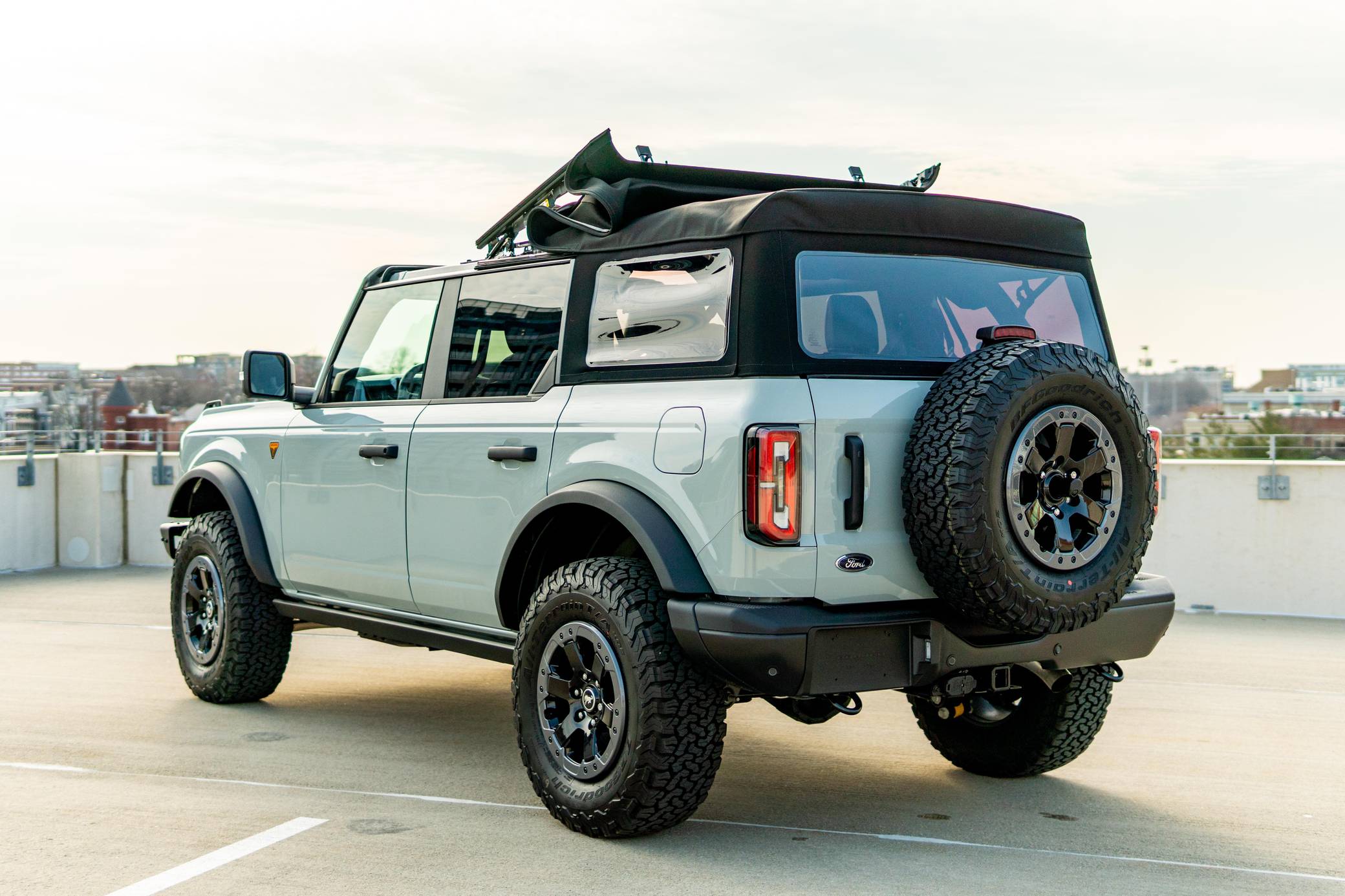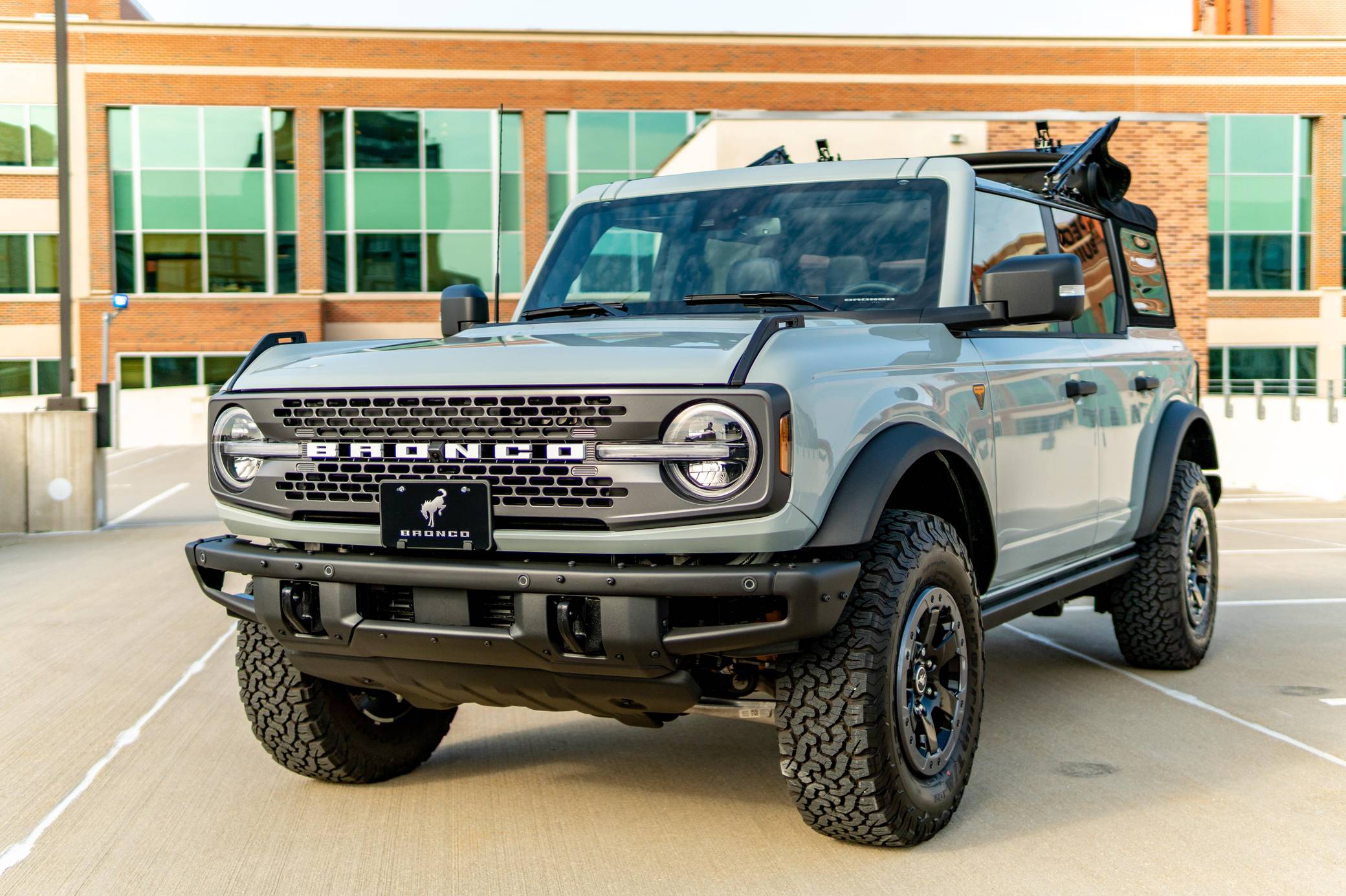 THIS. . . is a 2021 Ford Bronco Badlands, finished in Cactus Gray with a black soft top and a Black Onyx interior. The odometer in this Bronco indicates about 400 miles. It's equipped with the High, Mid, and Lux packages, skid plates, rock rails, LED headlights, fender-mounted tie-down hooks, a removable soft top, and 17-inch aluminum Beadlock wheels. The seller reports no modifications. The sixth-generation Bronco was introduced for the 2021 model year, ending a 25-year hiatus and nearly a decade of speculation about its return. Retro styling, body-on-frame construction, and a suite of off-road equipment help ensure this truck lives up to the Bronco name. It's not all old-school, however: available modern features like a 12-inch touchscreen, the Ford Co-Pilot360 safety tech suite, and a wireless phone charger bring it into the 21st century. Power comes from a 2. 7-liter twin-turbocharged "EcoBoost" V6 engine, rated at 310 horsepower and 400 lb-ft of torque. Output is sent to all four wheels via a 10-speed automatic transmission.