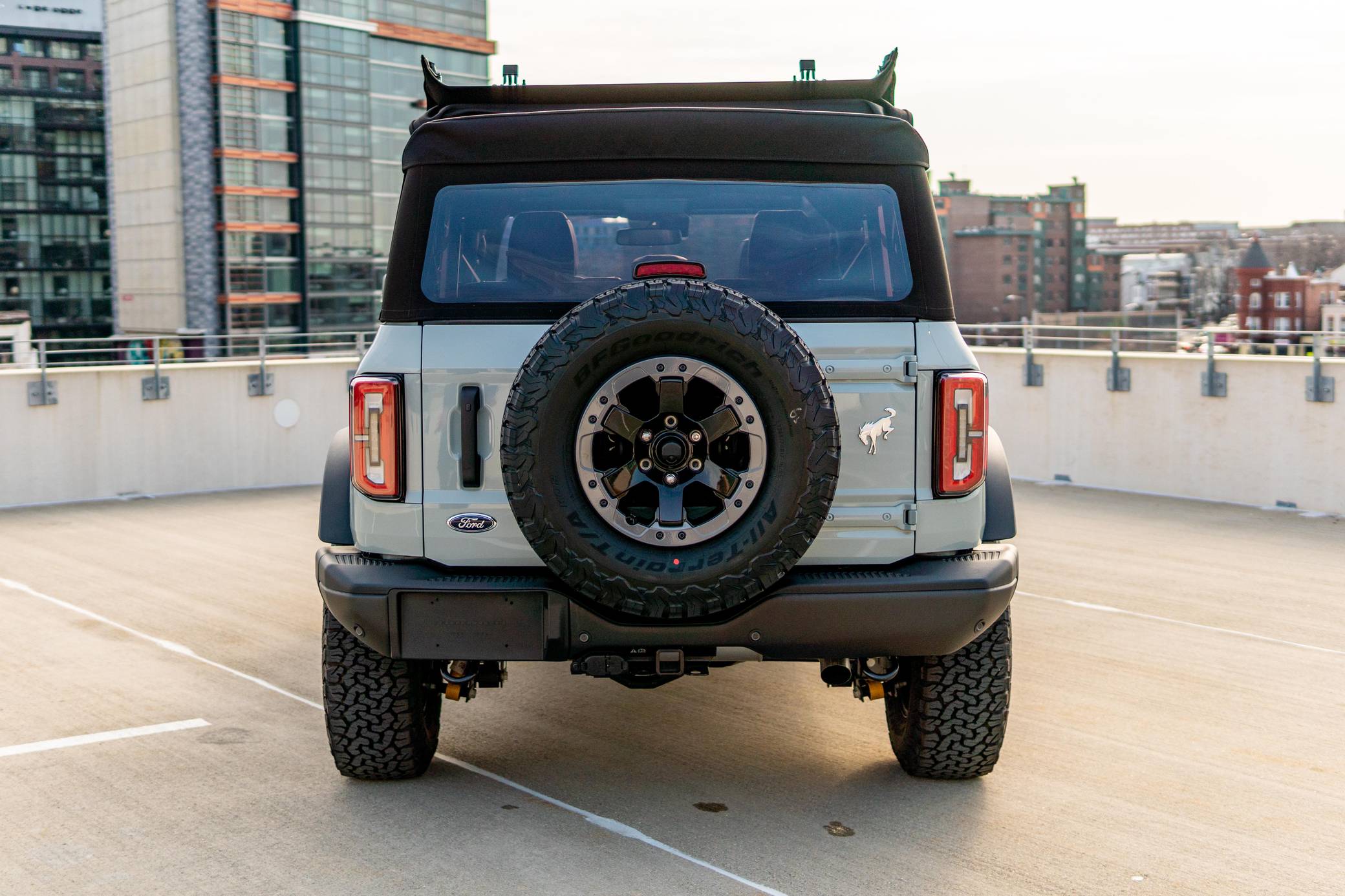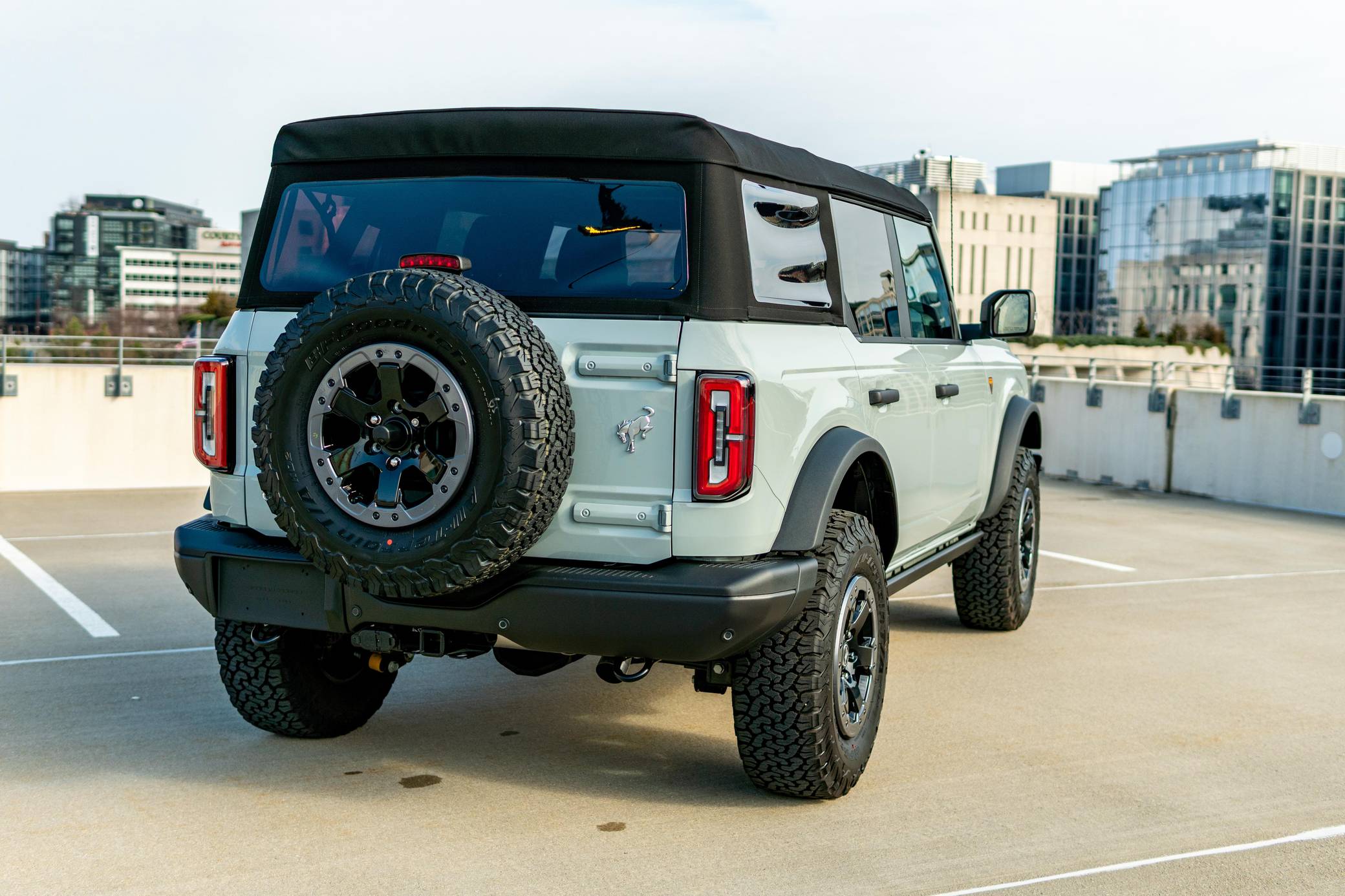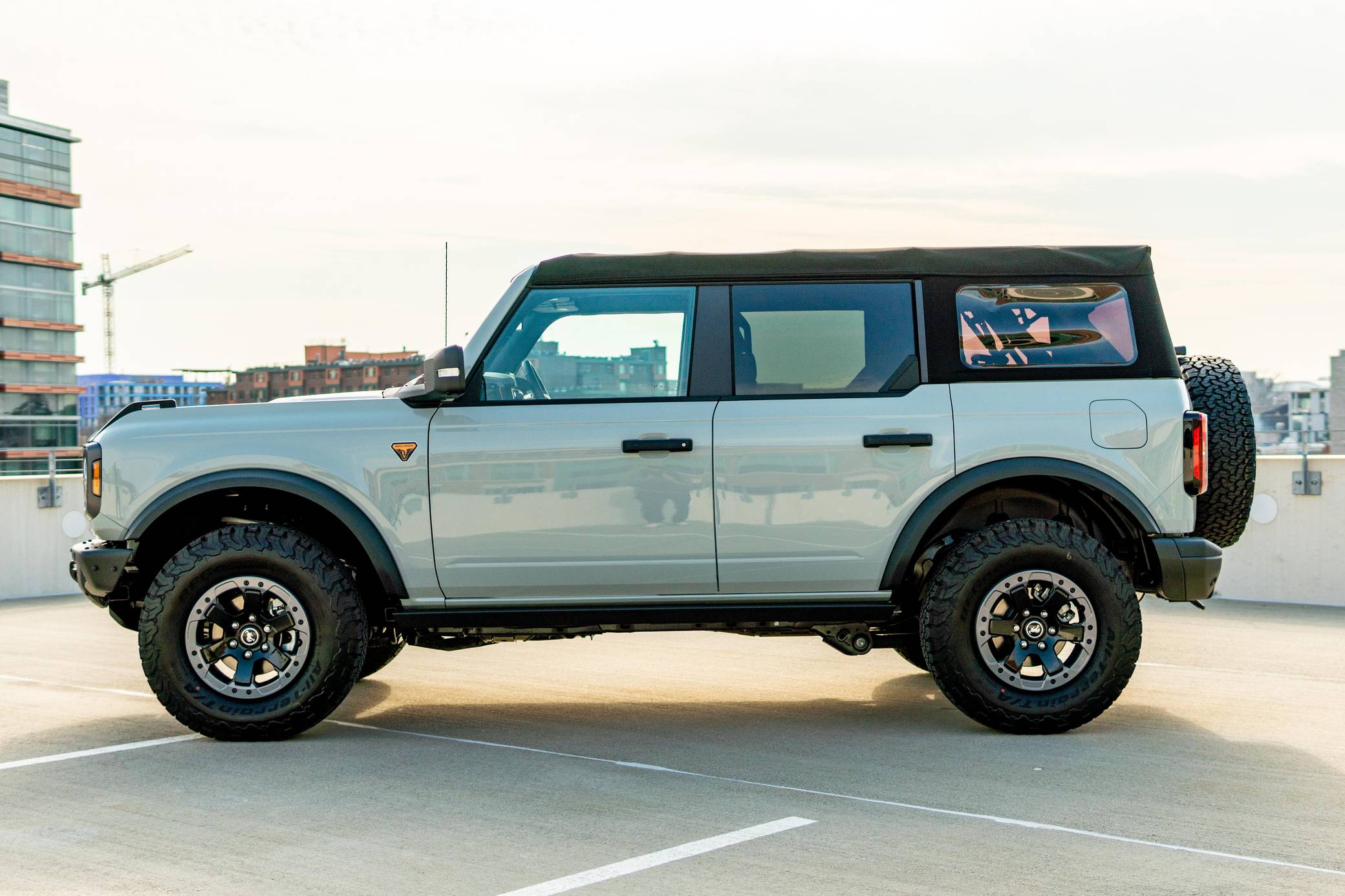 THIS. . . is a 2021 Ford Bronco Badlands, finished in Cactus Gray with a black soft top and a Black Onyx interior. The odometer in this Bronco indicates about 400 miles. It's equipped with the High, Mid, and Lux packages, skid plates, rock rails, LED headlights, fender-mounted tie-down hooks, a removable soft top, and 17-inch aluminum Beadlock wheels. The seller reports no modifications. The sixth-generation Bronco was introduced for the 2021 model year, ending a 25-year hiatus and nearly a decade of speculation about its return. Retro styling, body-on-frame construction, and a suite of off-road equipment help ensure this truck lives up to the Bronco name. It's not all old-school, however: available modern features like a 12-inch touchscreen, the Ford Co-Pilot360 safety tech suite, and a wireless phone charger bring it into the 21st century. Power comes from a 2. 7-liter twin-turbocharged "EcoBoost" V6 engine, rated at 310 horsepower and 400 lb-ft of torque. Output is sent to all four wheels via a 10-speed automatic transmission.