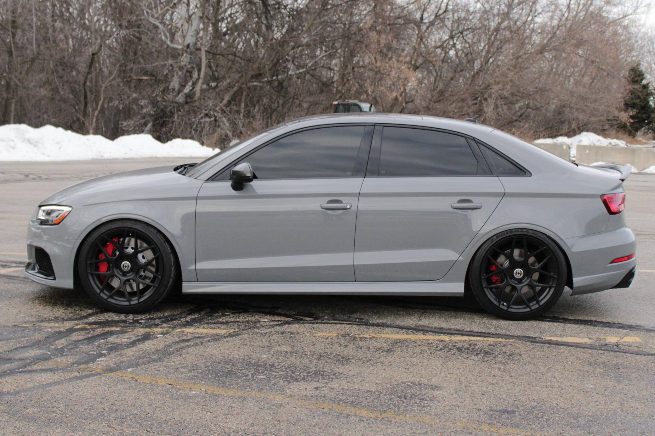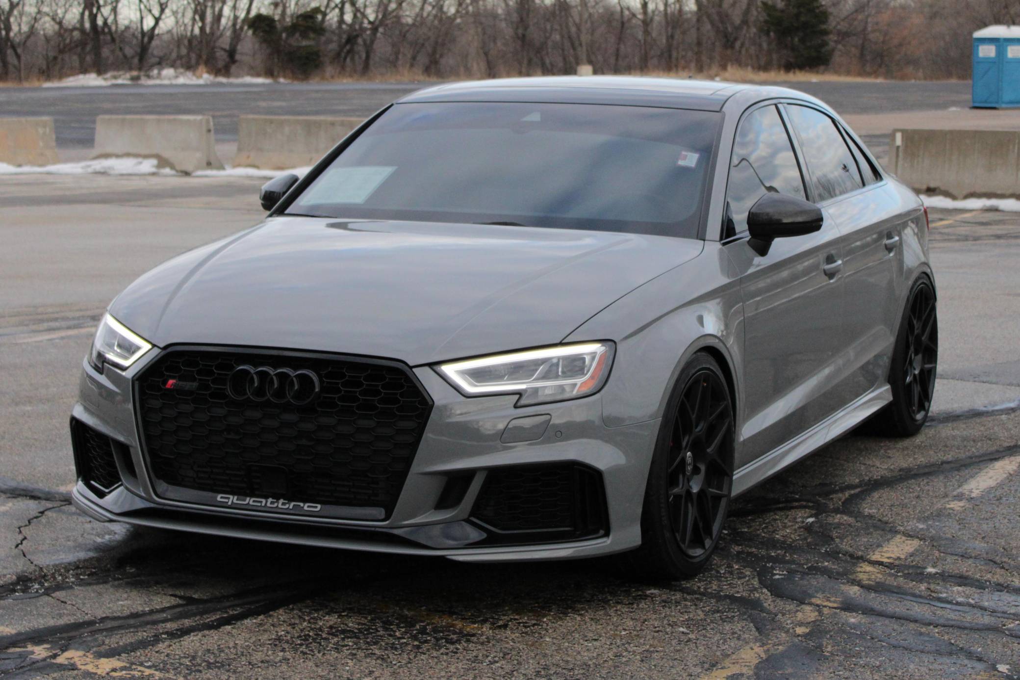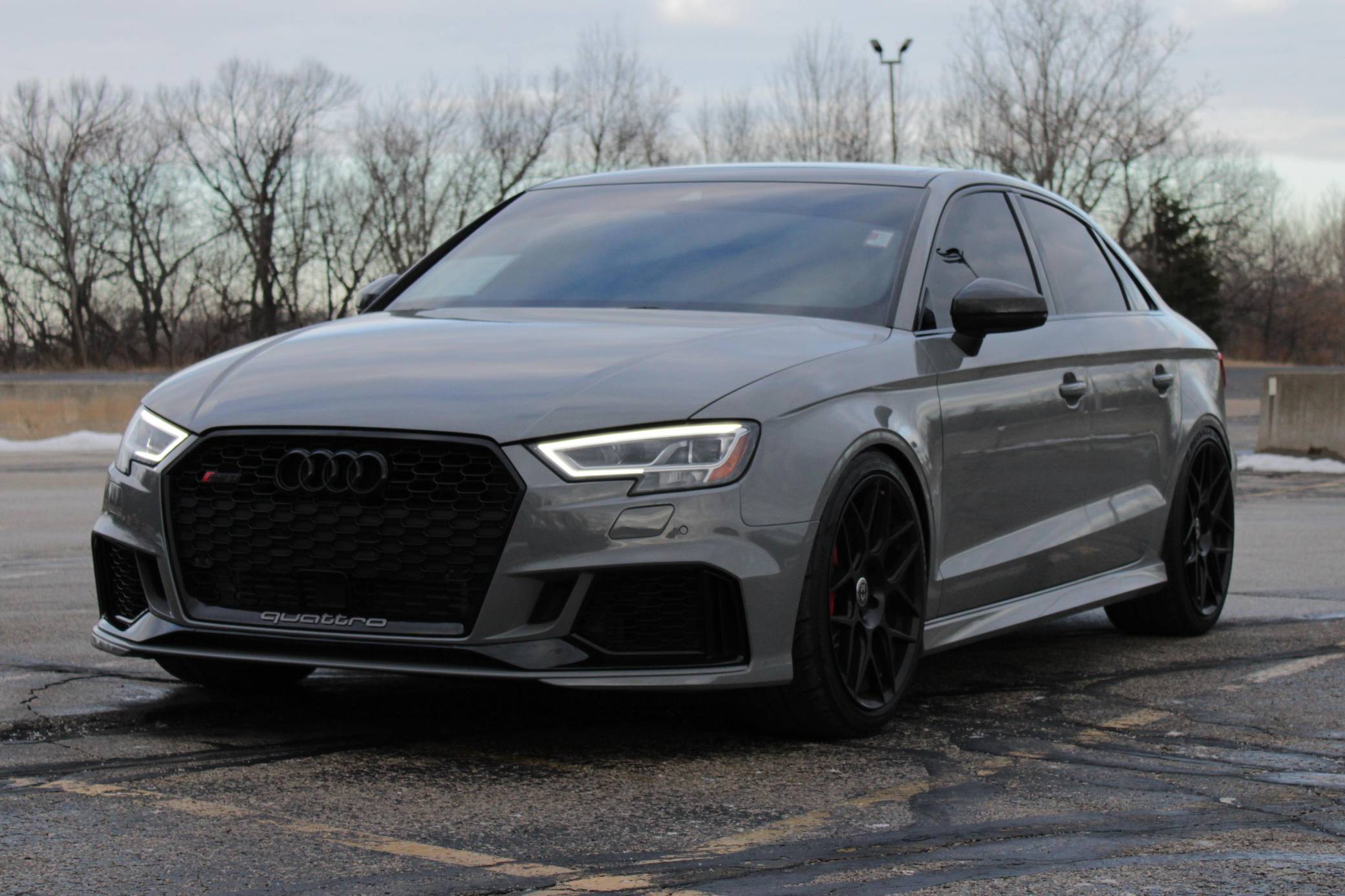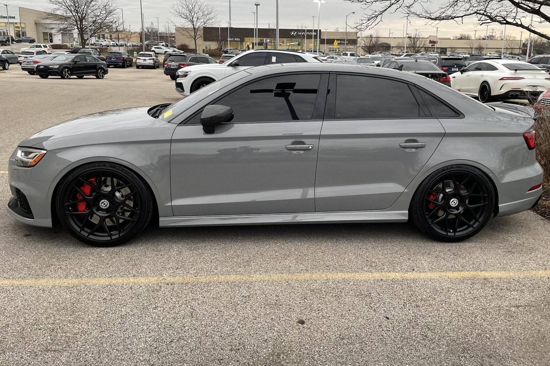 2019 Audi RS3 sedan, finished in Nardo Gray with a black interior and Crescendo Red stitching. Modifications to this RS3 include an APR Stage 2 tune, APR intercooler and downpipes, 19-inch HRE Flowform wheels, H&R springs, an aftermarket carbon fiber trunk spoiler, and window tint. Introduced in 2012, the third generation "8V" A3 was intended to compete with Mercedes-Benz's CLA-Class and featured a revised suspension and improved technology over its predecessor. The RS3 model was released in 2015 in Europe as a Sportback and was the high-performance variant of the A3 lineup. It came equipped with a larger displacement 5-cylinder engine, RS-specific suspension, tuned progressive steering, and model-specific interior trim. The sedan version was added for the world market in 2017. Power comes from a 2. 5-liter turbocharged inline-5 engine, which was rated at 394 horsepower and 354 lb-ft of torque in stock form. Due to the modifications performed to this RS3, it certainly produces more power, but a dyno sheet was not provided to confirm. The engine spins all four wheels via a 7-speed automatic transmission with paddle shifters and Audi's Quattro all-wheel-drive system.