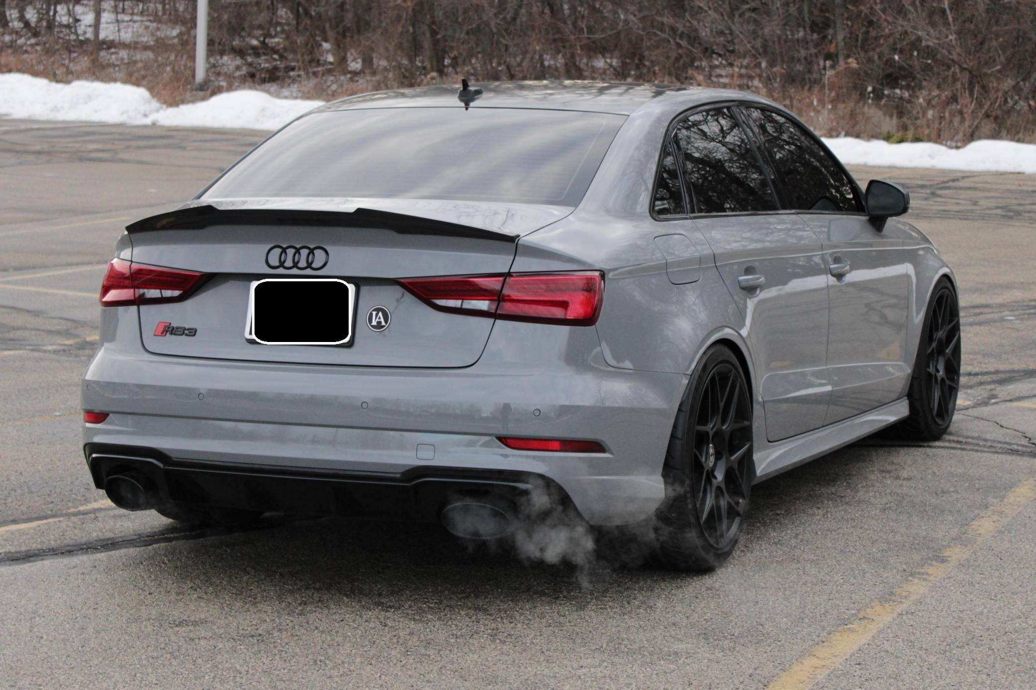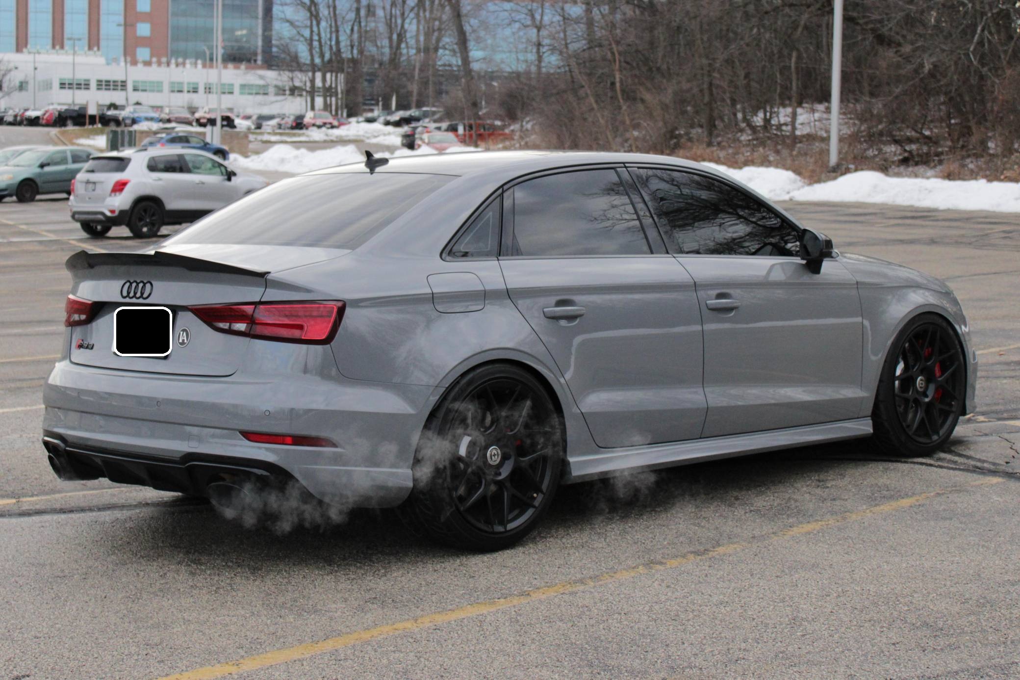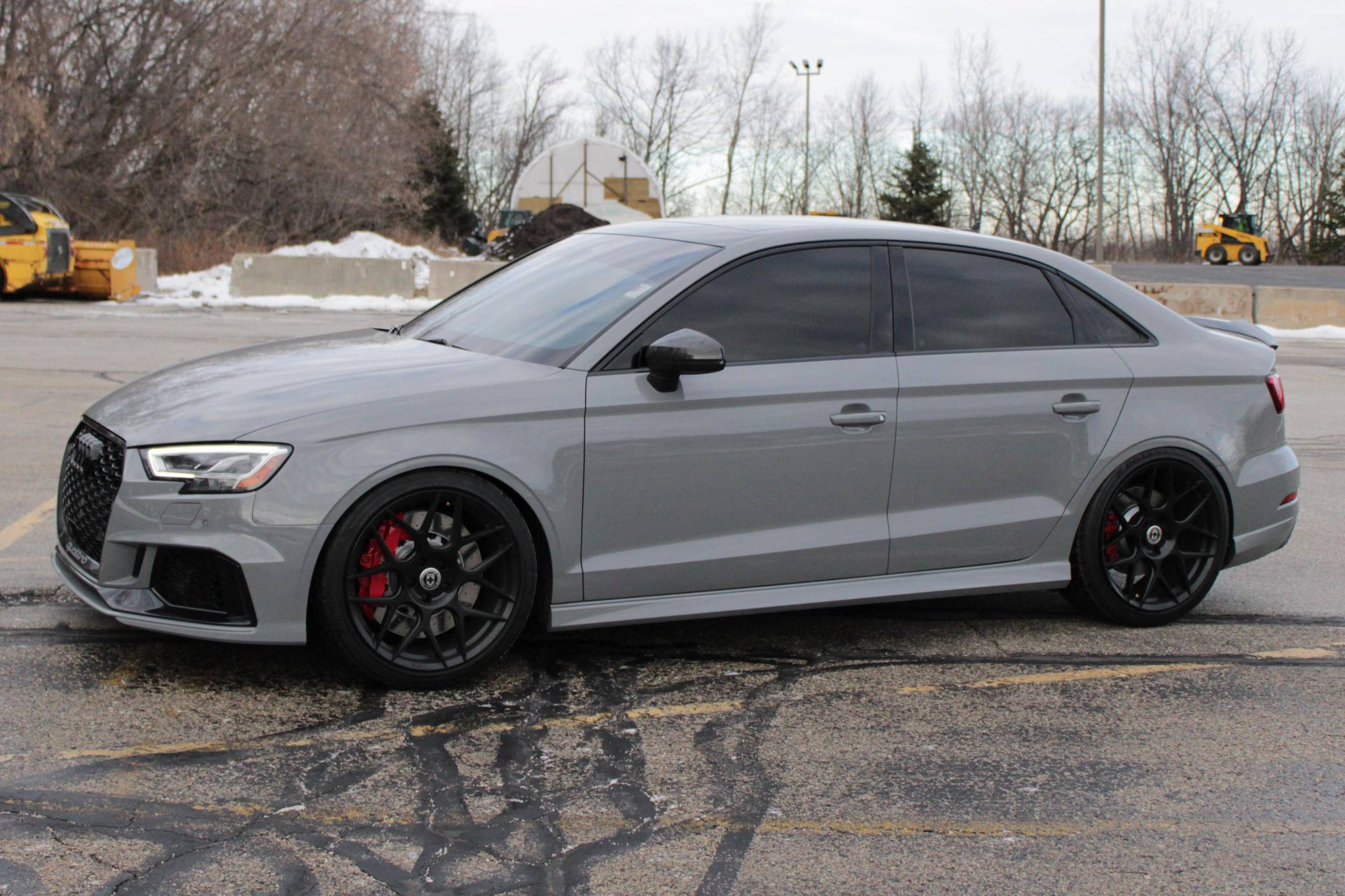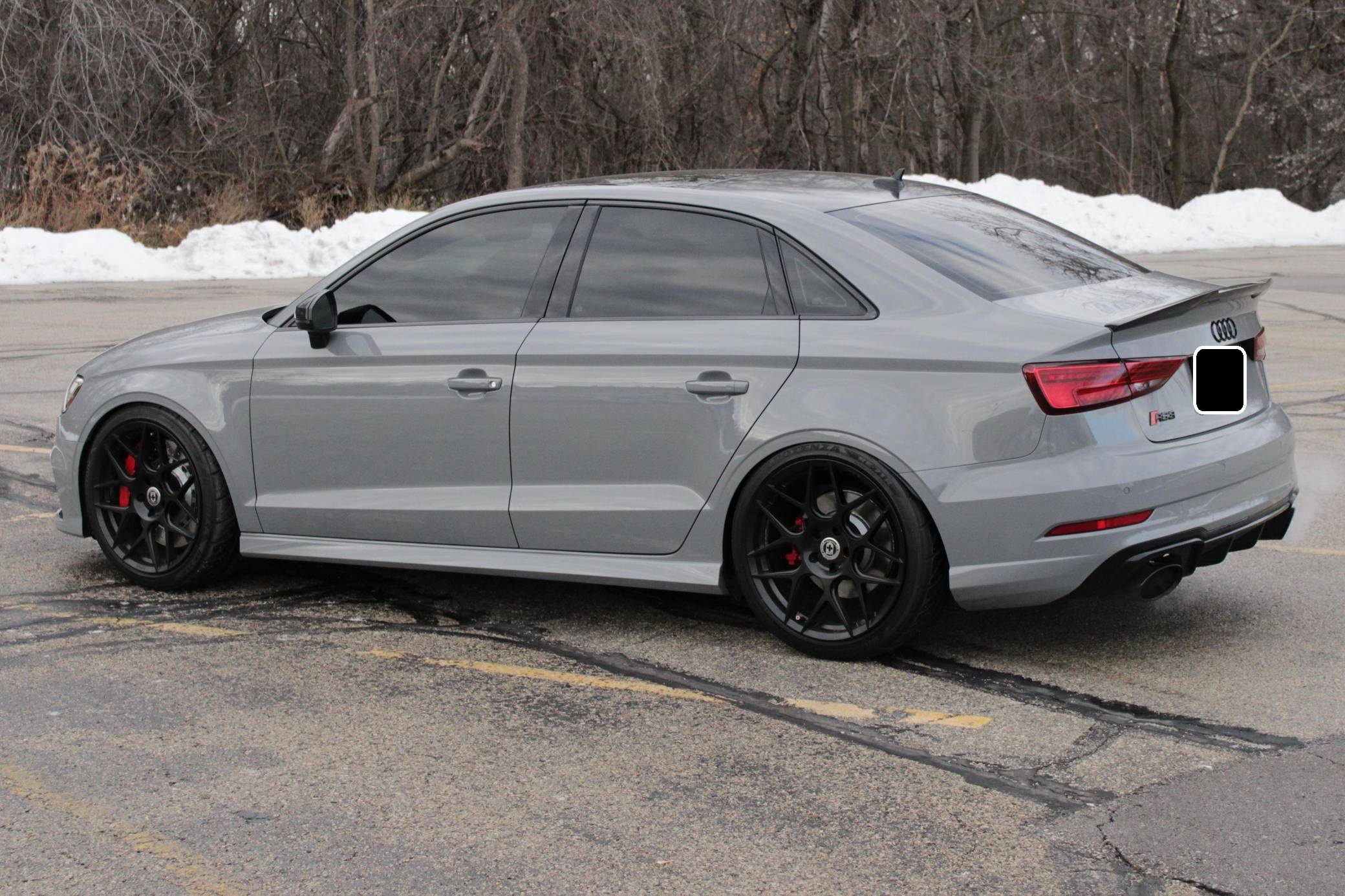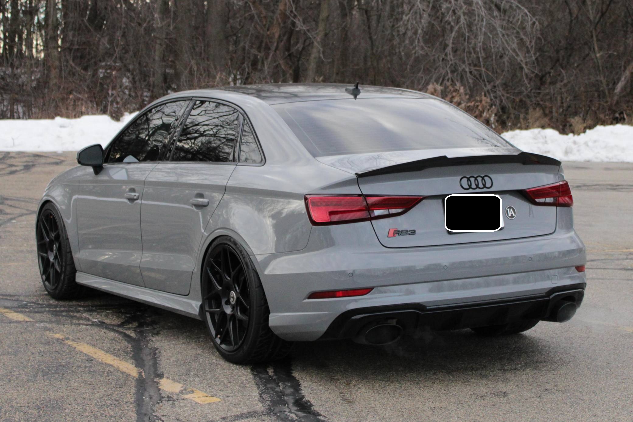 2019 Audi RS3 sedan, finished in Nardo Gray with a black interior and Crescendo Red stitching. Modifications to this RS3 include an APR Stage 2 tune, APR intercooler and downpipes, 19-inch HRE Flowform wheels, H&R springs, an aftermarket carbon fiber trunk spoiler, and window tint. Introduced in 2012, the third generation "8V" A3 was intended to compete with Mercedes-Benz's CLA-Class and featured a revised suspension and improved technology over its predecessor. The RS3 model was released in 2015 in Europe as a Sportback and was the high-performance variant of the A3 lineup. It came equipped with a larger displacement 5-cylinder engine, RS-specific suspension, tuned progressive steering, and model-specific interior trim. The sedan version was added for the world market in 2017. Power comes from a 2. 5-liter turbocharged inline-5 engine, which was rated at 394 horsepower and 354 lb-ft of torque in stock form. Due to the modifications performed to this RS3, it certainly produces more power, but a dyno sheet was not provided to confirm. The engine spins all four wheels via a 7-speed automatic transmission with paddle shifters and Audi's Quattro all-wheel-drive system.