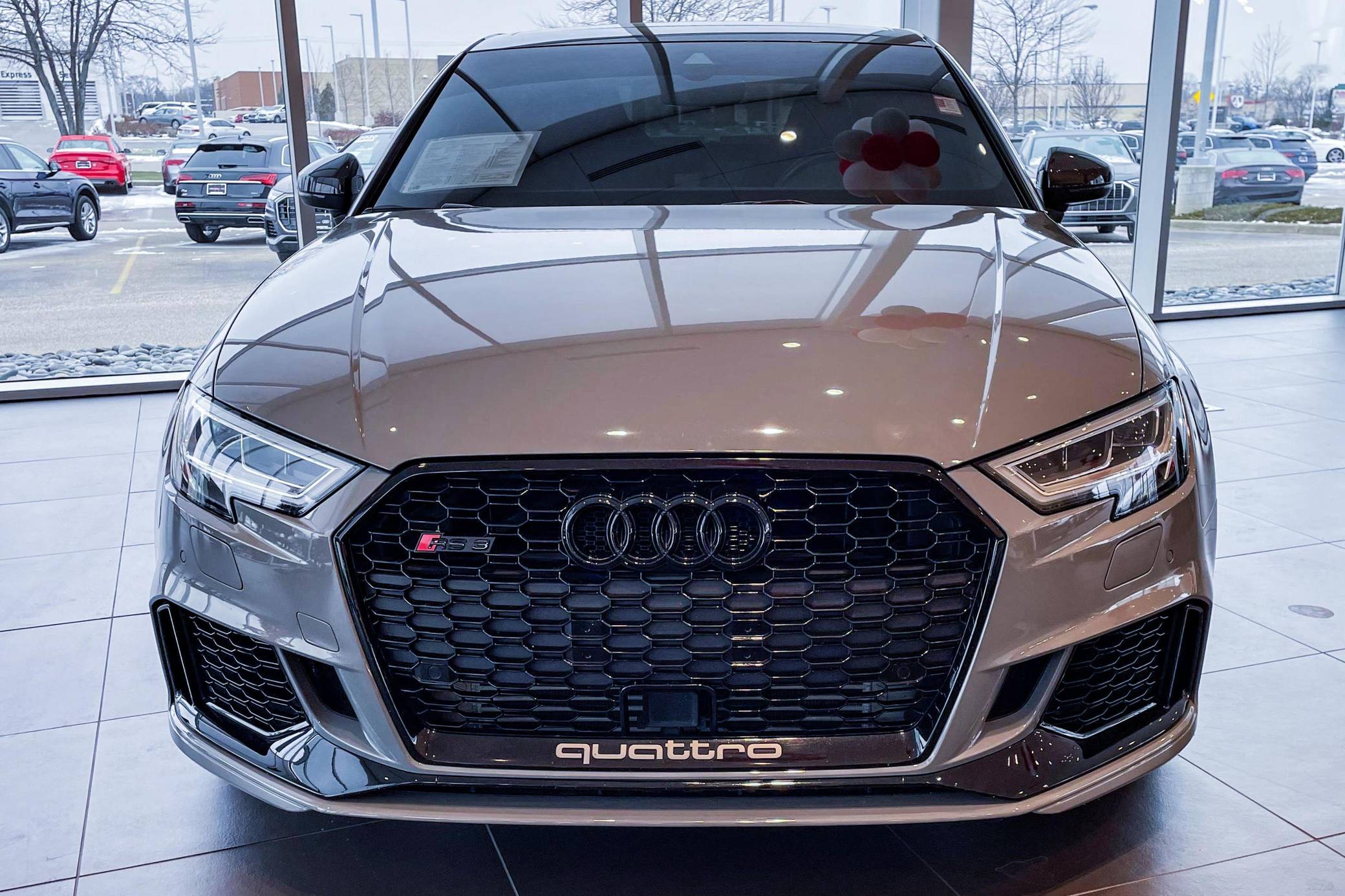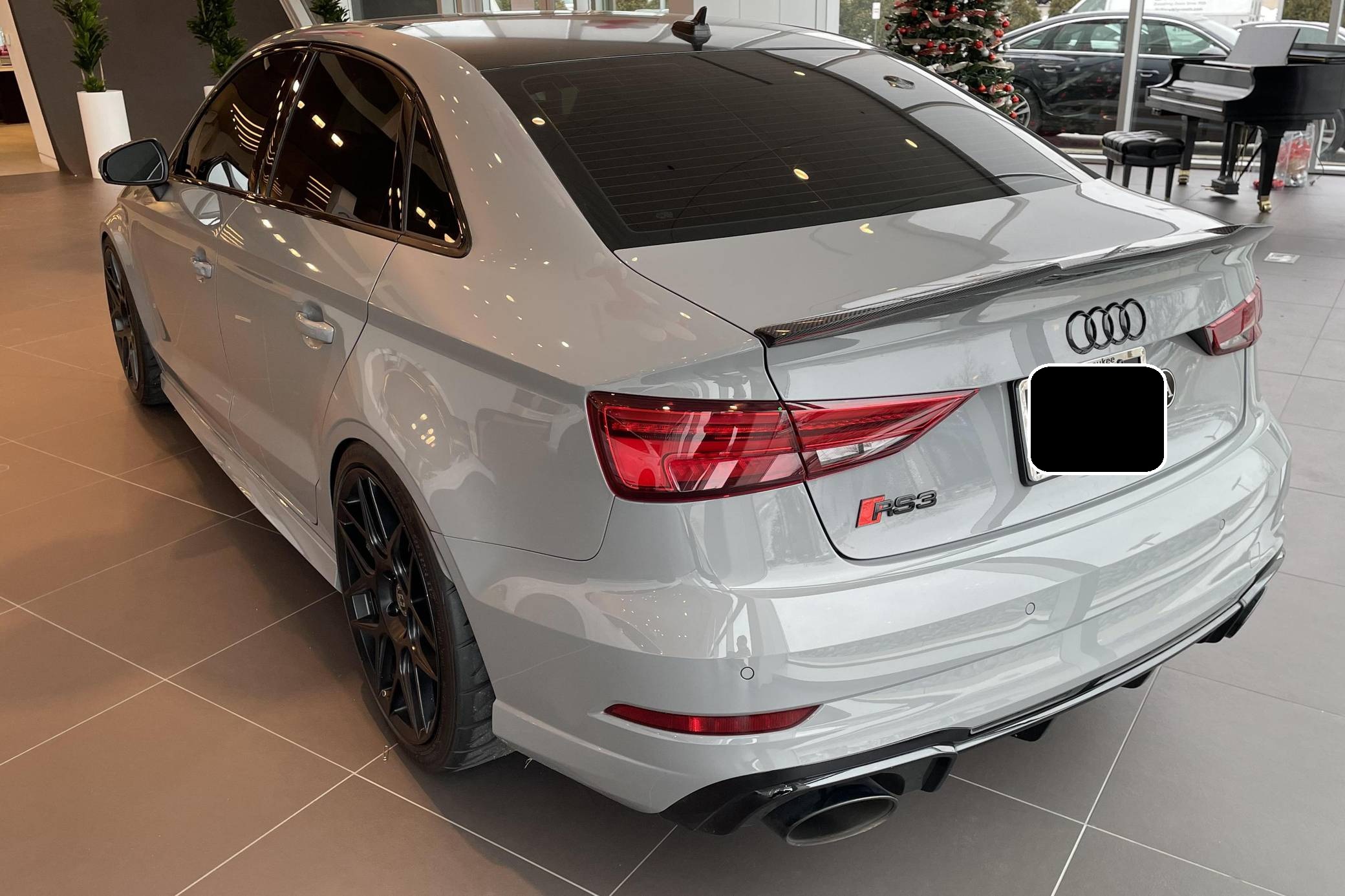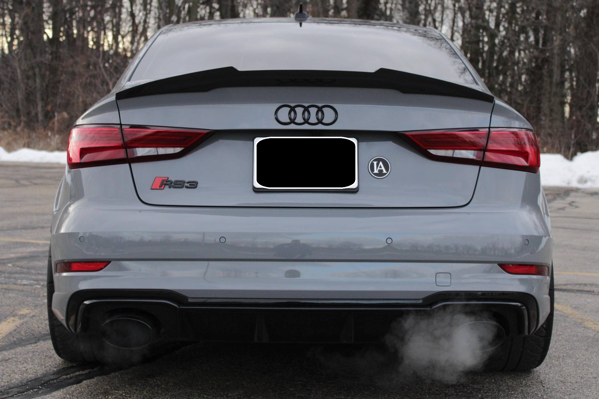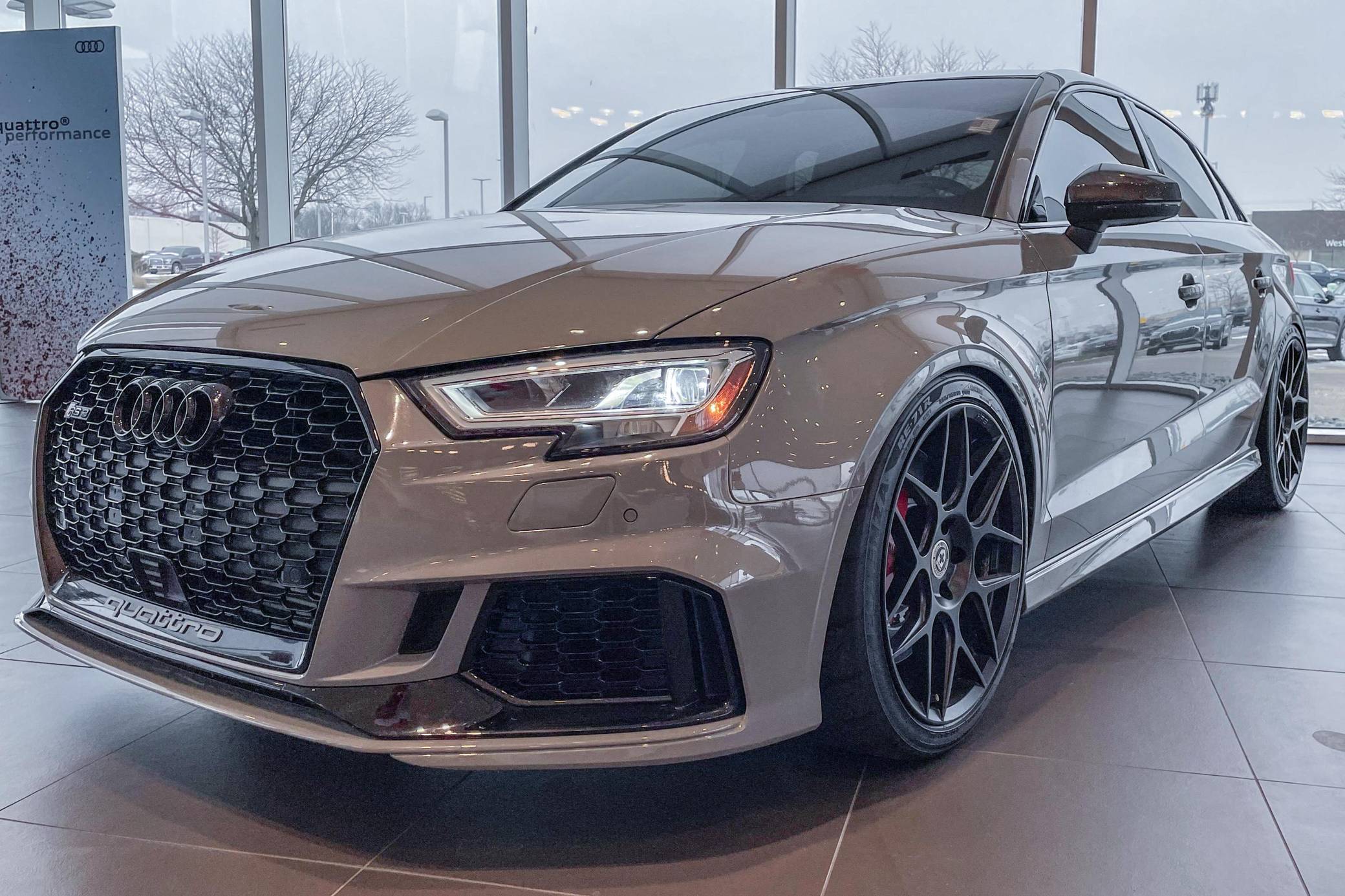 2019 Audi RS3 sedan, finished in Nardo Gray with a black interior and Crescendo Red stitching. Modifications to this RS3 include an APR Stage 2 tune, APR intercooler and downpipes, 19-inch HRE Flowform wheels, H&R springs, an aftermarket carbon fiber trunk spoiler, and window tint. Introduced in 2012, the third generation "8V" A3 was intended to compete with Mercedes-Benz's CLA-Class and featured a revised suspension and improved technology over its predecessor. The RS3 model was released in 2015 in Europe as a Sportback and was the high-performance variant of the A3 lineup. It came equipped with a larger displacement 5-cylinder engine, RS-specific suspension, tuned progressive steering, and model-specific interior trim. The sedan version was added for the world market in 2017. Power comes from a 2. 5-liter turbocharged inline-5 engine, which was rated at 394 horsepower and 354 lb-ft of torque in stock form. Due to the modifications performed to this RS3, it certainly produces more power, but a dyno sheet was not provided to confirm. The engine spins all four wheels via a 7-speed automatic transmission with paddle shifters and Audi's Quattro all-wheel-drive system.