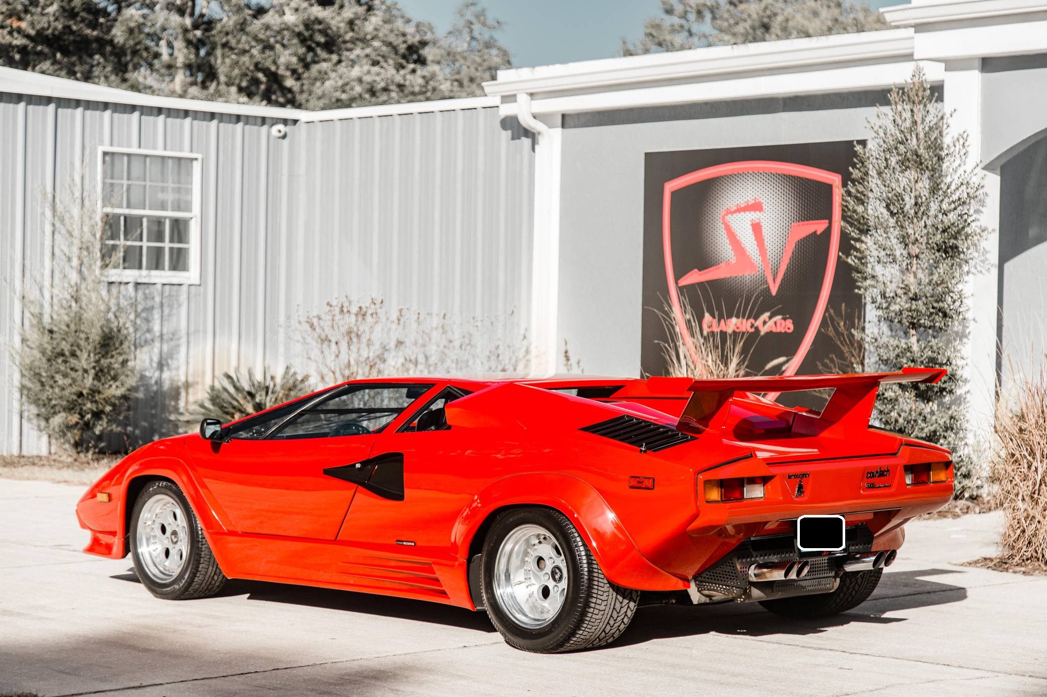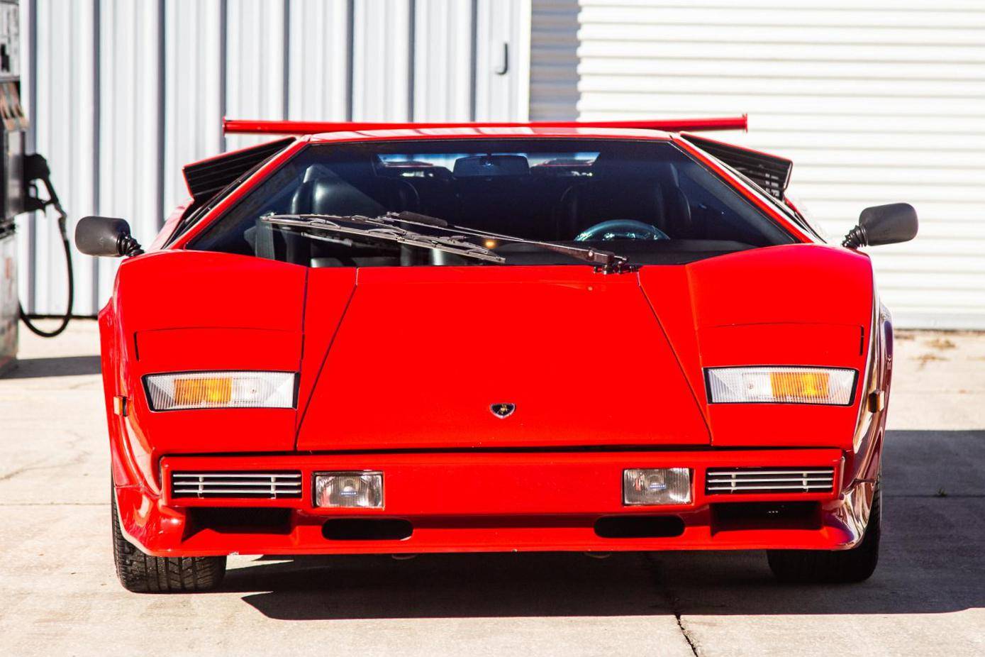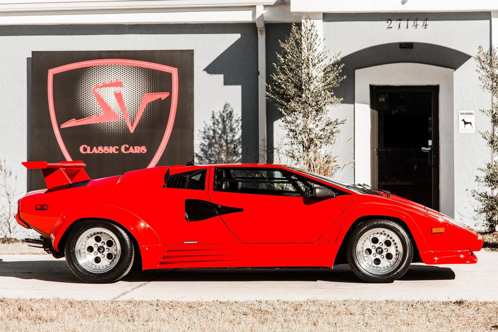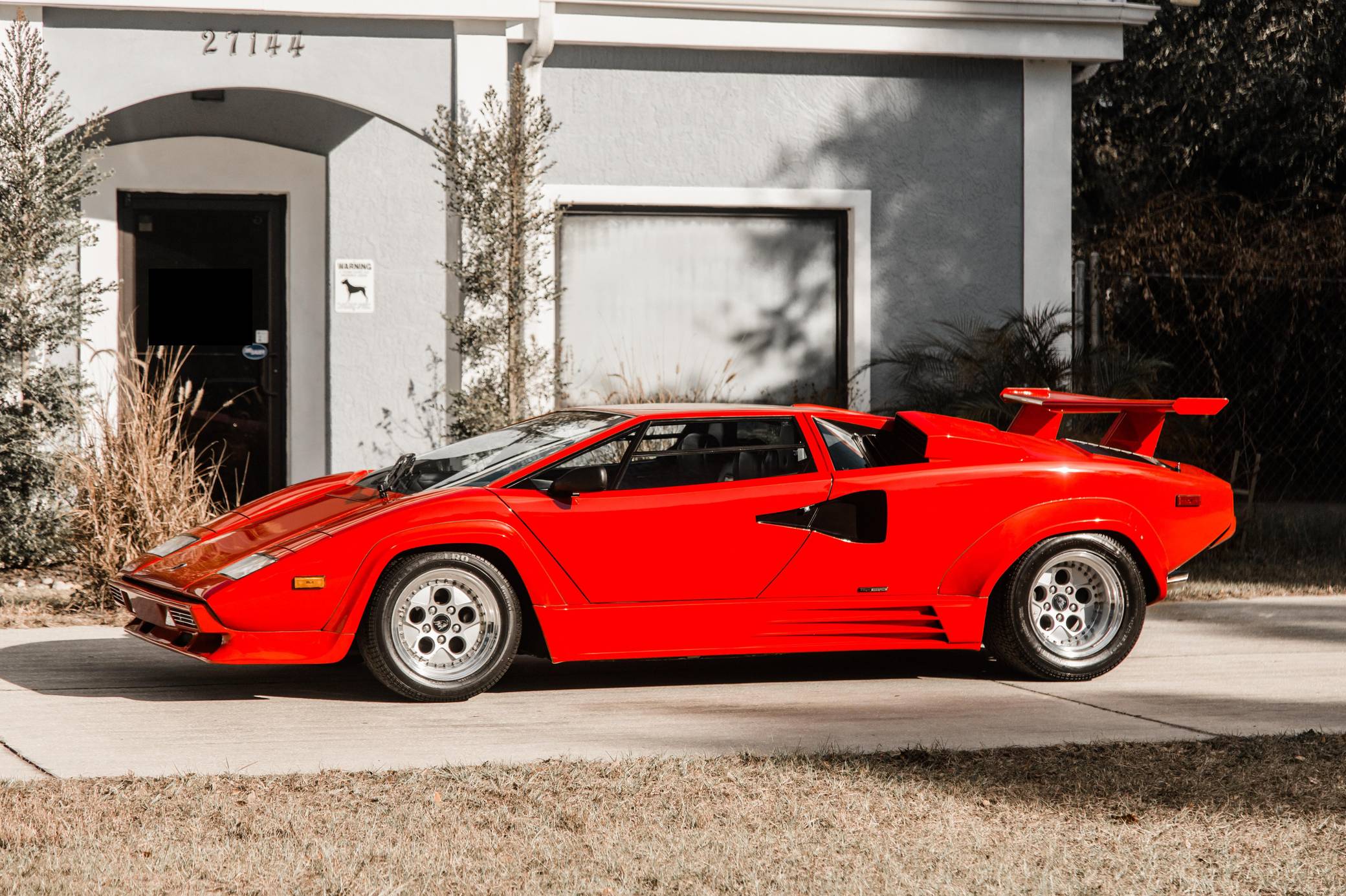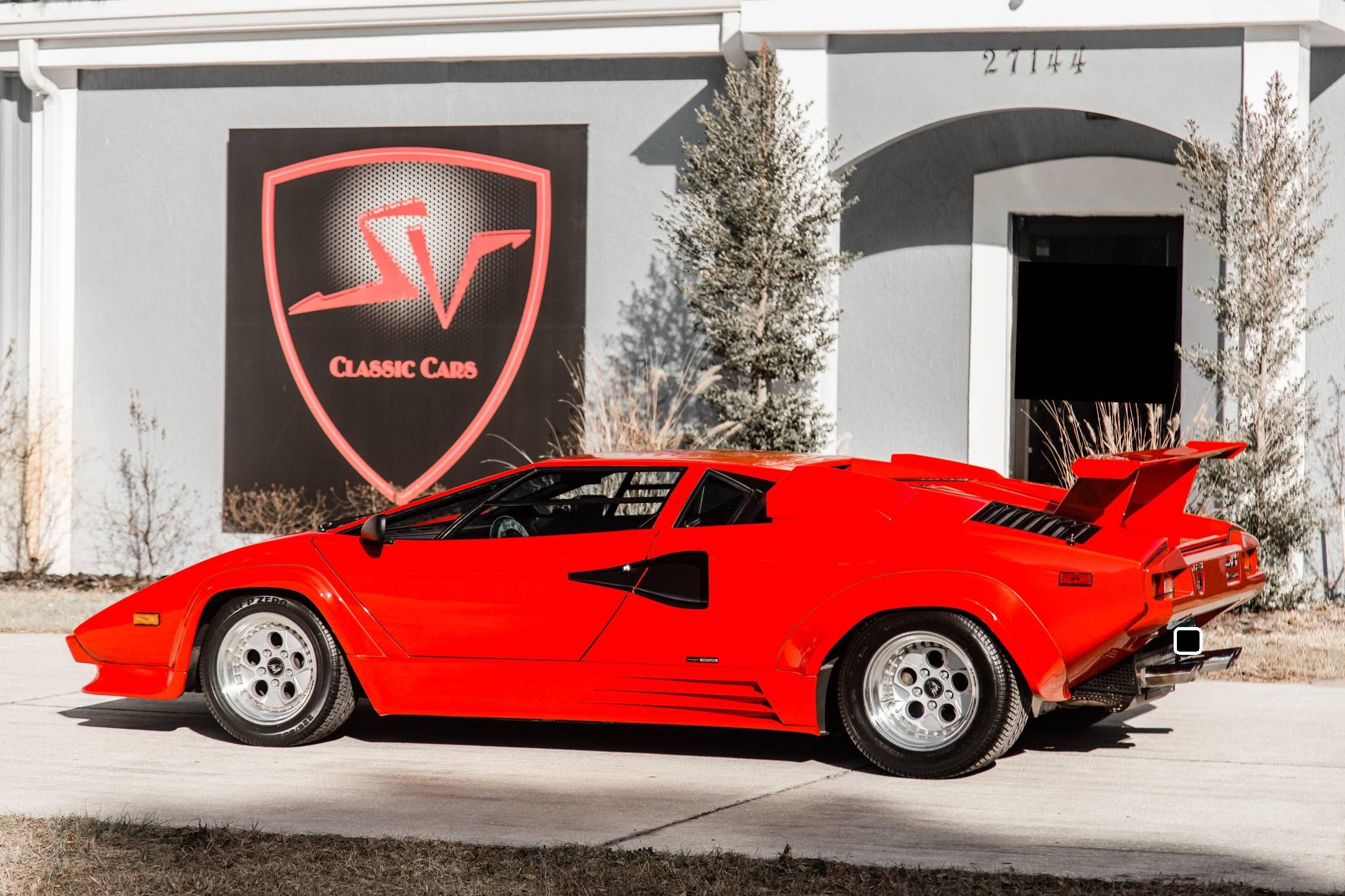 1988 Lamborghini Countach 5000 Quattrovalvole, finished in Rosso Siviglia with a black interior. The odometer on this Lamborghini reads in metric units and indicates approximately 31,500 kilometers or roughly 19,600 miles. Factory equipment for this Lamborghini includes a gated manual transmission with a reverse lockout, Bosch fuel injection, split-pane windows, pop-up headlights, air conditioning, and more as detailed below. Modifications reported by the seller include factory Lamborghini parts from a later Countach model, a period-correct radar system, and an R134a air conditioning conversion. For the 1985 model year, Lamborghini further improved the beloved Countach by introducing the LP5000 QV, or "quattrovalvole" in Italian. In conjunction with the name, the 5. 2-liter V12 was given a cylinder head with "four-valves-per-cylinder" to increase efficiency. As a result, horsepower for U. S. -models increased to 420, courtesy of Bosch fuel injection. The body remained the same until late 1988 when the 25th Anniversary Countach was unveiled with an updated body kit, wheels, and upper air scoops designed by Horacio Pagani. Power comes from a 5. 2-liter V12 engine, which is rated at about 420 horsepower and 369 lb-ft of torque. Power is sent to the rear wheels via a 5-speed gated manual transmission.
