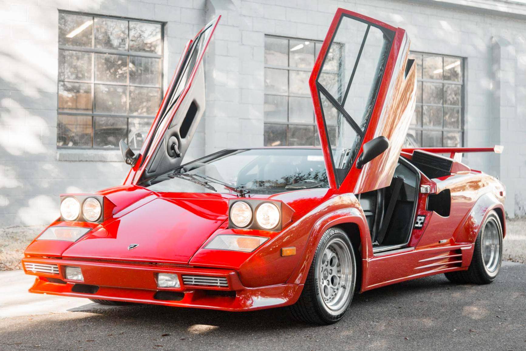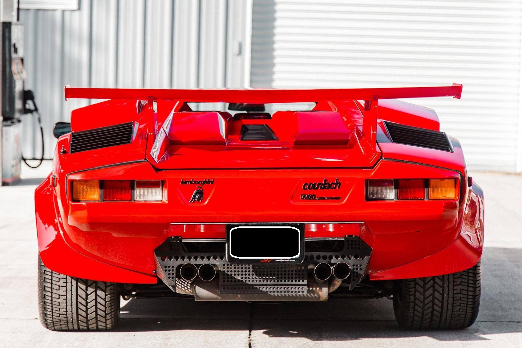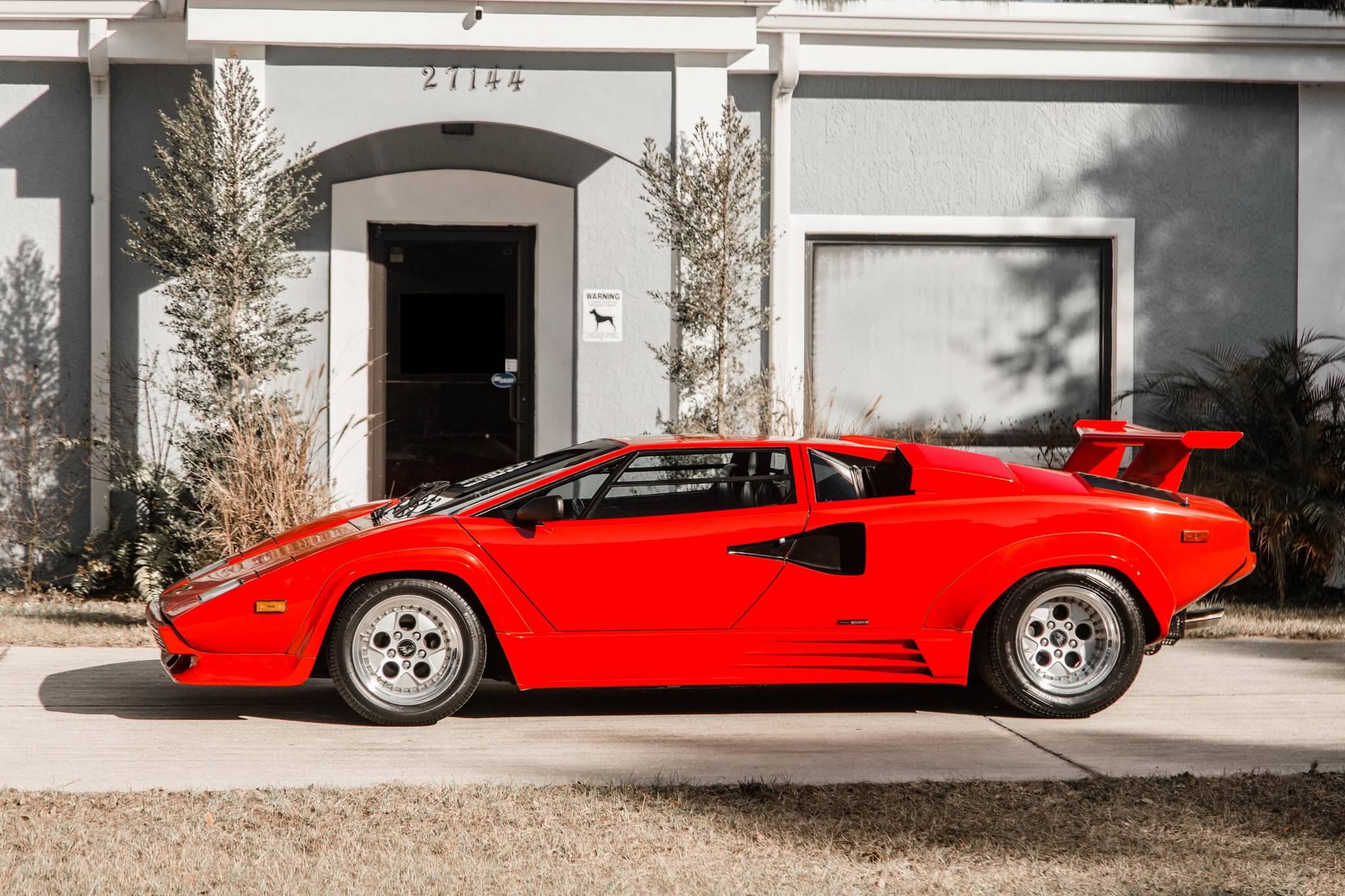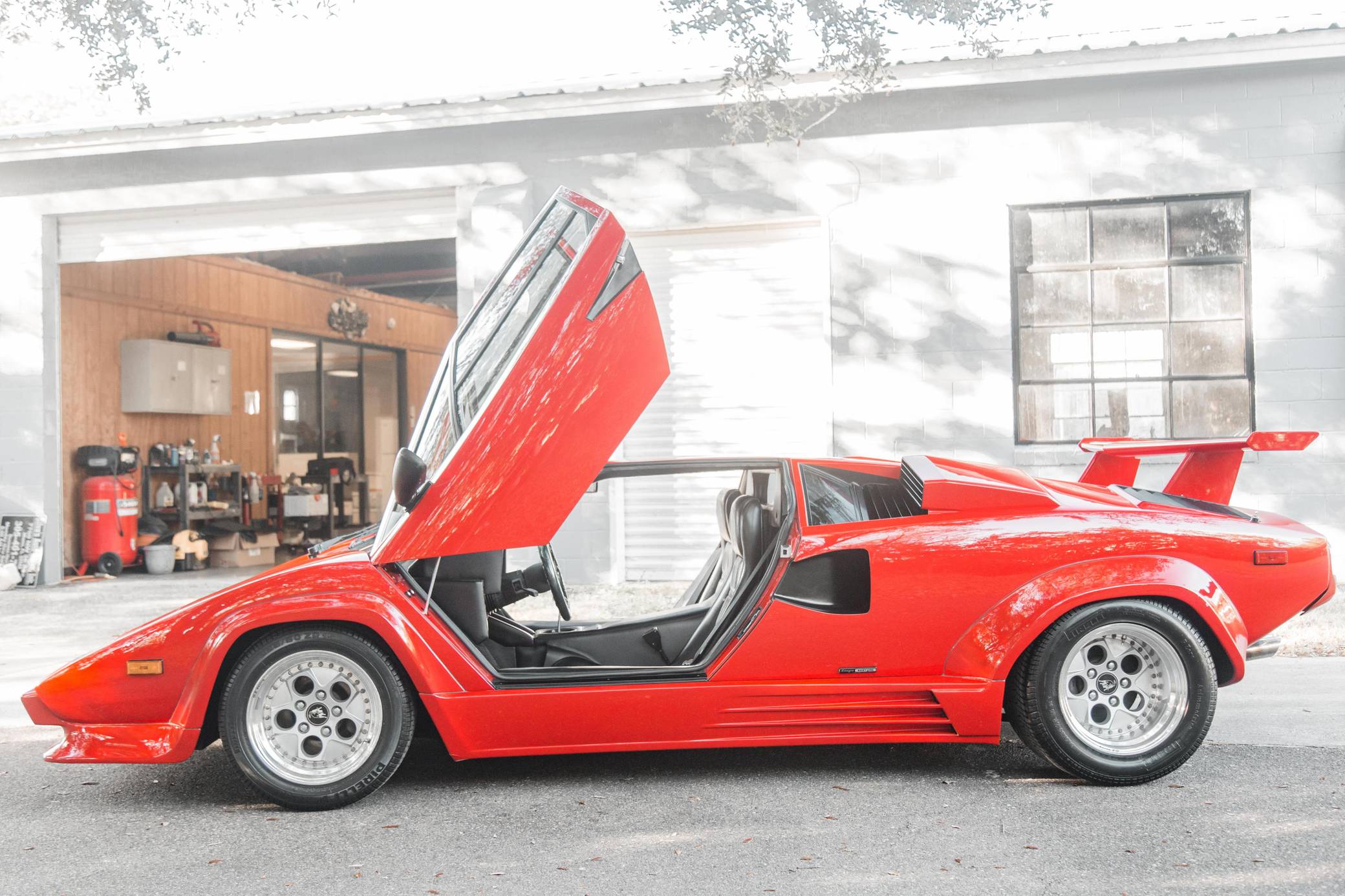 1988 Lamborghini Countach 5000 Quattrovalvole, finished in Rosso Siviglia with a black interior. The odometer on this Lamborghini reads in metric units and indicates approximately 31,500 kilometers or roughly 19,600 miles. Factory equipment for this Lamborghini includes a gated manual transmission with a reverse lockout, Bosch fuel injection, split-pane windows, pop-up headlights, air conditioning, and more as detailed below. Modifications reported by the seller include factory Lamborghini parts from a later Countach model, a period-correct radar system, and an R134a air conditioning conversion. For the 1985 model year, Lamborghini further improved the beloved Countach by introducing the LP5000 QV, or "quattrovalvole" in Italian. In conjunction with the name, the 5. 2-liter V12 was given a cylinder head with "four-valves-per-cylinder" to increase efficiency. As a result, horsepower for U. S. -models increased to 420, courtesy of Bosch fuel injection. The body remained the same until late 1988 when the 25th Anniversary Countach was unveiled with an updated body kit, wheels, and upper air scoops designed by Horacio Pagani. Power comes from a 5. 2-liter V12 engine, which is rated at about 420 horsepower and 369 lb-ft of torque. Power is sent to the rear wheels via a 5-speed gated manual transmission.