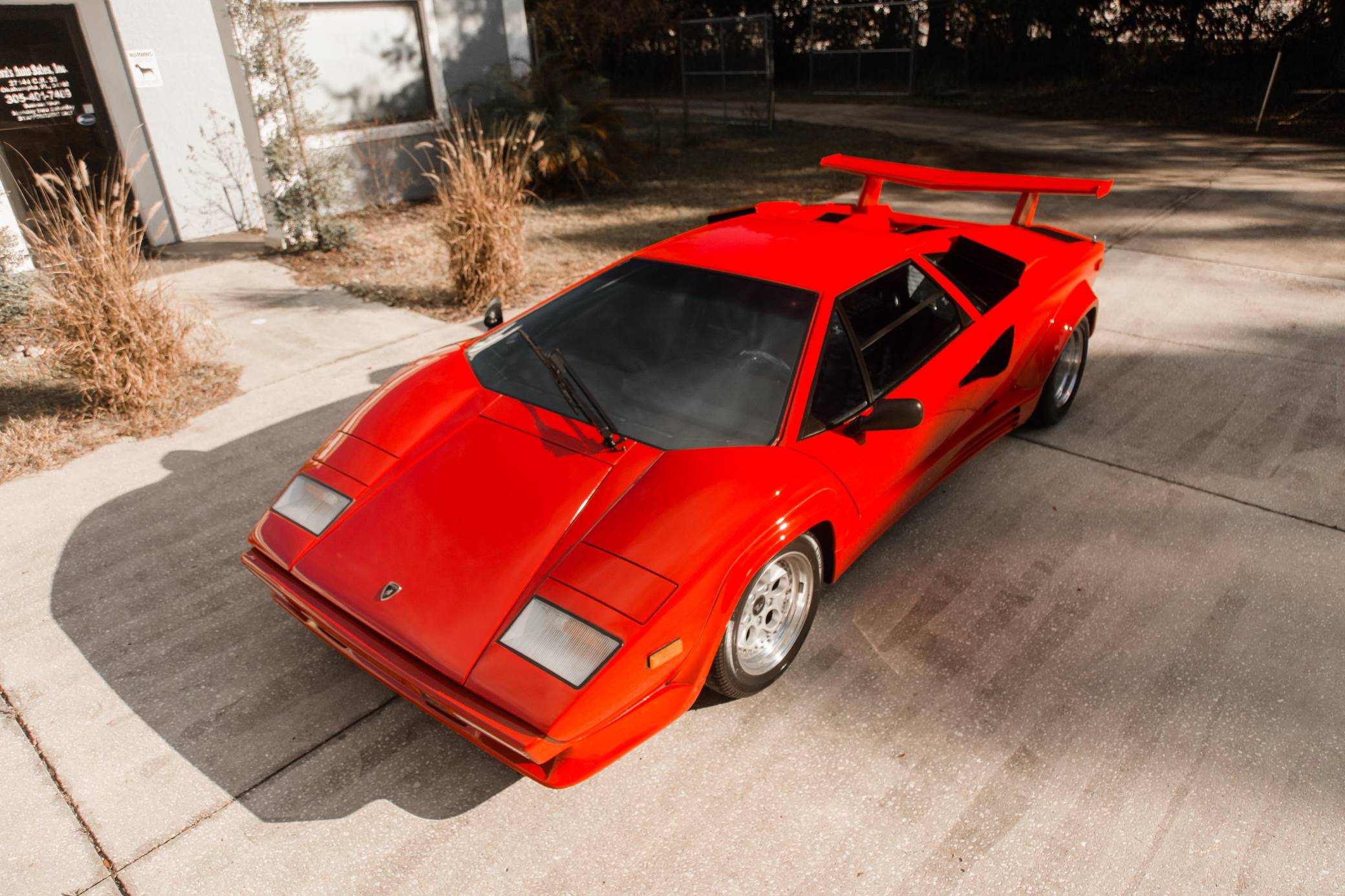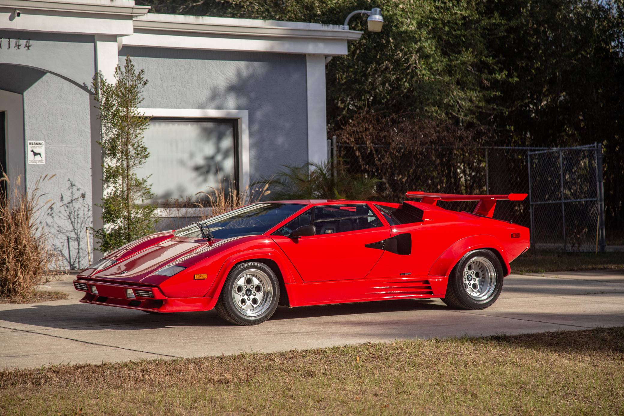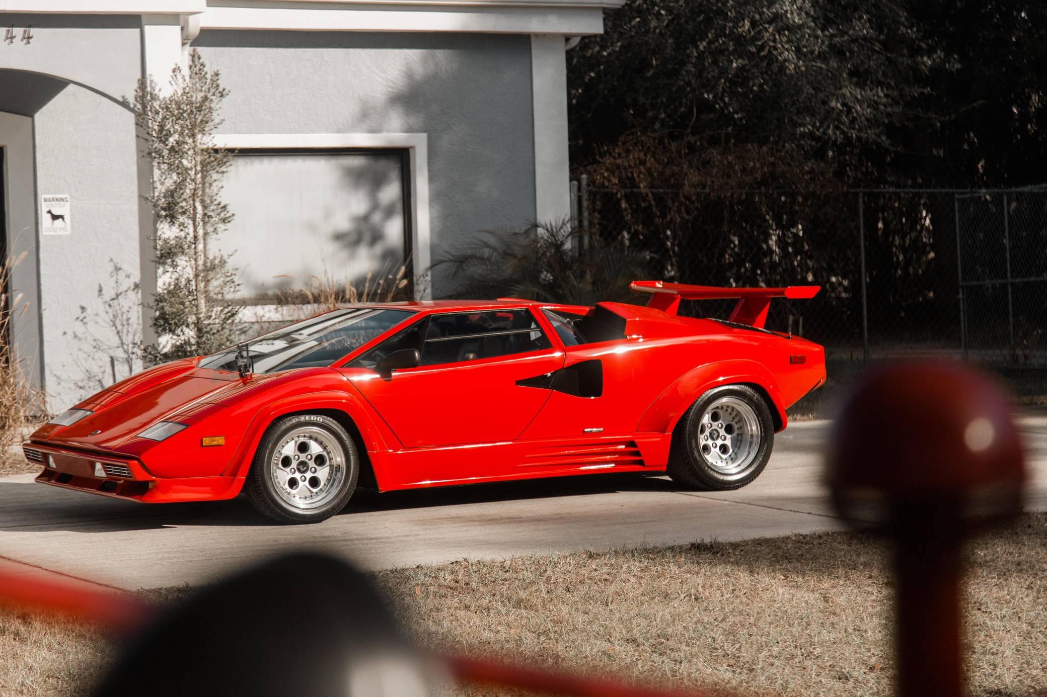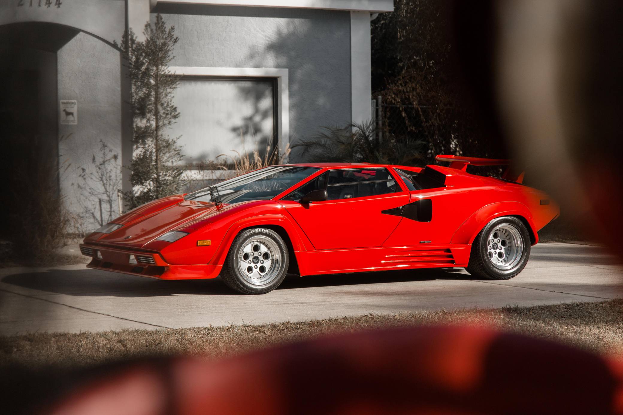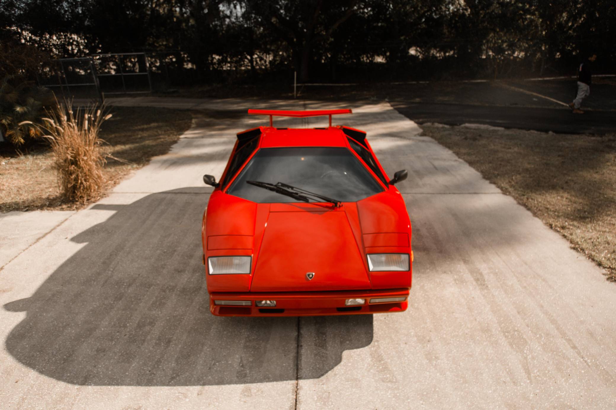 1988 Lamborghini Countach 5000 Quattrovalvole, finished in Rosso Siviglia with a black interior. The odometer on this Lamborghini reads in metric units and indicates approximately 31,500 kilometers or roughly 19,600 miles. Factory equipment for this Lamborghini includes a gated manual transmission with a reverse lockout, Bosch fuel injection, split-pane windows, pop-up headlights, air conditioning, and more as detailed below. Modifications reported by the seller include factory Lamborghini parts from a later Countach model, a period-correct radar system, and an R134a air conditioning conversion. For the 1985 model year, Lamborghini further improved the beloved Countach by introducing the LP5000 QV, or "quattrovalvole" in Italian. In conjunction with the name, the 5. 2-liter V12 was given a cylinder head with "four-valves-per-cylinder" to increase efficiency. As a result, horsepower for U. S. -models increased to 420, courtesy of Bosch fuel injection. The body remained the same until late 1988 when the 25th Anniversary Countach was unveiled with an updated body kit, wheels, and upper air scoops designed by Horacio Pagani. Power comes from a 5. 2-liter V12 engine, which is rated at about 420 horsepower and 369 lb-ft of torque. Power is sent to the rear wheels via a 5-speed gated manual transmission.