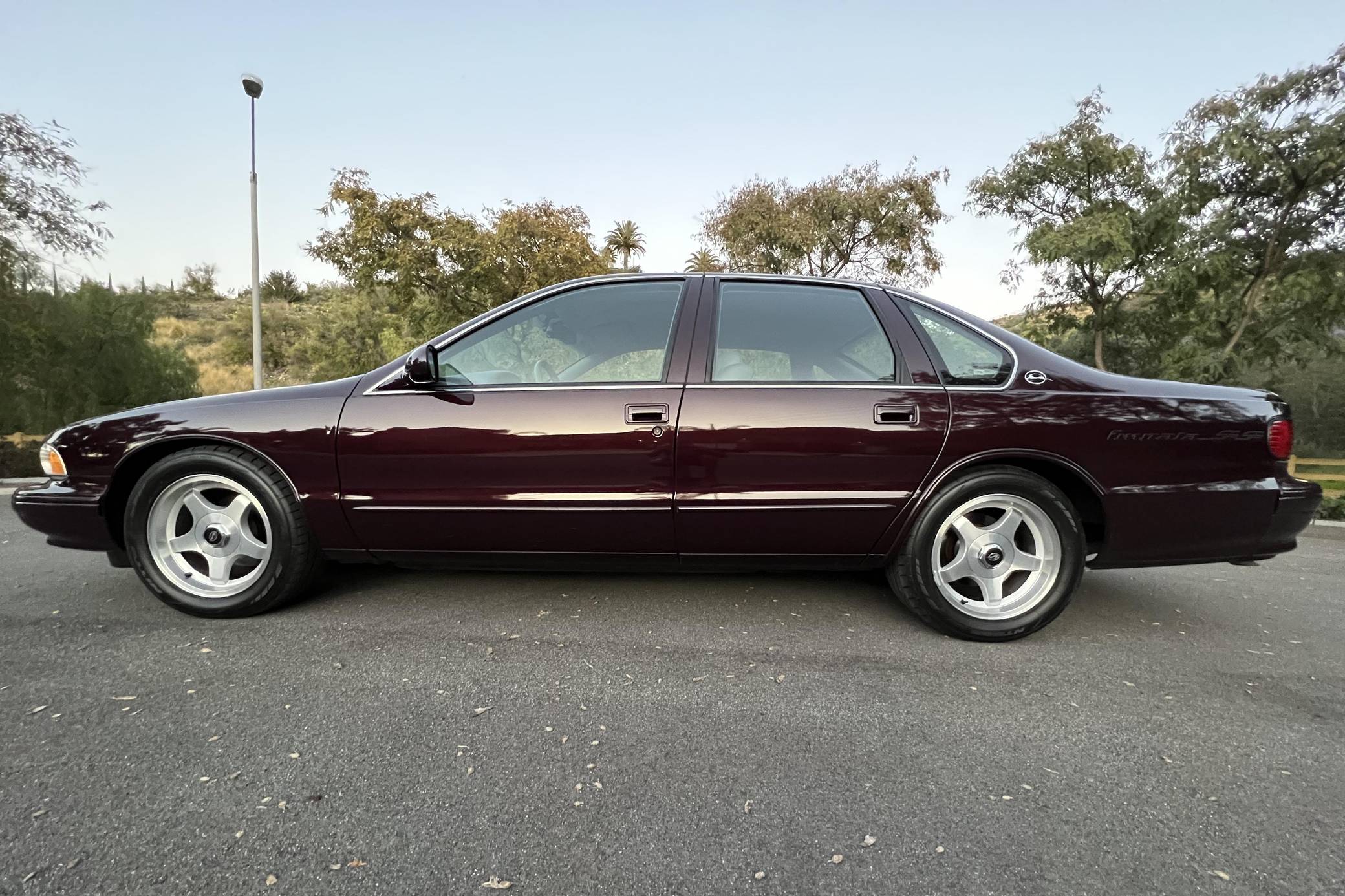 THIS… is a 1995 Chevrolet Impala SS, finished in Dark Cherry Metallic with a Light Gray interior. The odometer on this Impala currently displays approximately 10,900 miles. The seller reports no modifications. Sold between the 1994 and 1996 model years, the Impala SS was based on the B-Body Caprice but it gained a Corvette-derived V8 and numerous performance upgrades. It notably received a sport-tuned suspension, four-wheel disc brakes, a dual exhaust system, a transmission cooler, and a high-capacity reverse-flow cooling system, among other features. It was the last rear-wheel-drive V8-powered Chevrolet sedan until the Holden-built SS was introduced for the 2014 model year. Power comes from a 5. 7-liter V8, which produces 260 horsepower and 330 lb-ft of torque. It spins the rear wheels through a 4-speed automatic transmission and a limited-slip differential.