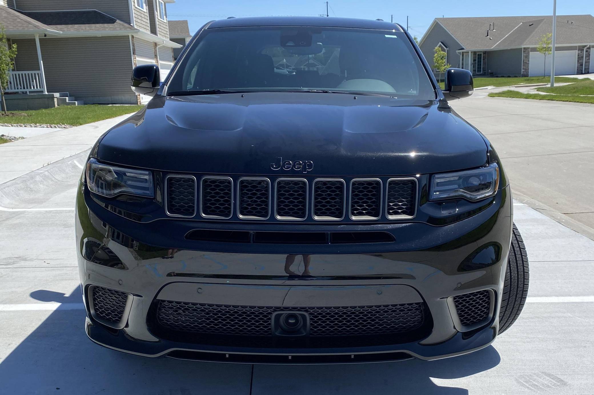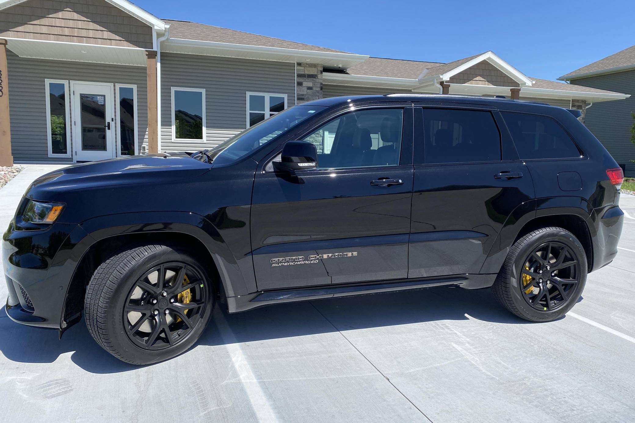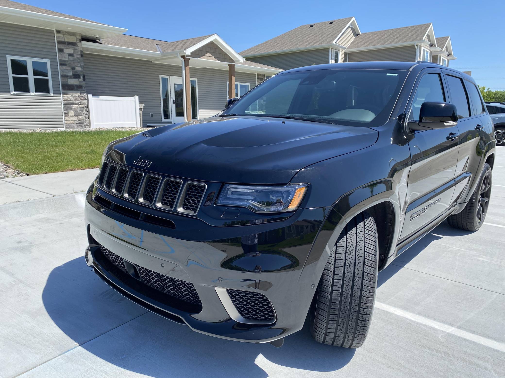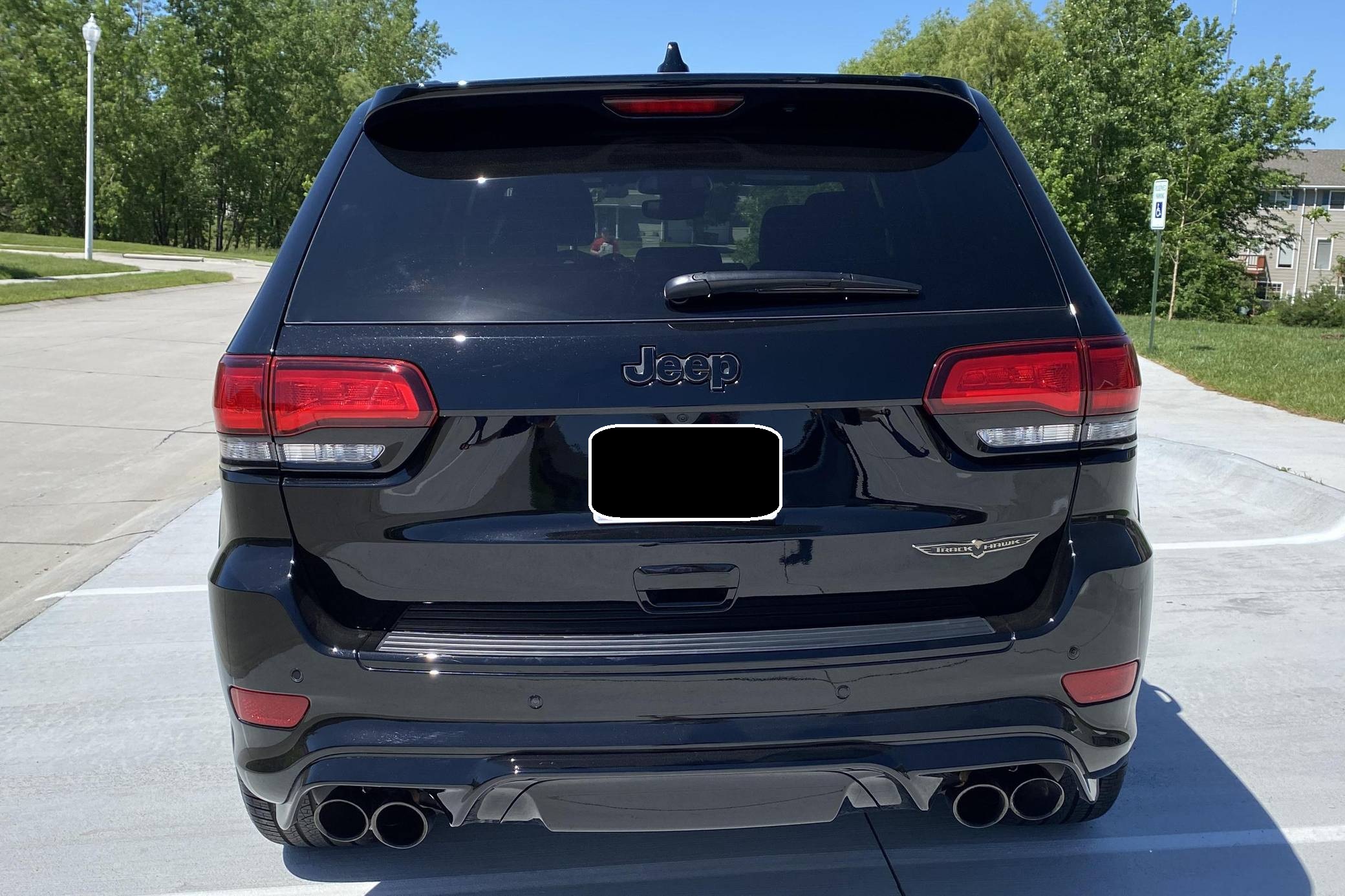 2021 Jeep Grand Cherokee Trackhawk, finished in Diamond Black Crystal Pearl-Coat with a black interior. The odometer currently displays 906 miles. The seller reports no modifications. Jeep became synonymous with high-performance SUVs when it released the original Grand Cherokee SRT8 over a decade ago. Based on the WK2-generation Grand Cherokee, the Hellcat-powered Trackhawk packs a 707-horsepower punch with looks, handling, and an exhaust note to match. Power comes from a supercharged 6. 2-liter V8, rated at 707 horsepower and 645 lb-ft of torque. Output is sent to all four wheels via an 8-speed automatic transmission.